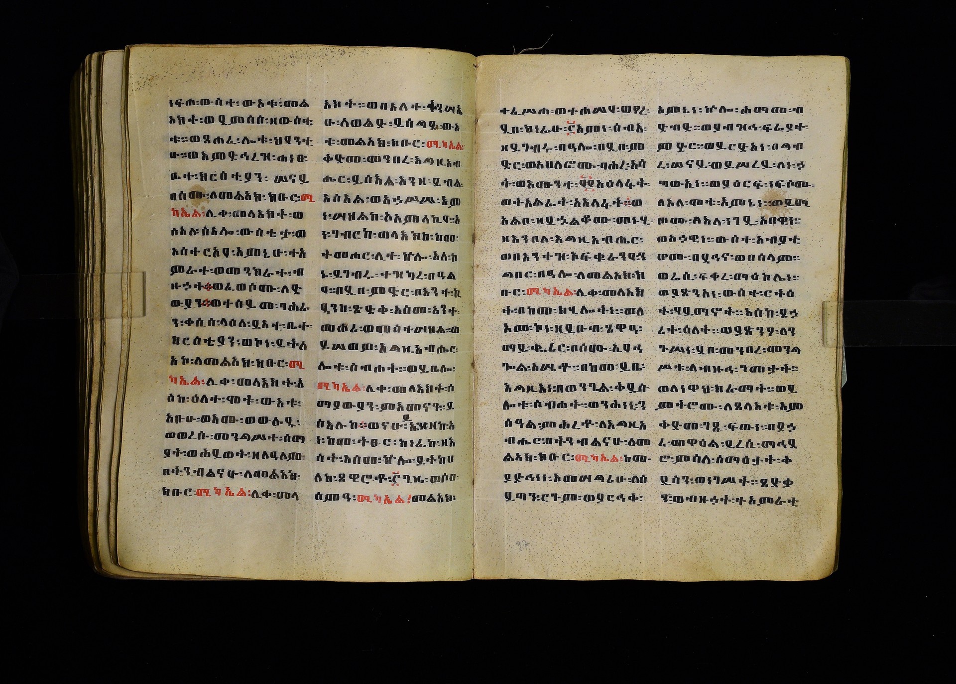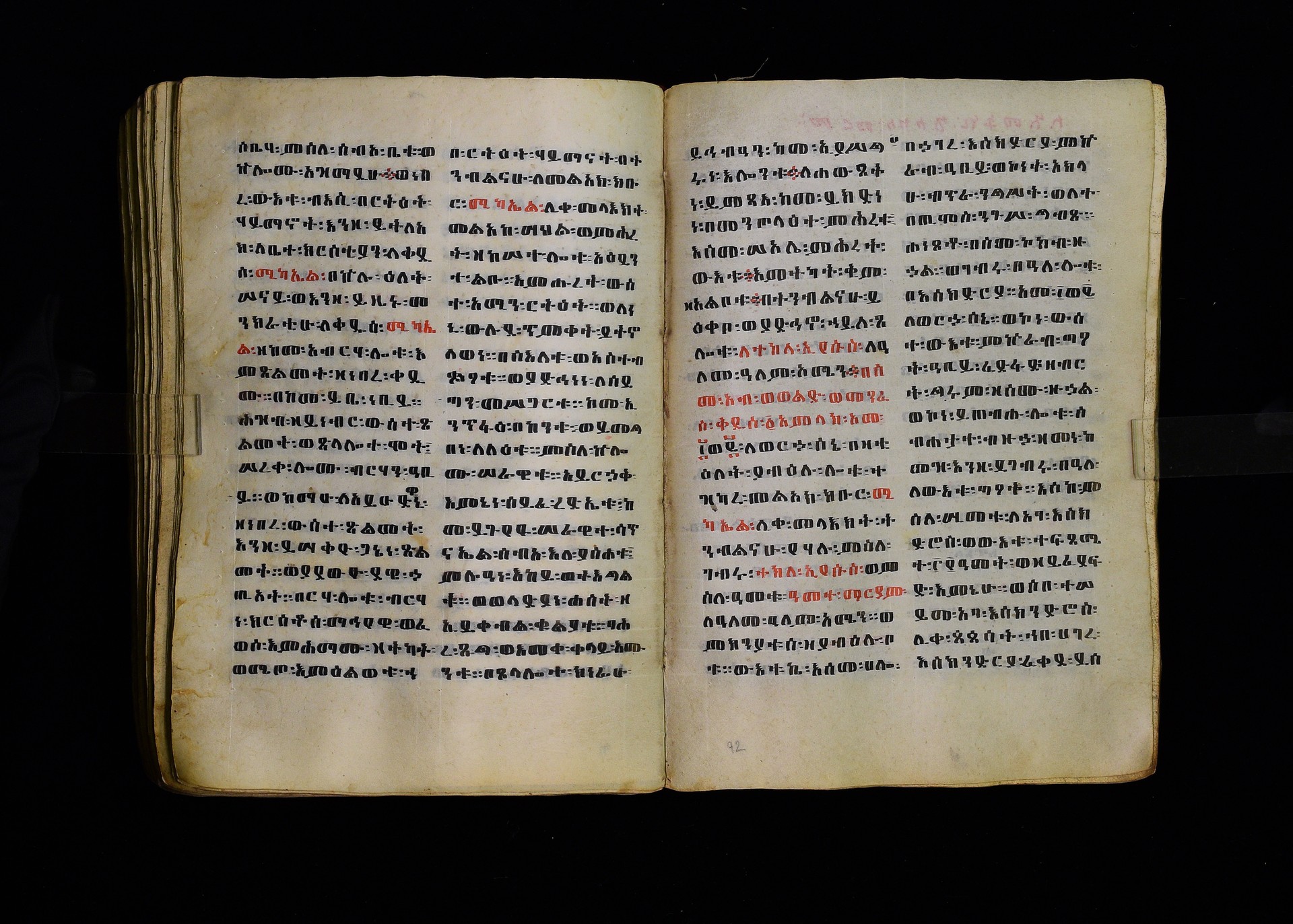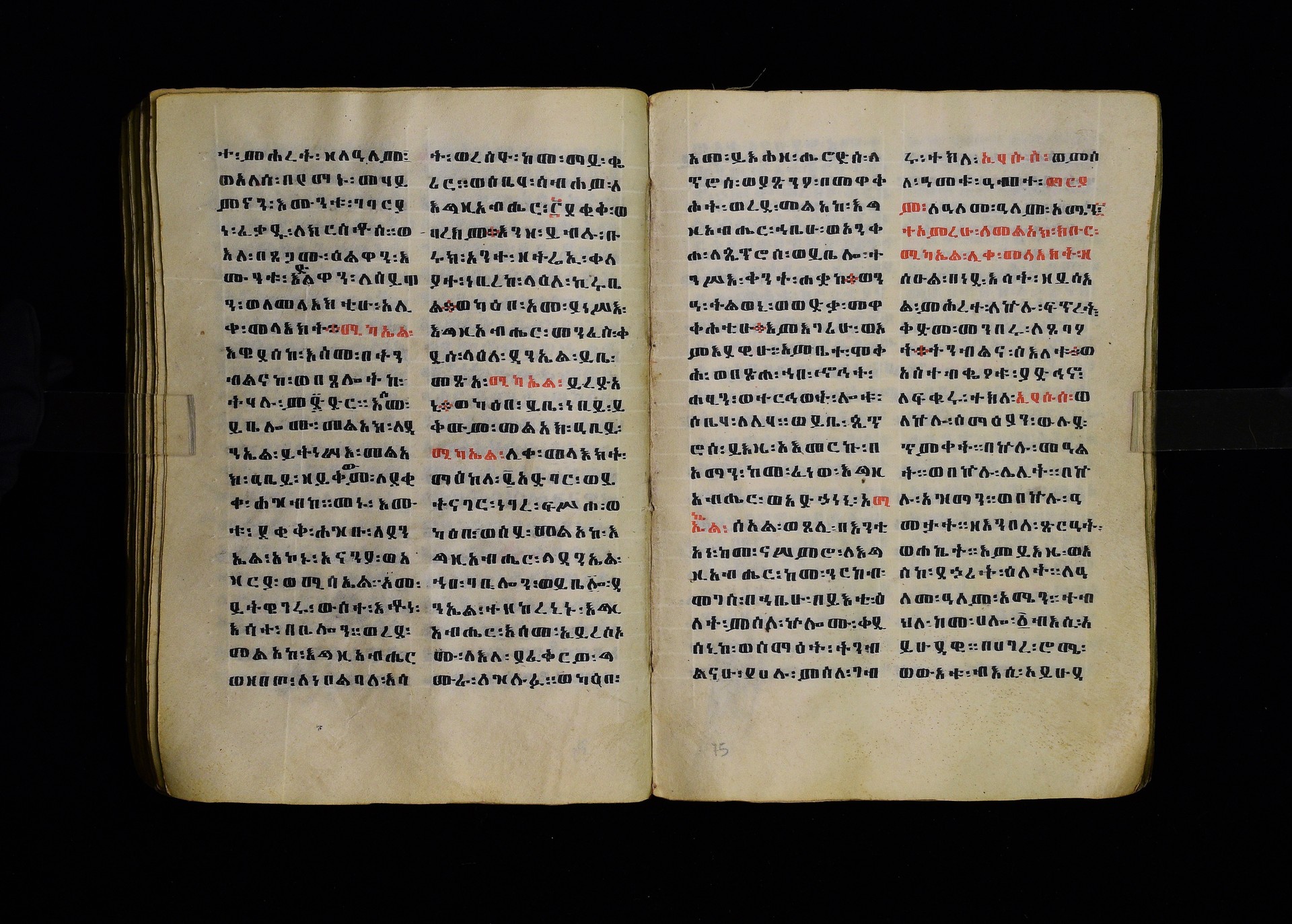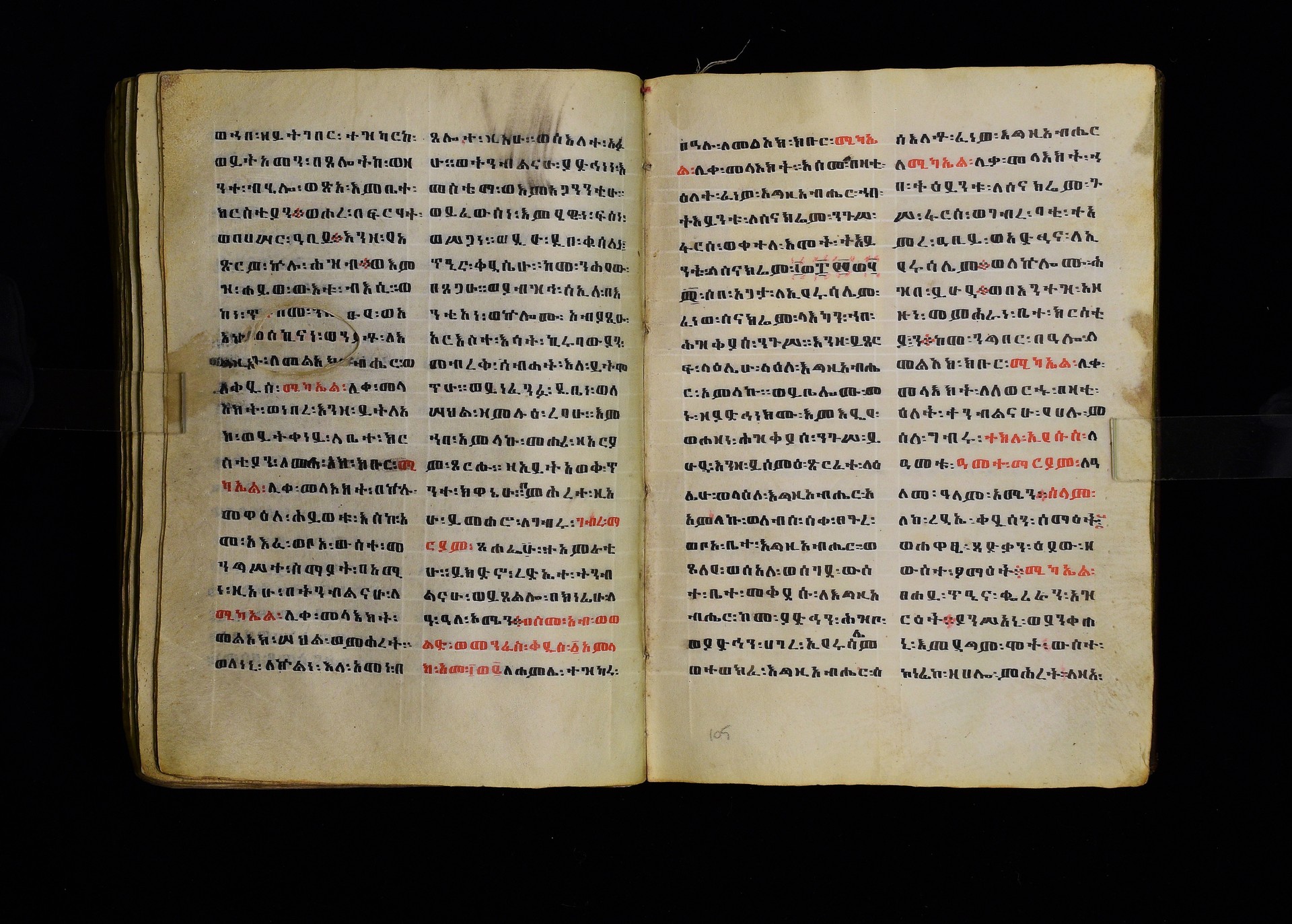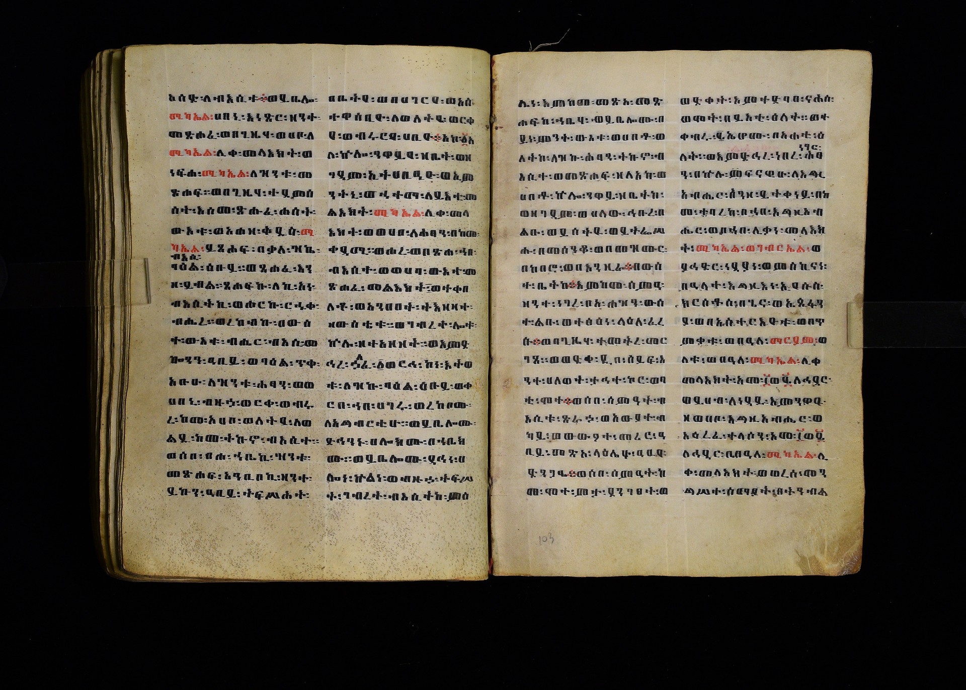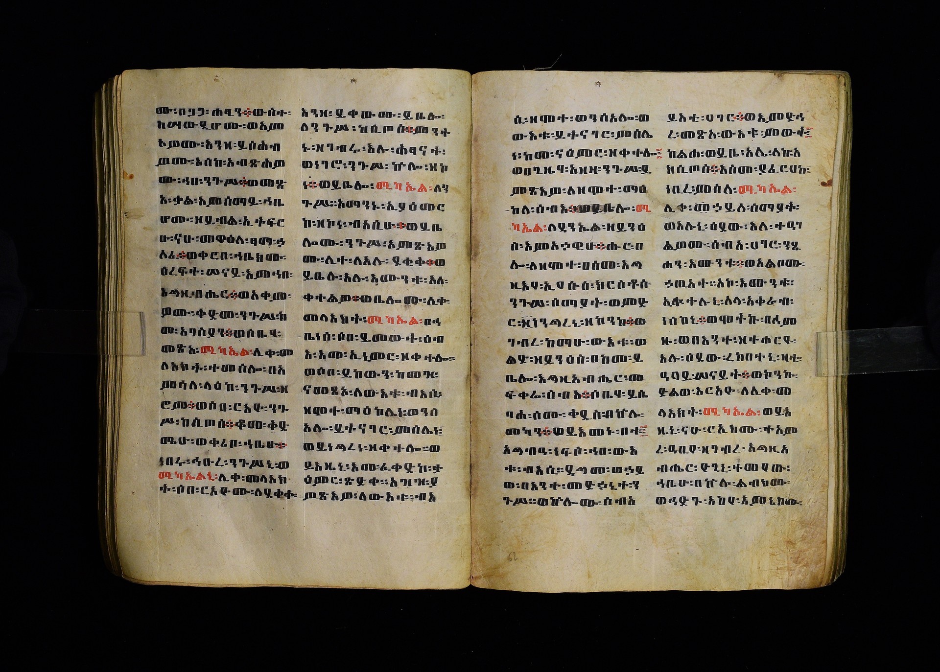 Full-page polychrome miniatures are found on f. 8v (St Michael), f. 33v (George and the dragon), f. 46v (the miracle of the wedding at Cana, with a caption በቃና added in a secondary hand), f. 70v (St Michele). |