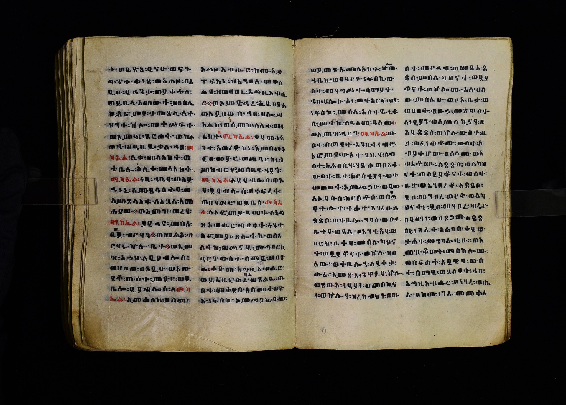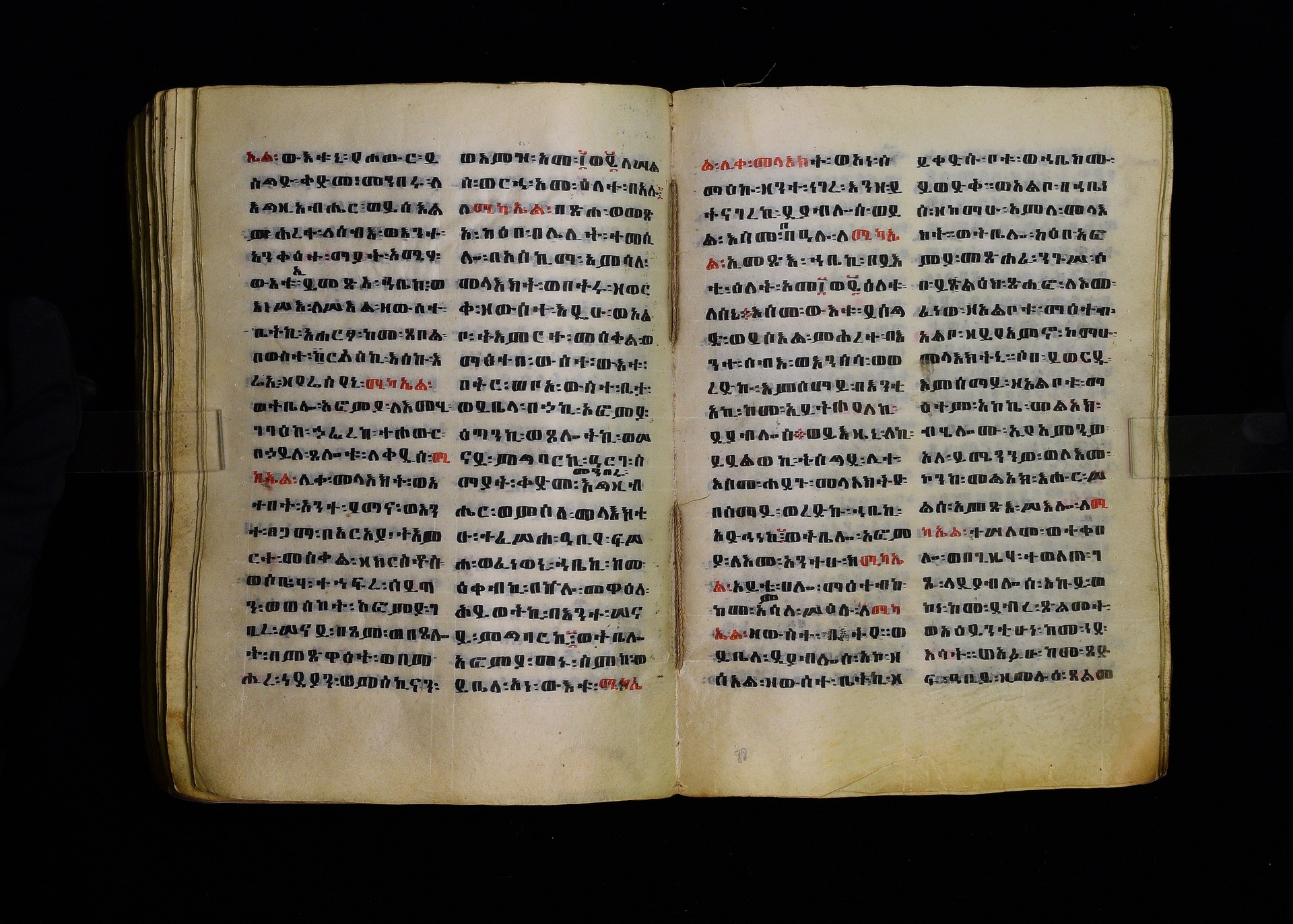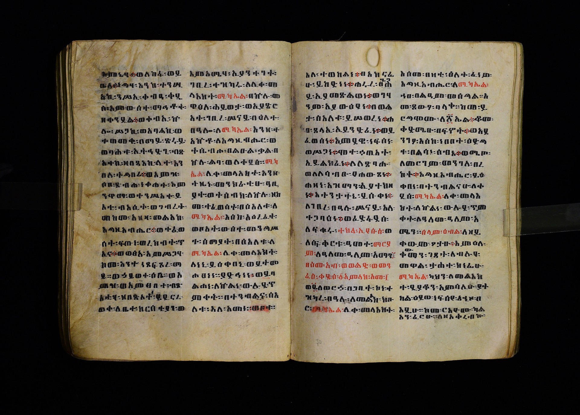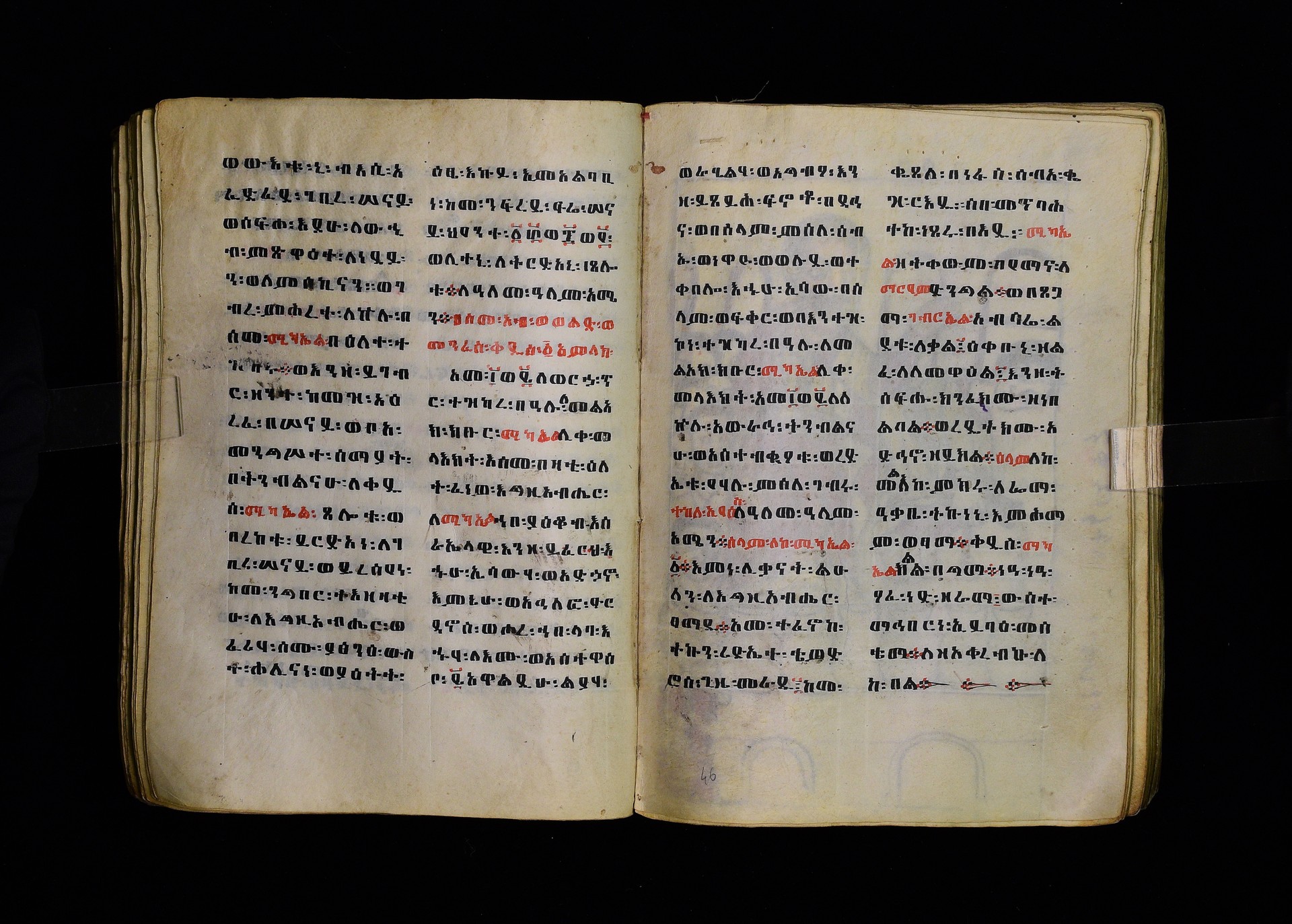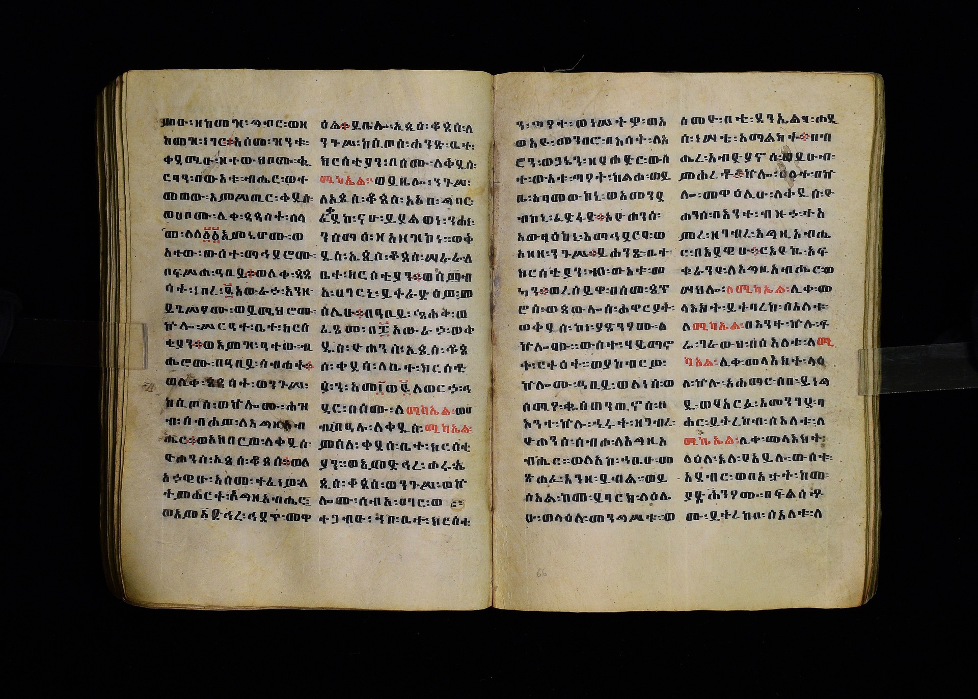 Full-page polychrome miniatures are found on f. 8v (St Michael), f. 33v (George and the dragon), f. 46v (the miracle of the wedding at Cana, with a caption በቃና added in a secondary hand), f. 70v (St Michele). |