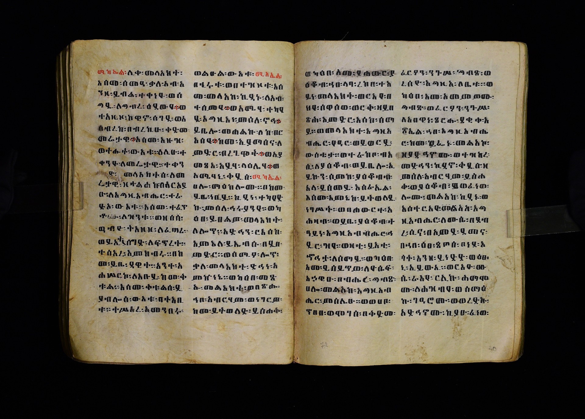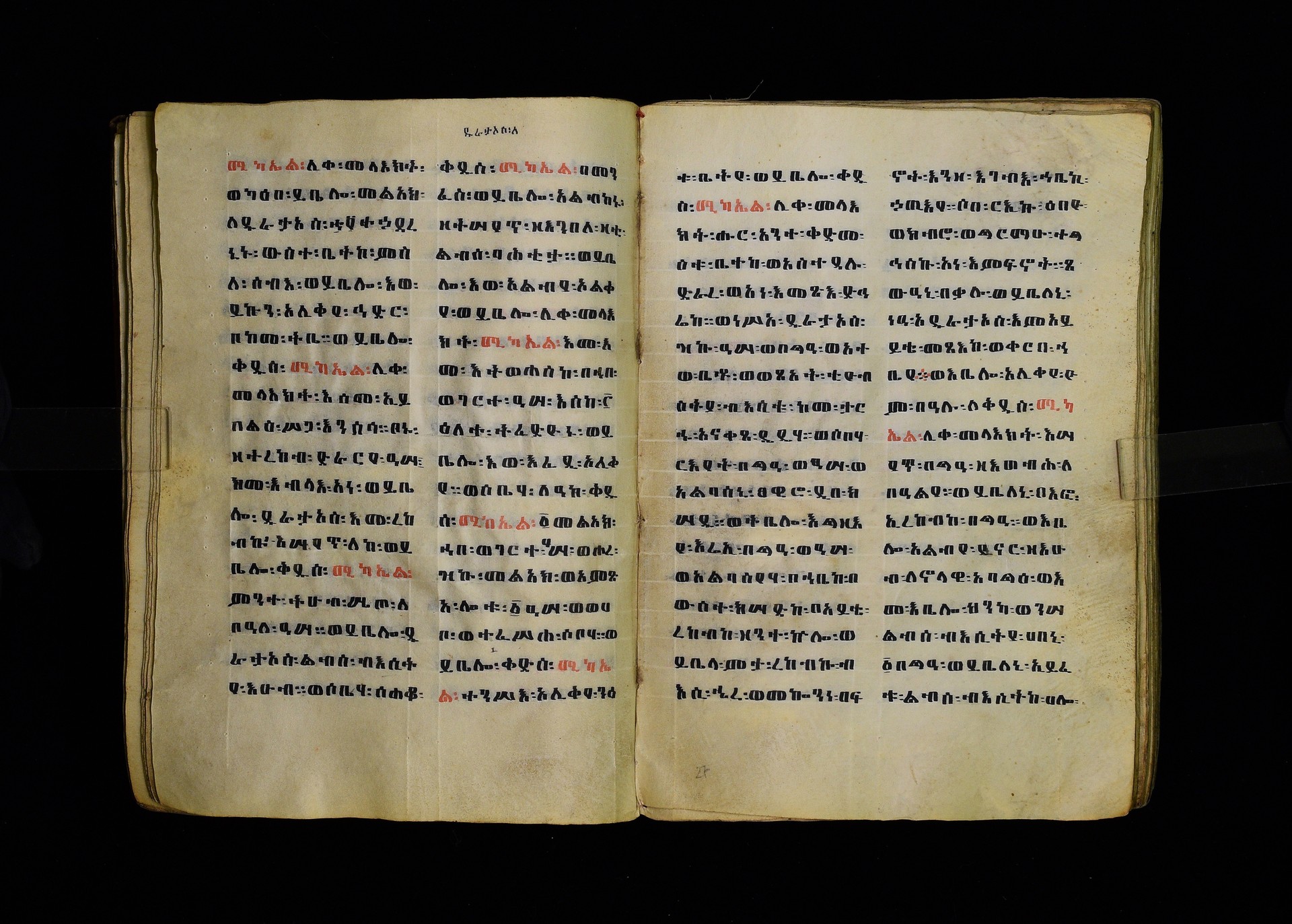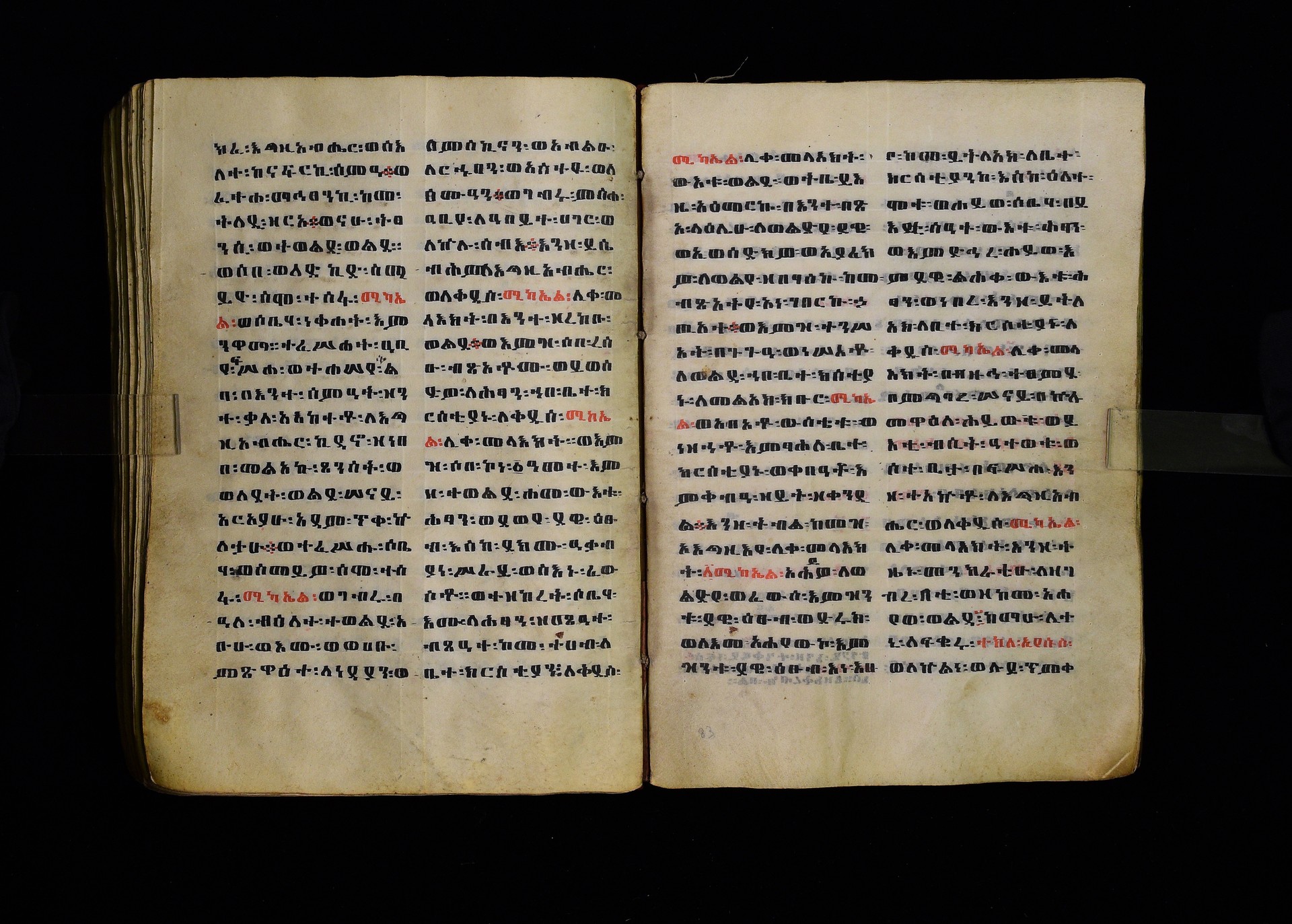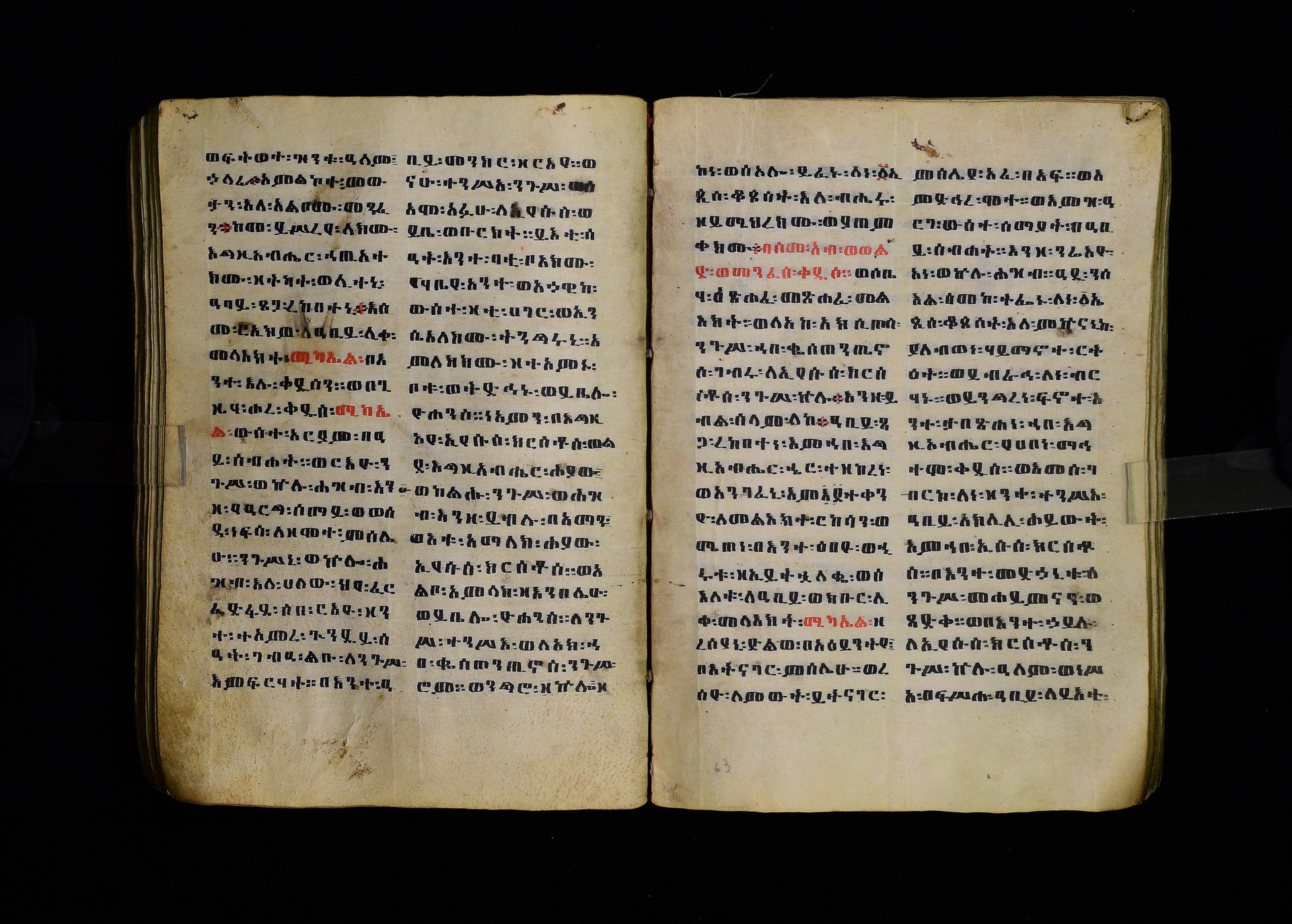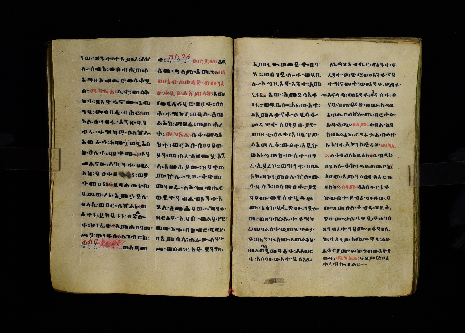 Full-page polychrome miniatures are found on f. 8v (St Michael), f. 33v (George and the dragon), f. 46v (the miracle of the wedding at Cana, with a caption በቃና added in a secondary hand), f. 70v (St Michele). |