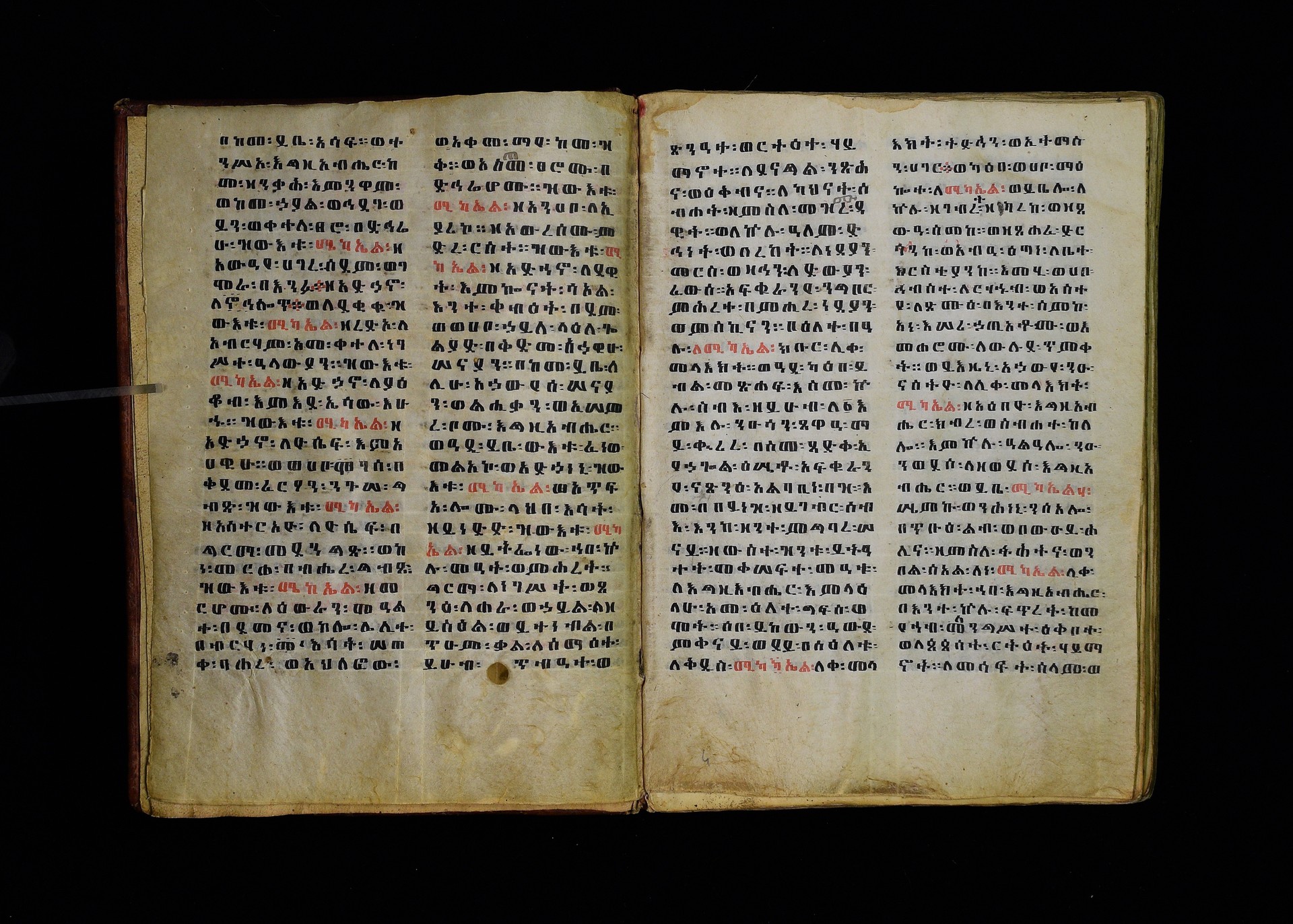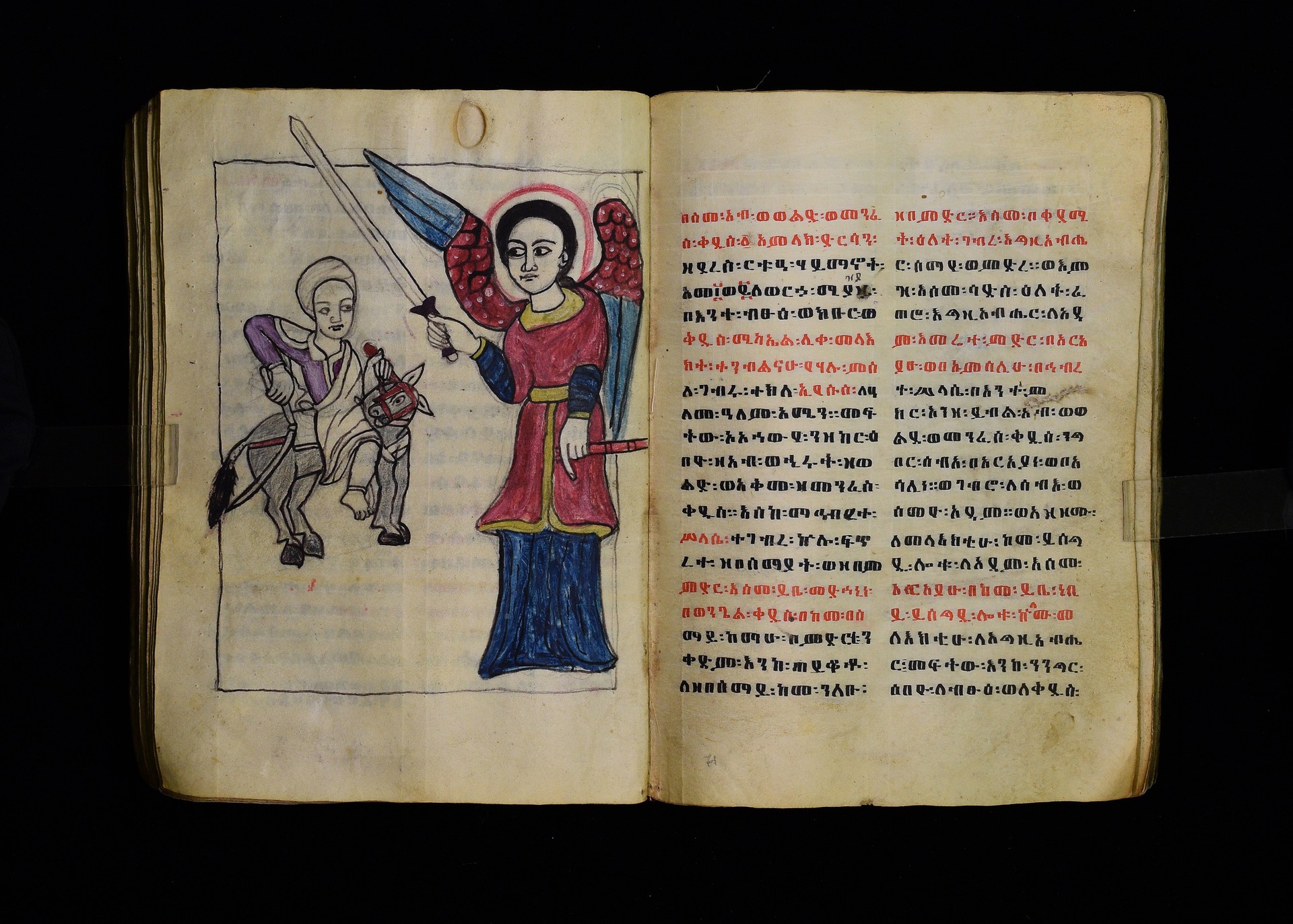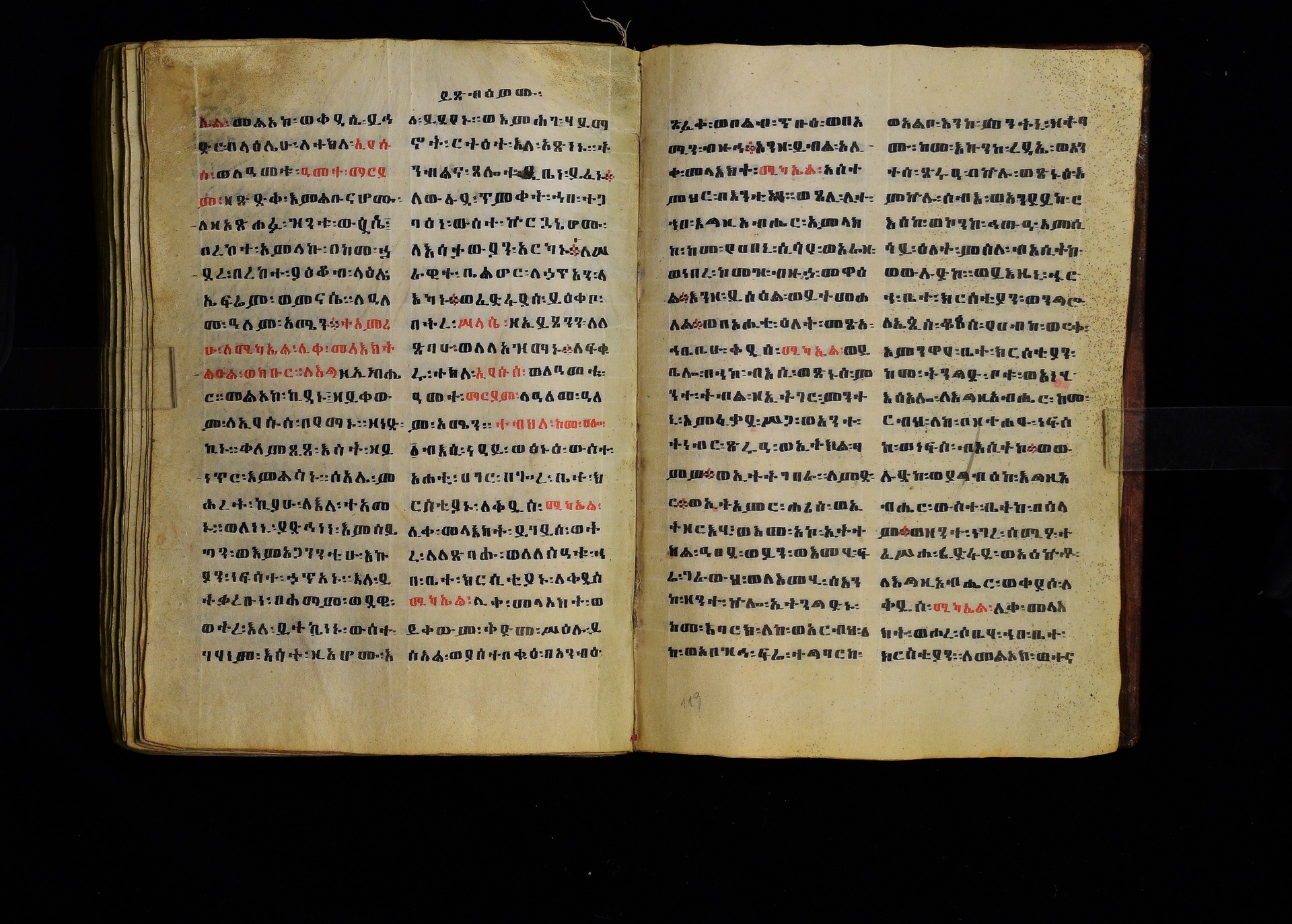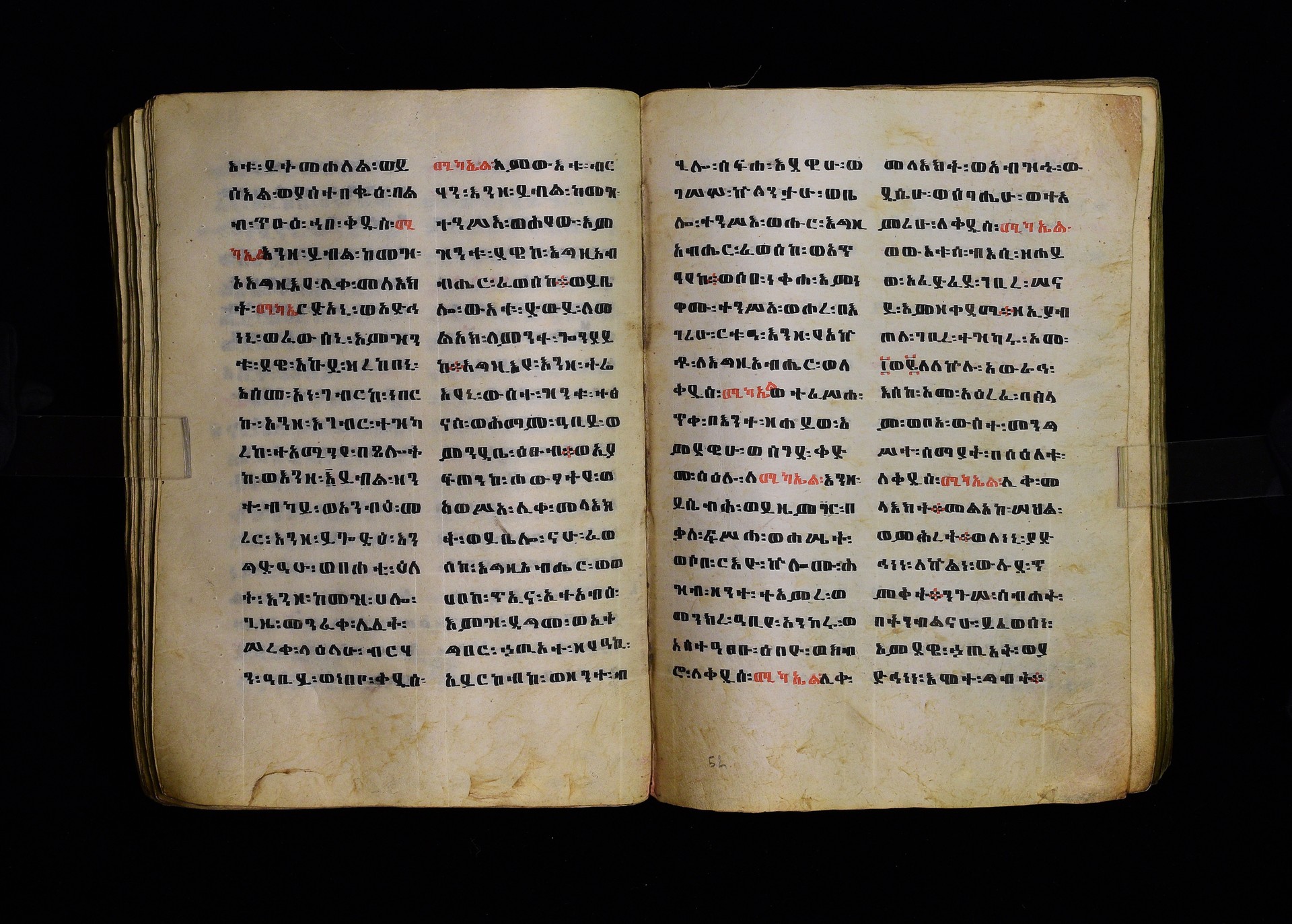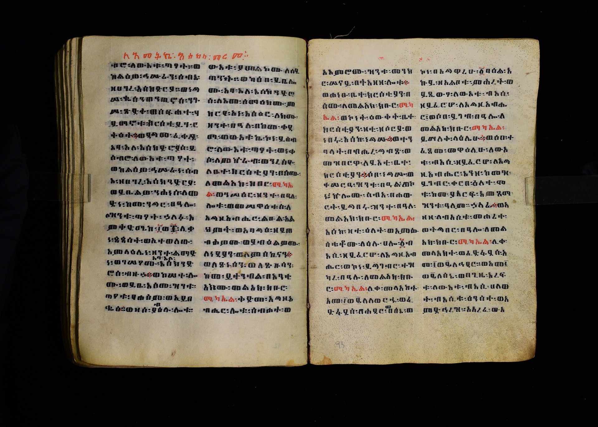 Full-page polychrome miniatures are found on f. 8v (St Michael), f. 33v (George and the dragon), f. 46v (the miracle of the wedding at Cana, with a caption በቃና added in a secondary hand), f. 70v (St Michele). |