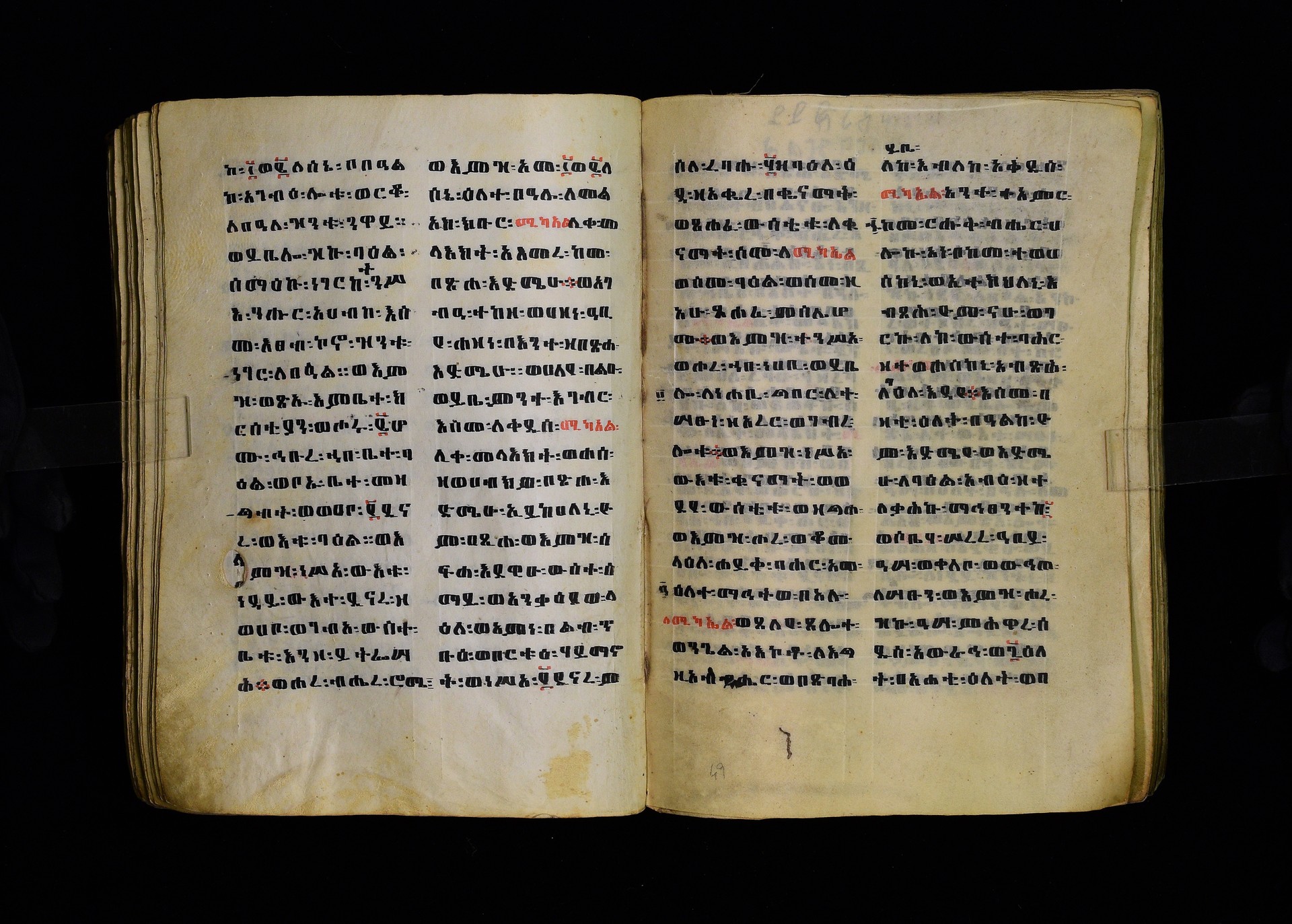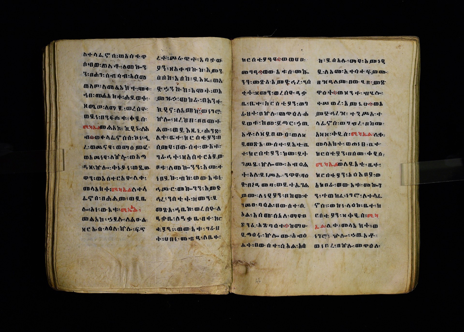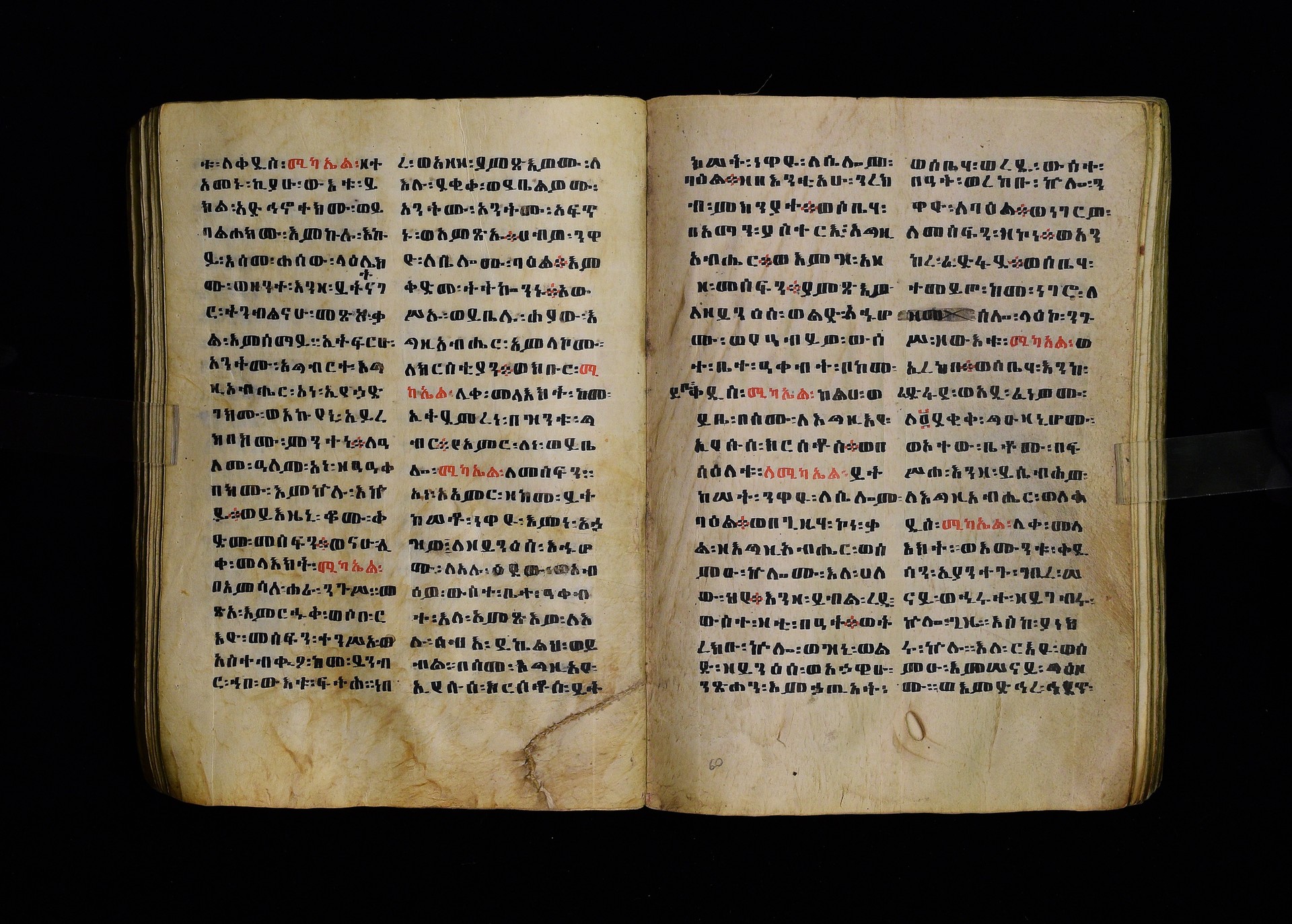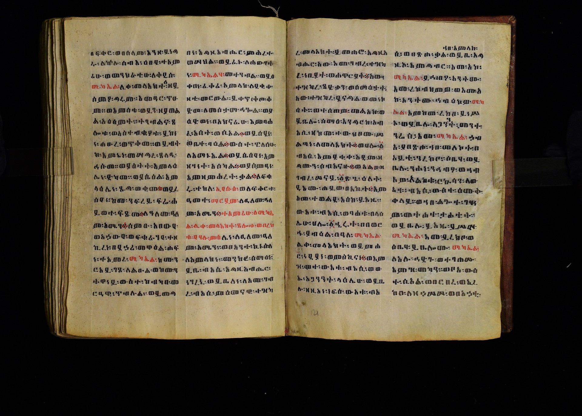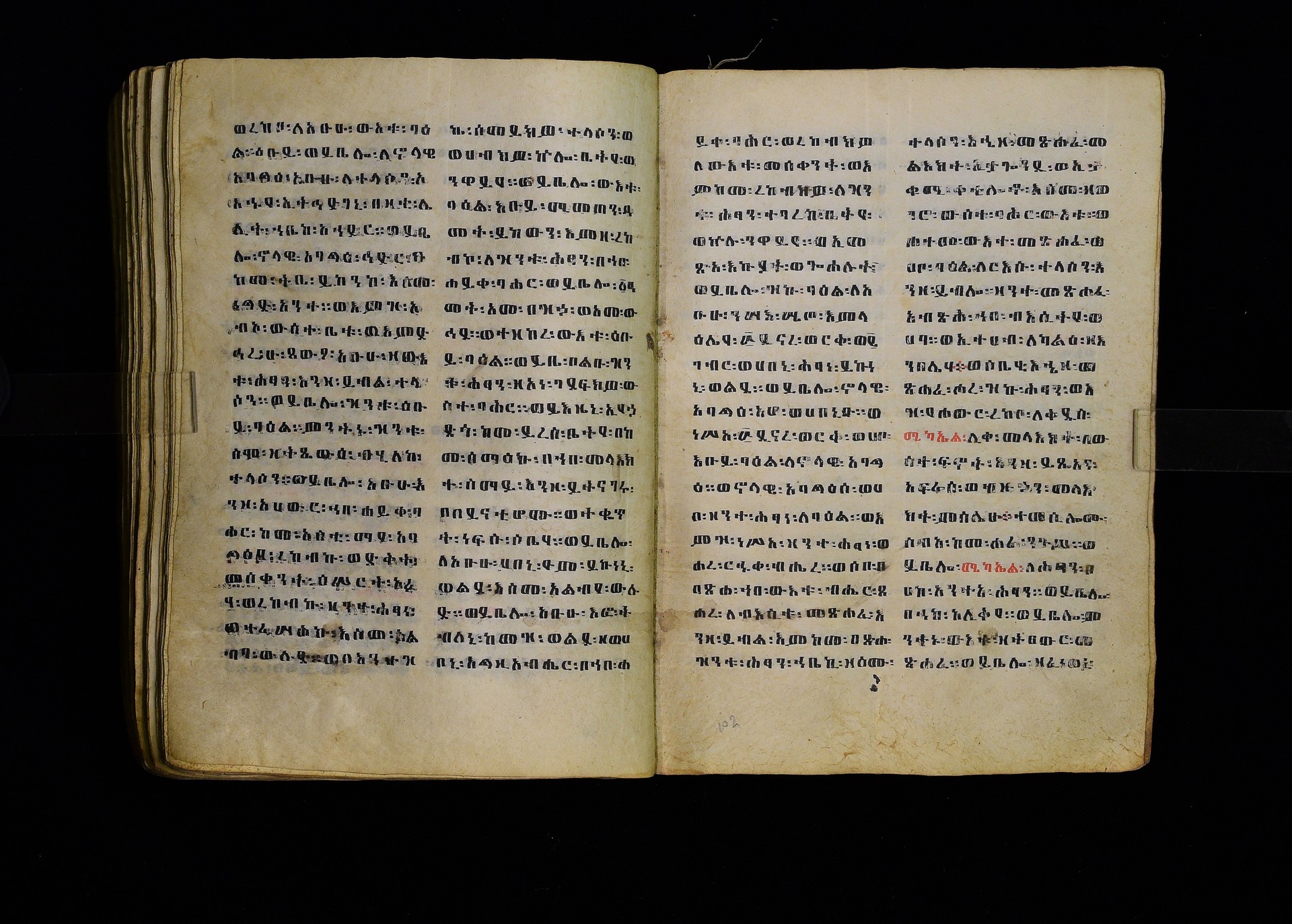 Full-page polychrome miniatures are found on f. 8v (St Michael), f. 33v (George and the dragon), f. 46v (the miracle of the wedding at Cana, with a caption በቃና added in a secondary hand), f. 70v (St Michele). |