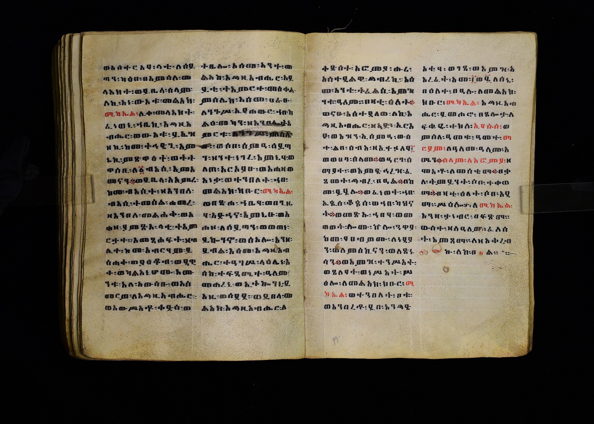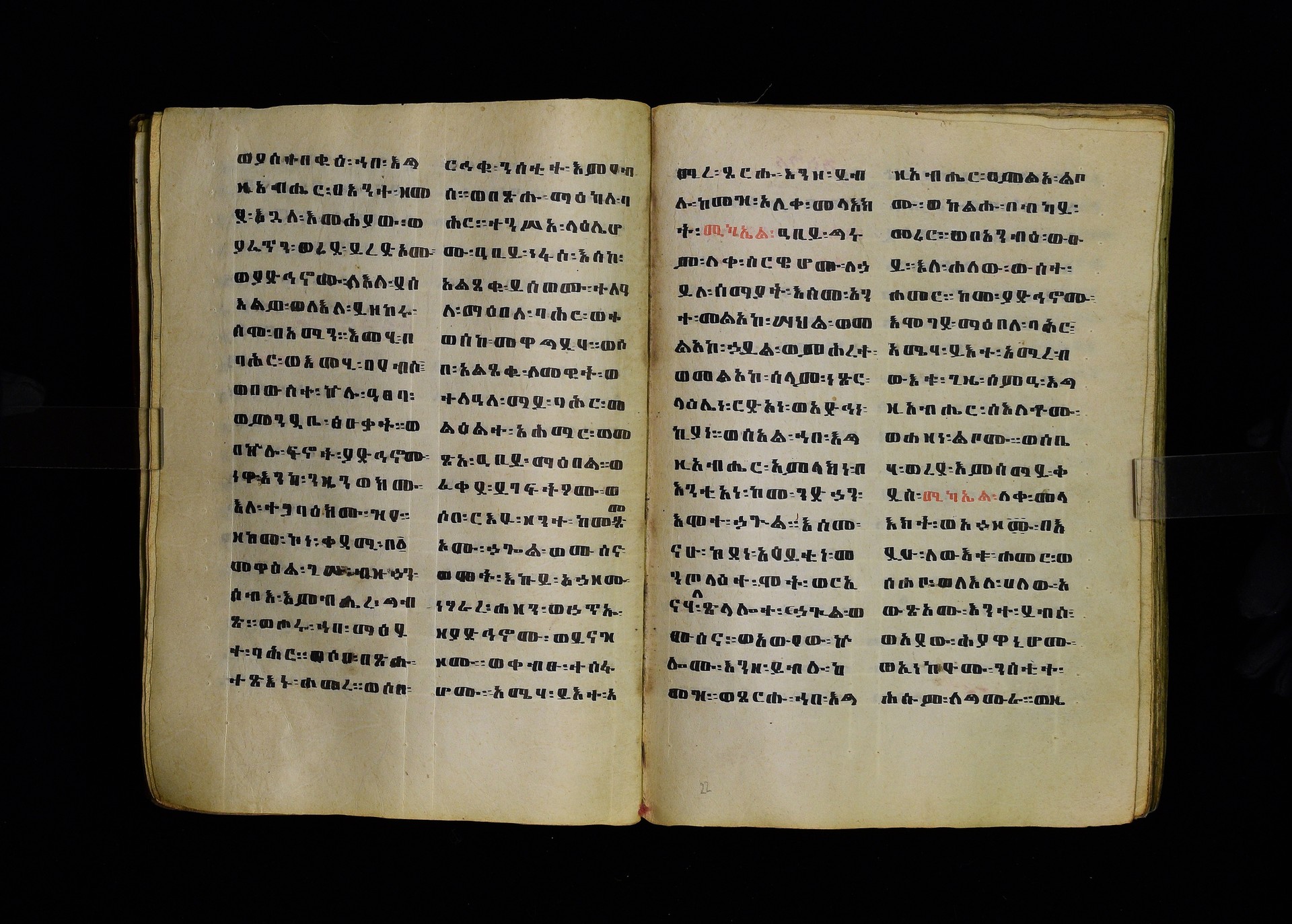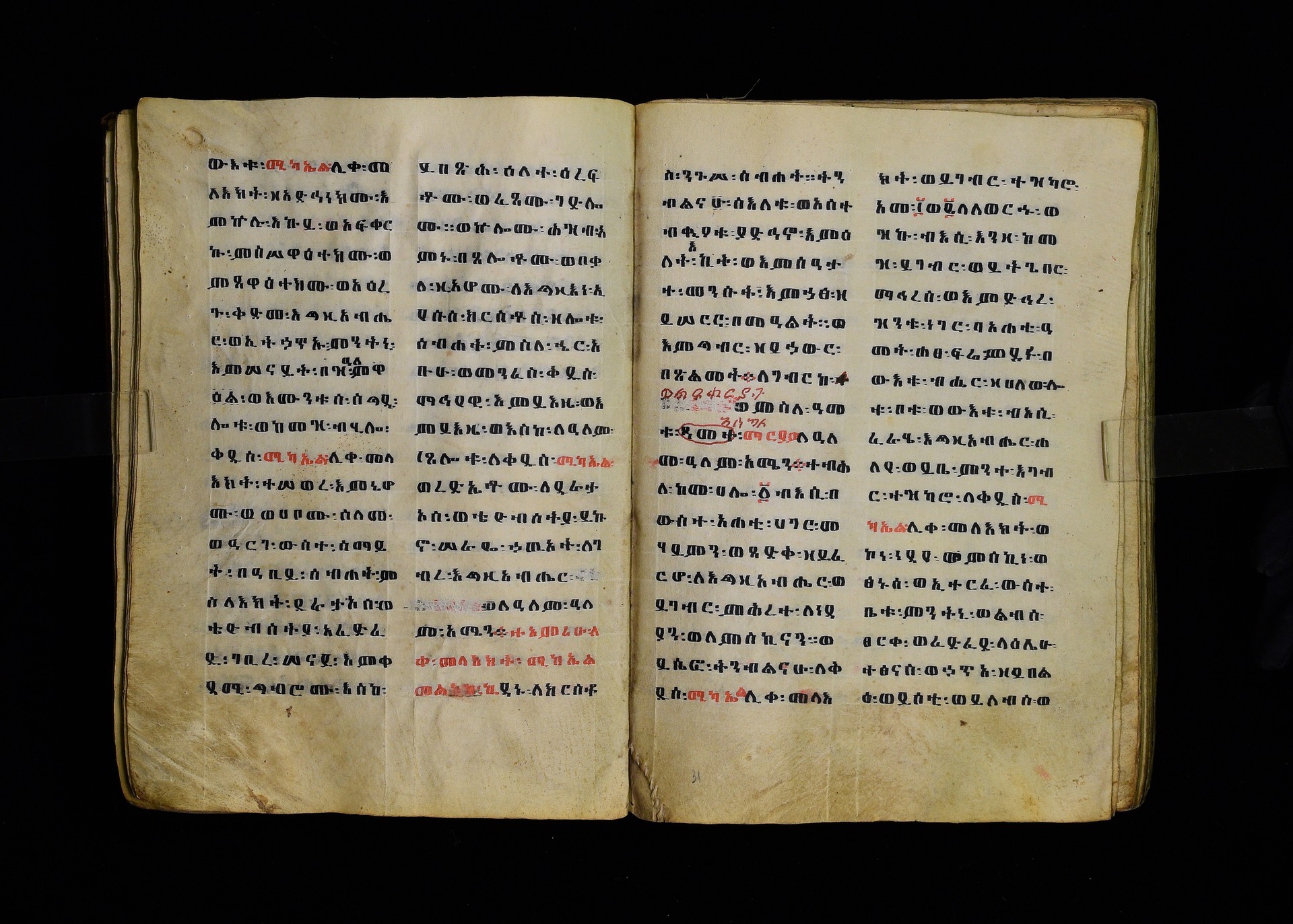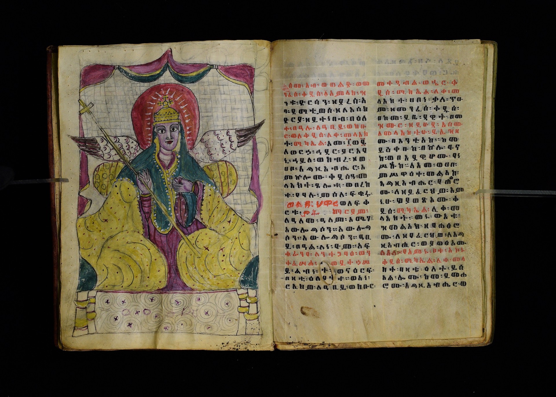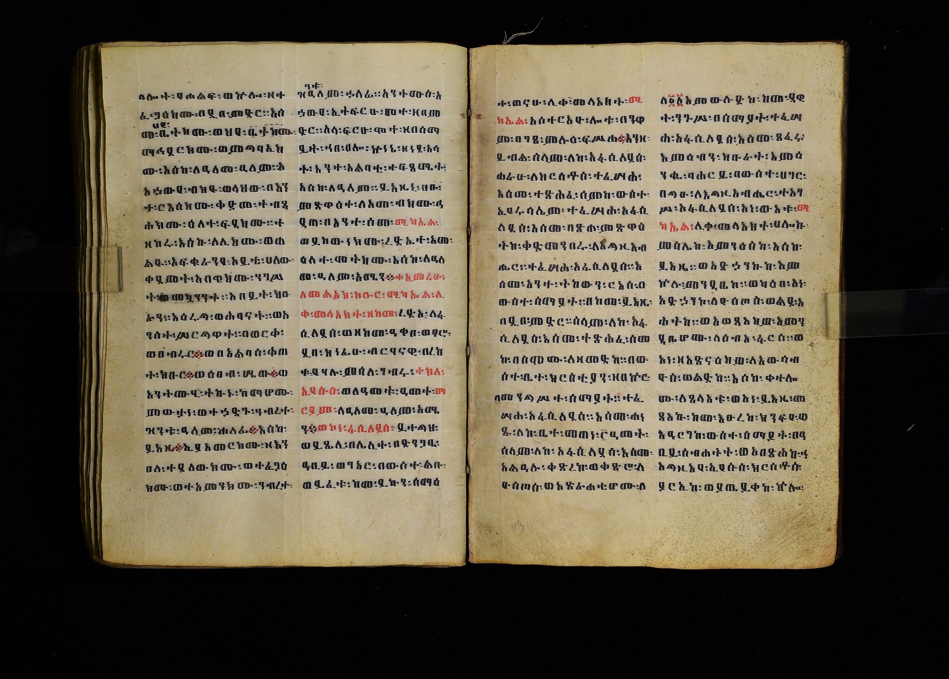 Full-page polychrome miniatures are found on f. 8v (St Michael), f. 33v (George and the dragon), f. 46v (the miracle of the wedding at Cana, with a caption በቃና added in a secondary hand), f. 70v (St Michele). |