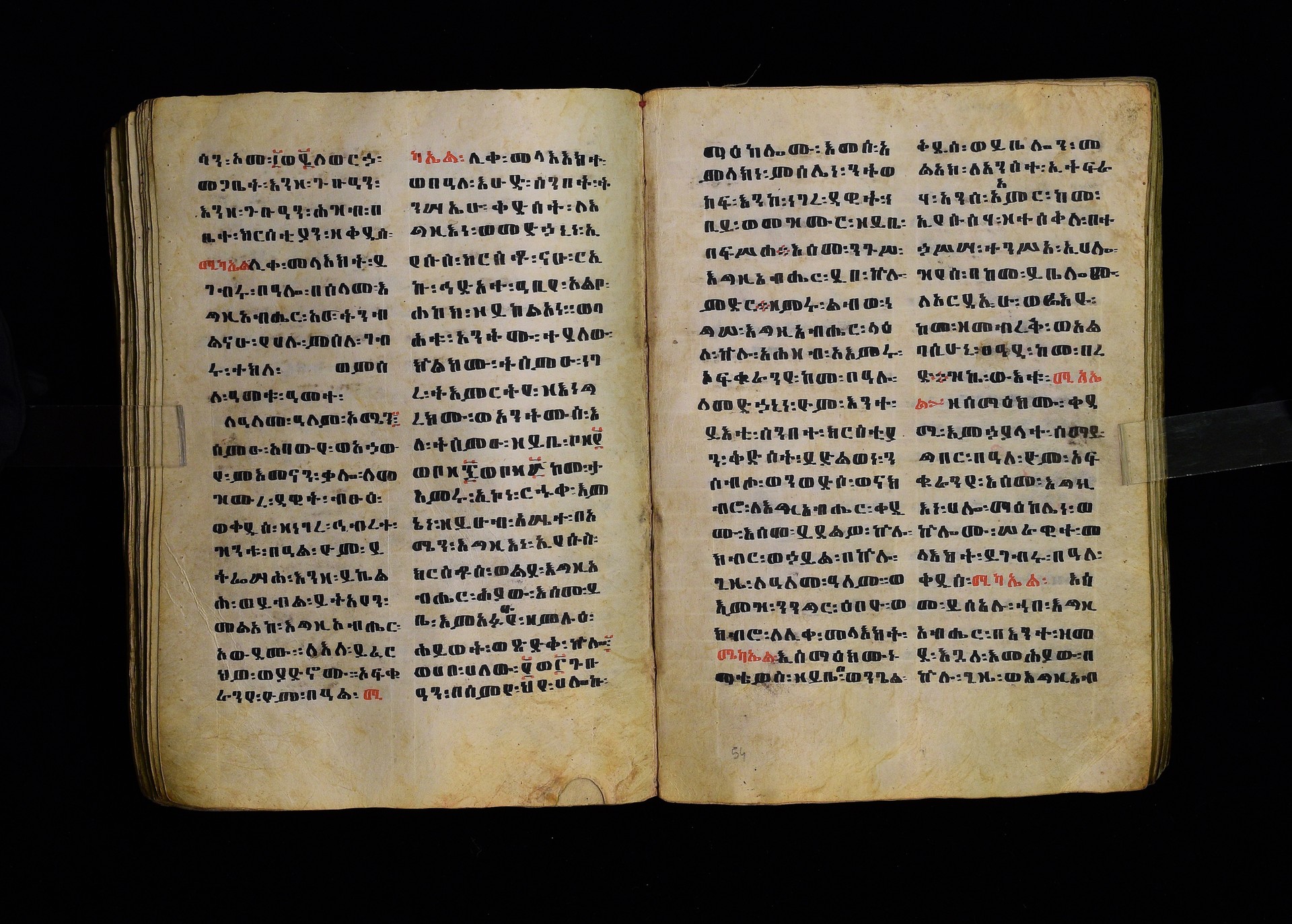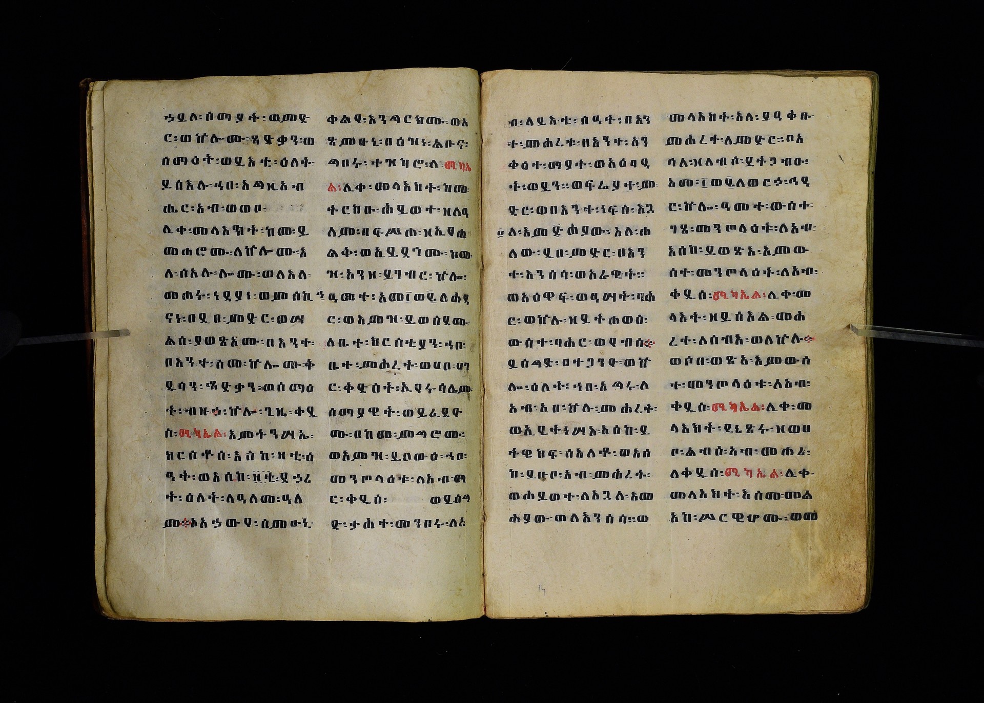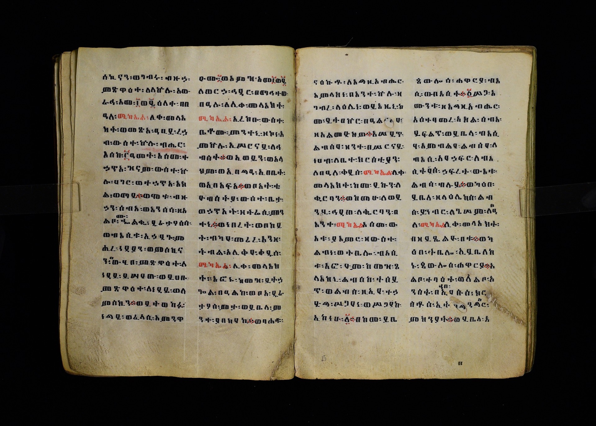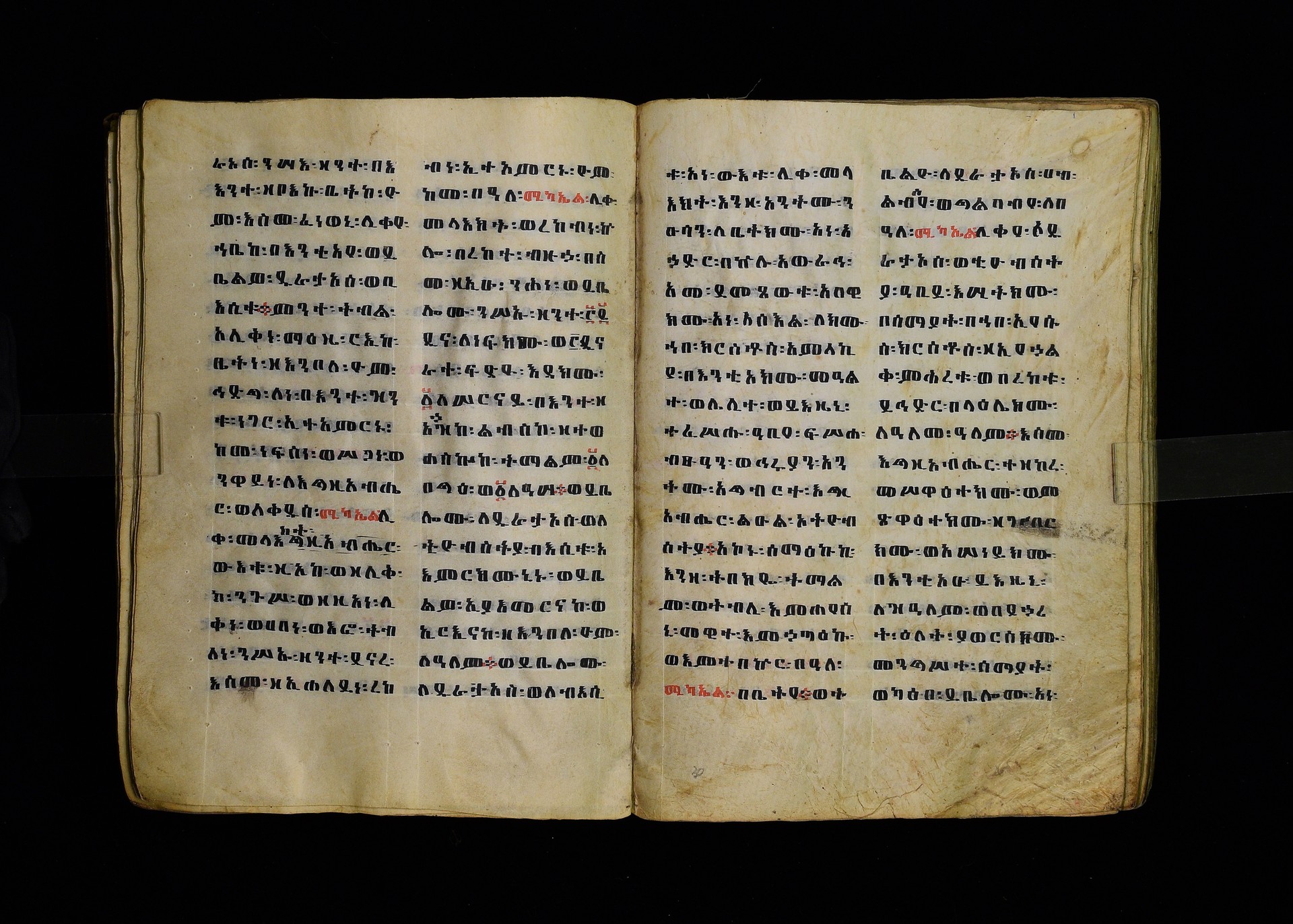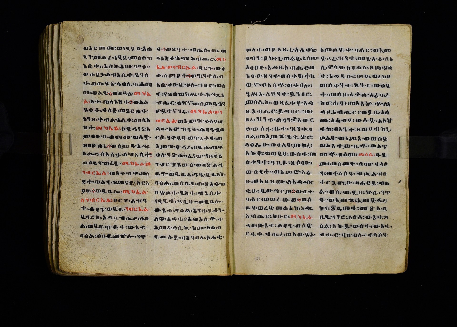 Full-page polychrome miniatures are found on f. 8v (St Michael), f. 33v (George and the dragon), f. 46v (the miracle of the wedding at Cana, with a caption በቃና added in a secondary hand), f. 70v (St Michele). |