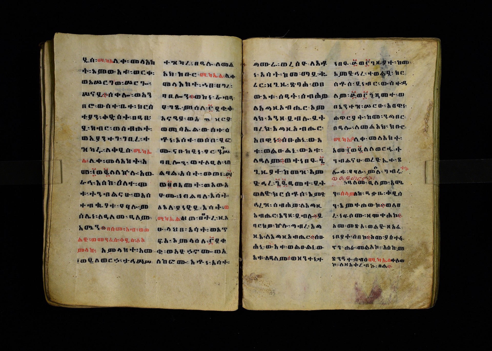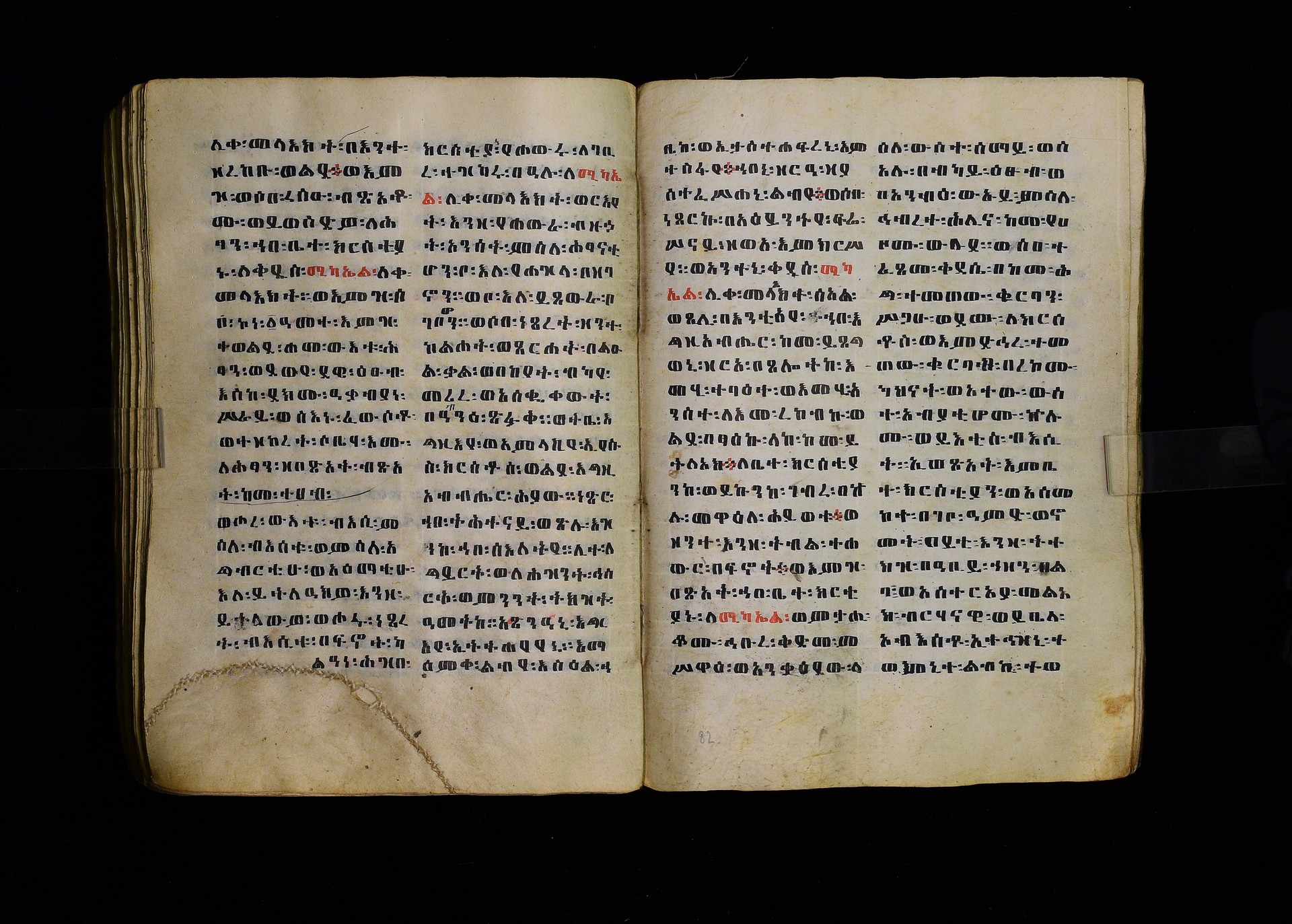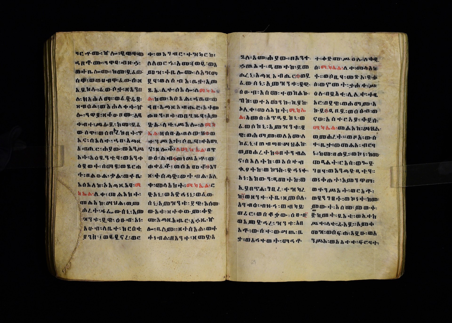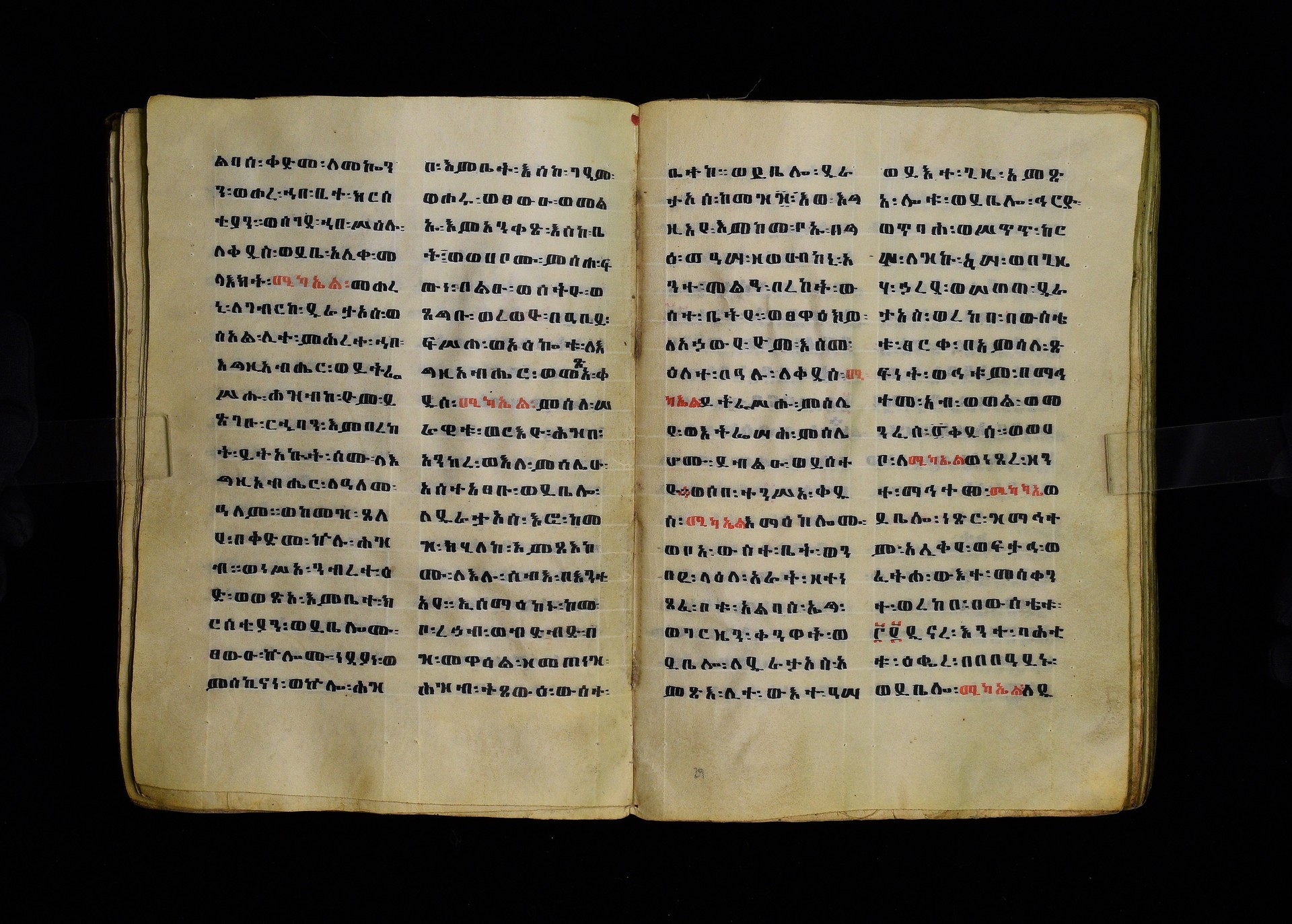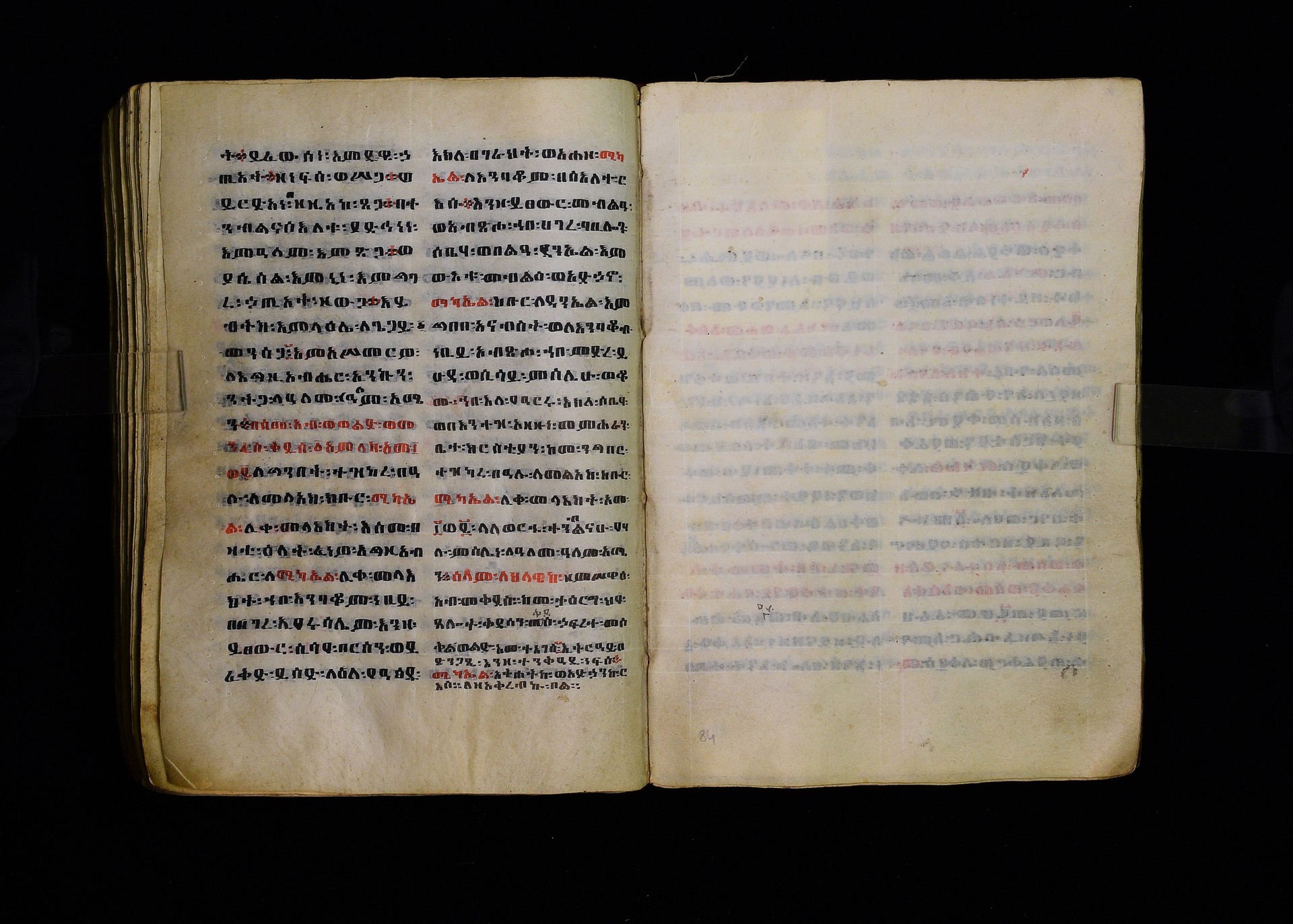 Full-page polychrome miniatures are found on f. 8v (St Michael), f. 33v (George and the dragon), f. 46v (the miracle of the wedding at Cana, with a caption በቃና added in a secondary hand), f. 70v (St Michele). |