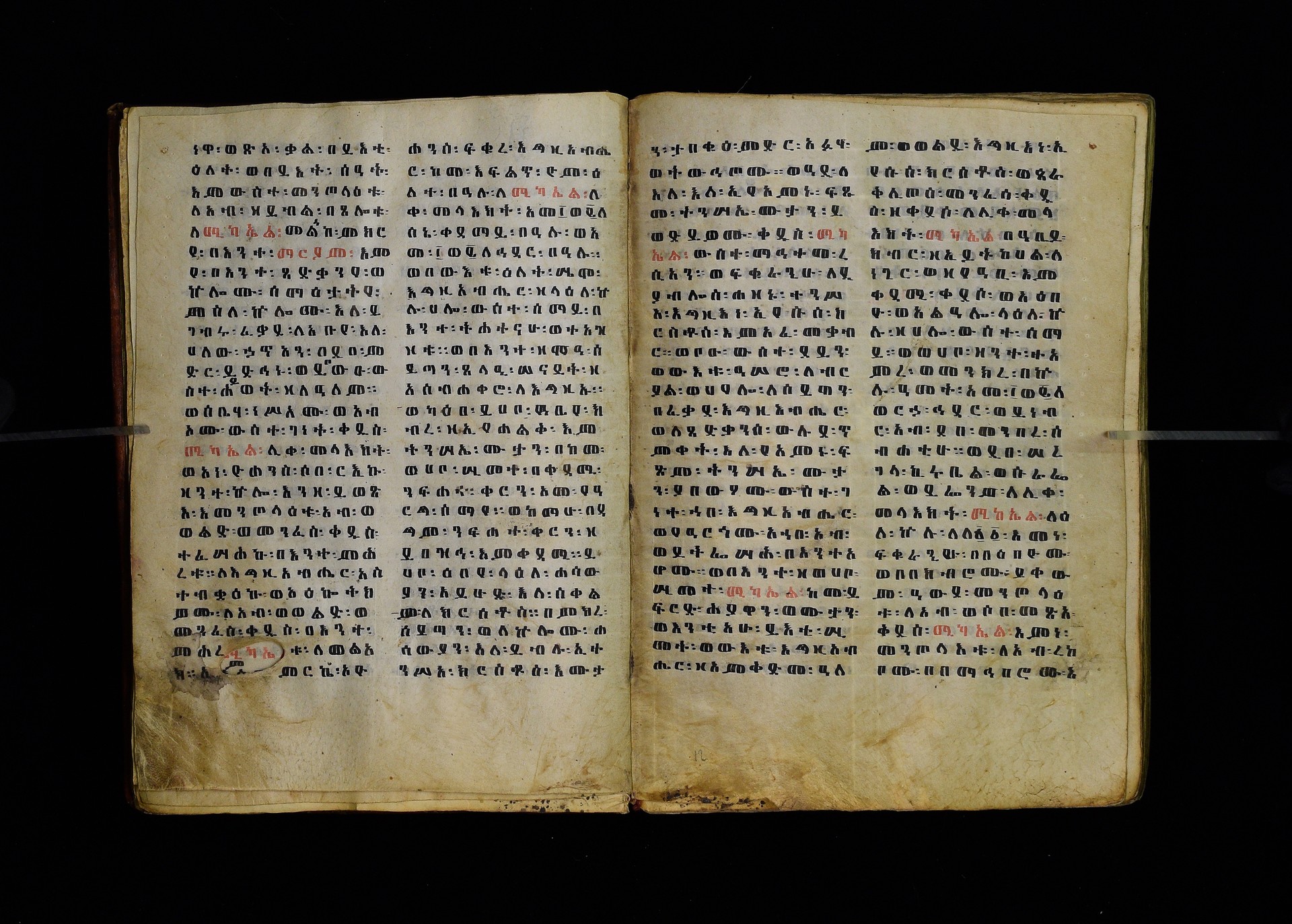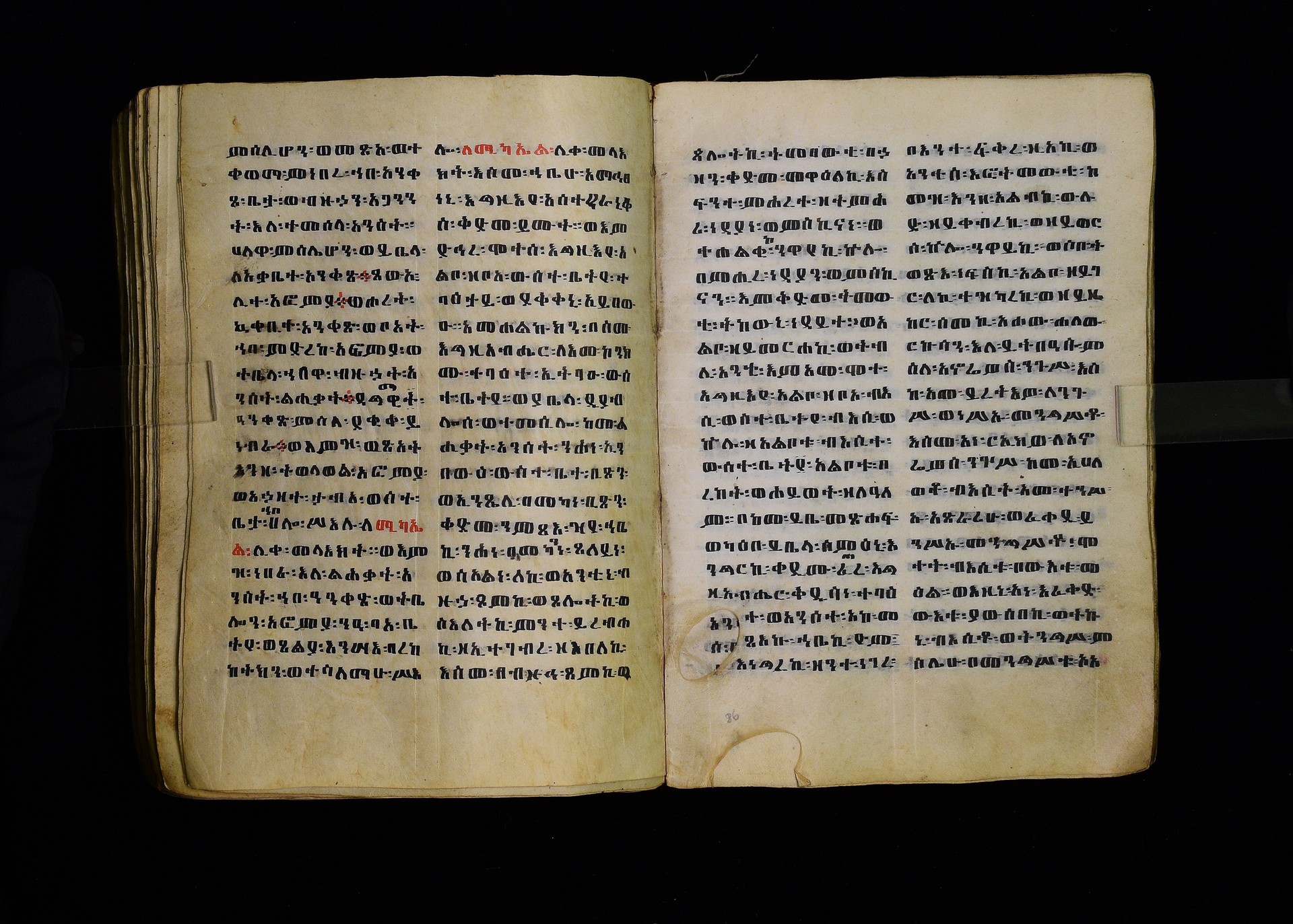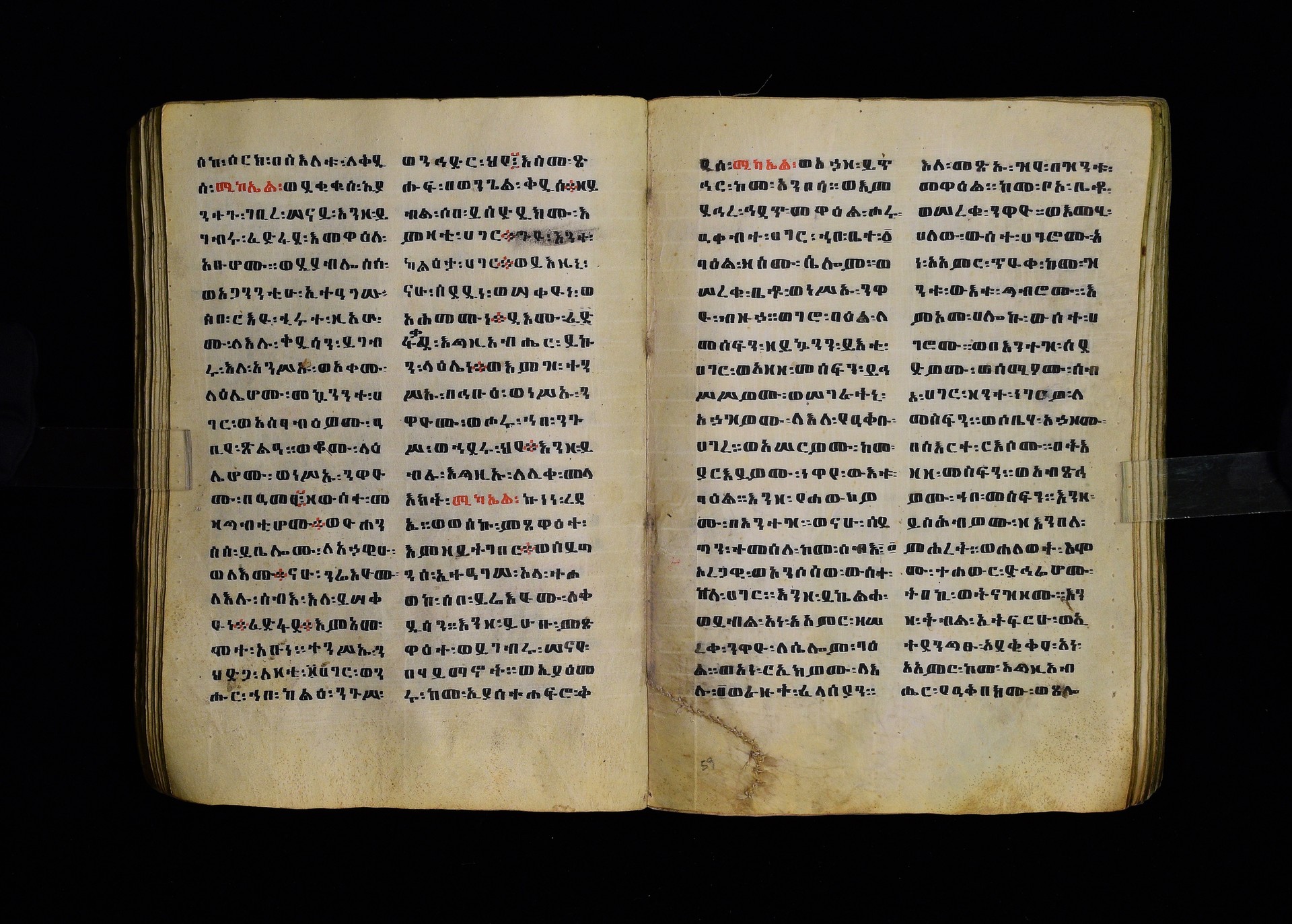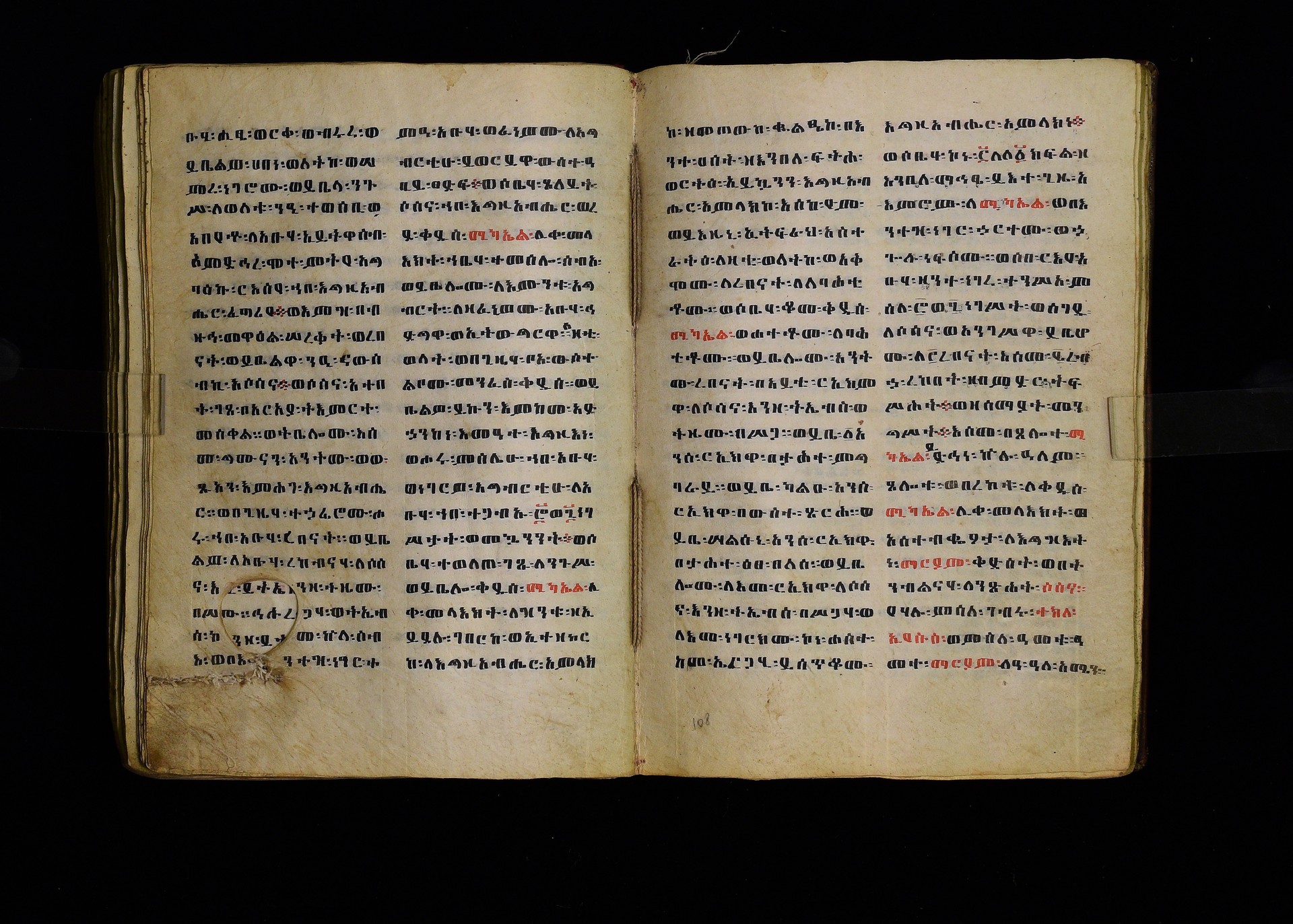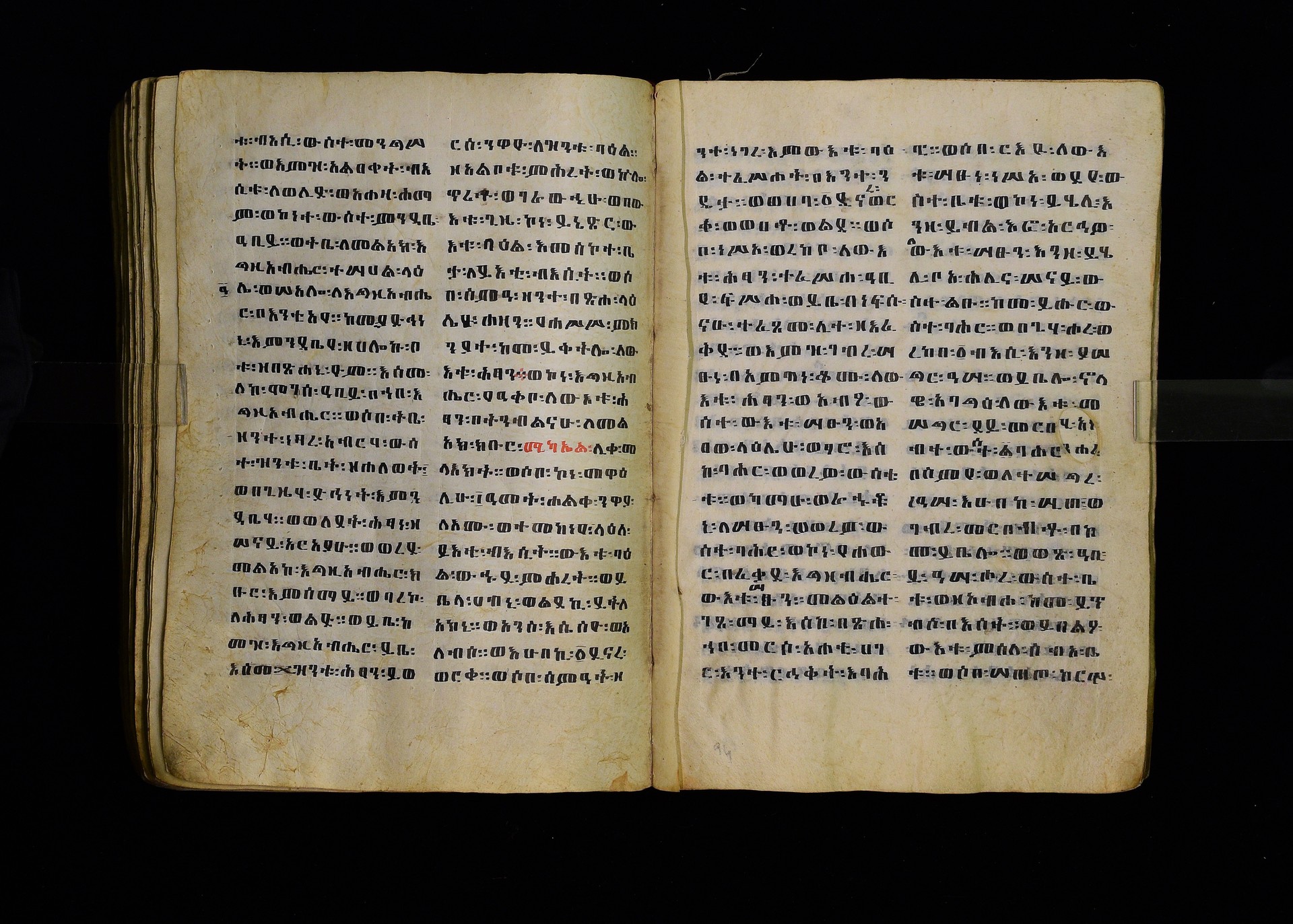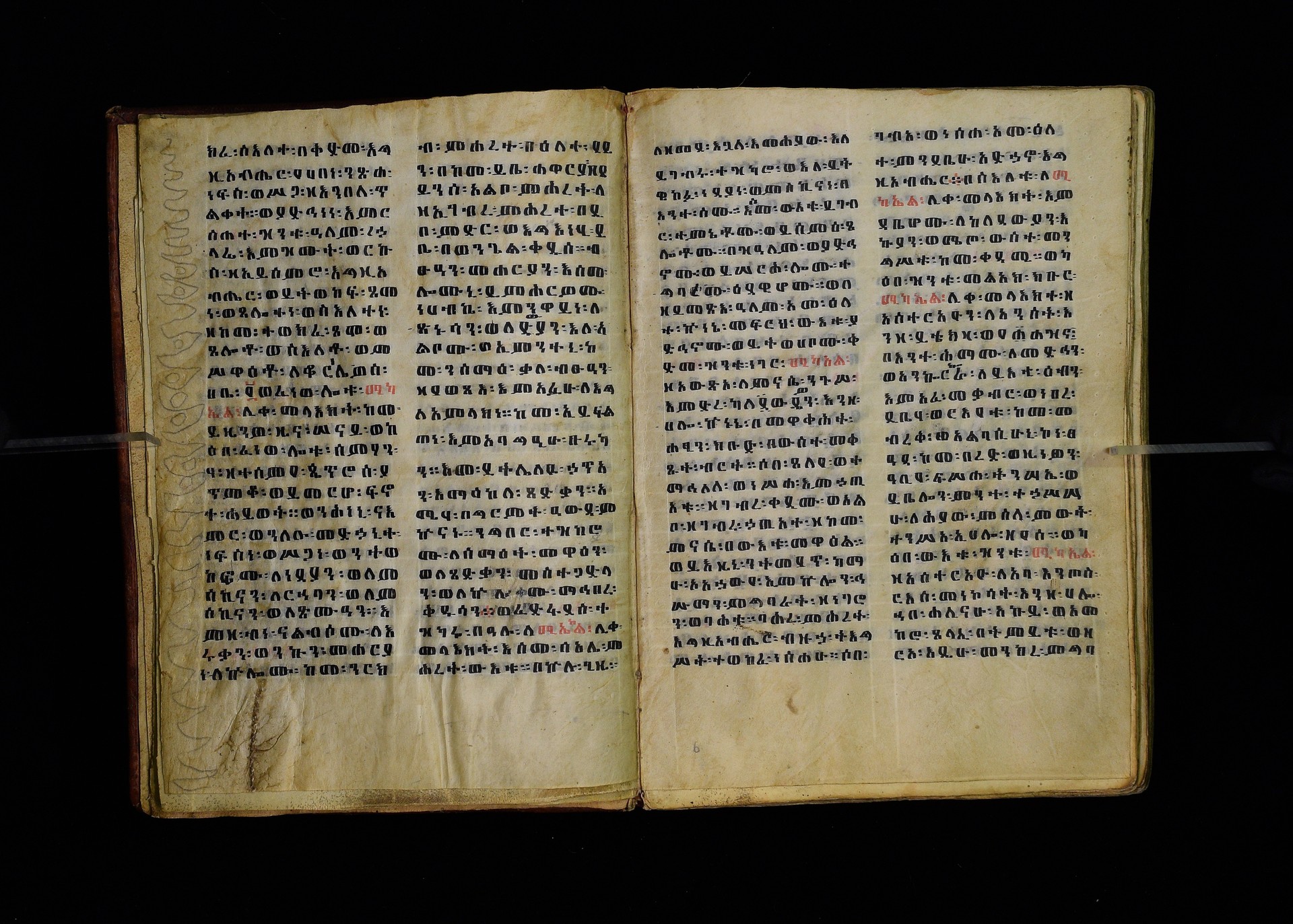 Full-page polychrome miniatures are found on f. 8v (St Michael), f. 33v (George and the dragon), f. 46v (the miracle of the wedding at Cana, with a caption በቃና added in a secondary hand), f. 70v (St Michele). |