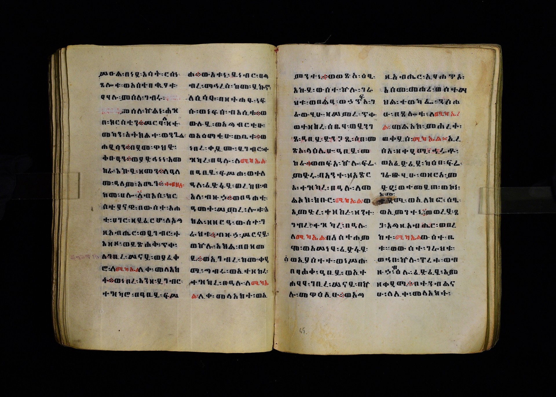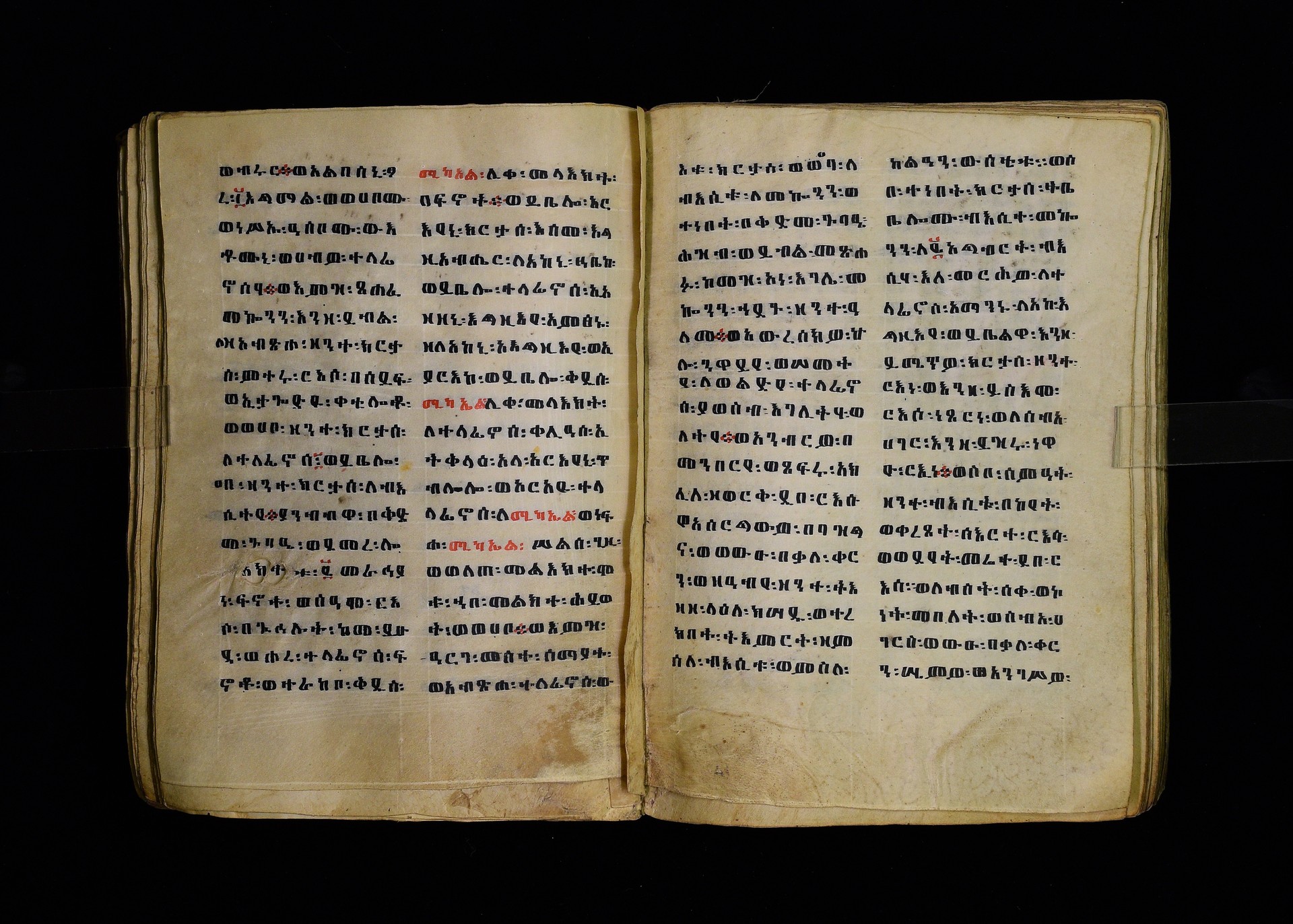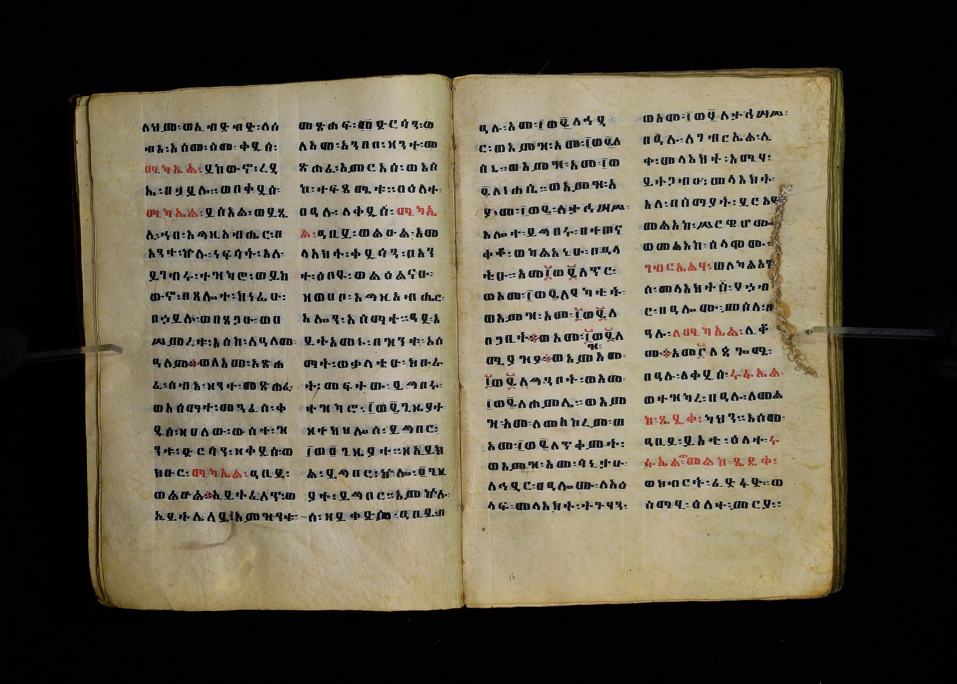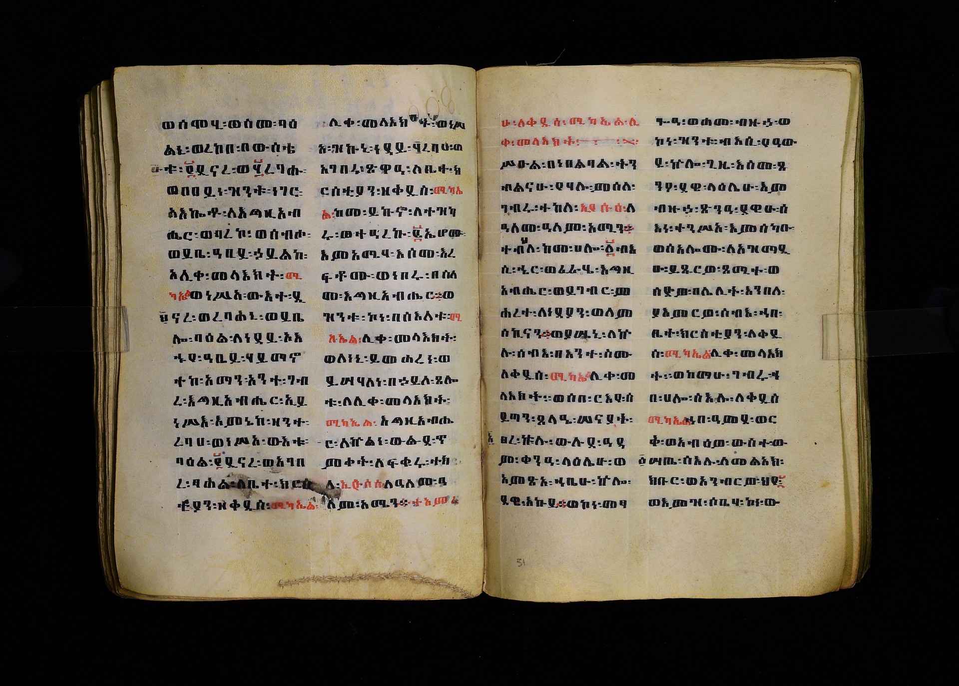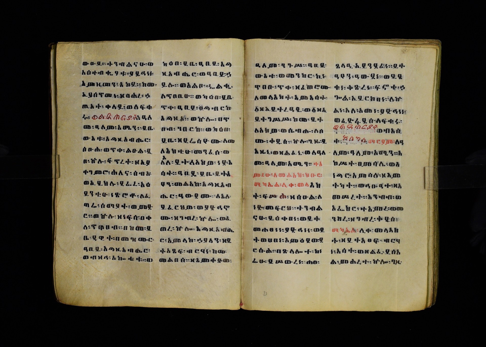 Full-page polychrome miniatures are found on f. 8v (St Michael), f. 33v (George and the dragon), f. 46v (the miracle of the wedding at Cana, with a caption በቃና added in a secondary hand), f. 70v (St Michele). |