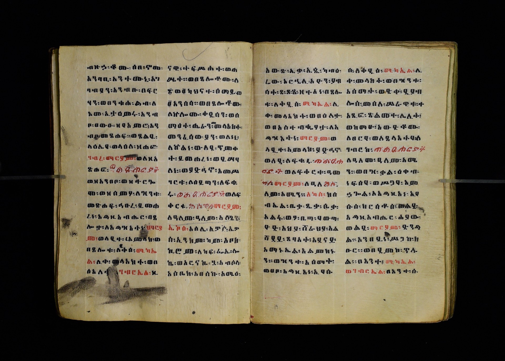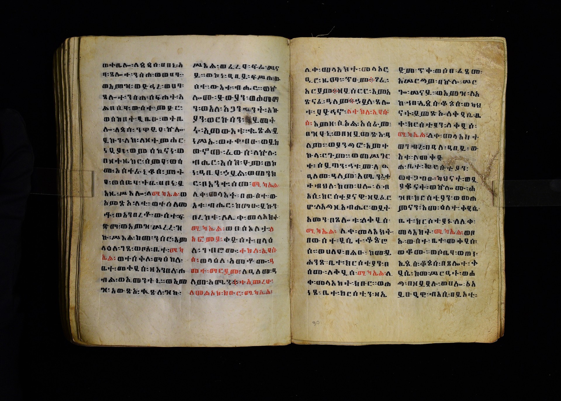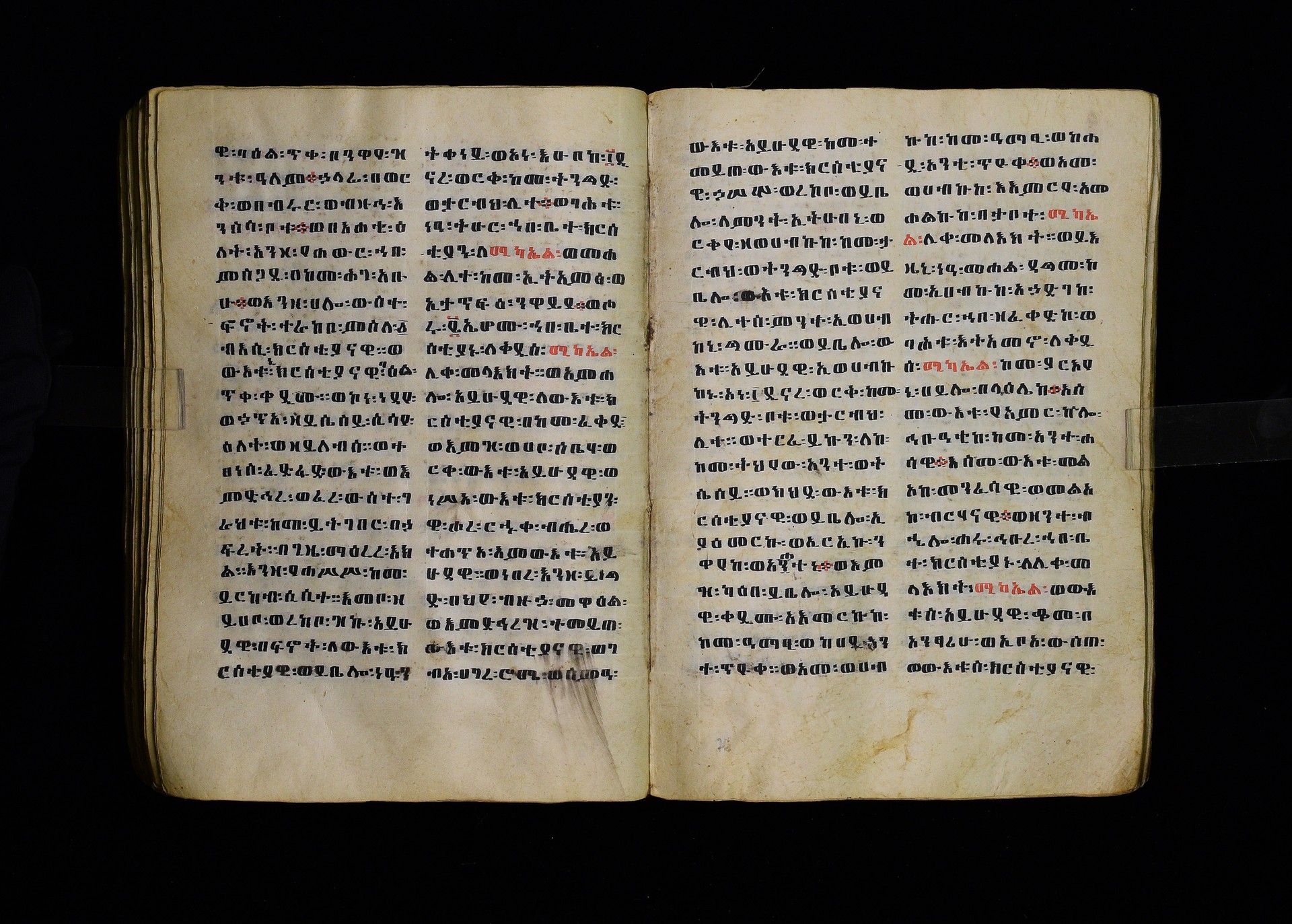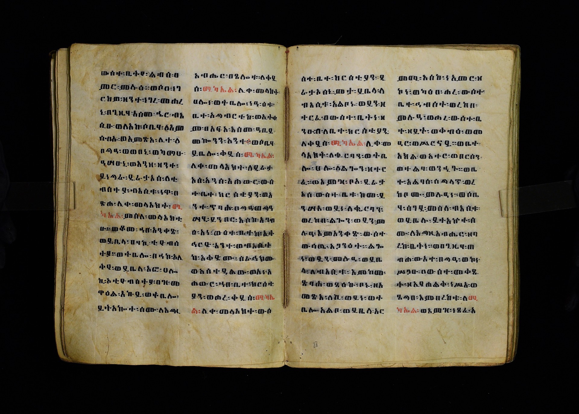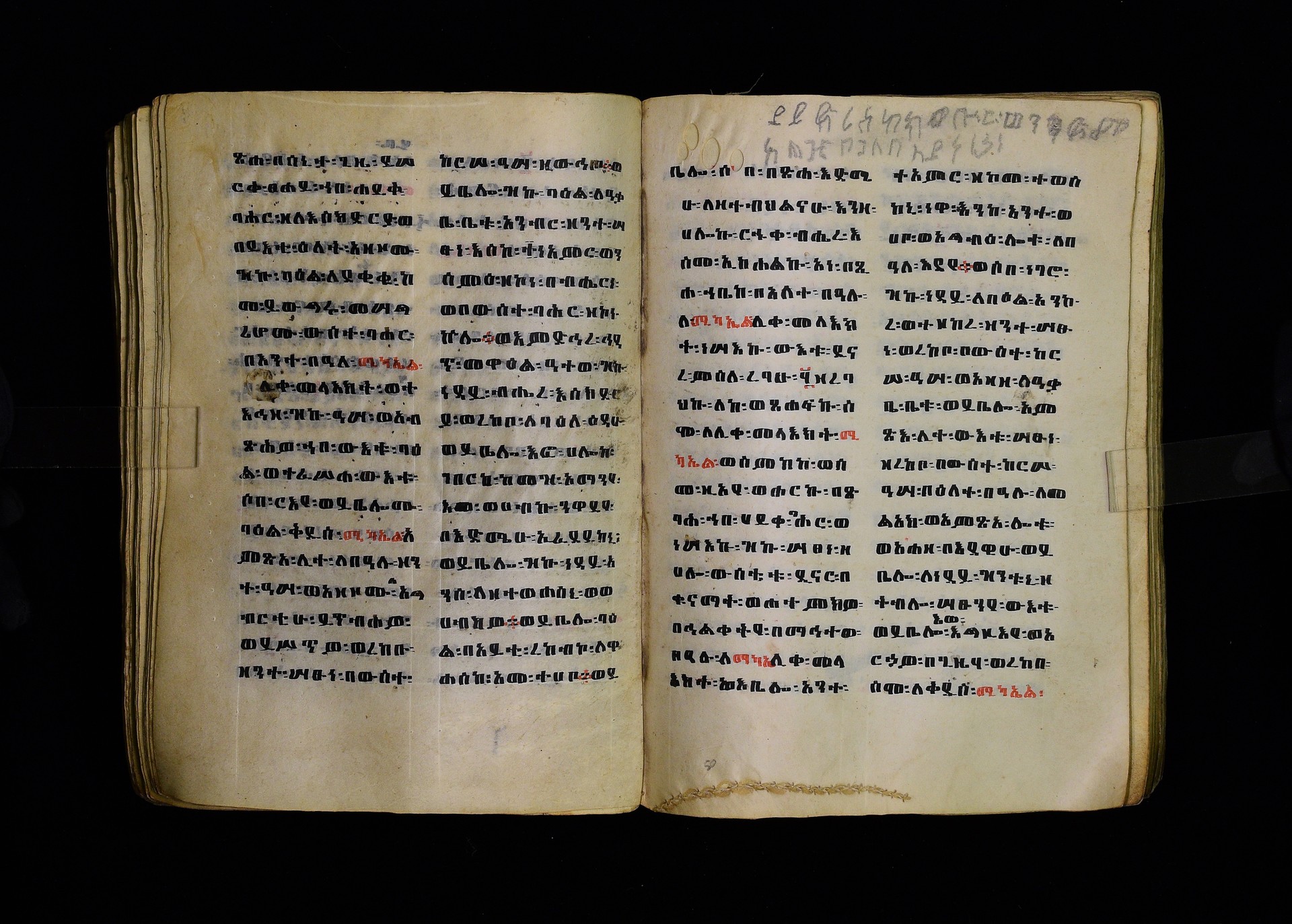 Full-page polychrome miniatures are found on f. 8v (St Michael), f. 33v (George and the dragon), f. 46v (the miracle of the wedding at Cana, with a caption በቃና added in a secondary hand), f. 70v (St Michele). |