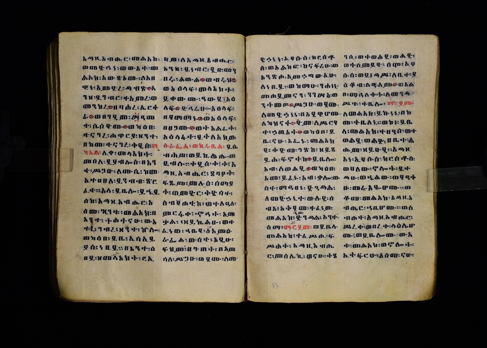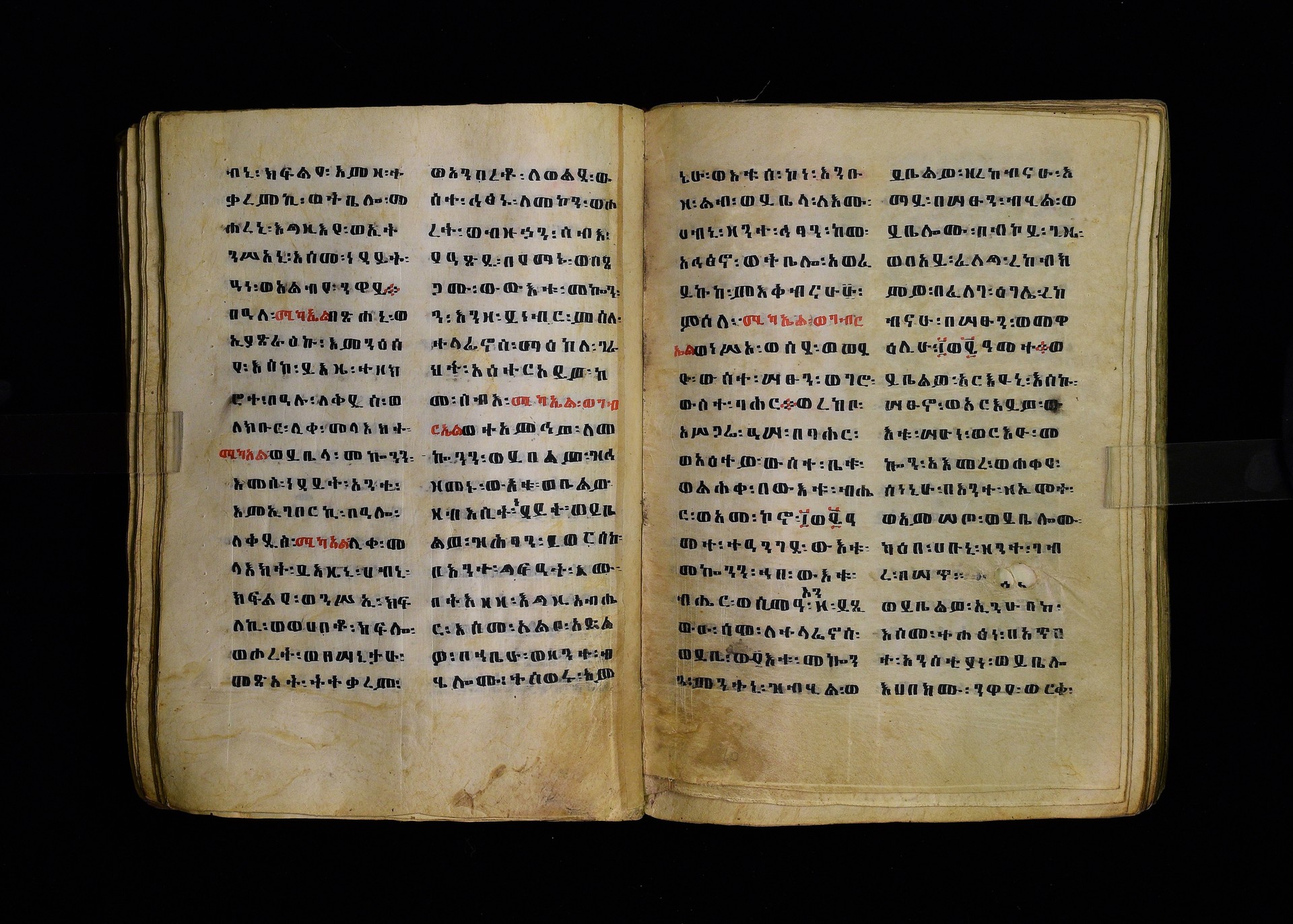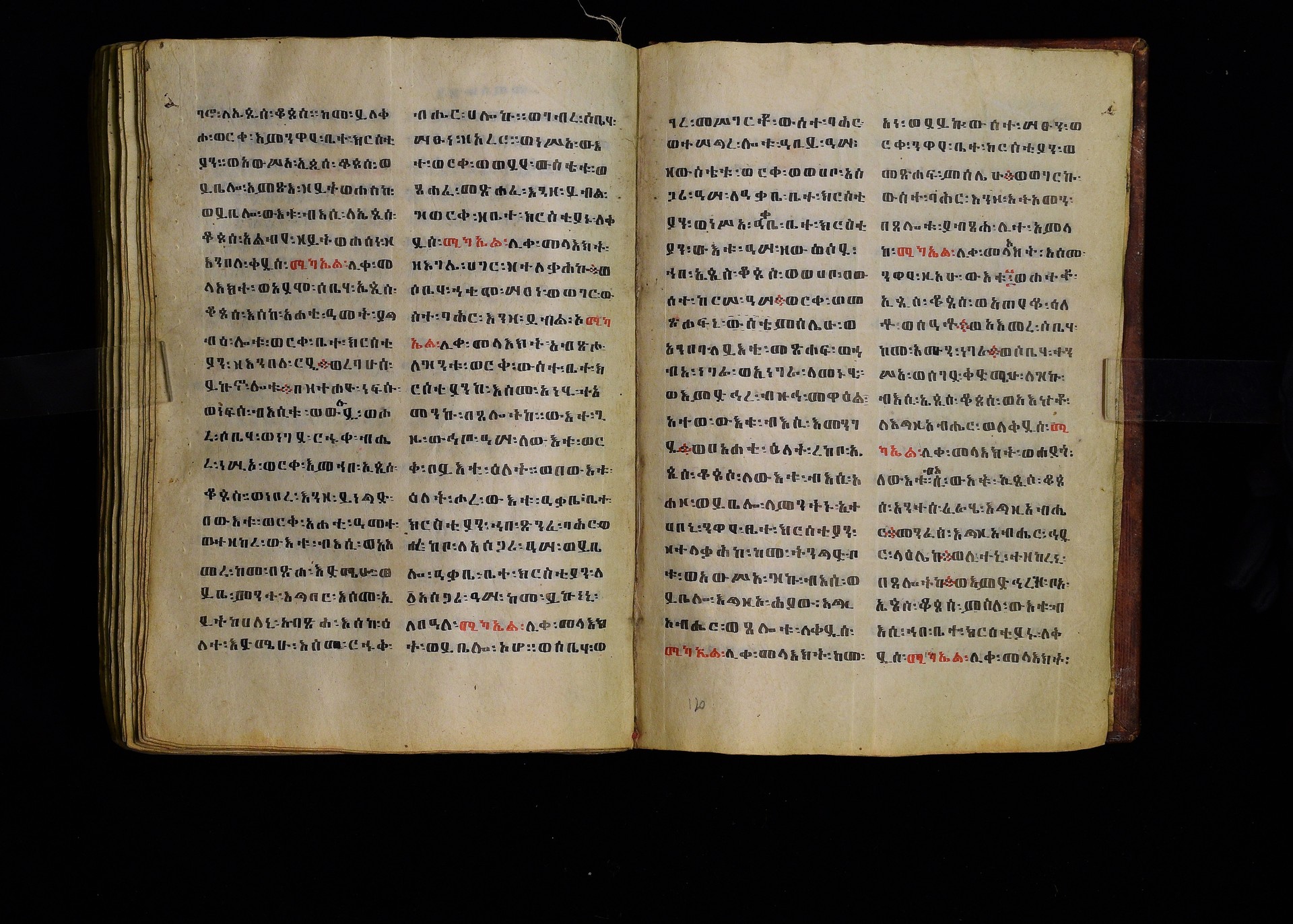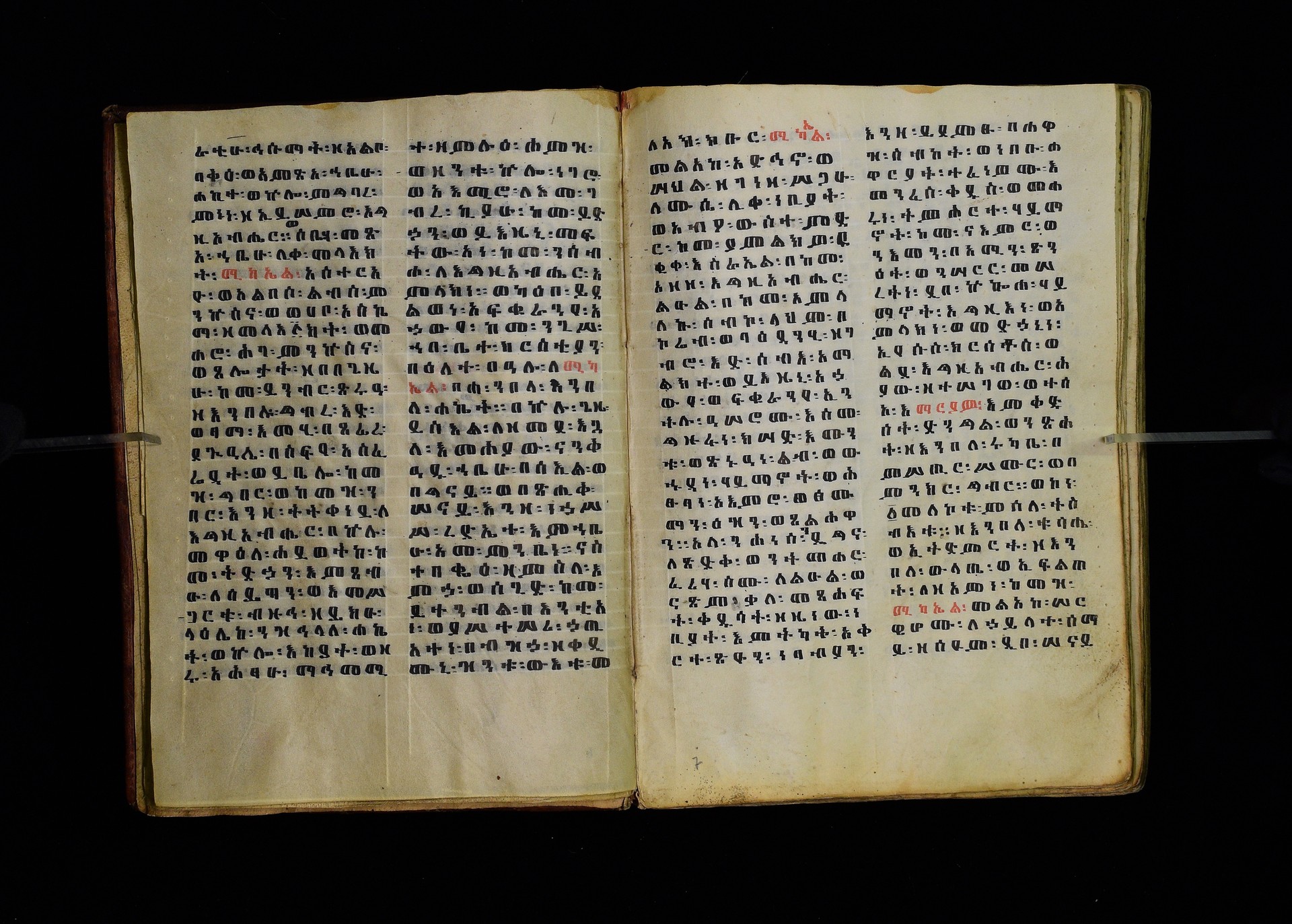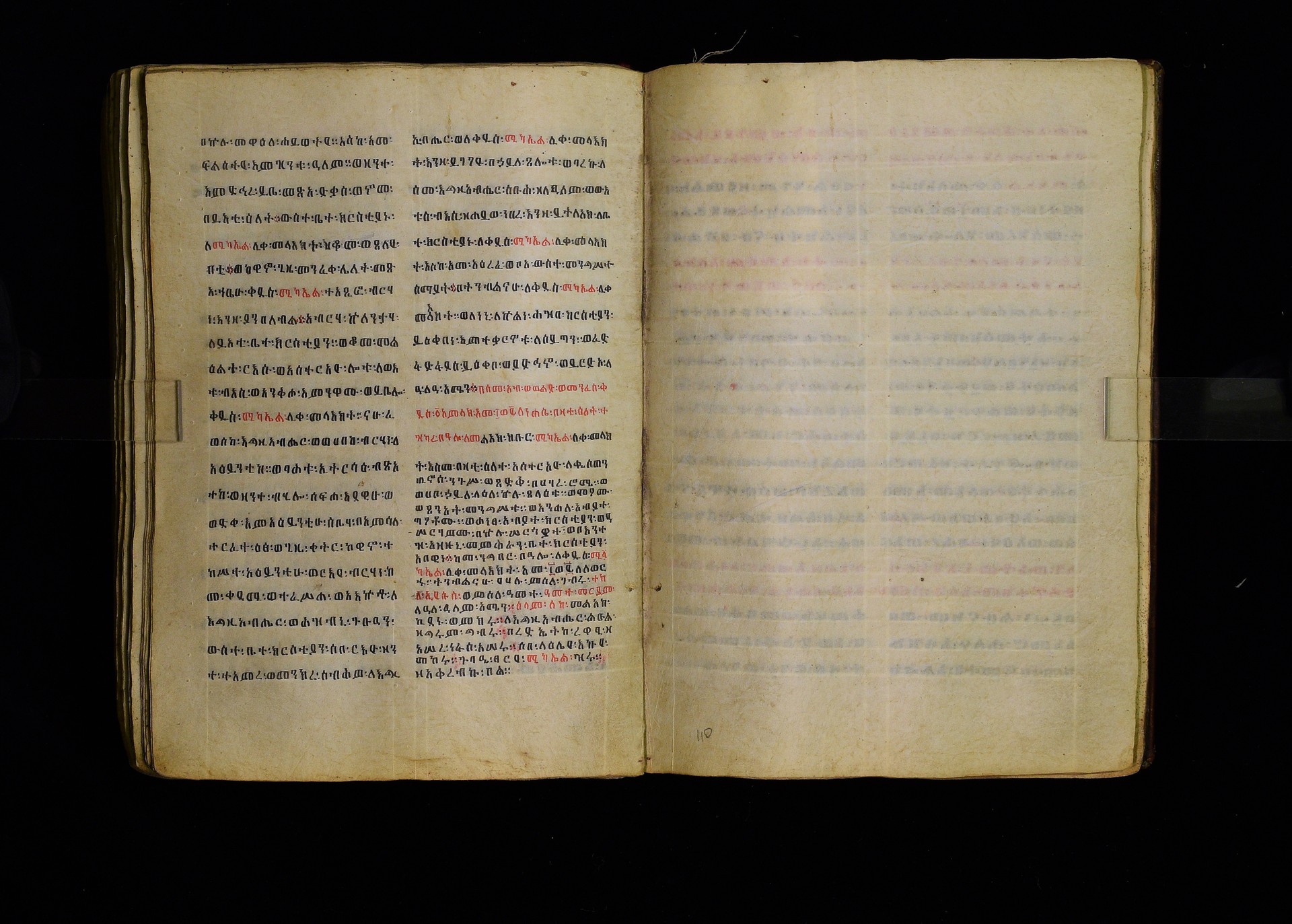 Full-page polychrome miniatures are found on f. 8v (St Michael), f. 33v (George and the dragon), f. 46v (the miracle of the wedding at Cana, with a caption በቃና added in a secondary hand), f. 70v (St Michele). |