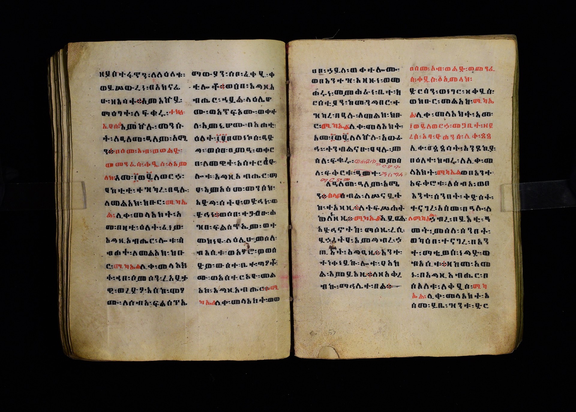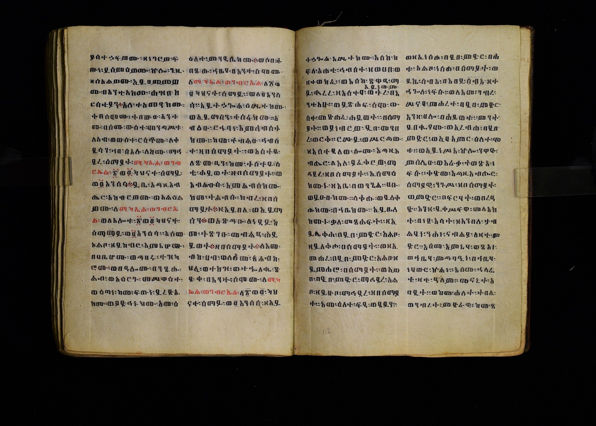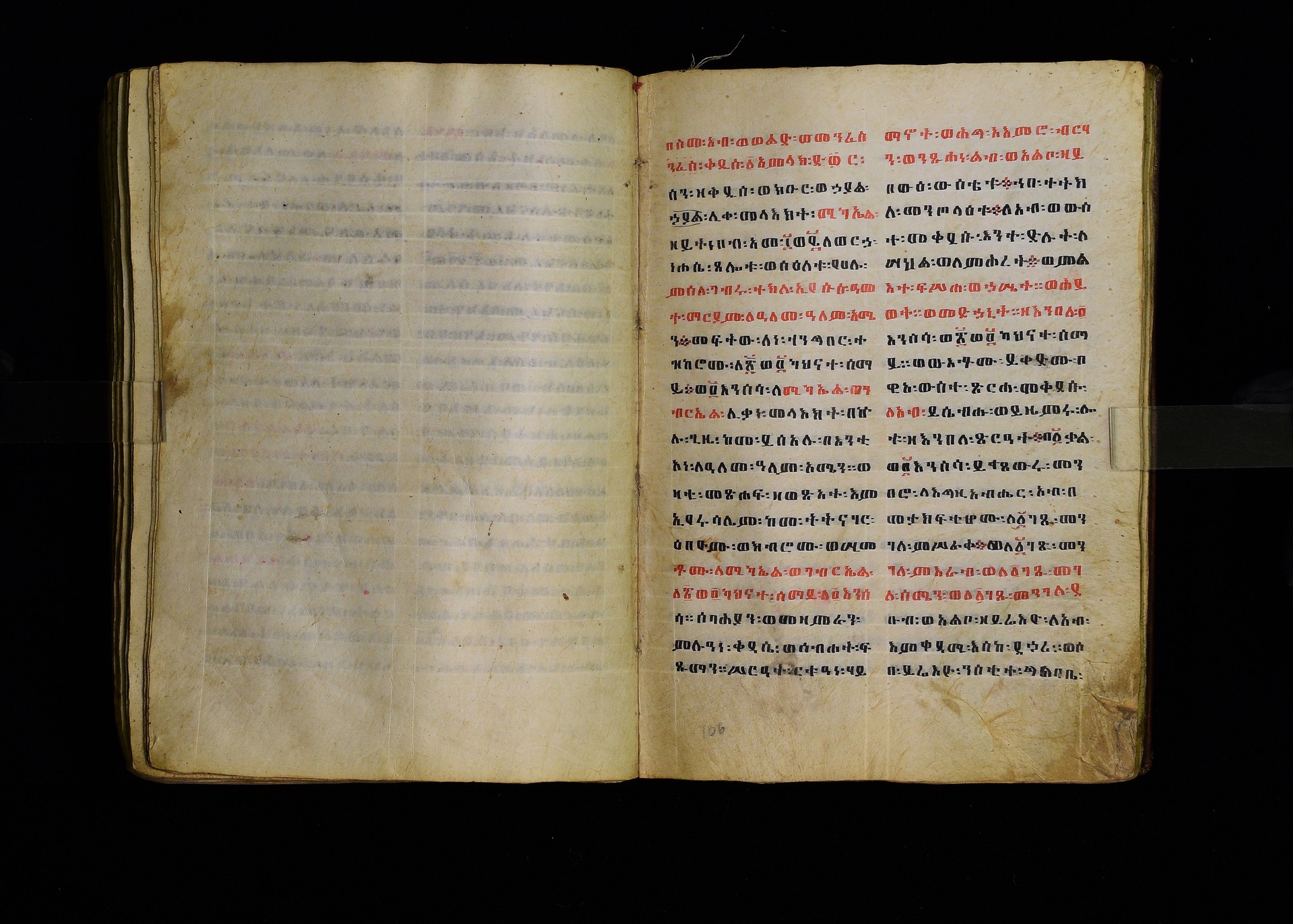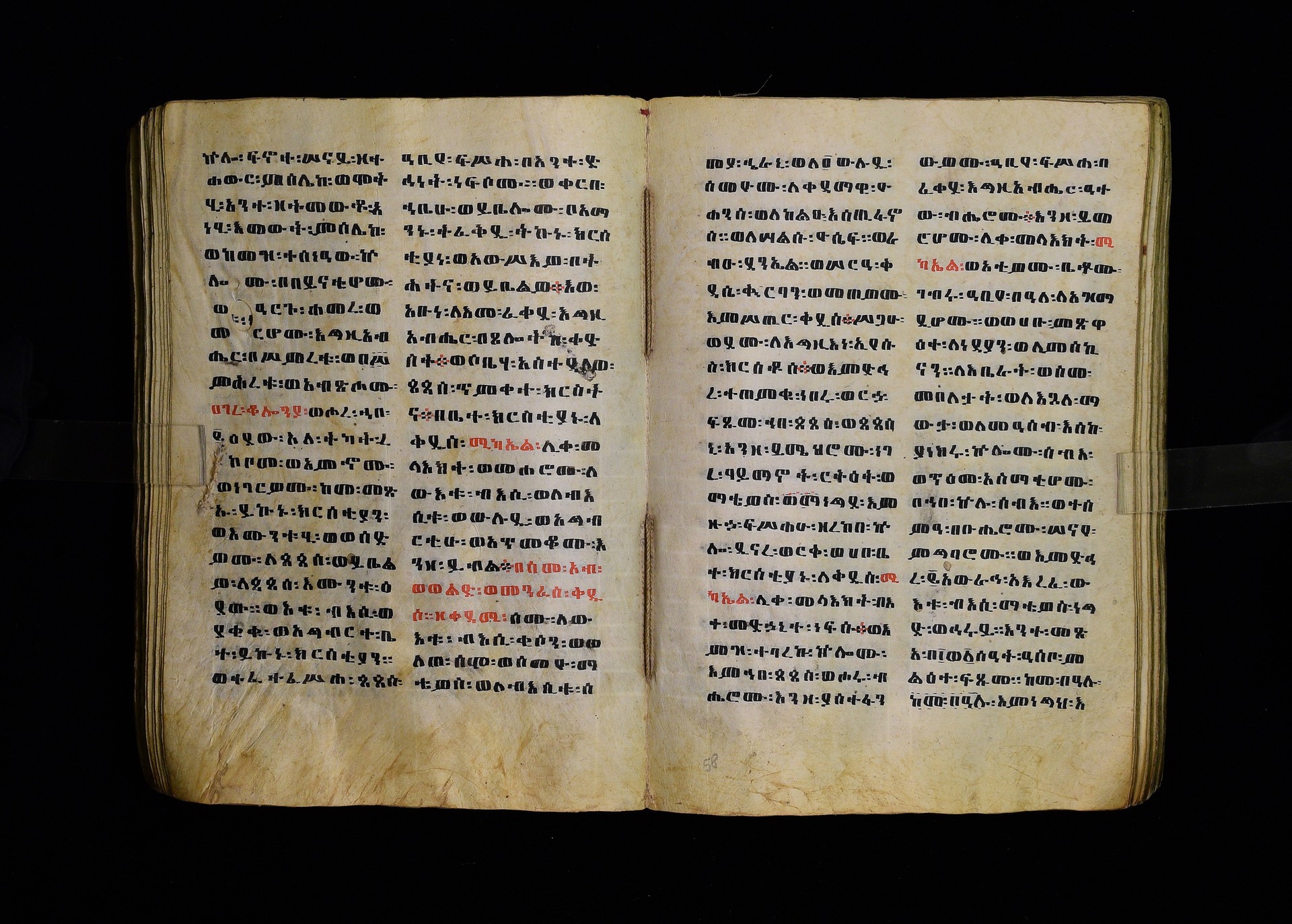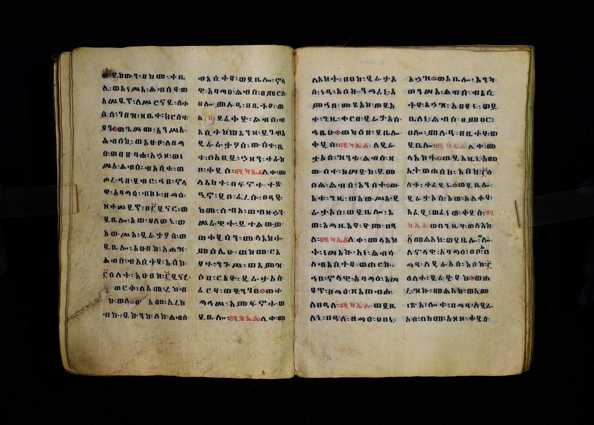 Full-page polychrome miniatures are found on f. 8v (St Michael), f. 33v (George and the dragon), f. 46v (the miracle of the wedding at Cana, with a caption በቃና added in a secondary hand), f. 70v (St Michele). |