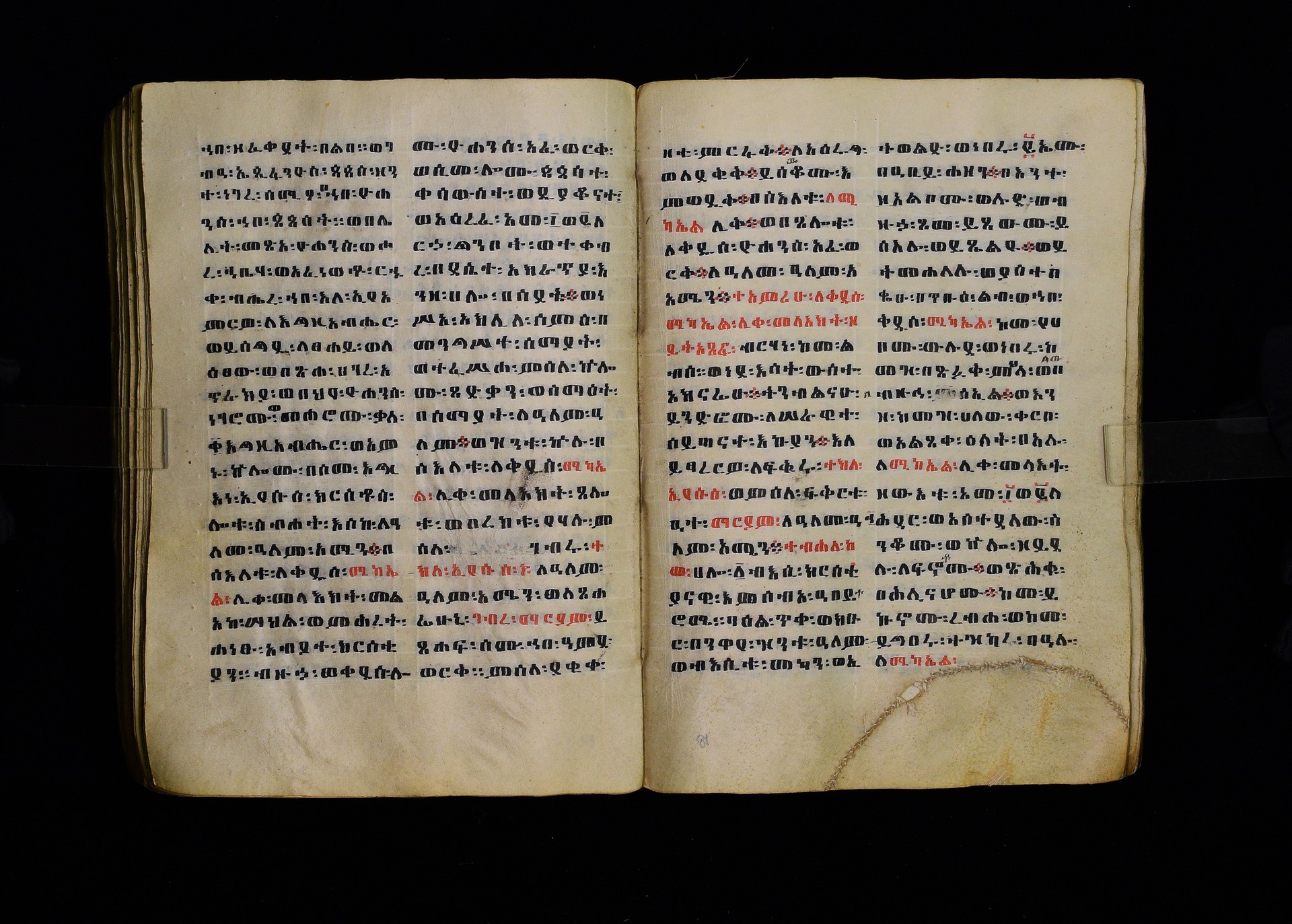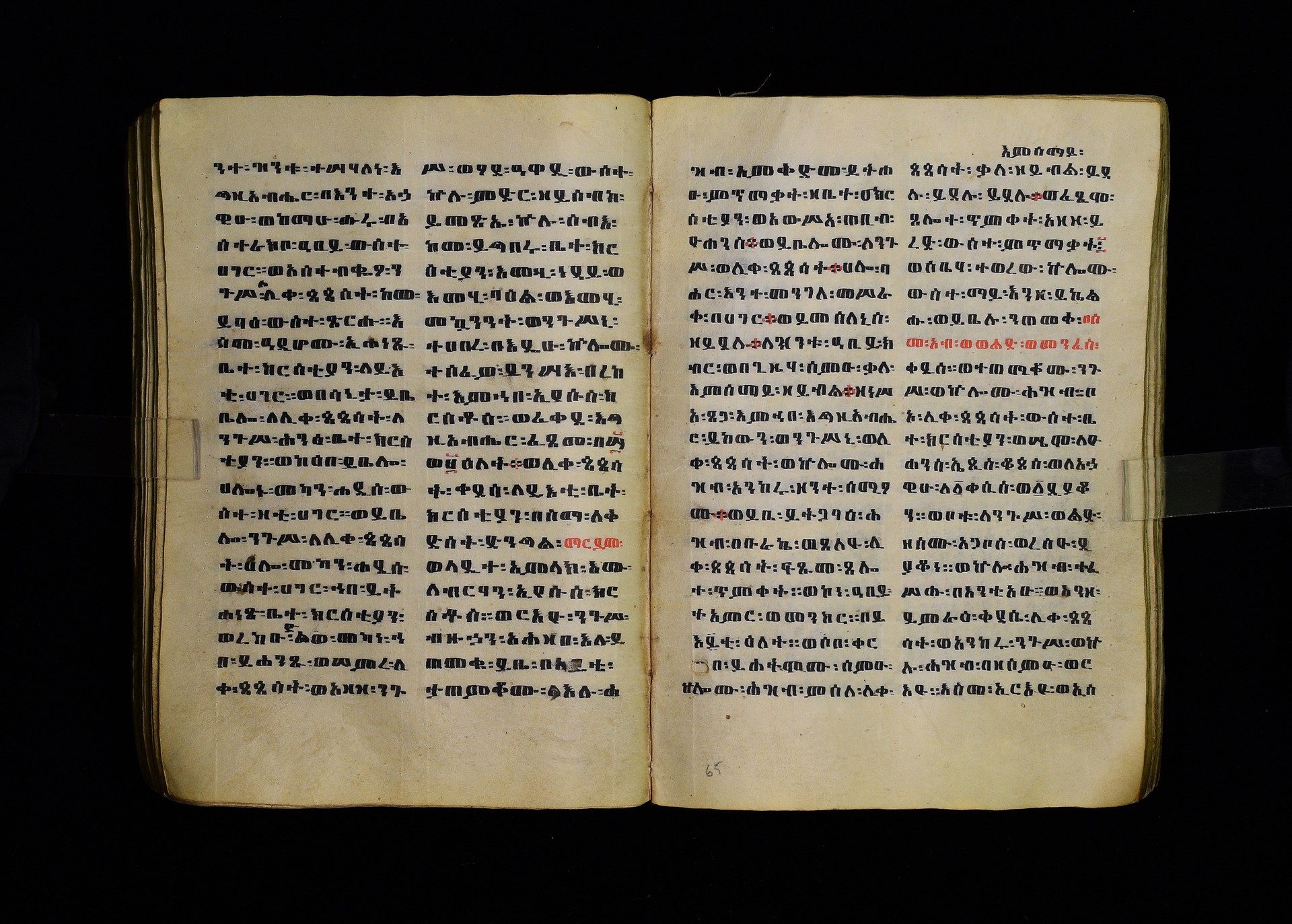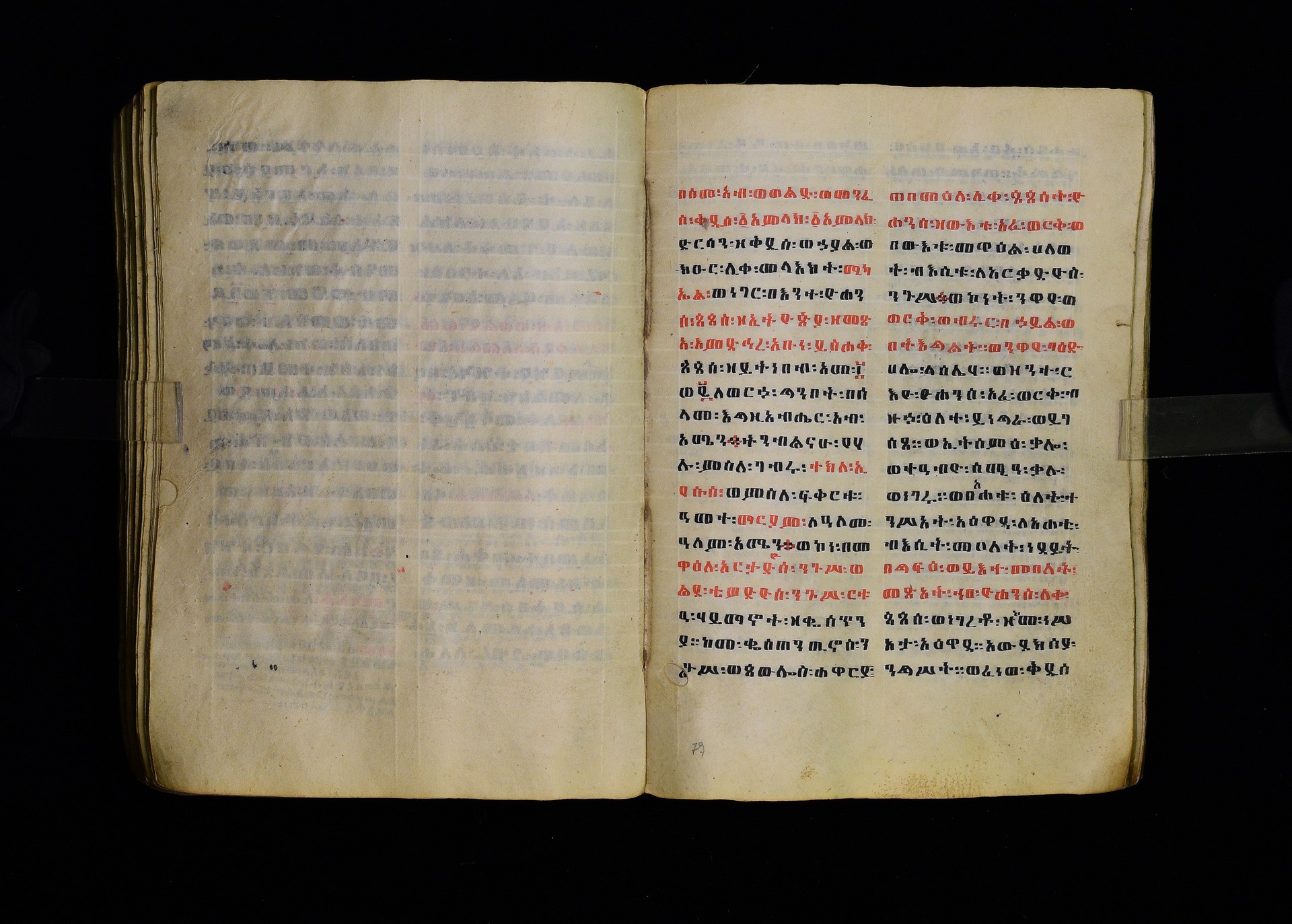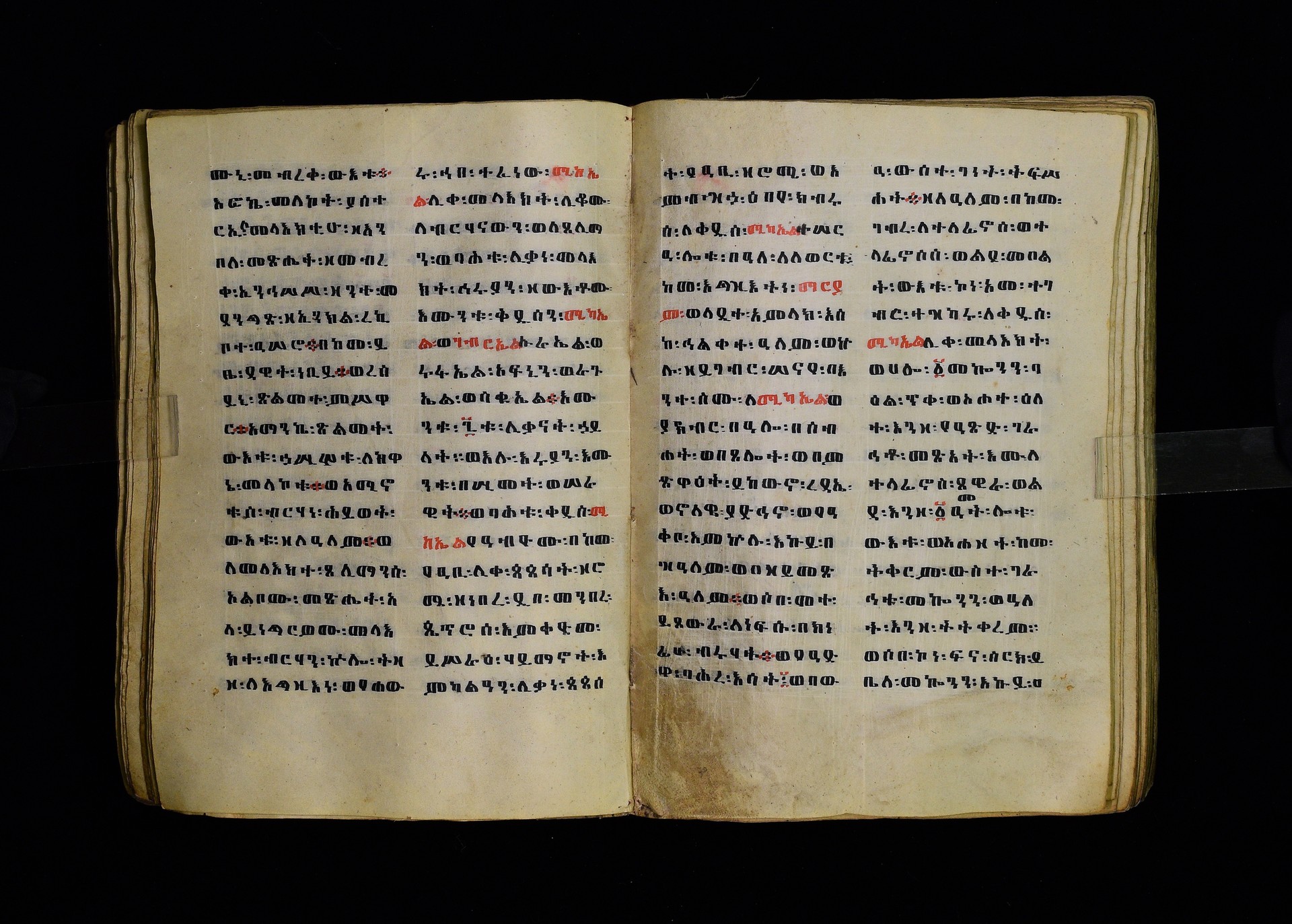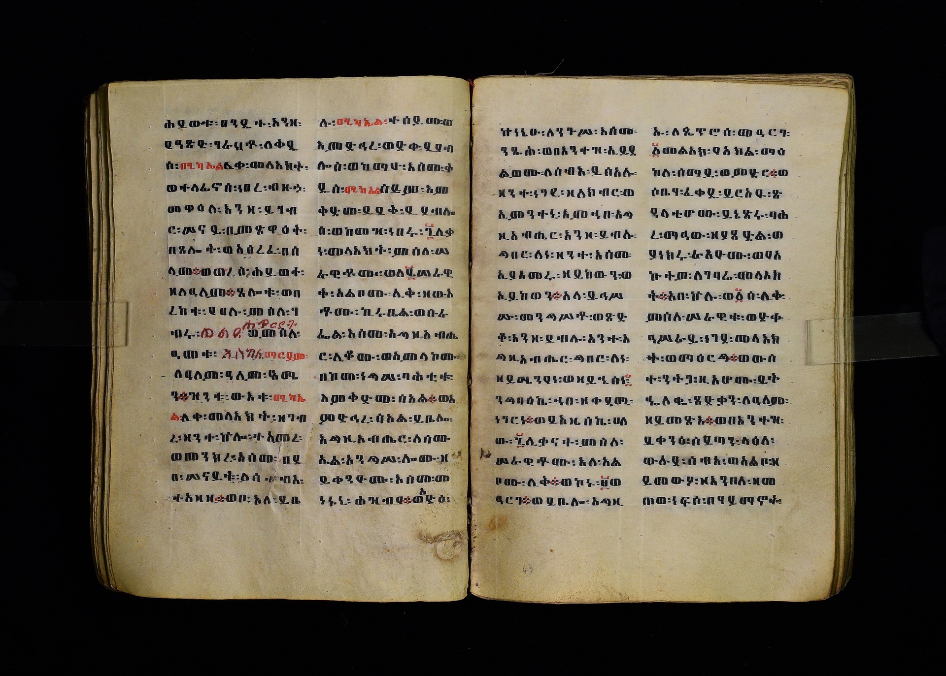 Full-page polychrome miniatures are found on f. 8v (St Michael), f. 33v (George and the dragon), f. 46v (the miracle of the wedding at Cana, with a caption በቃና added in a secondary hand), f. 70v (St Michele). |