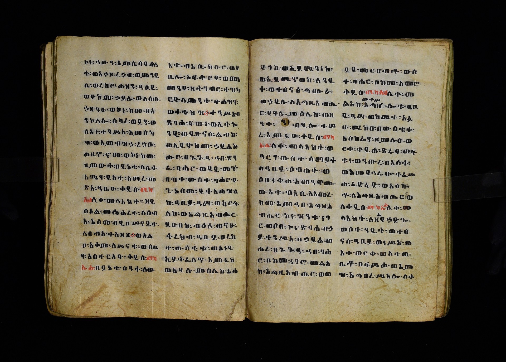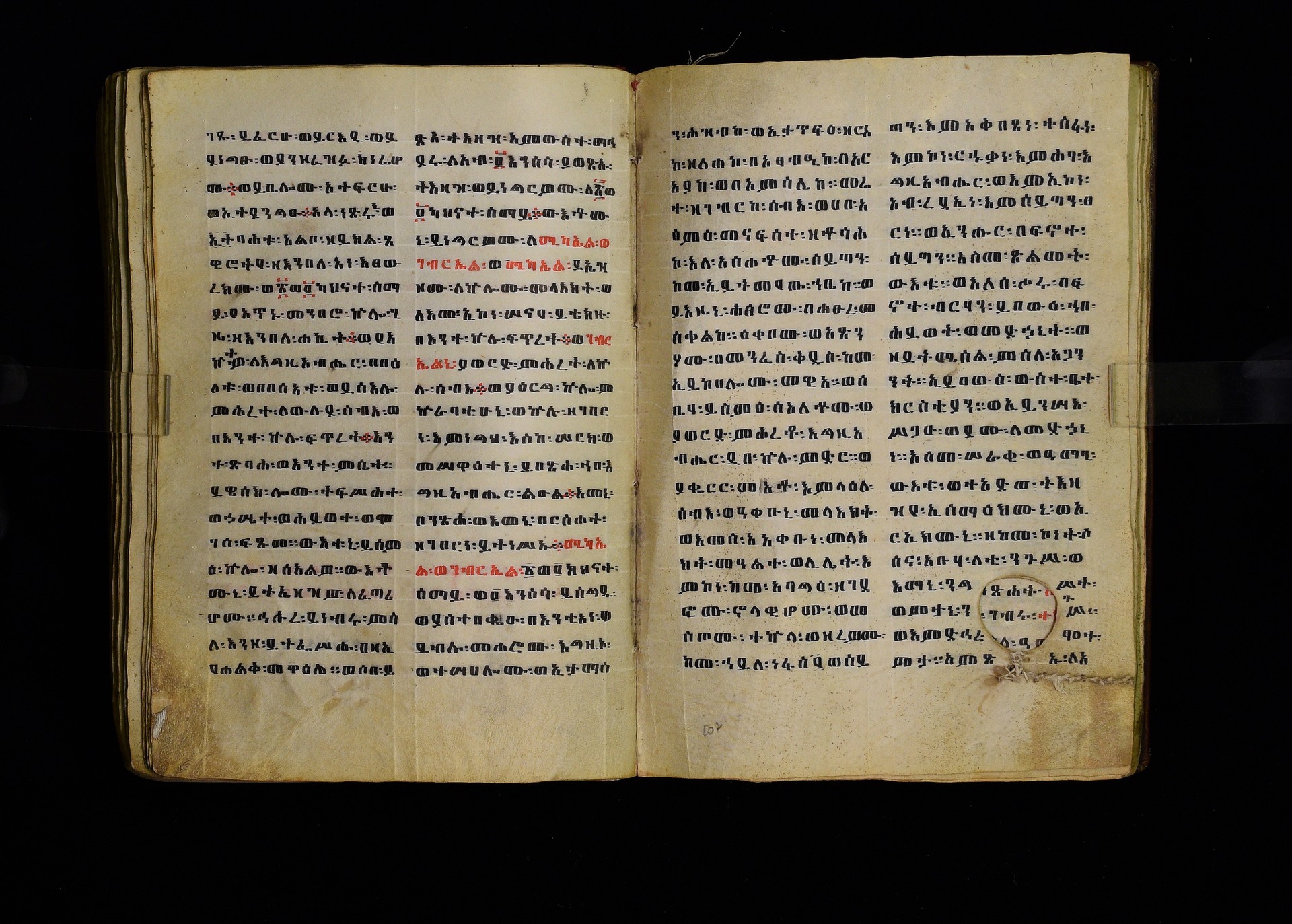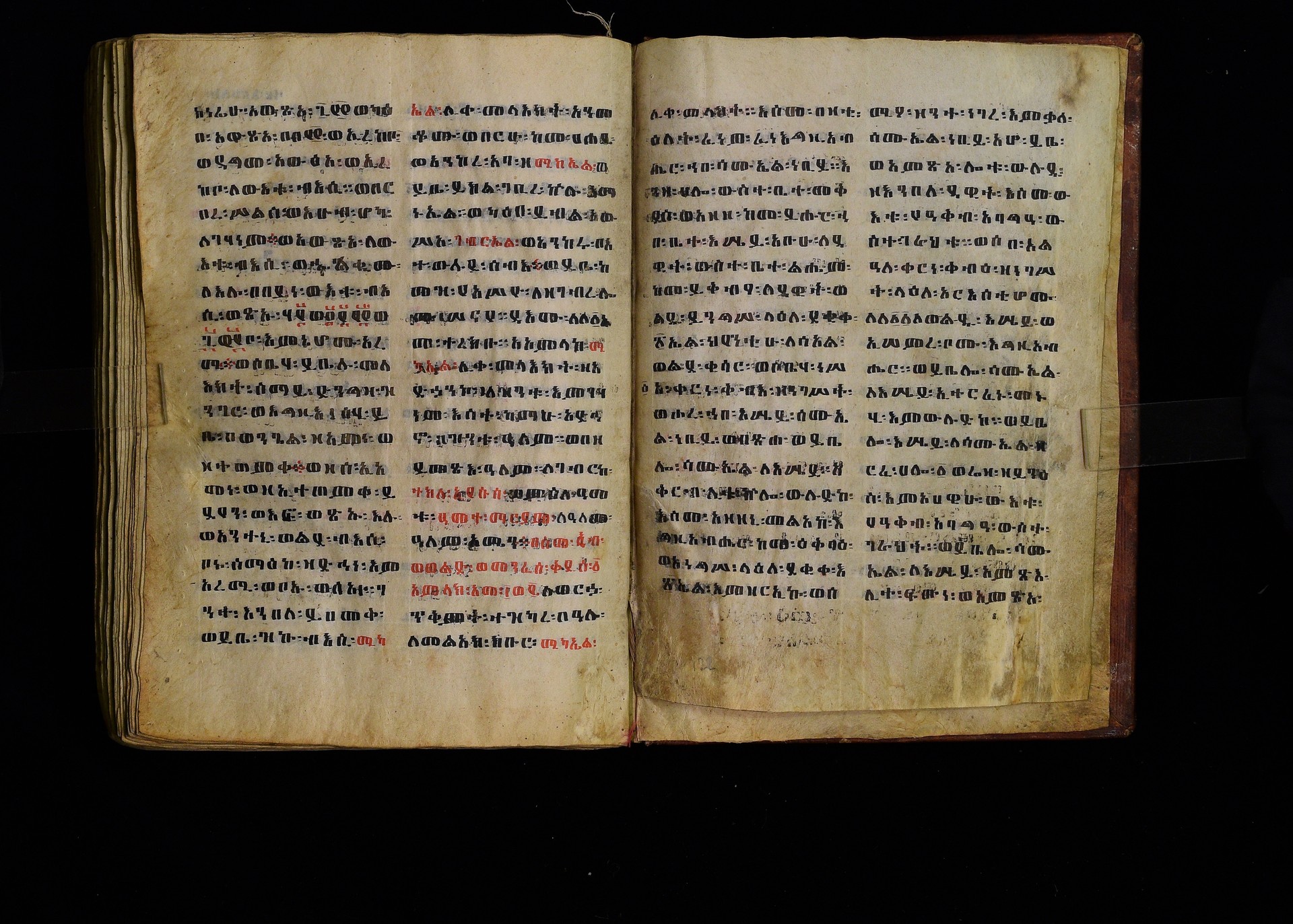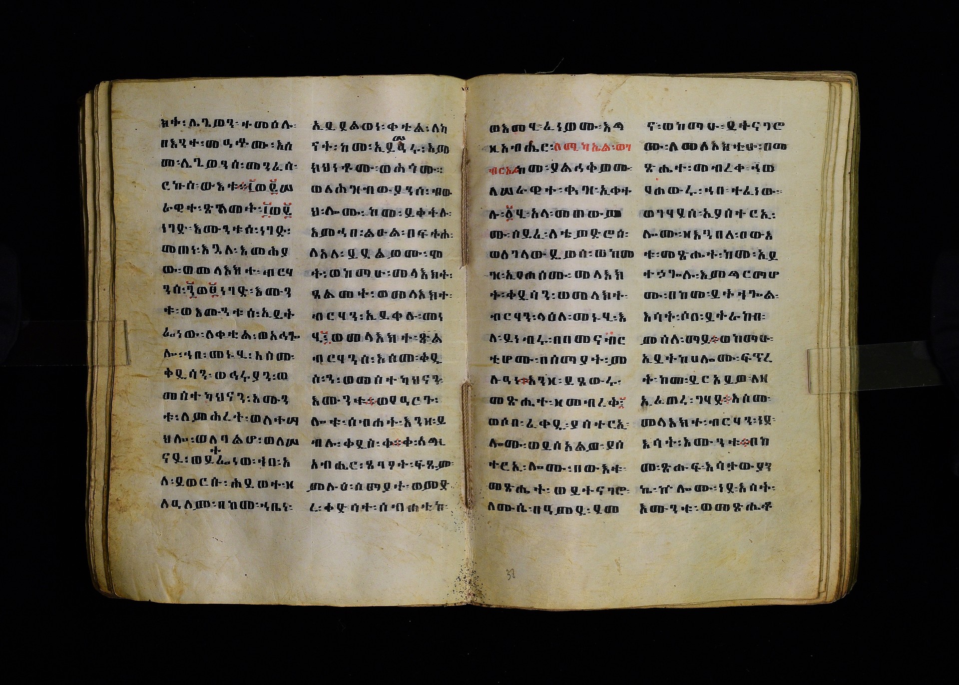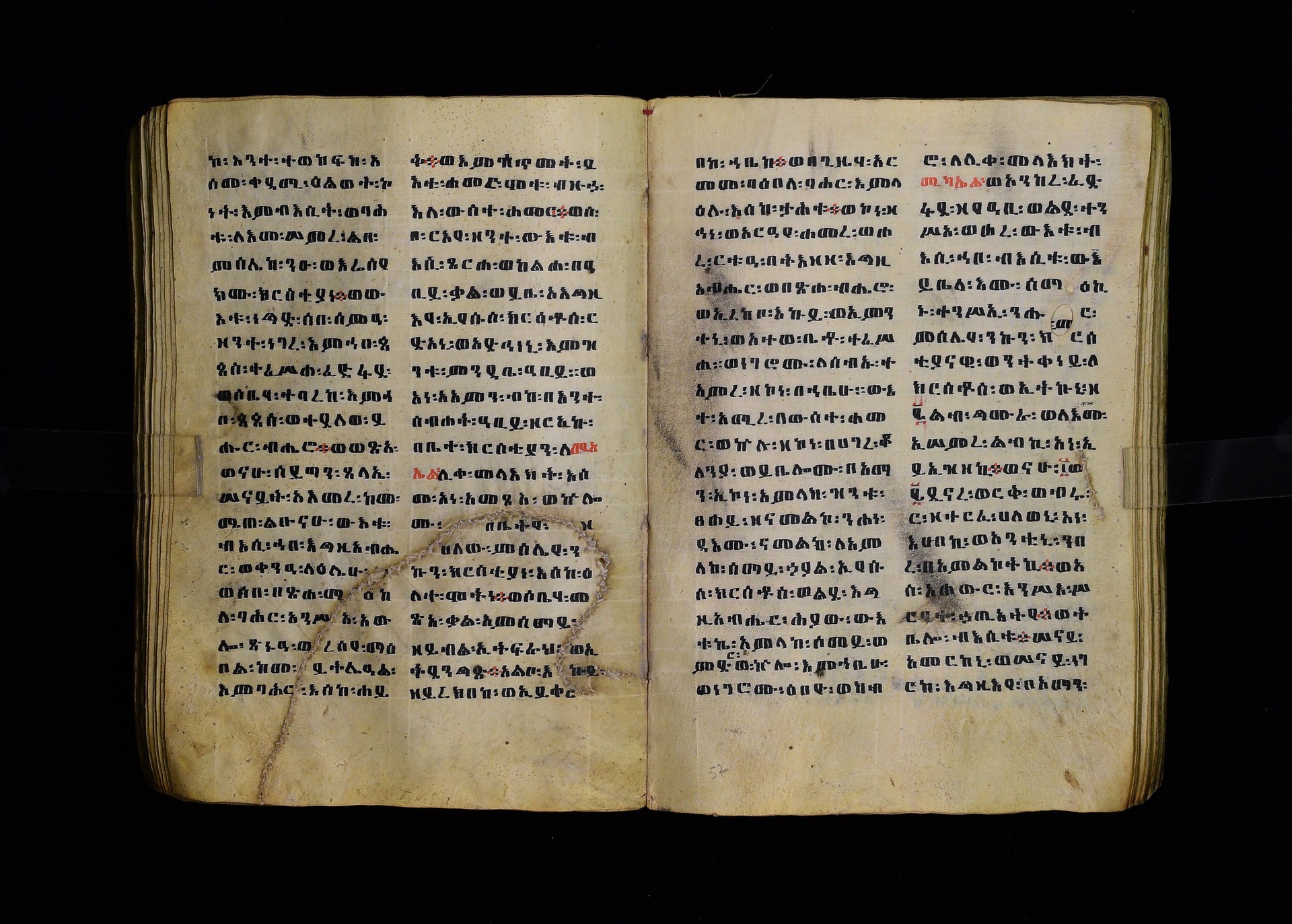 Full-page polychrome miniatures are found on f. 8v (St Michael), f. 33v (George and the dragon), f. 46v (the miracle of the wedding at Cana, with a caption በቃና added in a secondary hand), f. 70v (St Michele). |