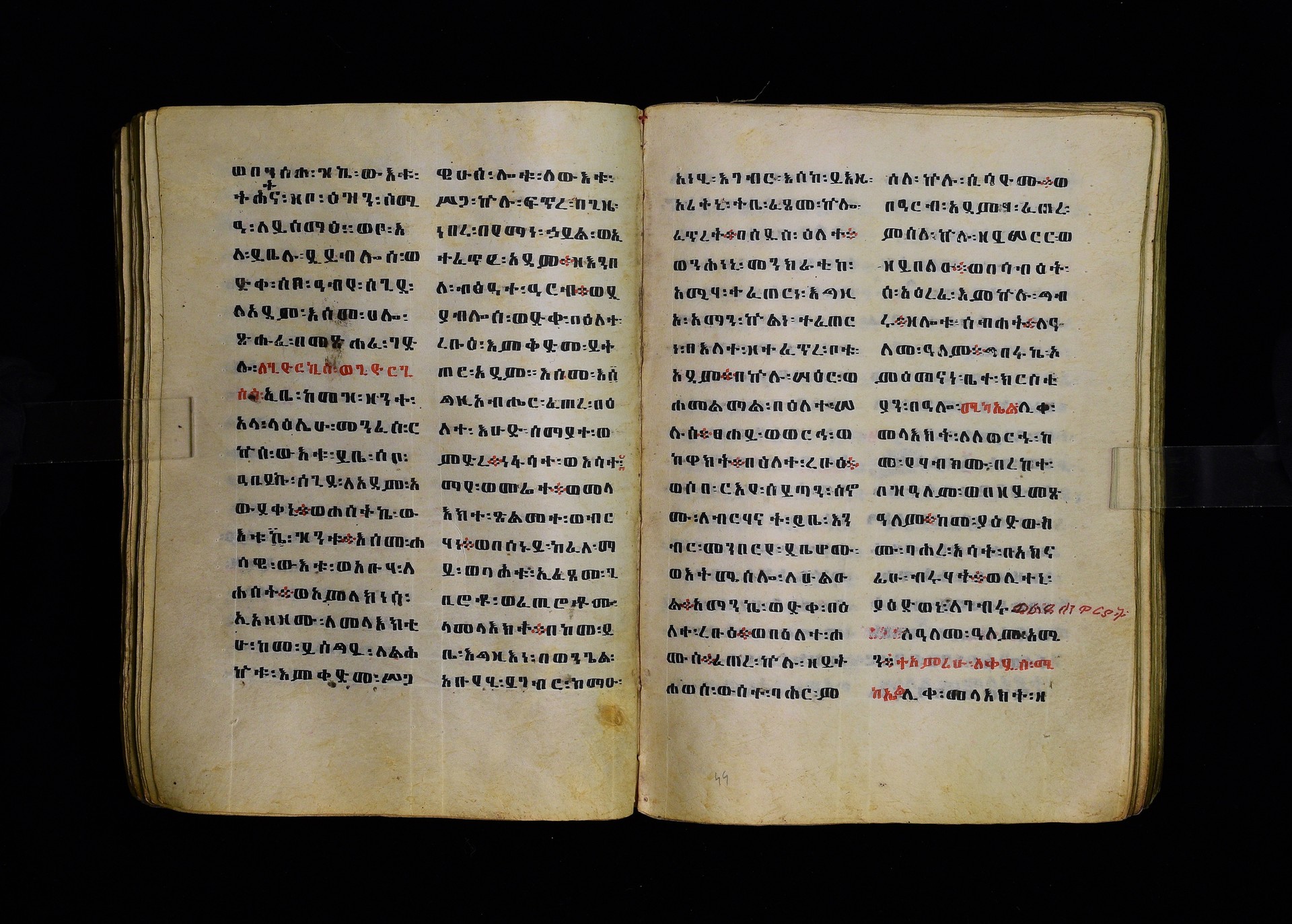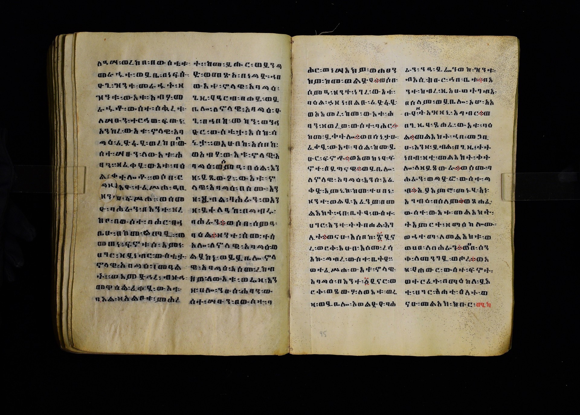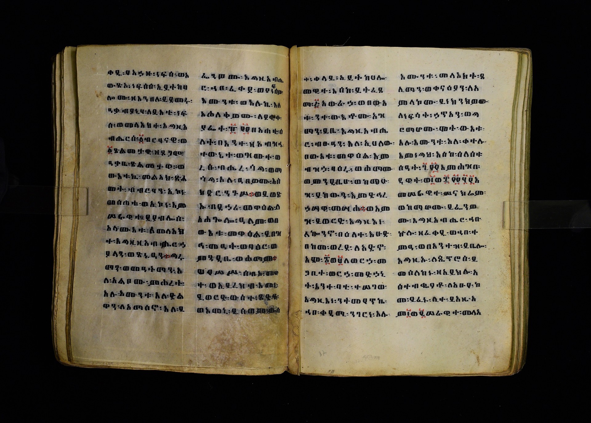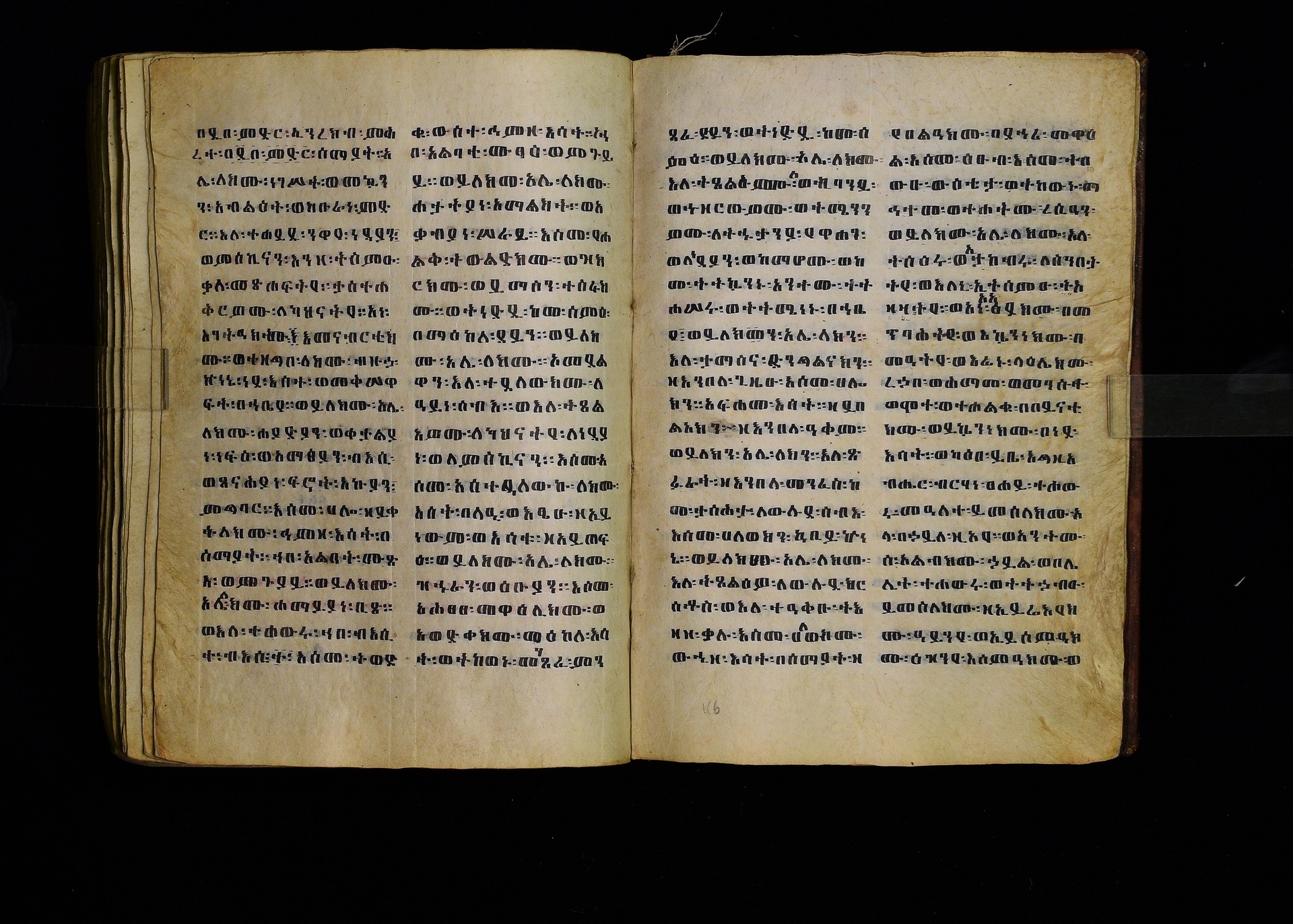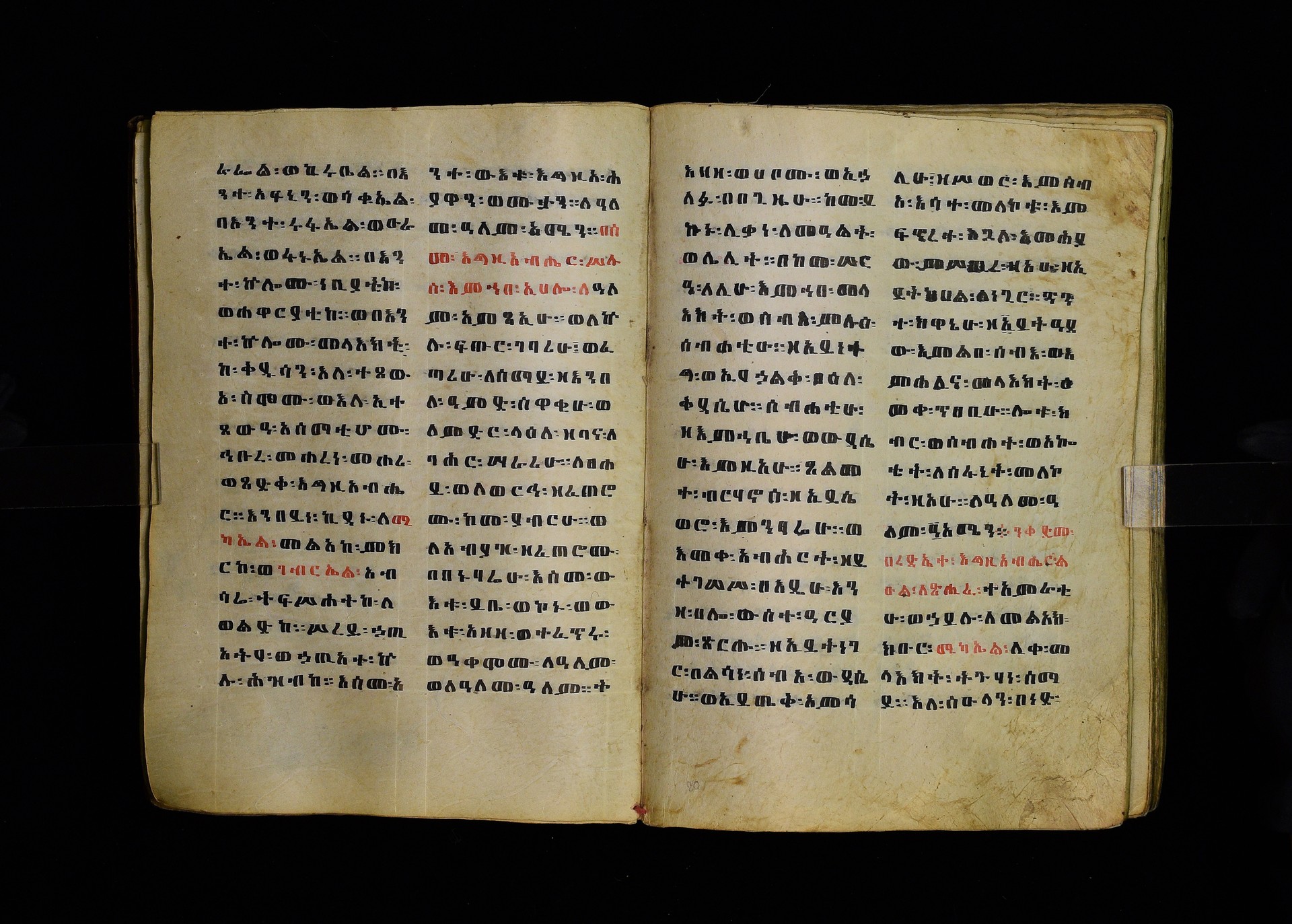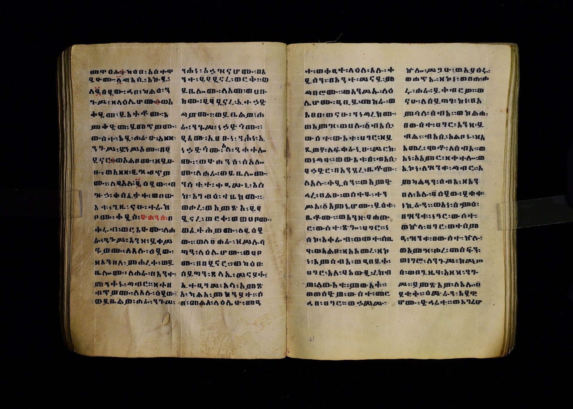 Full-page polychrome miniatures are found on f. 8v (St Michael), f. 33v (George and the dragon), f. 46v (the miracle of the wedding at Cana, with a caption በቃና added in a secondary hand), f. 70v (St Michele). |