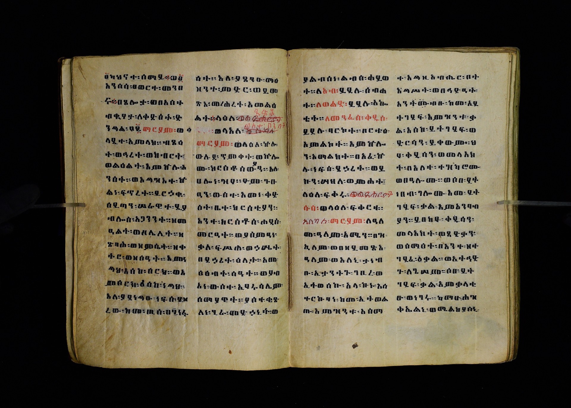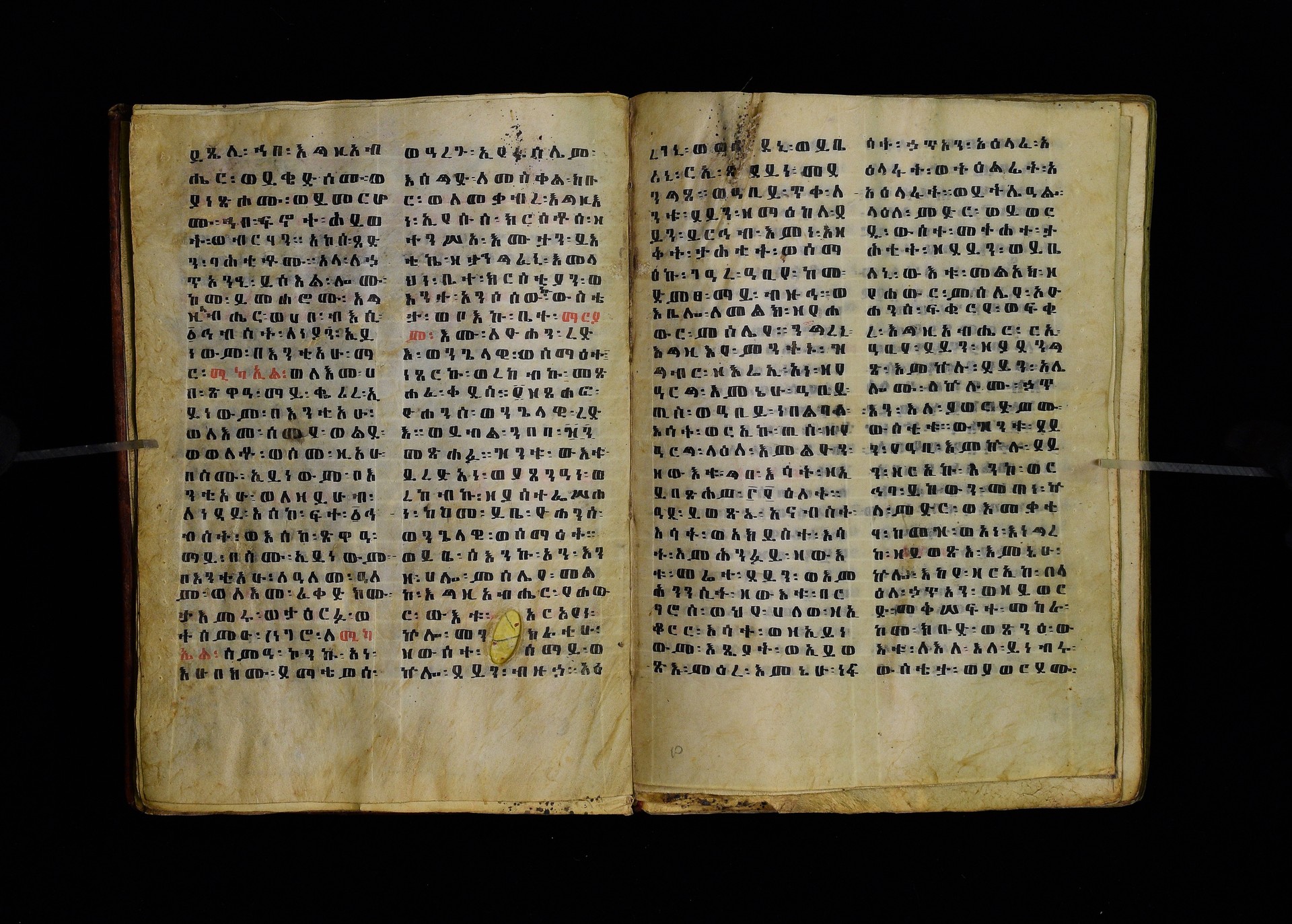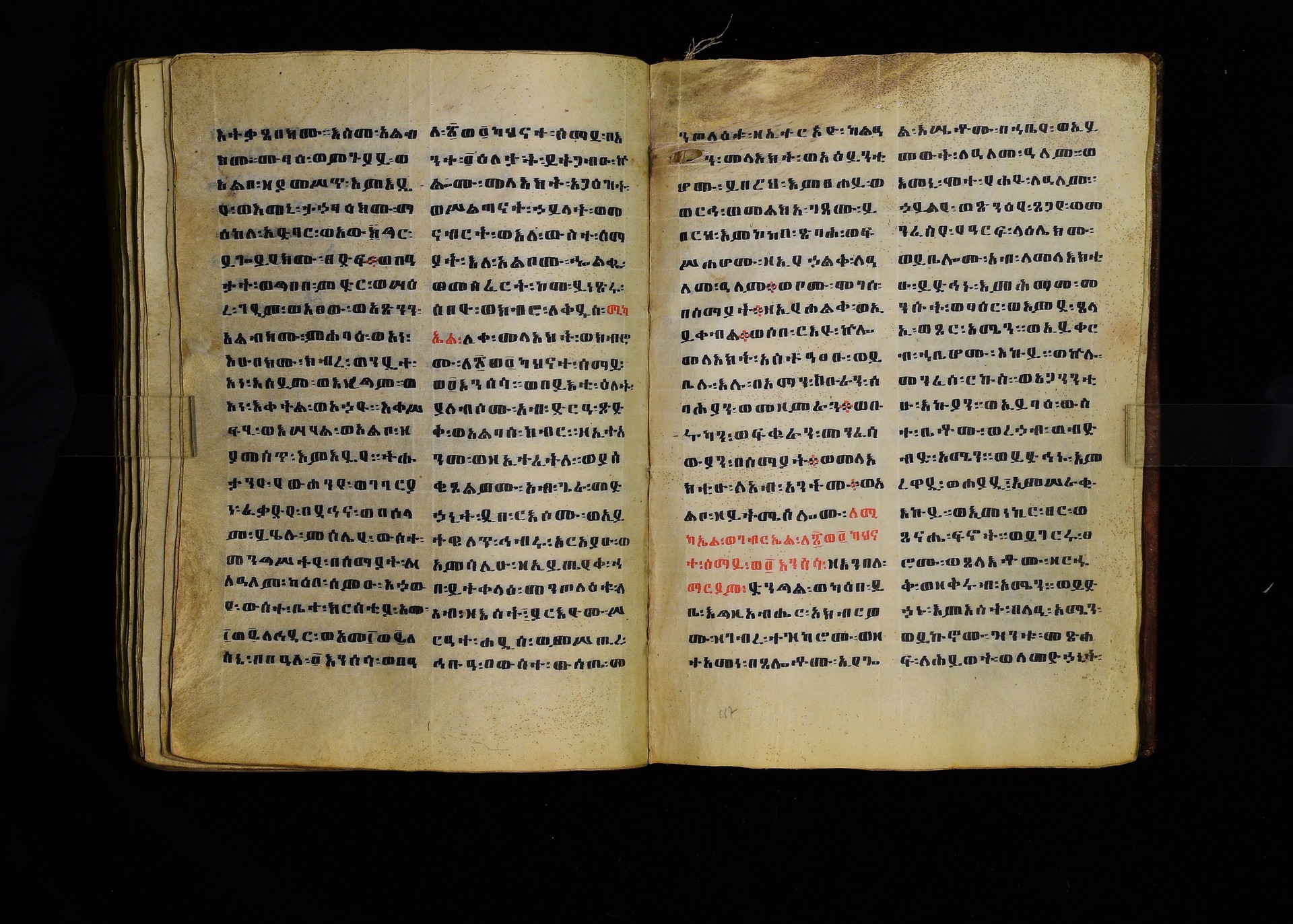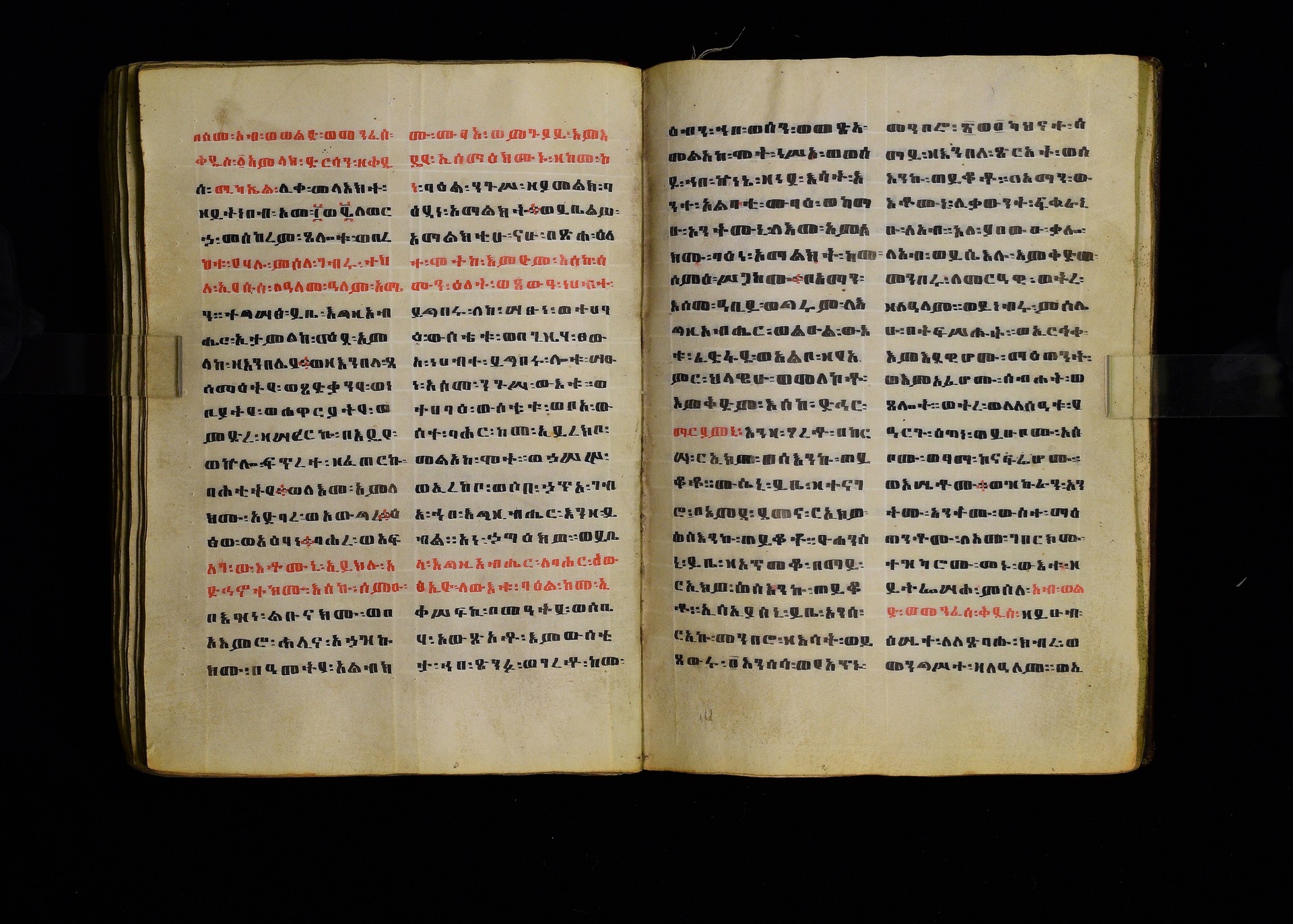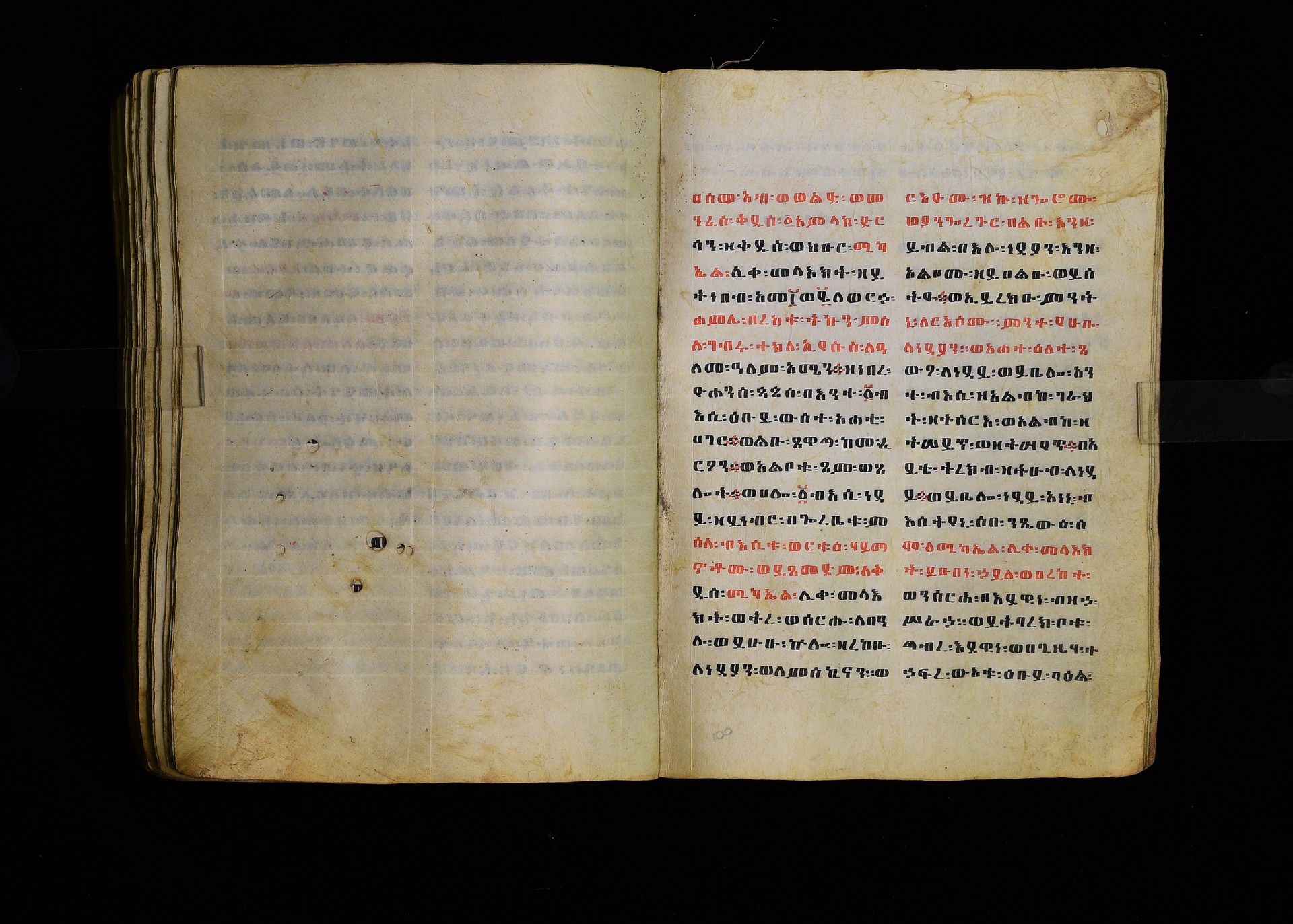 Full-page polychrome miniatures are found on f. 8v (St Michael), f. 33v (George and the dragon), f. 46v (the miracle of the wedding at Cana, with a caption በቃና added in a secondary hand), f. 70v (St Michele). |