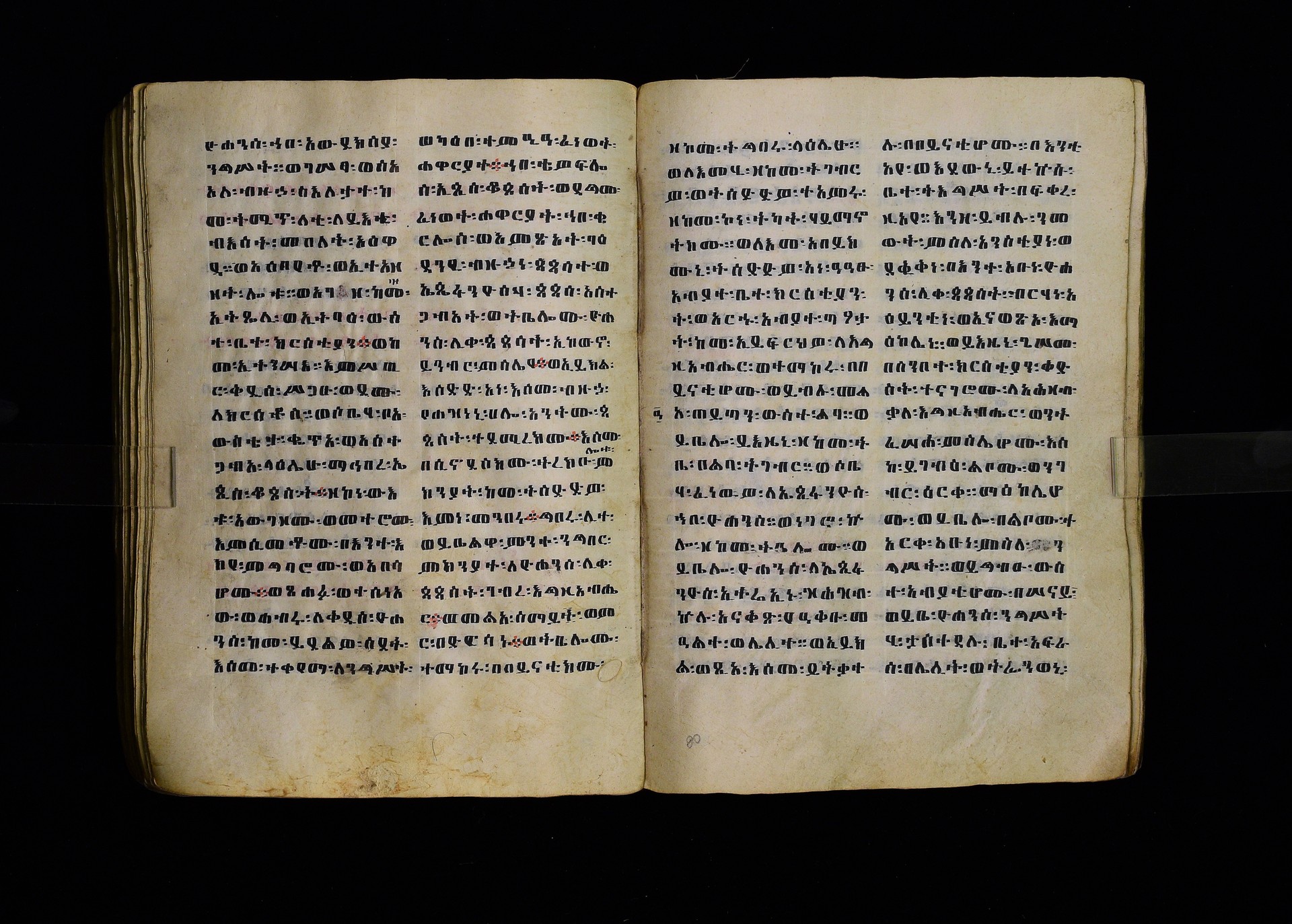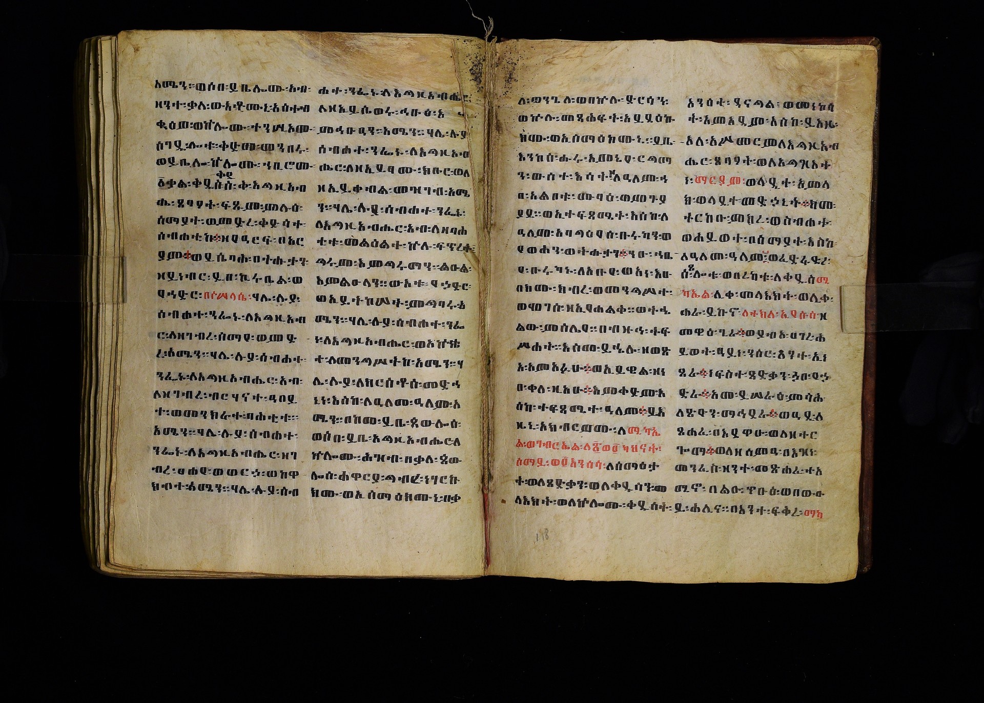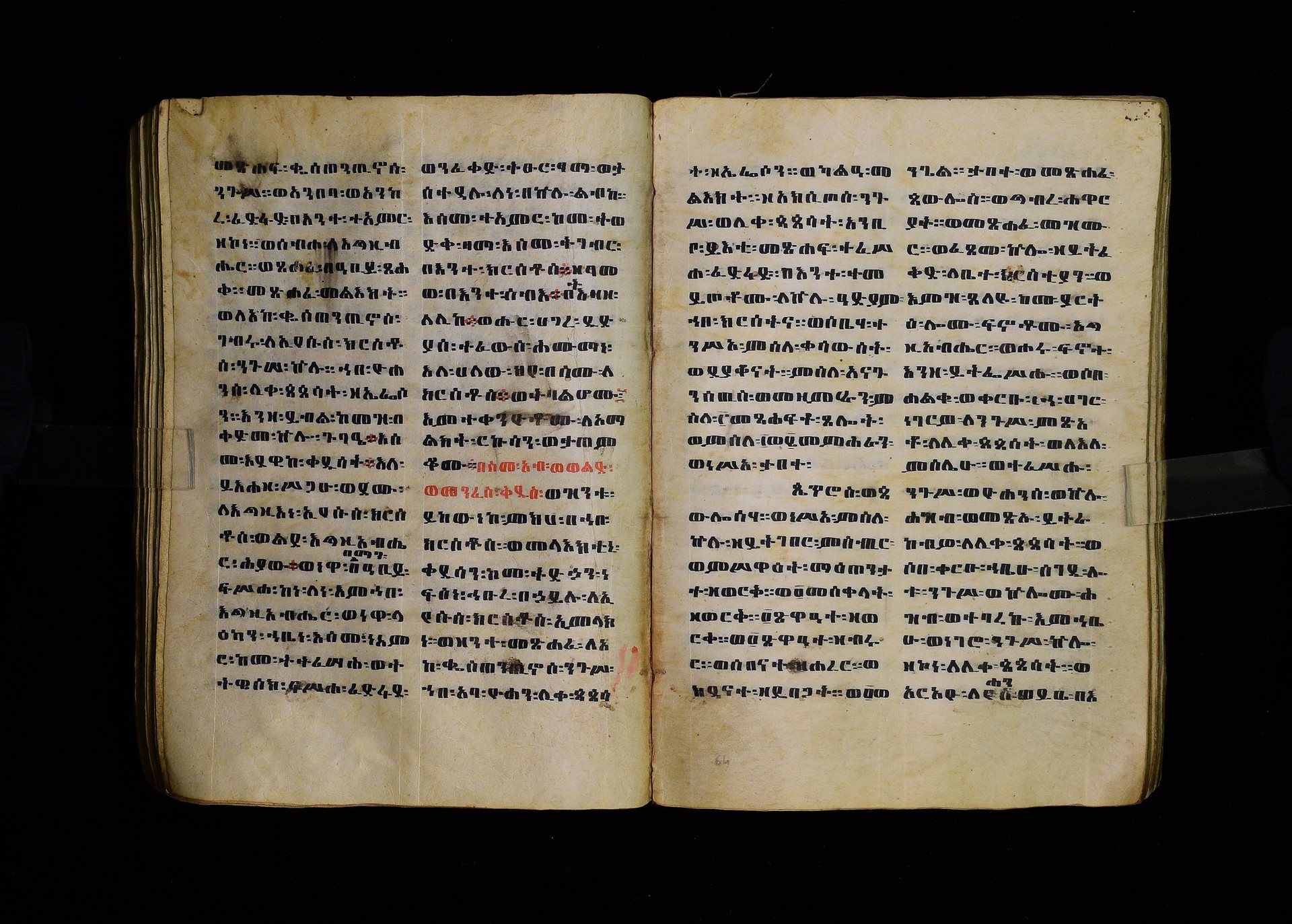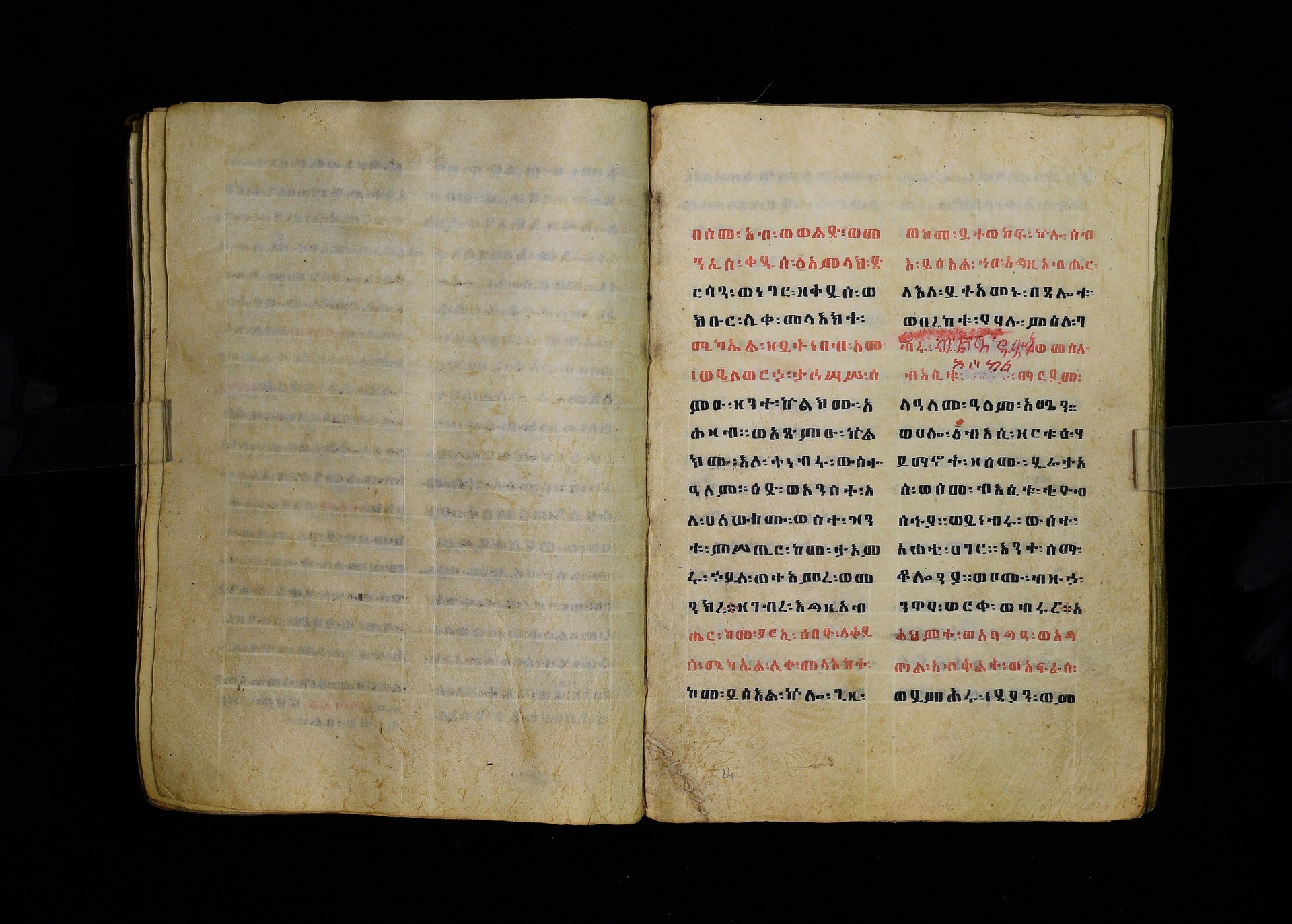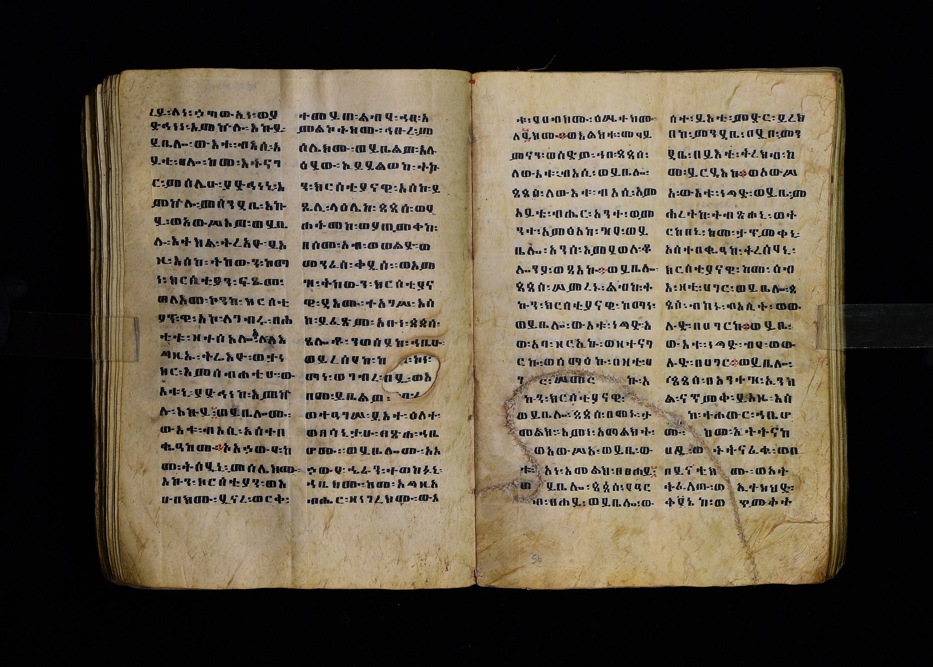 Full-page polychrome miniatures are found on f. 8v (St Michael), f. 33v (George and the dragon), f. 46v (the miracle of the wedding at Cana, with a caption በቃና added in a secondary hand), f. 70v (St Michele). |