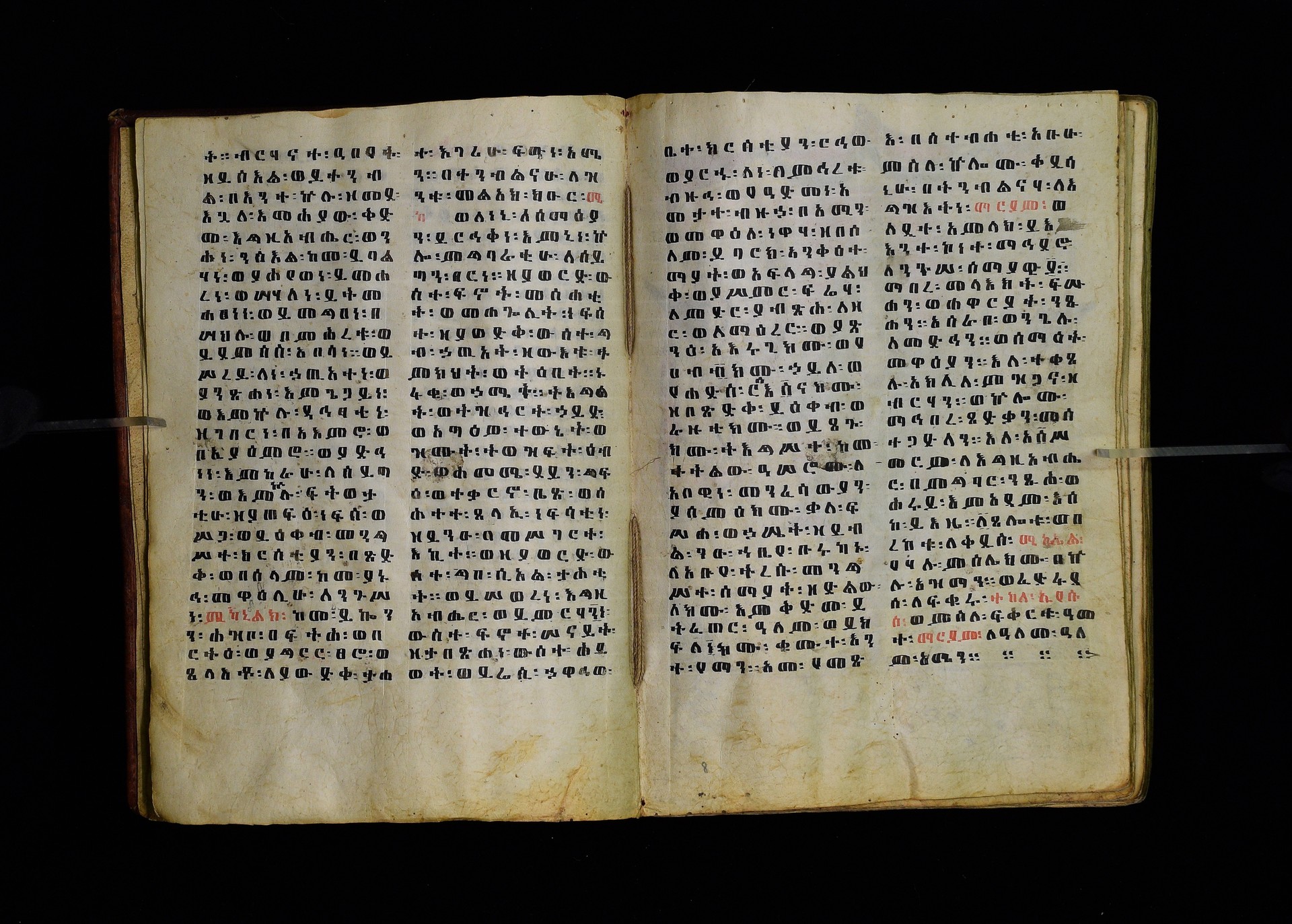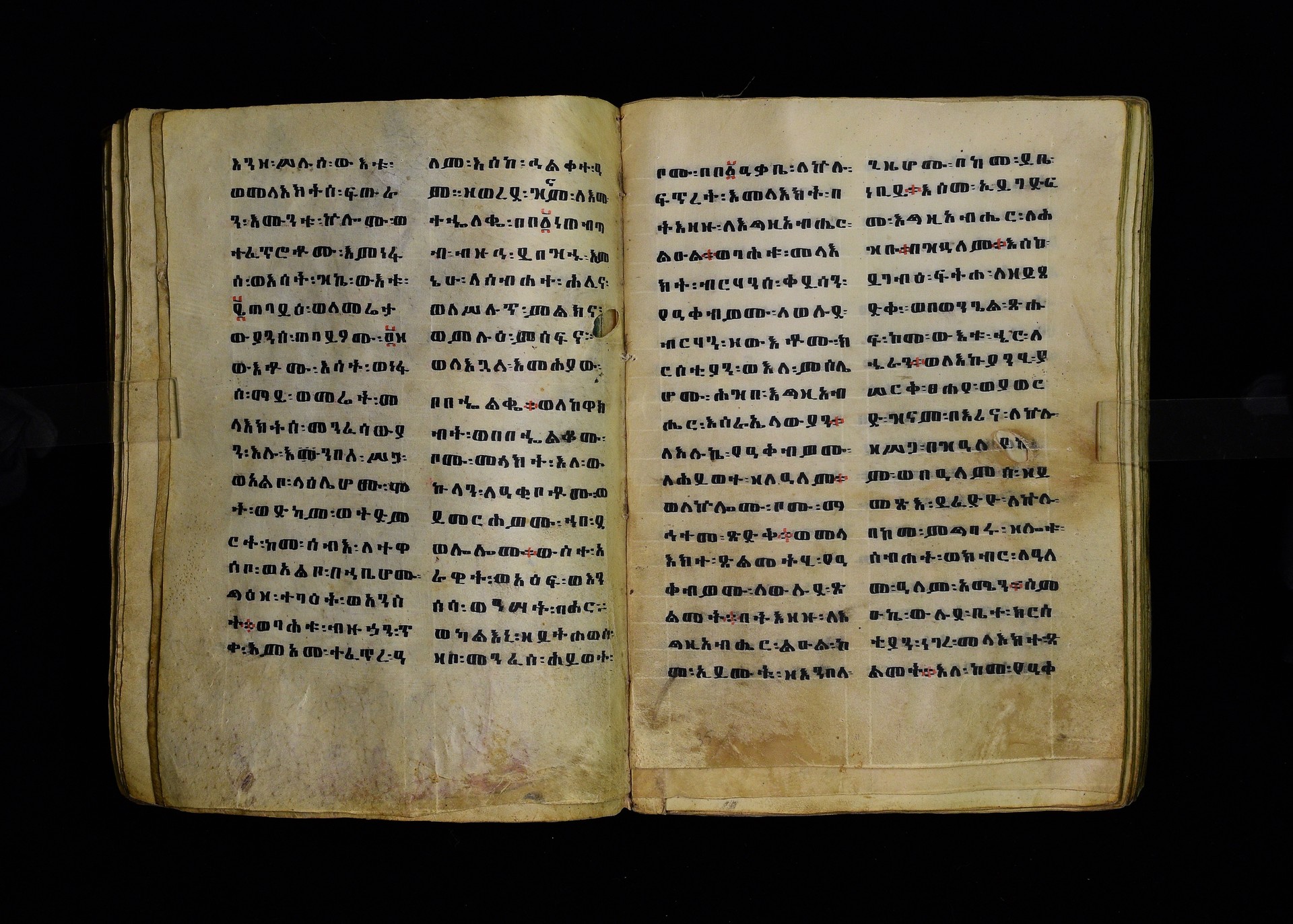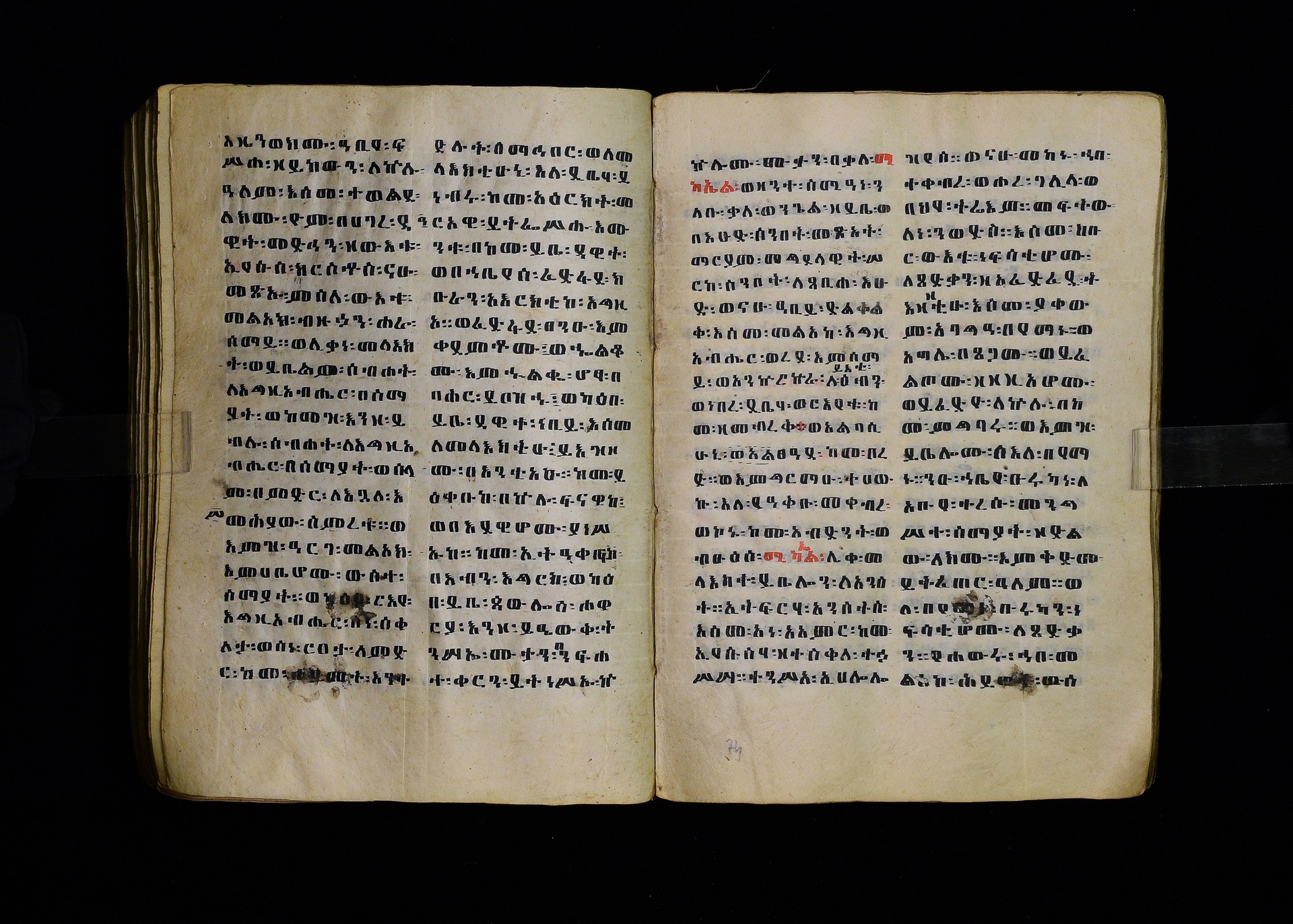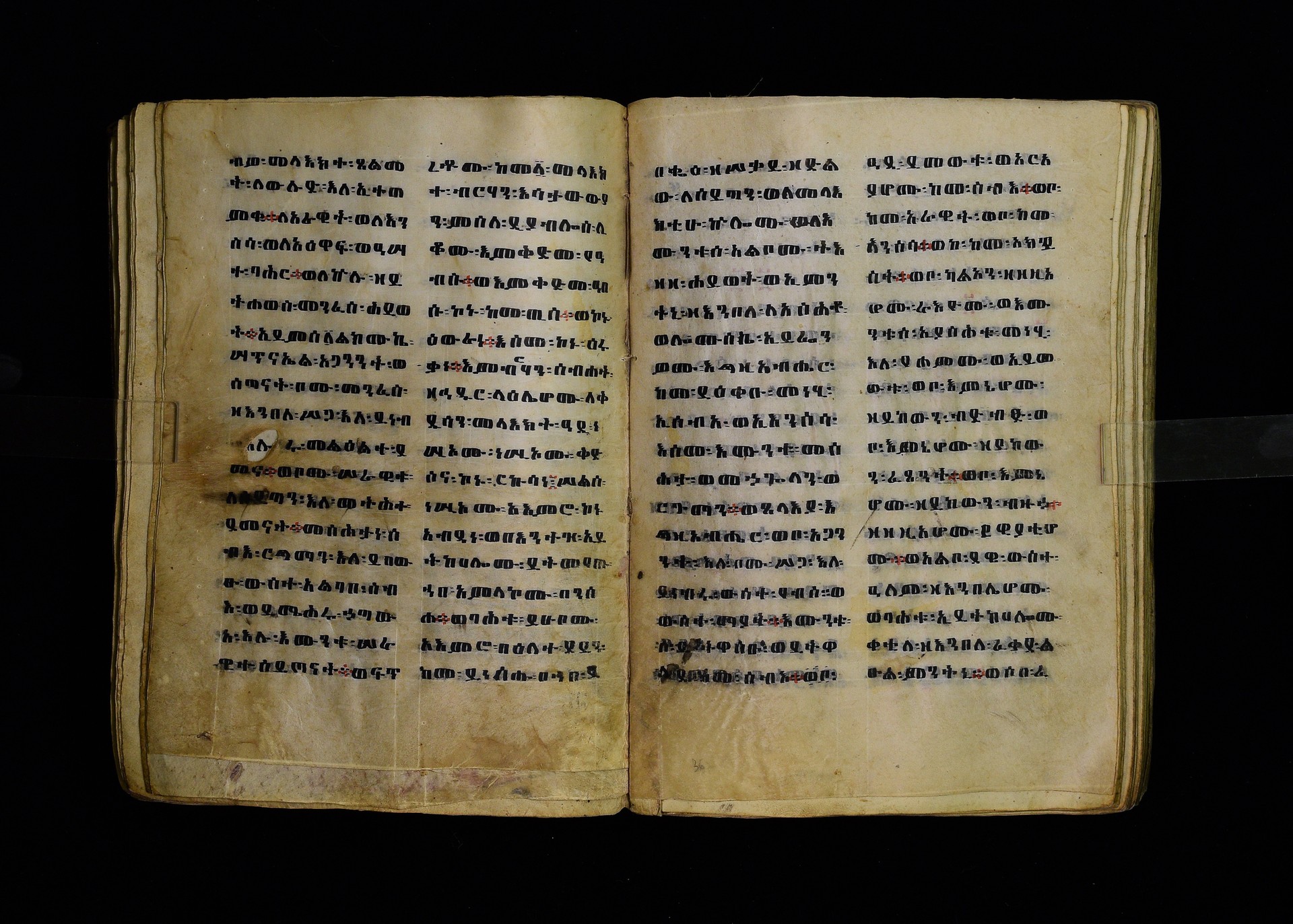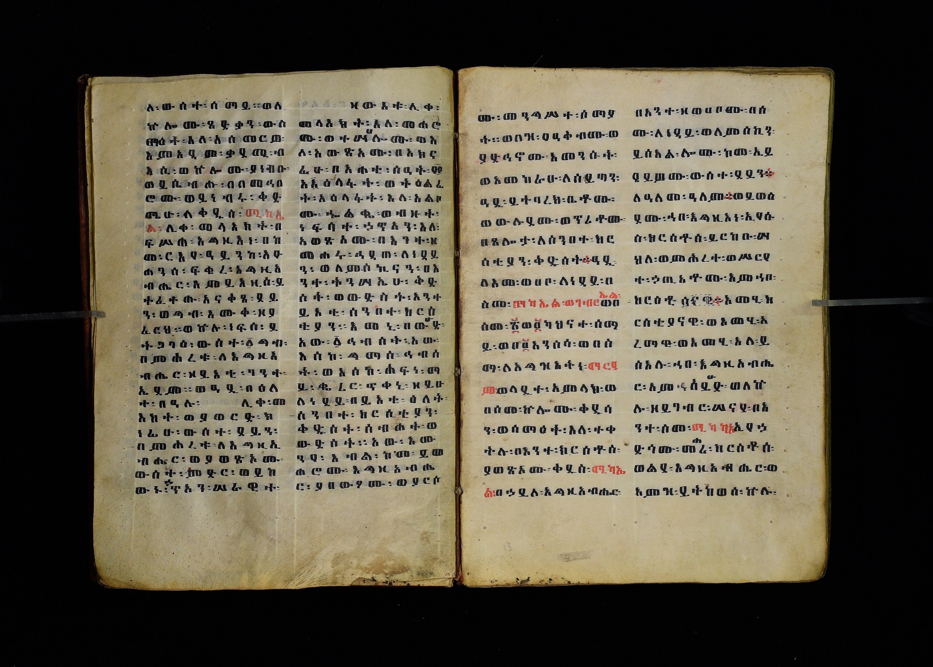 Full-page polychrome miniatures are found on f. 8v (St Michael), f. 33v (George and the dragon), f. 46v (the miracle of the wedding at Cana, with a caption በቃና added in a secondary hand), f. 70v (St Michele). |
