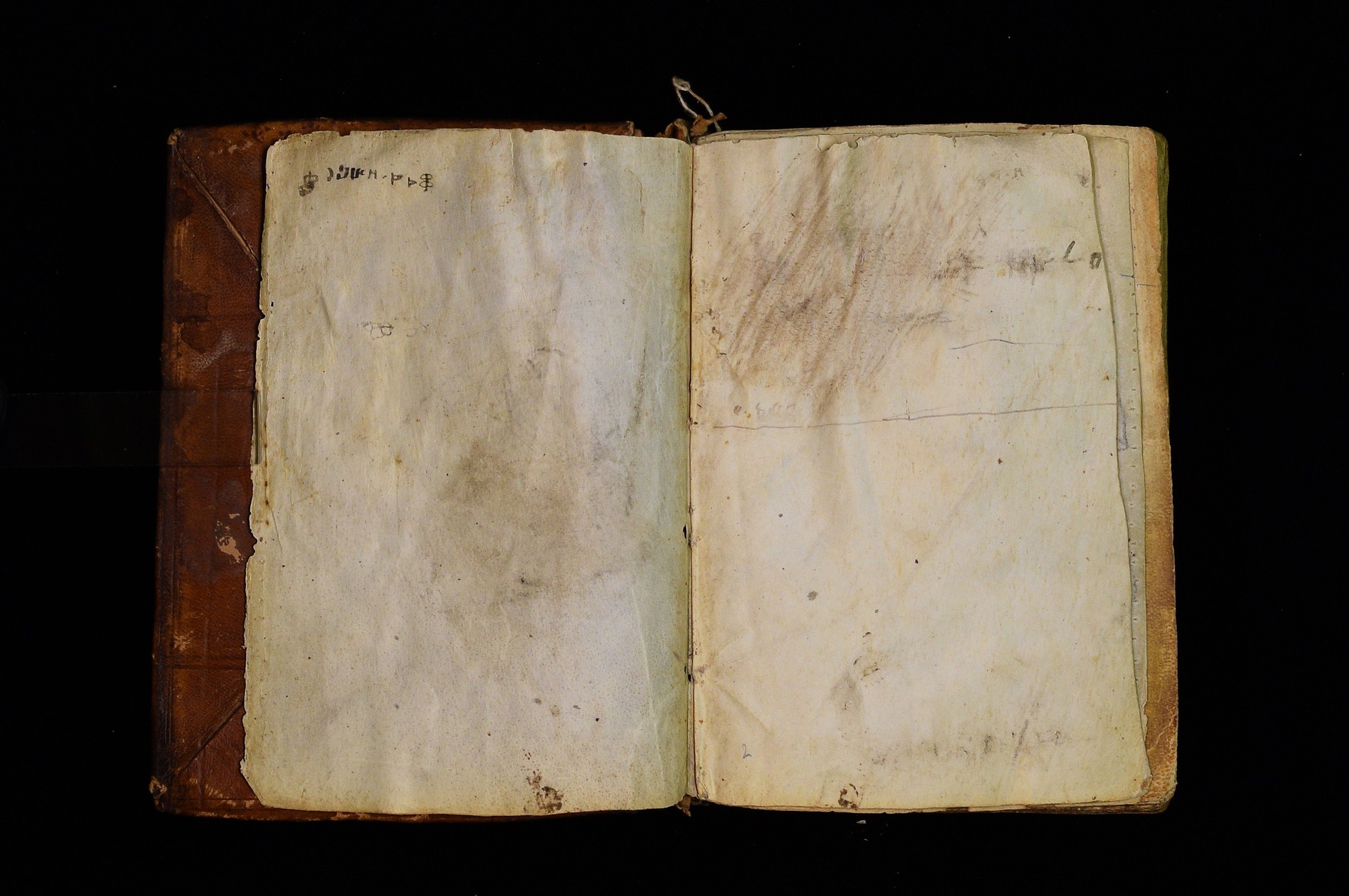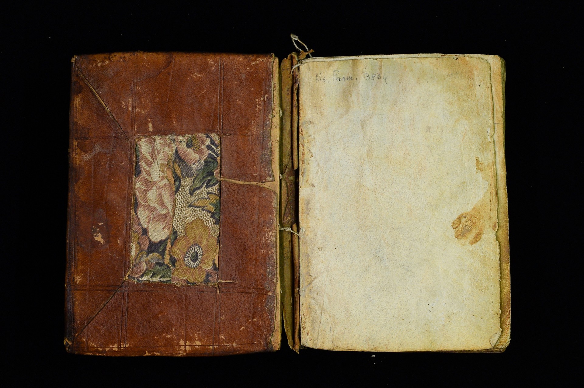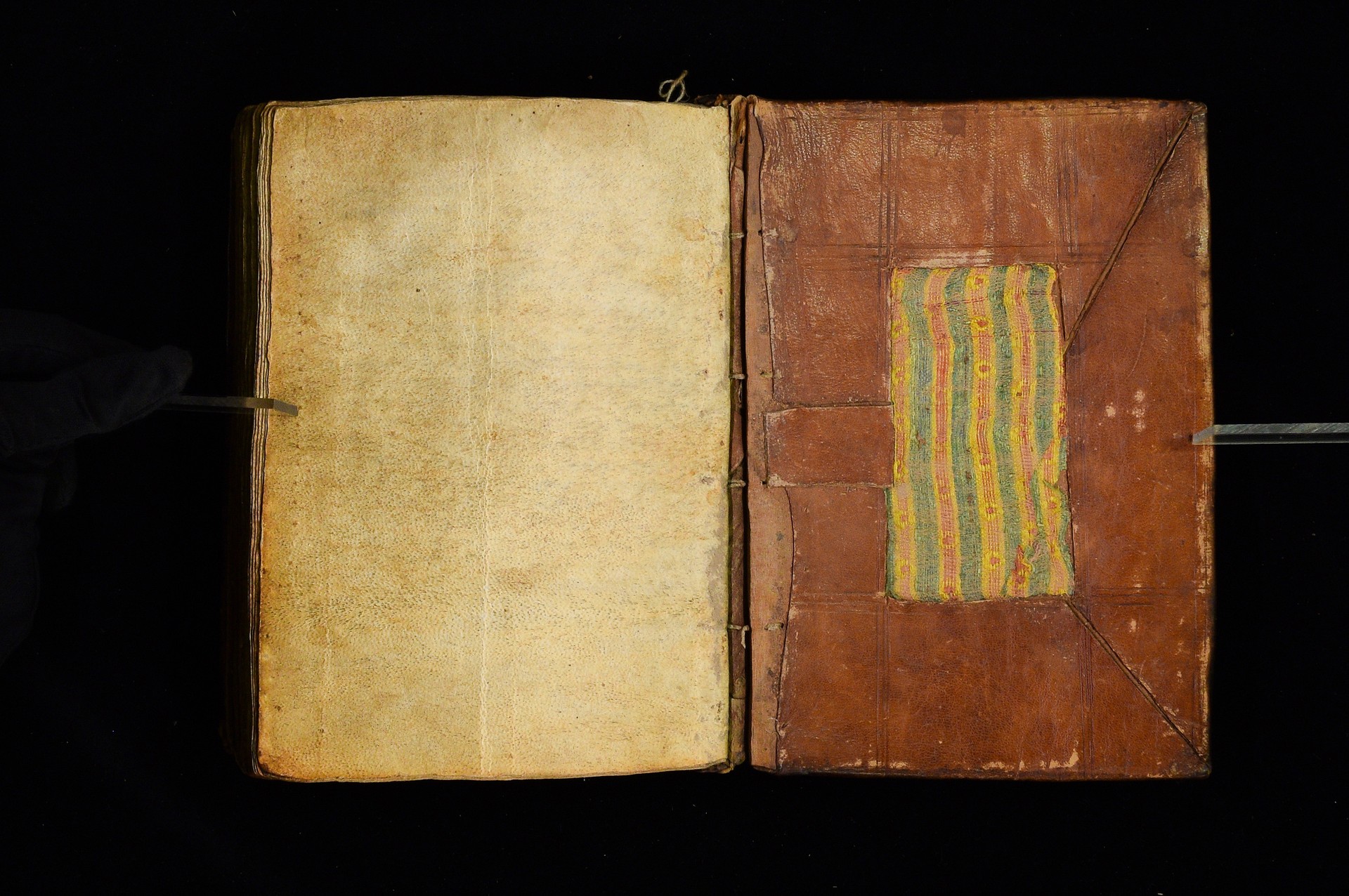 Two wooden boards, leather cover. The spine is uncovered. Four sewing stations. |