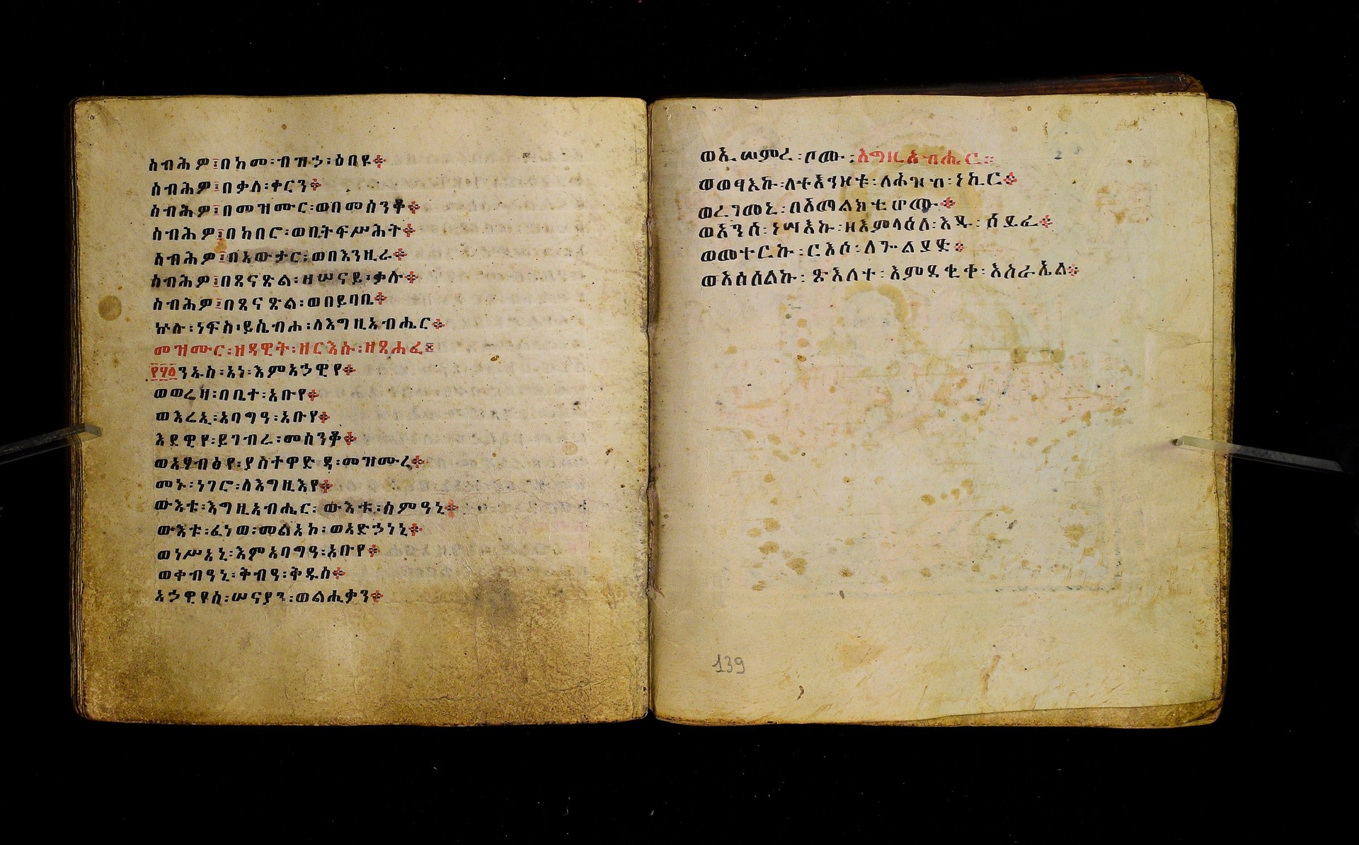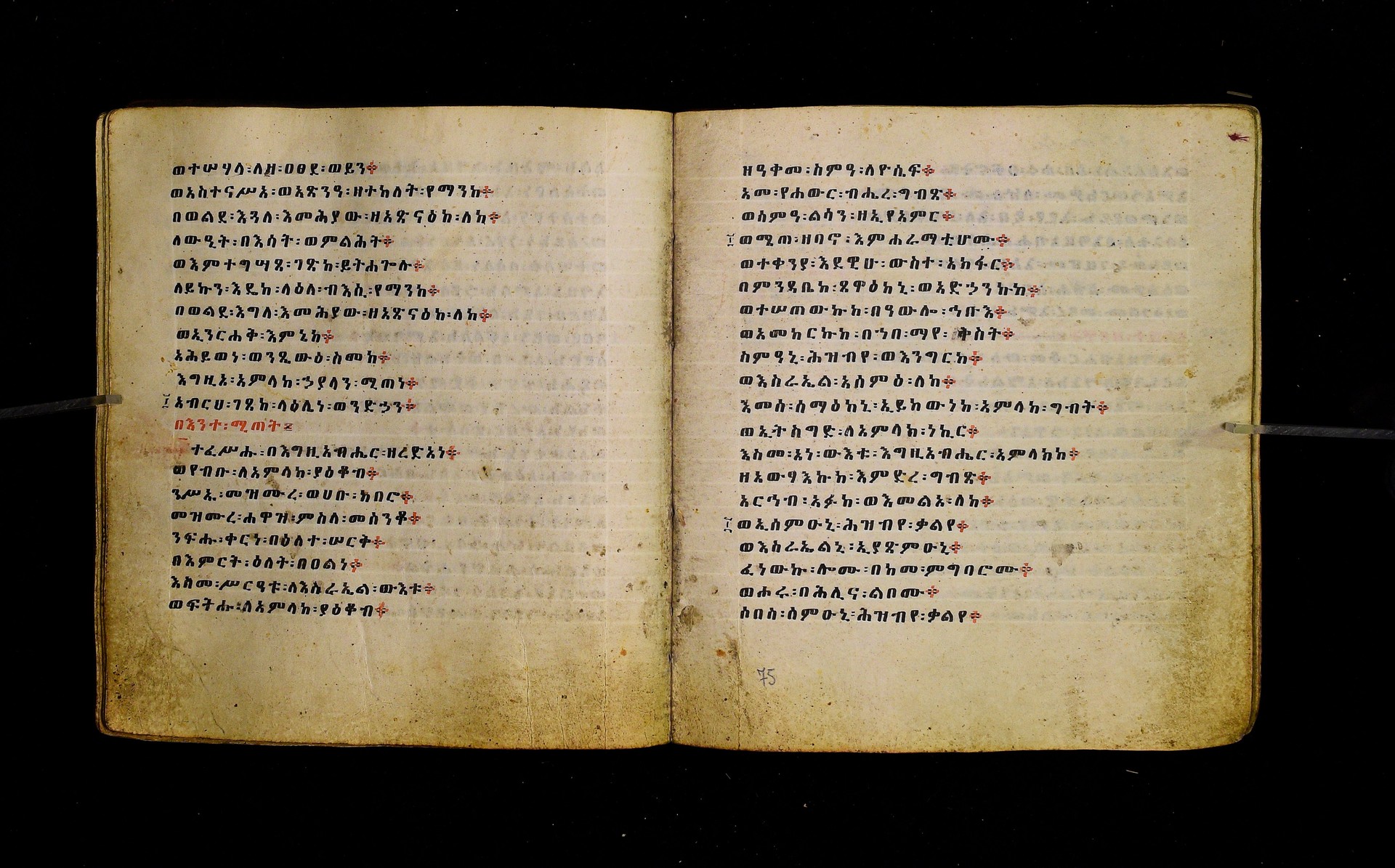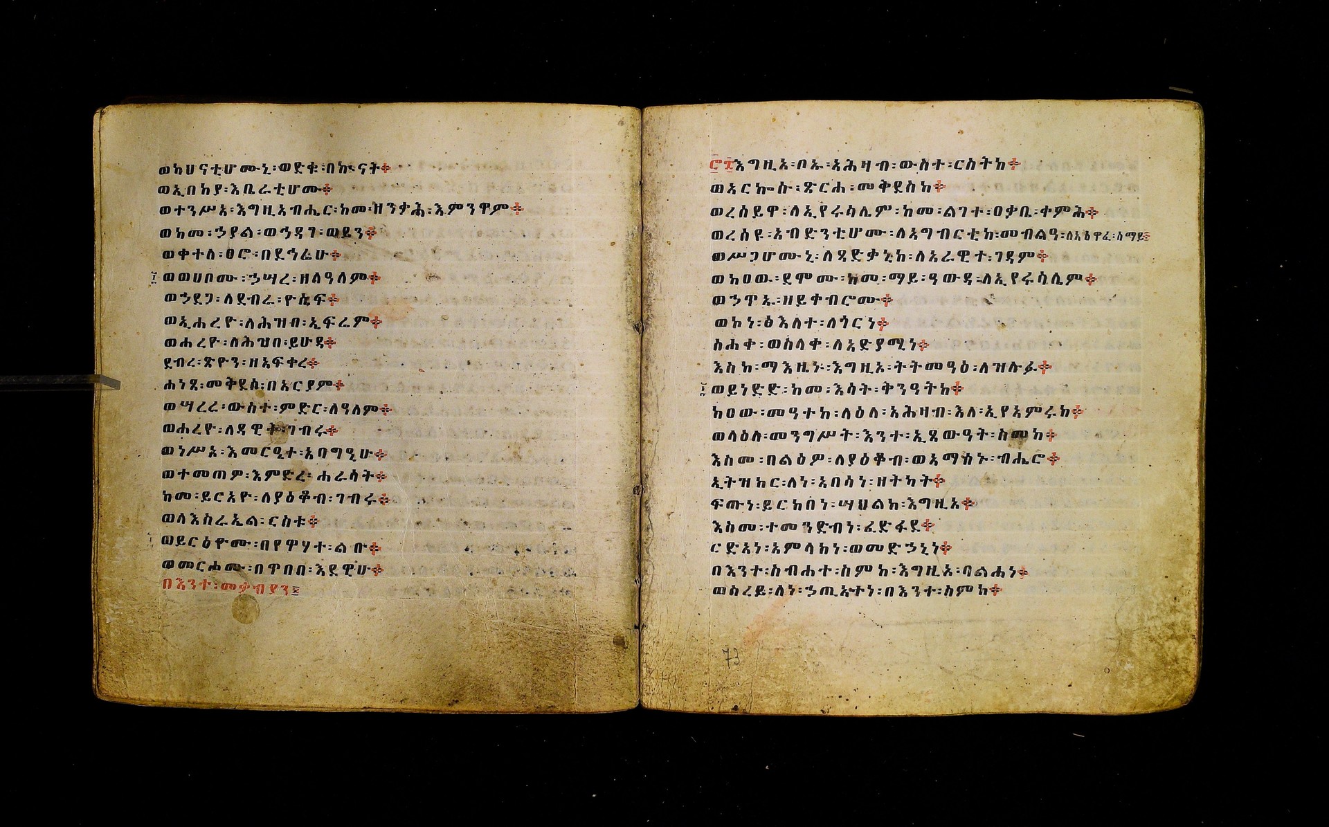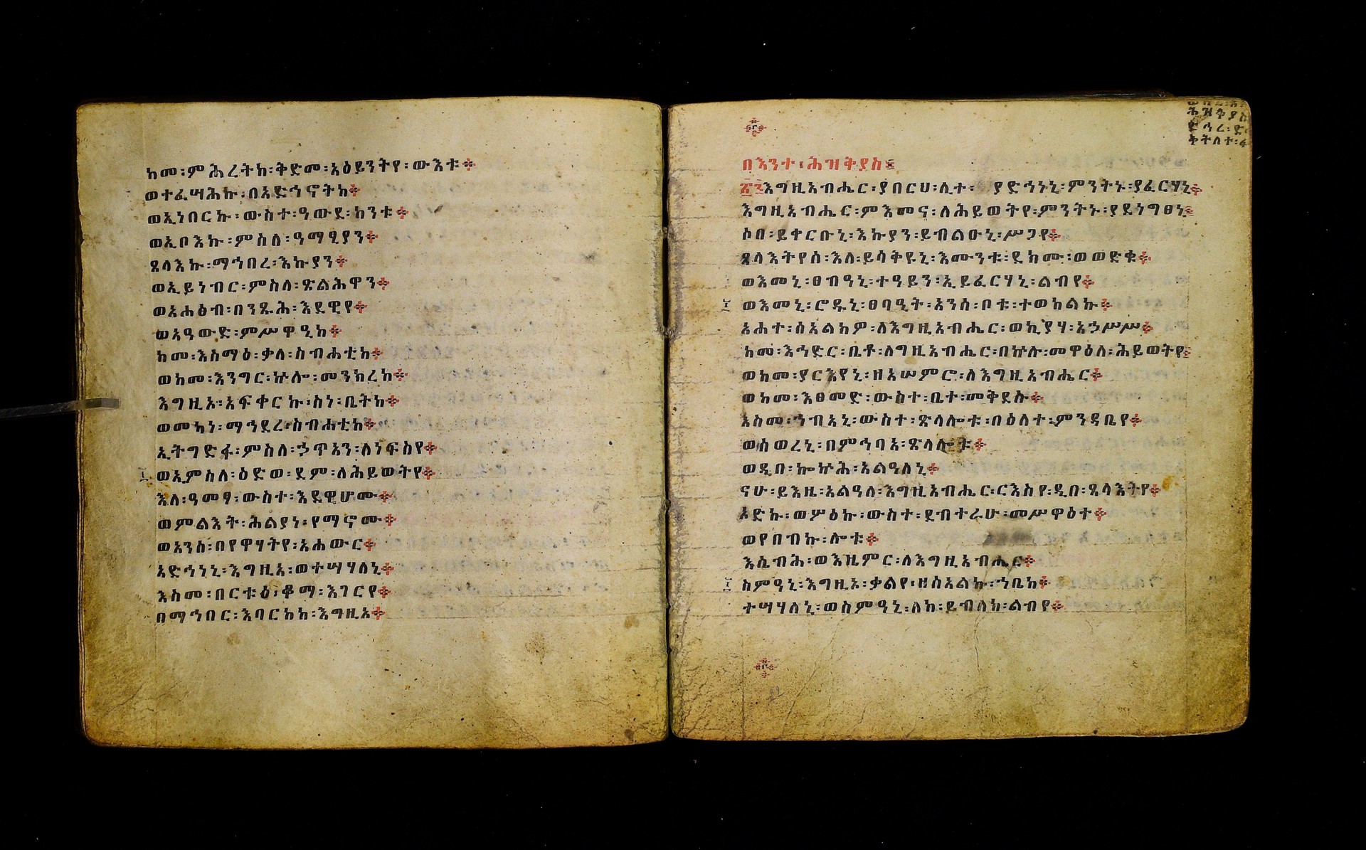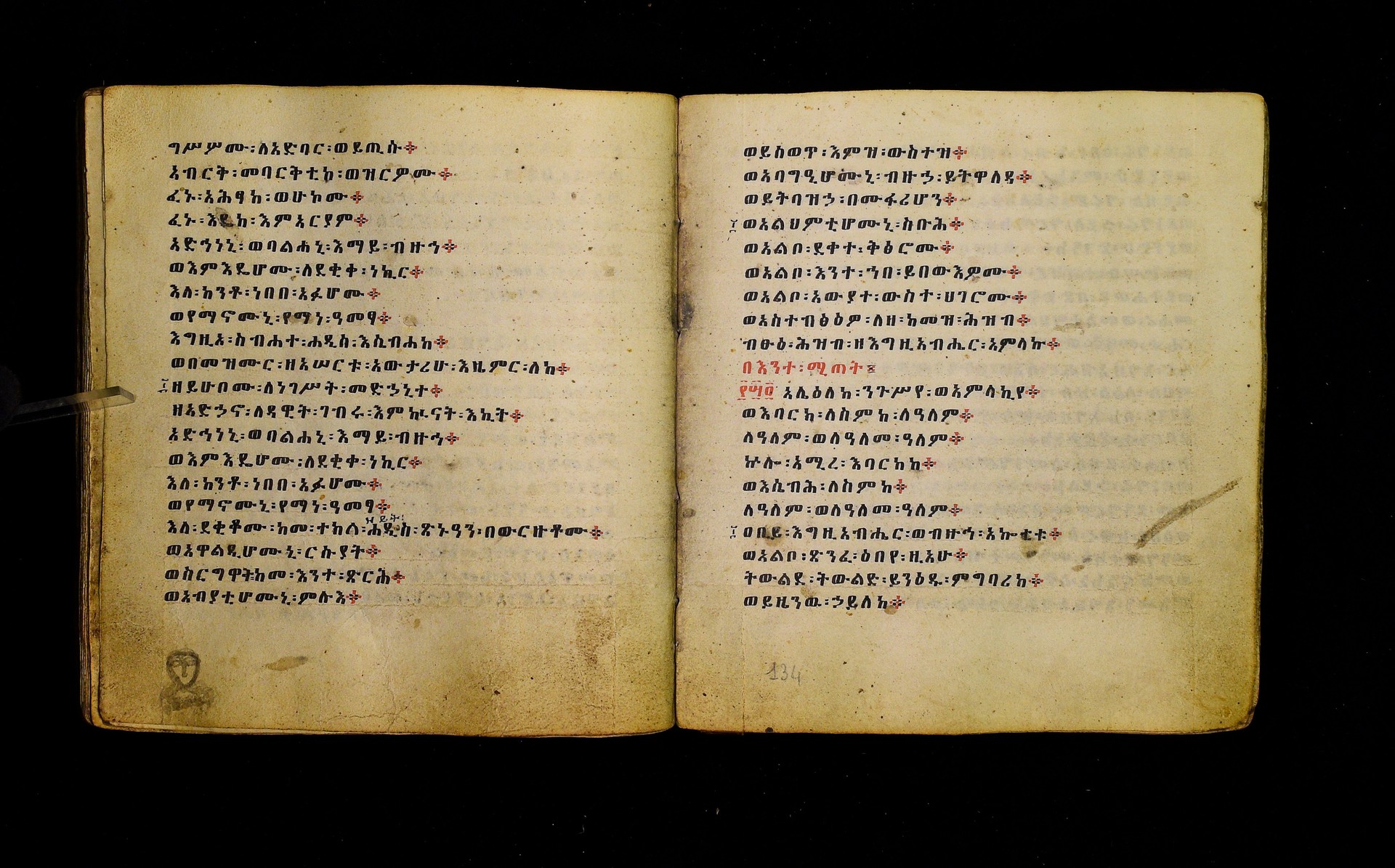 1. F. 2ra–vb: prayer to God, written on two columns in a fine handwriting. Incipit: እገይስ፡ ኀቤከ፡ አምላኪየ፡ አንተ፡ ኩነኒ፡ ረዳእየ፡ ወኩነኒ፡ ምስካይየ። ፀወንየ፡ ወኃይልየ፡ መድኃኒተ፡ ነፍስየ፡ አምላኪየ፡ ወኪያከ፡ ተወከልኩ። ኪያከ፡ ተወከልኩ፡ ኀቤከ፡ ተማኅፀንኩ፡ ኢትግድፈኒ፡ ለዝሉፉ፡ ወኢትርስአኒ፡ በምሕረትከ።. The names of Wäldä Iyäsus e Kidanä Mar[yam] are mentioned on f. 2vb. 2. F. 11r: short mäwaśǝʾt-hymn: ተፈሣሕኩ፡እስመ፡ ይቤሉኒ፡ ቤተ፡ ቤተ፡ እግዚአብሔር፡ ነሐውር። ሶበ፡ ይነቅህ፡ ካህን፡ ተከሥተ፡ ብርሃን፡ ለዓለም፡ ወተቀደሰት፡ ቤተ፡ ክርስቲያን፡ በክ፡ ወበስብሐት፡. The hymn is separated from the main text by a black vertical line and is provided with interlineal musical notation. 3. F. 163va–b: hymn entitled Mäḥaränä ab, “The Father had mercy on us”. The hymn is written in a small script and is provided with interlineal musical notation. Incipit: መሐረነ፡ አብ፡ ሃሌ፡ ሉያ፡ ተሣሃለነ፡ ወልድ፡ ሃሌ፡ ሉያ፡ መንፈስ፡ ቅዱስ፡ መሐሪ፡ ተዘከረነ፡ በሣህልከ። ለከ፡ ንፌኑ፡ ስብሐተ፡ ወለከ፡ ነዓርግ፡ አኰቴተ። መሐረነ፡ መሐሪ፡ ኃጢአተነ፡ አስተስሪ። 4. Ff. 178va–179ra: Ethiopian syllabary, written in a recent and untrained hand and followed by a short text in Amharic and Gǝʿǝz, written in the same hand. Incipit: አሊ፡ ጀረ፡ አመተ፡ ጀርጀረ፡ ነጋሢ፡ ምኒልክ፡ ቍርቍራ፡ ስመ፡ ጥርስ፡ አጥርሲ፡ አንበሳ፡ ጋማማ፡ ነምር፡ ጥፍራማ፡ ጅብ፡ ደደሳማ. |