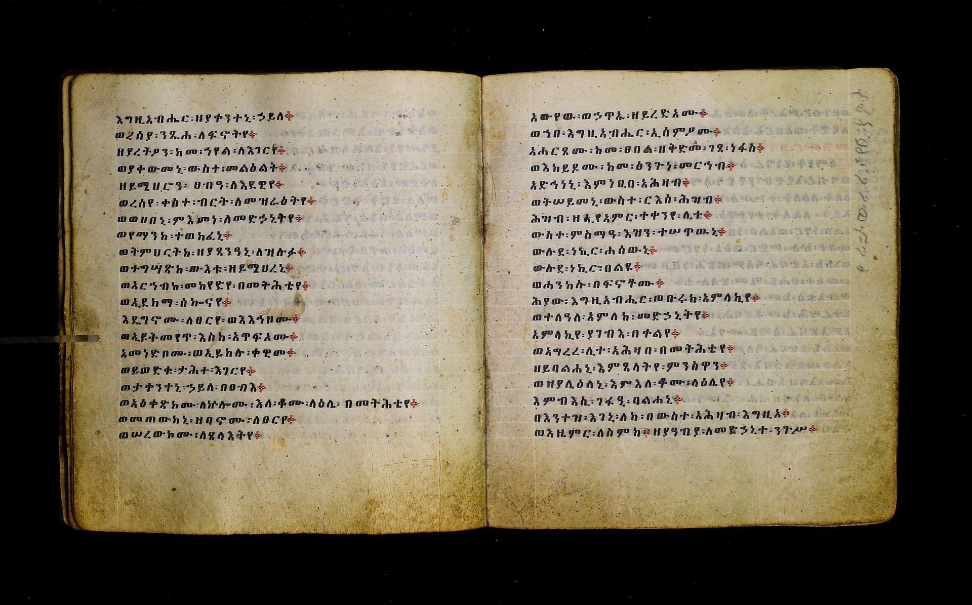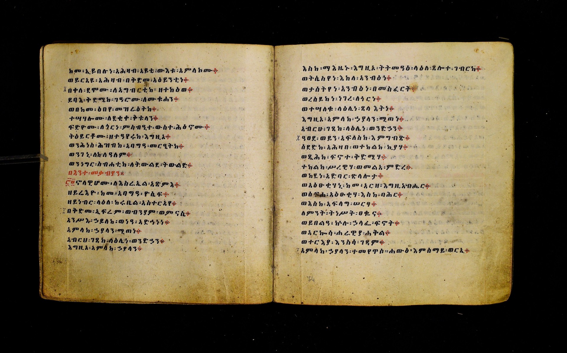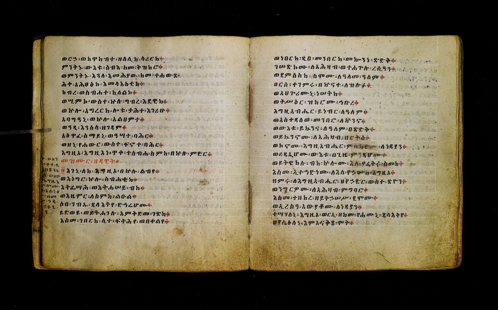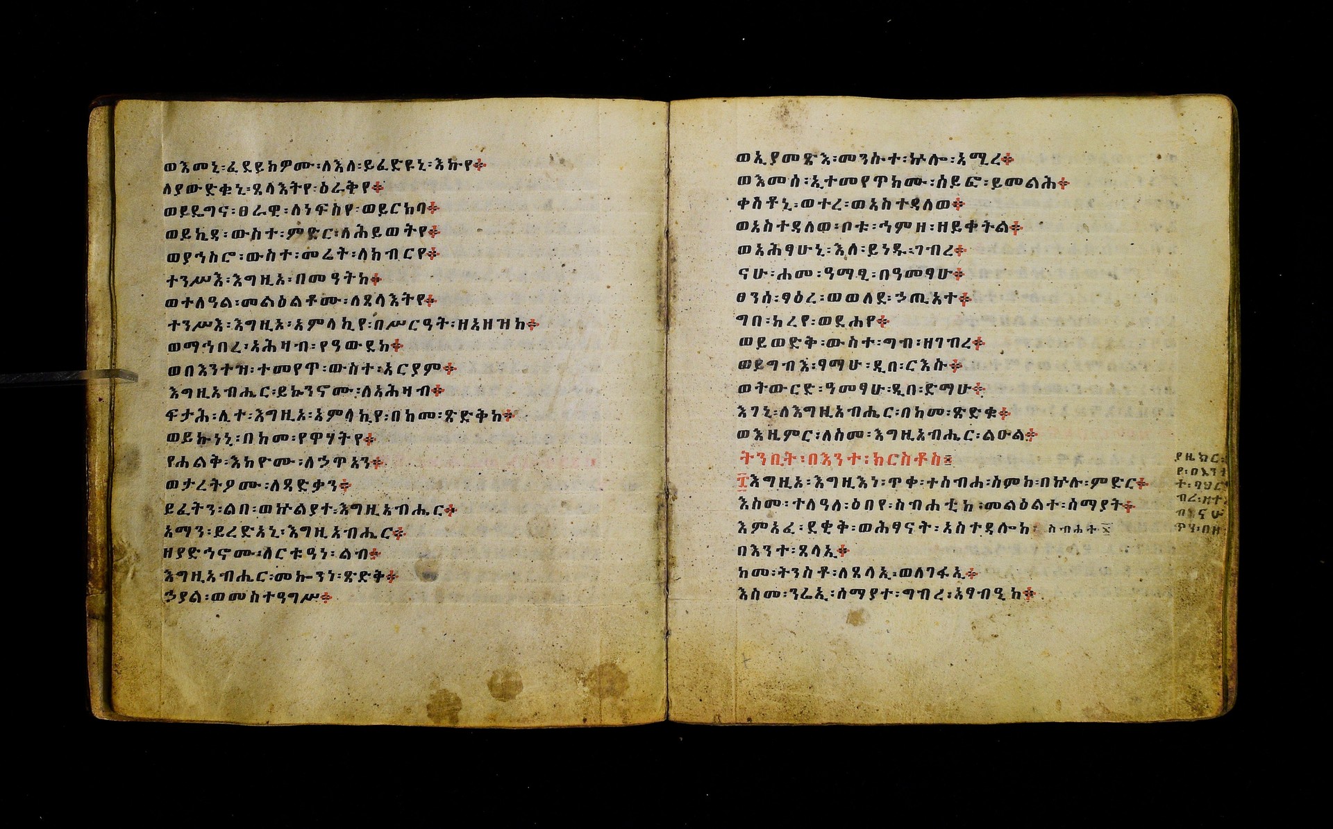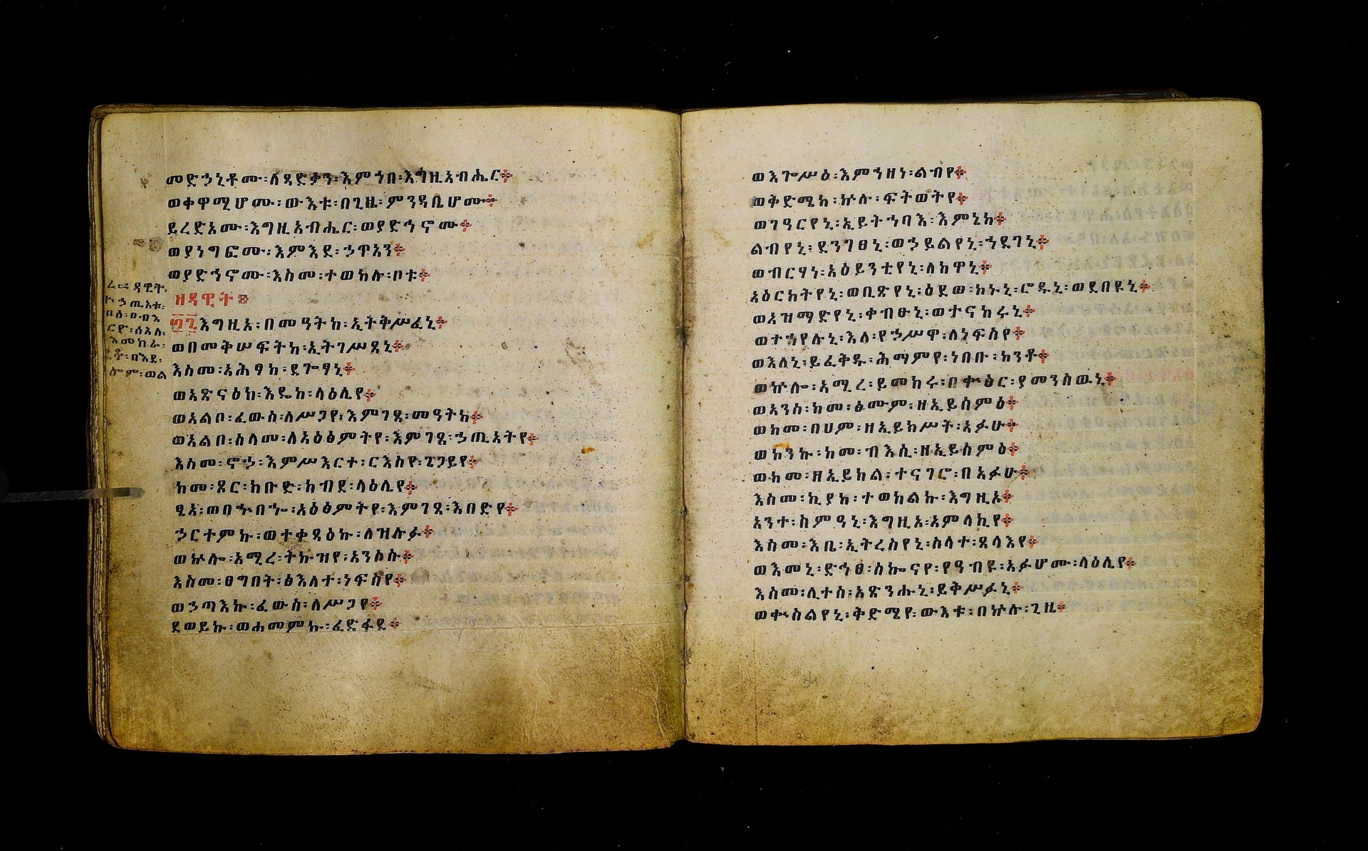 1. F. 2ra–vb: prayer to God, written on two columns in a fine handwriting. Incipit: እገይስ፡ ኀቤከ፡ አምላኪየ፡ አንተ፡ ኩነኒ፡ ረዳእየ፡ ወኩነኒ፡ ምስካይየ። ፀወንየ፡ ወኃይልየ፡ መድኃኒተ፡ ነፍስየ፡ አምላኪየ፡ ወኪያከ፡ ተወከልኩ። ኪያከ፡ ተወከልኩ፡ ኀቤከ፡ ተማኅፀንኩ፡ ኢትግድፈኒ፡ ለዝሉፉ፡ ወኢትርስአኒ፡ በምሕረትከ።. The names of Wäldä Iyäsus e Kidanä Mar[yam] are mentioned on f. 2vb. 2. F. 11r: short mäwaśǝʾt-hymn: ተፈሣሕኩ፡እስመ፡ ይቤሉኒ፡ ቤተ፡ ቤተ፡ እግዚአብሔር፡ ነሐውር። ሶበ፡ ይነቅህ፡ ካህን፡ ተከሥተ፡ ብርሃን፡ ለዓለም፡ ወተቀደሰት፡ ቤተ፡ ክርስቲያን፡ በክ፡ ወበስብሐት፡. The hymn is separated from the main text by a black vertical line and is provided with interlineal musical notation. 3. F. 163va–b: hymn entitled Mäḥaränä ab, “The Father had mercy on us”. The hymn is written in a small script and is provided with interlineal musical notation. Incipit: መሐረነ፡ አብ፡ ሃሌ፡ ሉያ፡ ተሣሃለነ፡ ወልድ፡ ሃሌ፡ ሉያ፡ መንፈስ፡ ቅዱስ፡ መሐሪ፡ ተዘከረነ፡ በሣህልከ። ለከ፡ ንፌኑ፡ ስብሐተ፡ ወለከ፡ ነዓርግ፡ አኰቴተ። መሐረነ፡ መሐሪ፡ ኃጢአተነ፡ አስተስሪ። 4. Ff. 178va–179ra: Ethiopian syllabary, written in a recent and untrained hand and followed by a short text in Amharic and Gǝʿǝz, written in the same hand. Incipit: አሊ፡ ጀረ፡ አመተ፡ ጀርጀረ፡ ነጋሢ፡ ምኒልክ፡ ቍርቍራ፡ ስመ፡ ጥርስ፡ አጥርሲ፡ አንበሳ፡ ጋማማ፡ ነምር፡ ጥፍራማ፡ ጅብ፡ ደደሳማ. |
