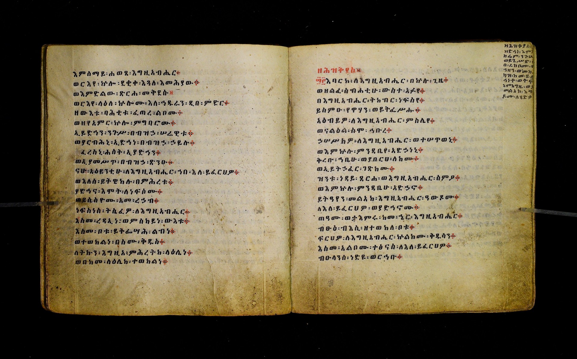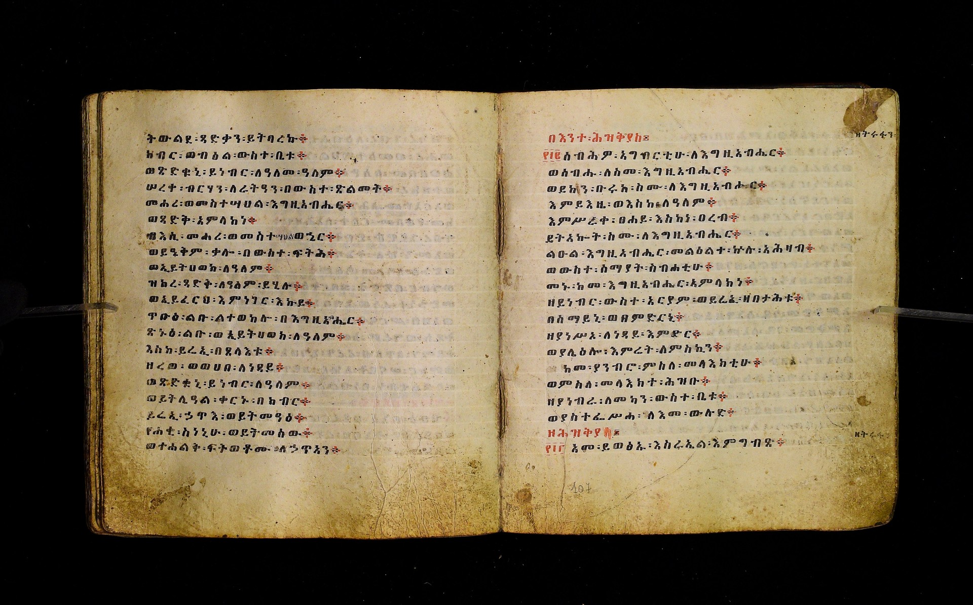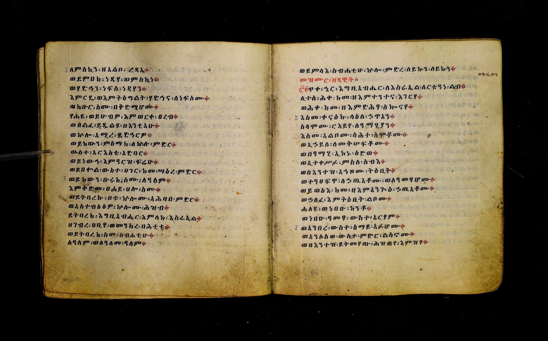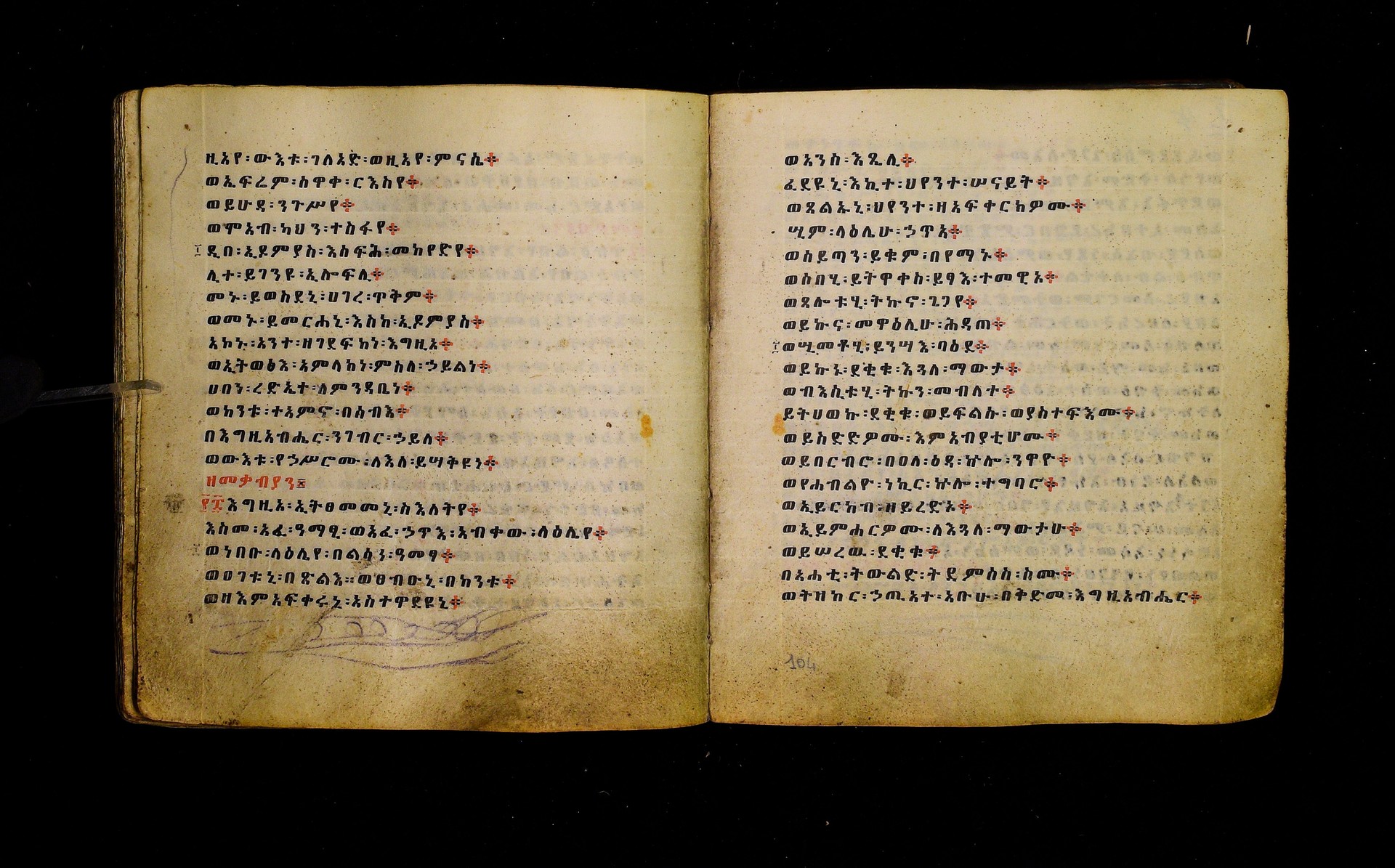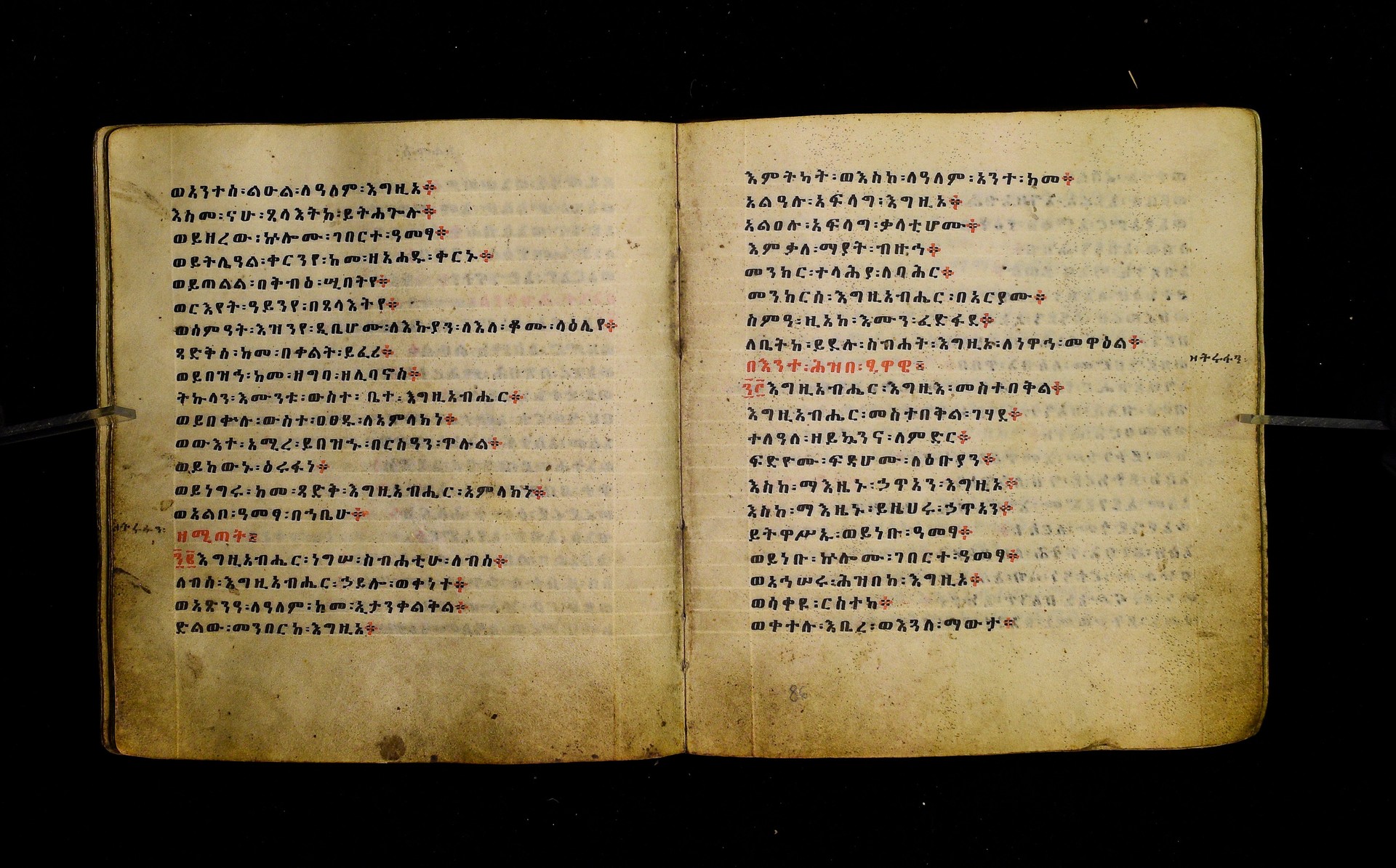 1. F. 2ra–vb: prayer to God, written on two columns in a fine handwriting. Incipit: እገይስ፡ ኀቤከ፡ አምላኪየ፡ አንተ፡ ኩነኒ፡ ረዳእየ፡ ወኩነኒ፡ ምስካይየ። ፀወንየ፡ ወኃይልየ፡ መድኃኒተ፡ ነፍስየ፡ አምላኪየ፡ ወኪያከ፡ ተወከልኩ። ኪያከ፡ ተወከልኩ፡ ኀቤከ፡ ተማኅፀንኩ፡ ኢትግድፈኒ፡ ለዝሉፉ፡ ወኢትርስአኒ፡ በምሕረትከ።. The names of Wäldä Iyäsus e Kidanä Mar[yam] are mentioned on f. 2vb. 2. F. 11r: short mäwaśǝʾt-hymn: ተፈሣሕኩ፡እስመ፡ ይቤሉኒ፡ ቤተ፡ ቤተ፡ እግዚአብሔር፡ ነሐውር። ሶበ፡ ይነቅህ፡ ካህን፡ ተከሥተ፡ ብርሃን፡ ለዓለም፡ ወተቀደሰት፡ ቤተ፡ ክርስቲያን፡ በክ፡ ወበስብሐት፡. The hymn is separated from the main text by a black vertical line and is provided with interlineal musical notation. 3. F. 163va–b: hymn entitled Mäḥaränä ab, “The Father had mercy on us”. The hymn is written in a small script and is provided with interlineal musical notation. Incipit: መሐረነ፡ አብ፡ ሃሌ፡ ሉያ፡ ተሣሃለነ፡ ወልድ፡ ሃሌ፡ ሉያ፡ መንፈስ፡ ቅዱስ፡ መሐሪ፡ ተዘከረነ፡ በሣህልከ። ለከ፡ ንፌኑ፡ ስብሐተ፡ ወለከ፡ ነዓርግ፡ አኰቴተ። መሐረነ፡ መሐሪ፡ ኃጢአተነ፡ አስተስሪ። 4. Ff. 178va–179ra: Ethiopian syllabary, written in a recent and untrained hand and followed by a short text in Amharic and Gǝʿǝz, written in the same hand. Incipit: አሊ፡ ጀረ፡ አመተ፡ ጀርጀረ፡ ነጋሢ፡ ምኒልክ፡ ቍርቍራ፡ ስመ፡ ጥርስ፡ አጥርሲ፡ አንበሳ፡ ጋማማ፡ ነምር፡ ጥፍራማ፡ ጅብ፡ ደደሳማ. |