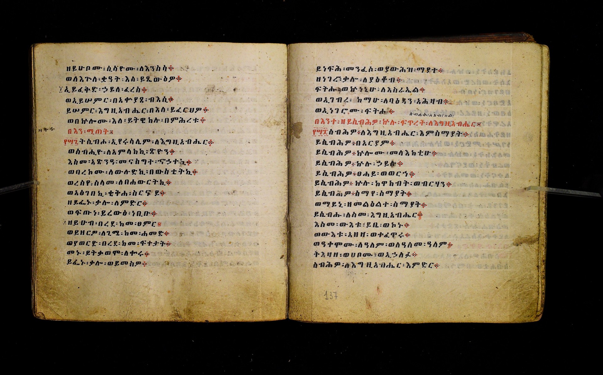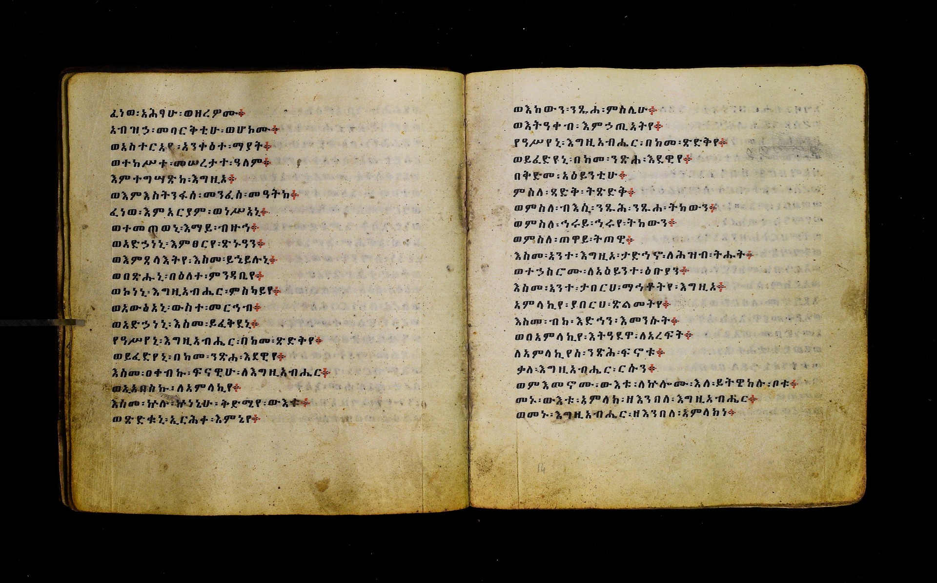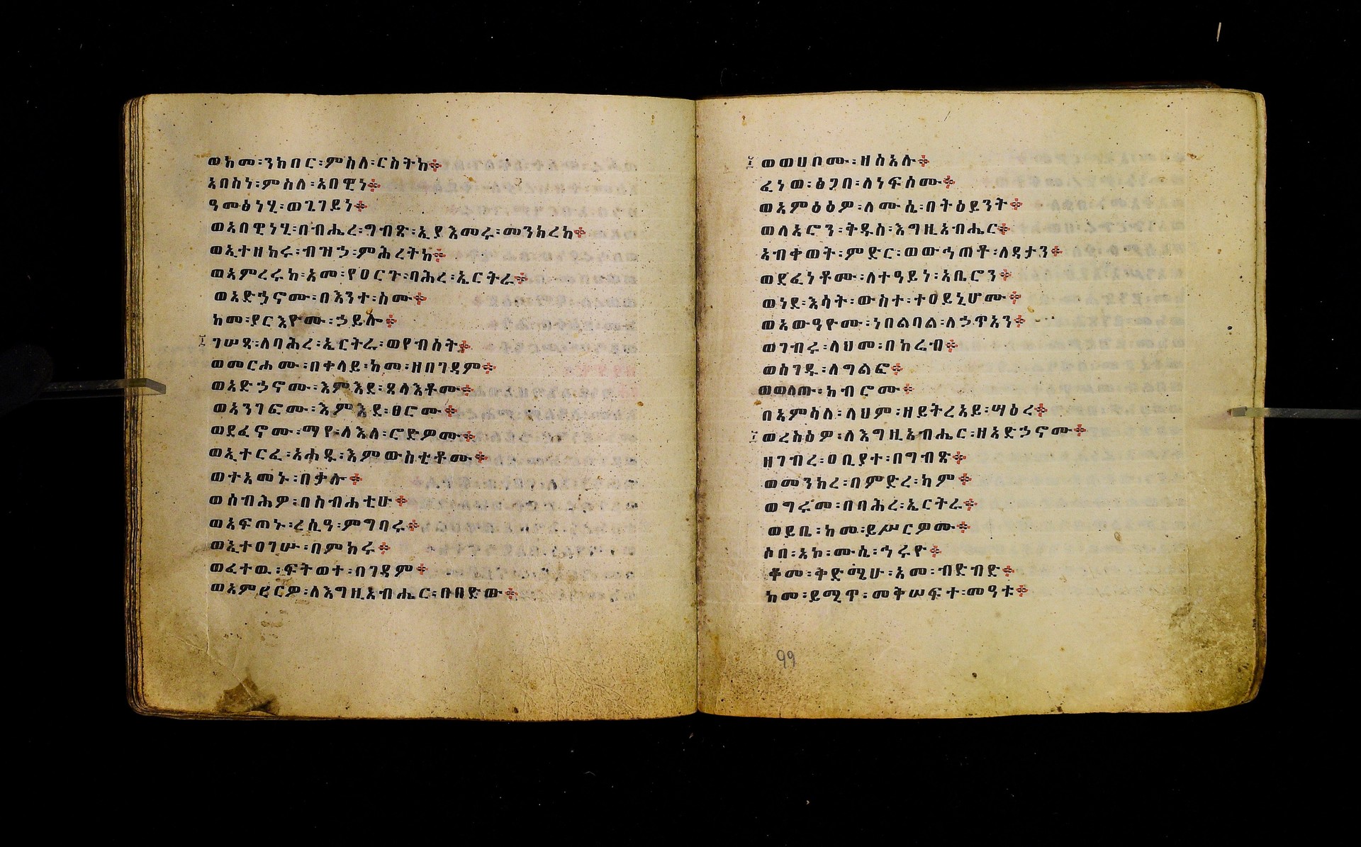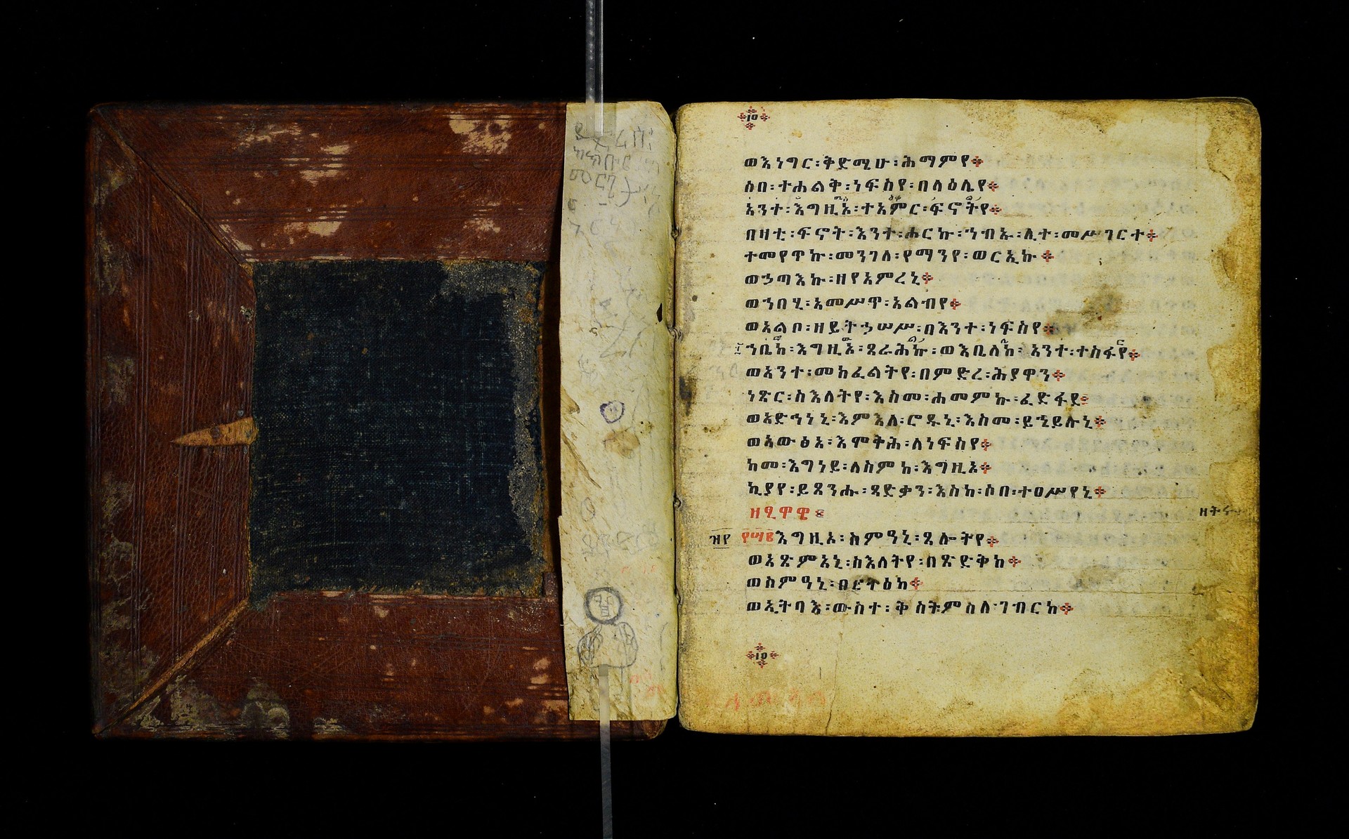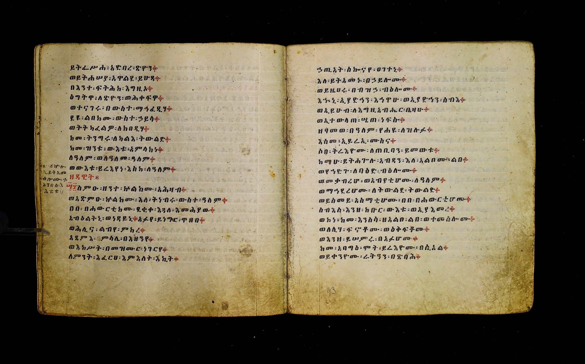 1. F. 2ra–vb: prayer to God, written on two columns in a fine handwriting. Incipit: እገይስ፡ ኀቤከ፡ አምላኪየ፡ አንተ፡ ኩነኒ፡ ረዳእየ፡ ወኩነኒ፡ ምስካይየ። ፀወንየ፡ ወኃይልየ፡ መድኃኒተ፡ ነፍስየ፡ አምላኪየ፡ ወኪያከ፡ ተወከልኩ። ኪያከ፡ ተወከልኩ፡ ኀቤከ፡ ተማኅፀንኩ፡ ኢትግድፈኒ፡ ለዝሉፉ፡ ወኢትርስአኒ፡ በምሕረትከ።. The names of Wäldä Iyäsus e Kidanä Mar[yam] are mentioned on f. 2vb. 2. F. 11r: short mäwaśǝʾt-hymn: ተፈሣሕኩ፡እስመ፡ ይቤሉኒ፡ ቤተ፡ ቤተ፡ እግዚአብሔር፡ ነሐውር። ሶበ፡ ይነቅህ፡ ካህን፡ ተከሥተ፡ ብርሃን፡ ለዓለም፡ ወተቀደሰት፡ ቤተ፡ ክርስቲያን፡ በክ፡ ወበስብሐት፡. The hymn is separated from the main text by a black vertical line and is provided with interlineal musical notation. 3. F. 163va–b: hymn entitled Mäḥaränä ab, “The Father had mercy on us”. The hymn is written in a small script and is provided with interlineal musical notation. Incipit: መሐረነ፡ አብ፡ ሃሌ፡ ሉያ፡ ተሣሃለነ፡ ወልድ፡ ሃሌ፡ ሉያ፡ መንፈስ፡ ቅዱስ፡ መሐሪ፡ ተዘከረነ፡ በሣህልከ። ለከ፡ ንፌኑ፡ ስብሐተ፡ ወለከ፡ ነዓርግ፡ አኰቴተ። መሐረነ፡ መሐሪ፡ ኃጢአተነ፡ አስተስሪ። 4. Ff. 178va–179ra: Ethiopian syllabary, written in a recent and untrained hand and followed by a short text in Amharic and Gǝʿǝz, written in the same hand. Incipit: አሊ፡ ጀረ፡ አመተ፡ ጀርጀረ፡ ነጋሢ፡ ምኒልክ፡ ቍርቍራ፡ ስመ፡ ጥርስ፡ አጥርሲ፡ አንበሳ፡ ጋማማ፡ ነምር፡ ጥፍራማ፡ ጅብ፡ ደደሳማ. |
