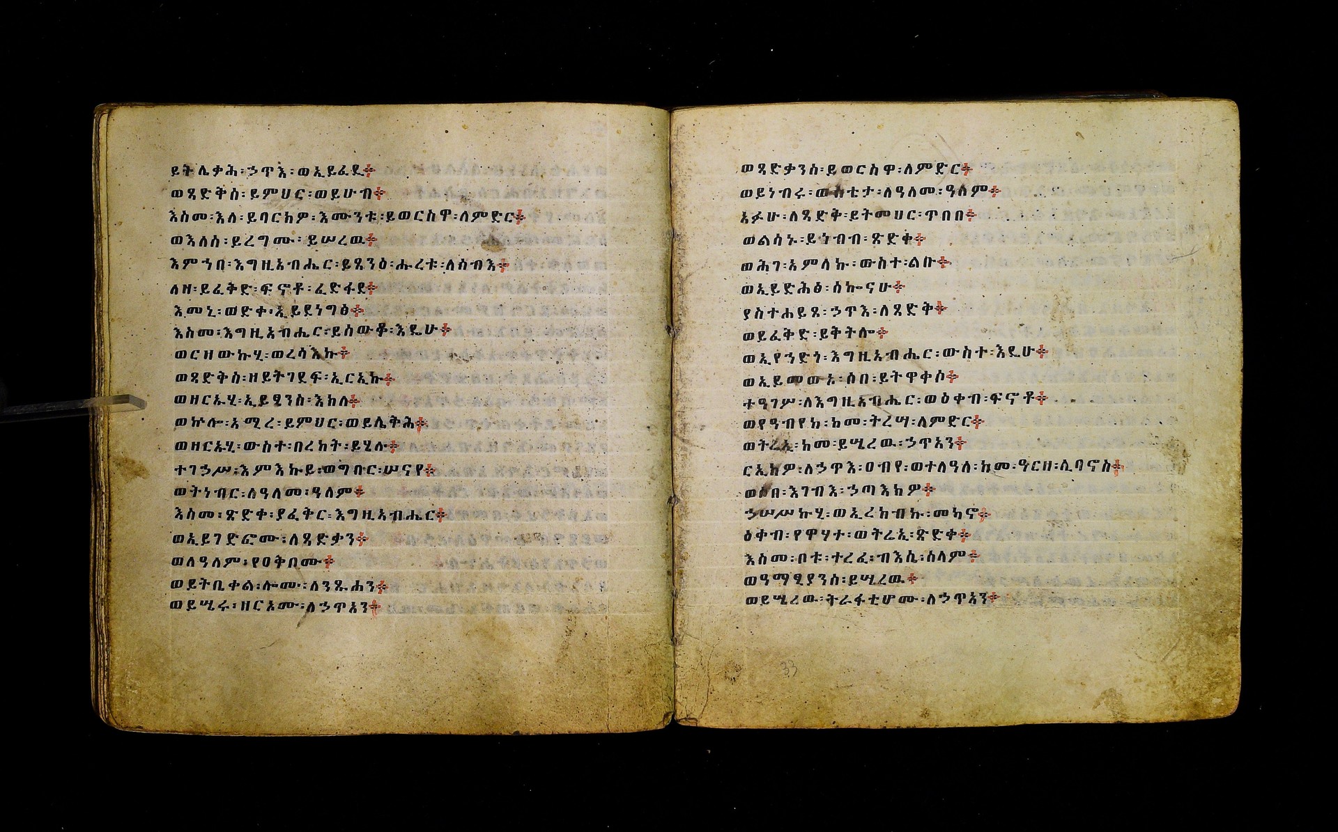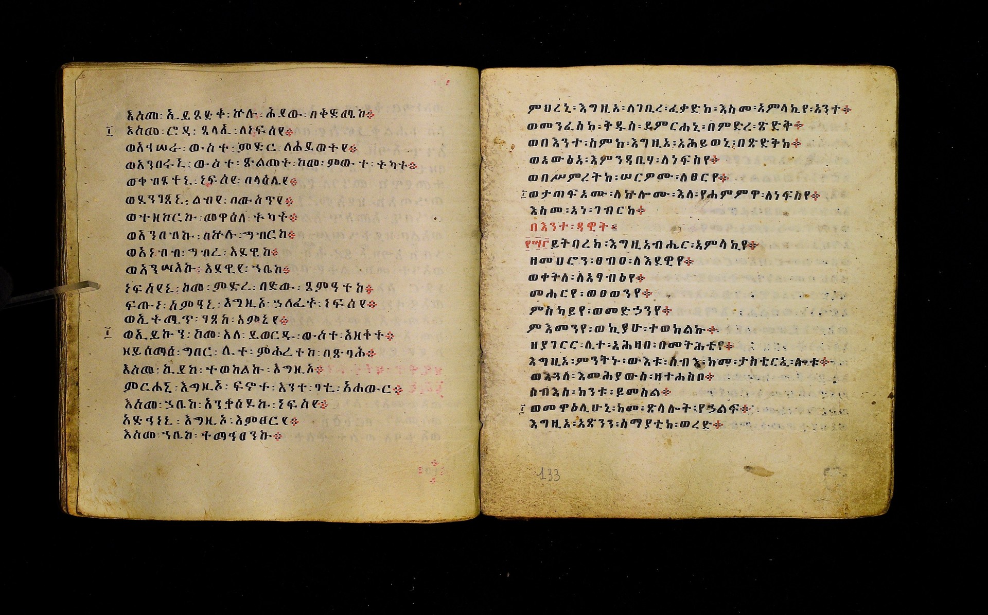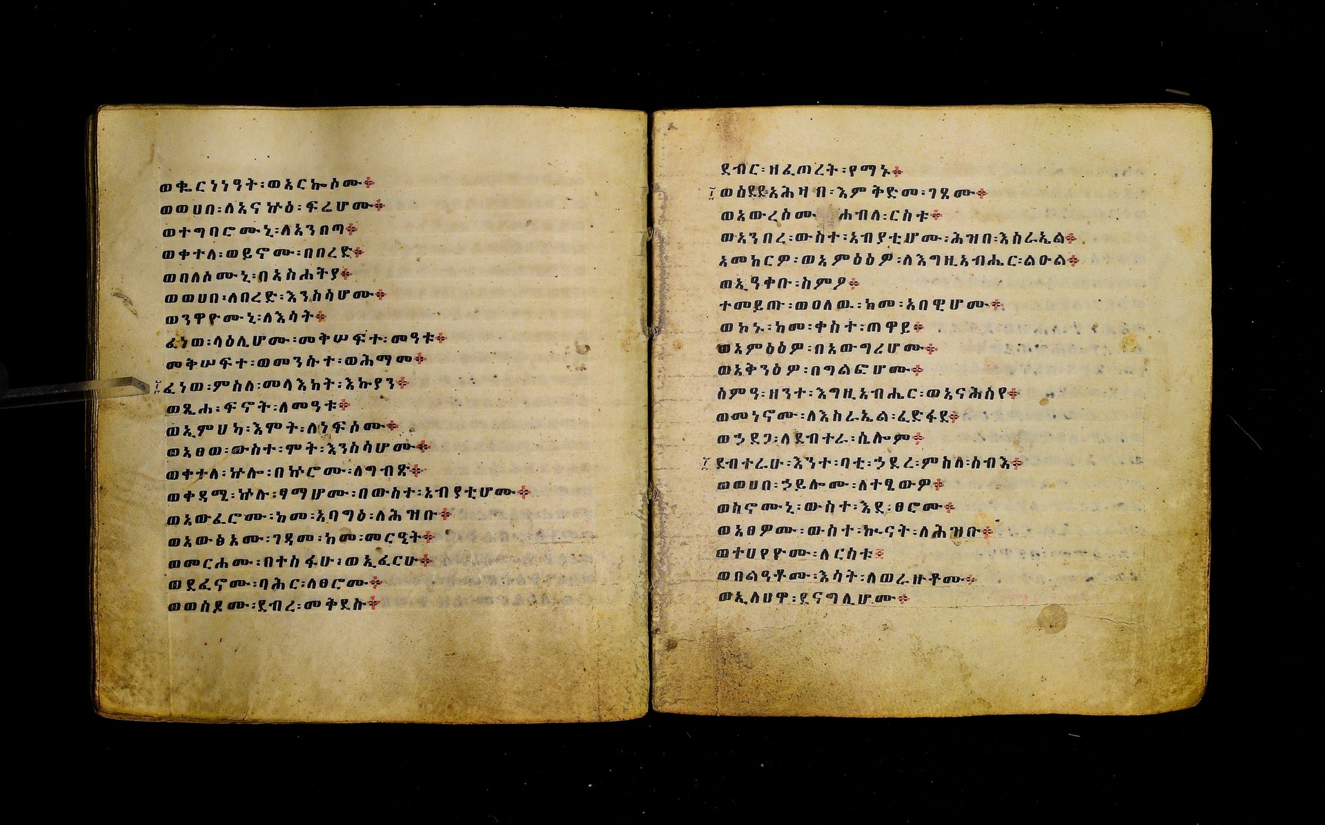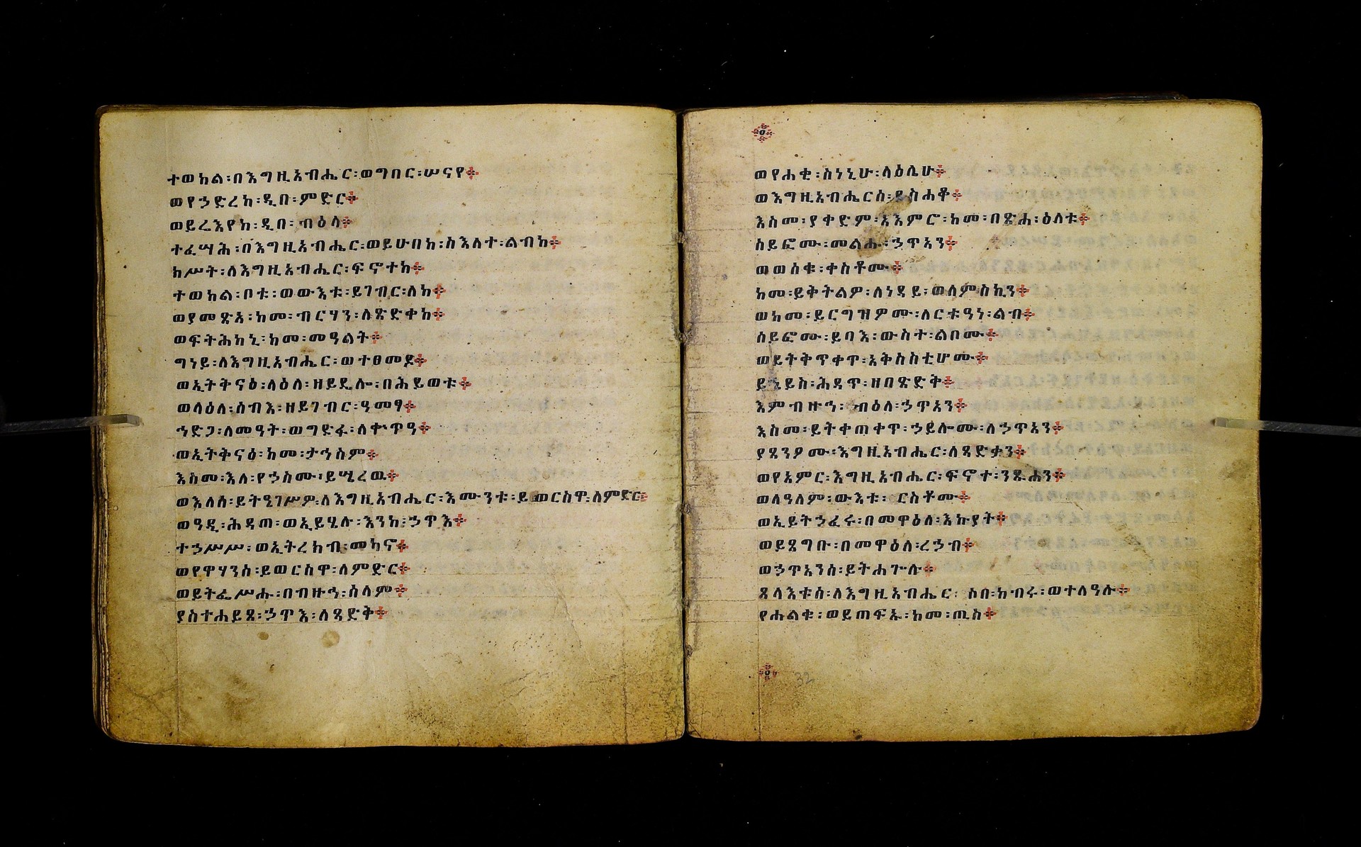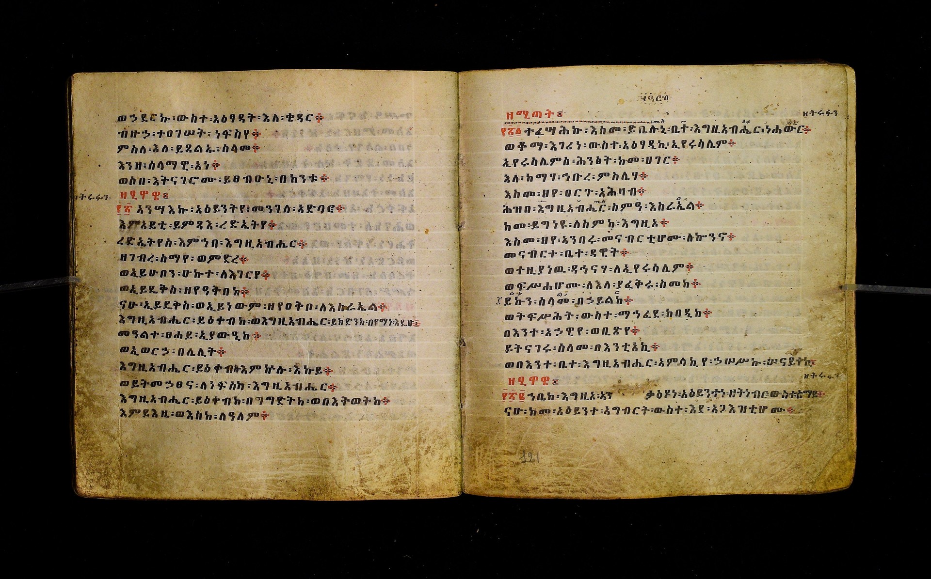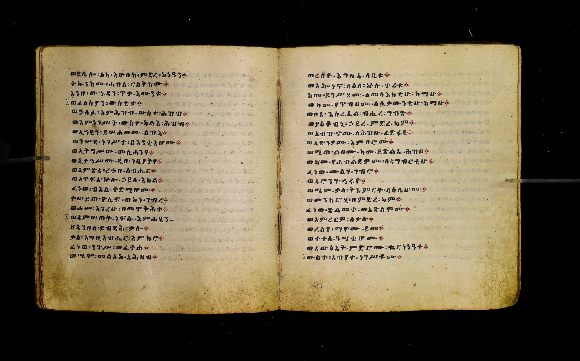 1. F. 2ra–vb: prayer to God, written on two columns in a fine handwriting. Incipit: እገይስ፡ ኀቤከ፡ አምላኪየ፡ አንተ፡ ኩነኒ፡ ረዳእየ፡ ወኩነኒ፡ ምስካይየ። ፀወንየ፡ ወኃይልየ፡ መድኃኒተ፡ ነፍስየ፡ አምላኪየ፡ ወኪያከ፡ ተወከልኩ። ኪያከ፡ ተወከልኩ፡ ኀቤከ፡ ተማኅፀንኩ፡ ኢትግድፈኒ፡ ለዝሉፉ፡ ወኢትርስአኒ፡ በምሕረትከ።. The names of Wäldä Iyäsus e Kidanä Mar[yam] are mentioned on f. 2vb. 2. F. 11r: short mäwaśǝʾt-hymn: ተፈሣሕኩ፡እስመ፡ ይቤሉኒ፡ ቤተ፡ ቤተ፡ እግዚአብሔር፡ ነሐውር። ሶበ፡ ይነቅህ፡ ካህን፡ ተከሥተ፡ ብርሃን፡ ለዓለም፡ ወተቀደሰት፡ ቤተ፡ ክርስቲያን፡ በክ፡ ወበስብሐት፡. The hymn is separated from the main text by a black vertical line and is provided with interlineal musical notation. 3. F. 163va–b: hymn entitled Mäḥaränä ab, “The Father had mercy on us”. The hymn is written in a small script and is provided with interlineal musical notation. Incipit: መሐረነ፡ አብ፡ ሃሌ፡ ሉያ፡ ተሣሃለነ፡ ወልድ፡ ሃሌ፡ ሉያ፡ መንፈስ፡ ቅዱስ፡ መሐሪ፡ ተዘከረነ፡ በሣህልከ። ለከ፡ ንፌኑ፡ ስብሐተ፡ ወለከ፡ ነዓርግ፡ አኰቴተ። መሐረነ፡ መሐሪ፡ ኃጢአተነ፡ አስተስሪ። 4. Ff. 178va–179ra: Ethiopian syllabary, written in a recent and untrained hand and followed by a short text in Amharic and Gǝʿǝz, written in the same hand. Incipit: አሊ፡ ጀረ፡ አመተ፡ ጀርጀረ፡ ነጋሢ፡ ምኒልክ፡ ቍርቍራ፡ ስመ፡ ጥርስ፡ አጥርሲ፡ አንበሳ፡ ጋማማ፡ ነምር፡ ጥፍራማ፡ ጅብ፡ ደደሳማ. |