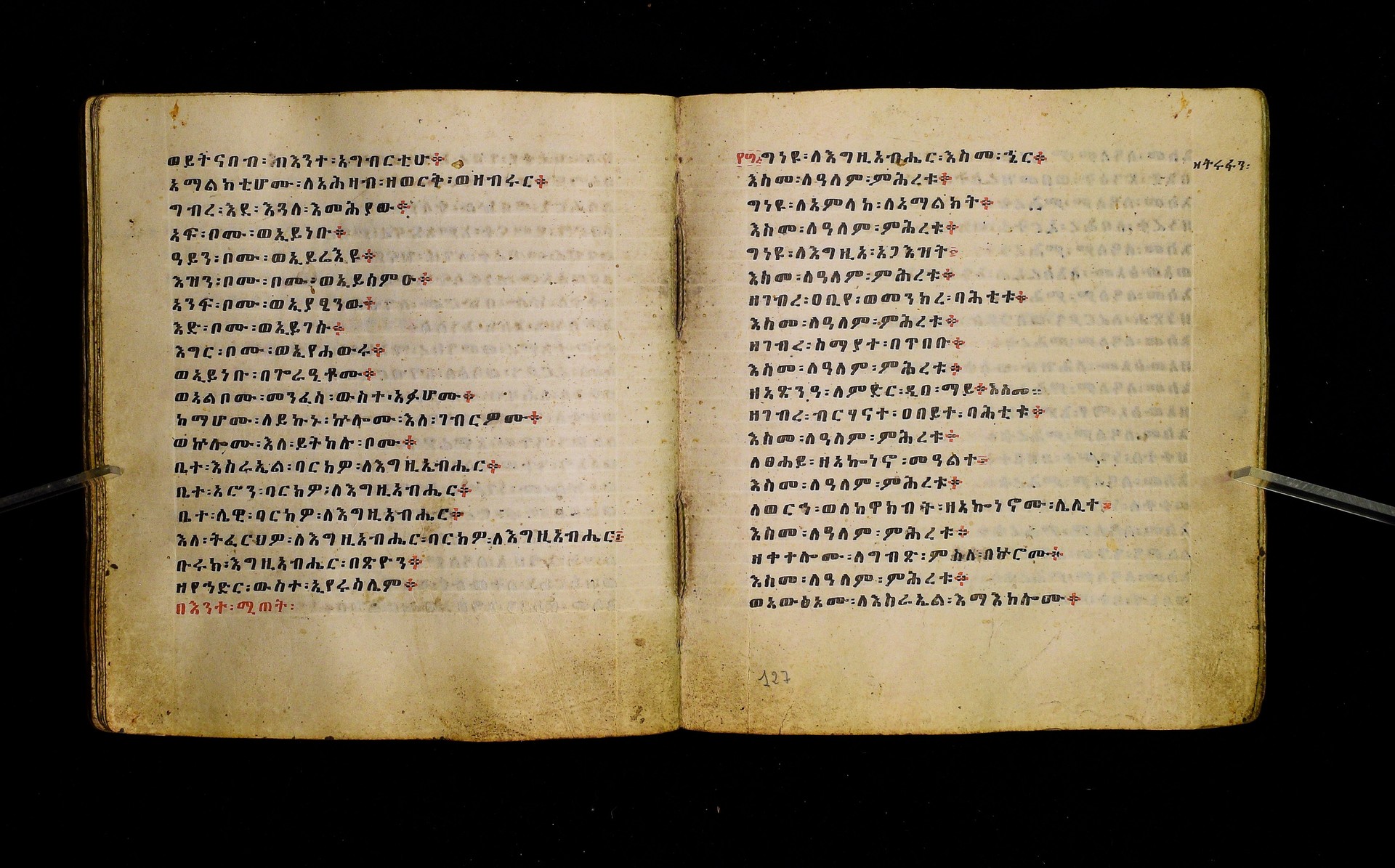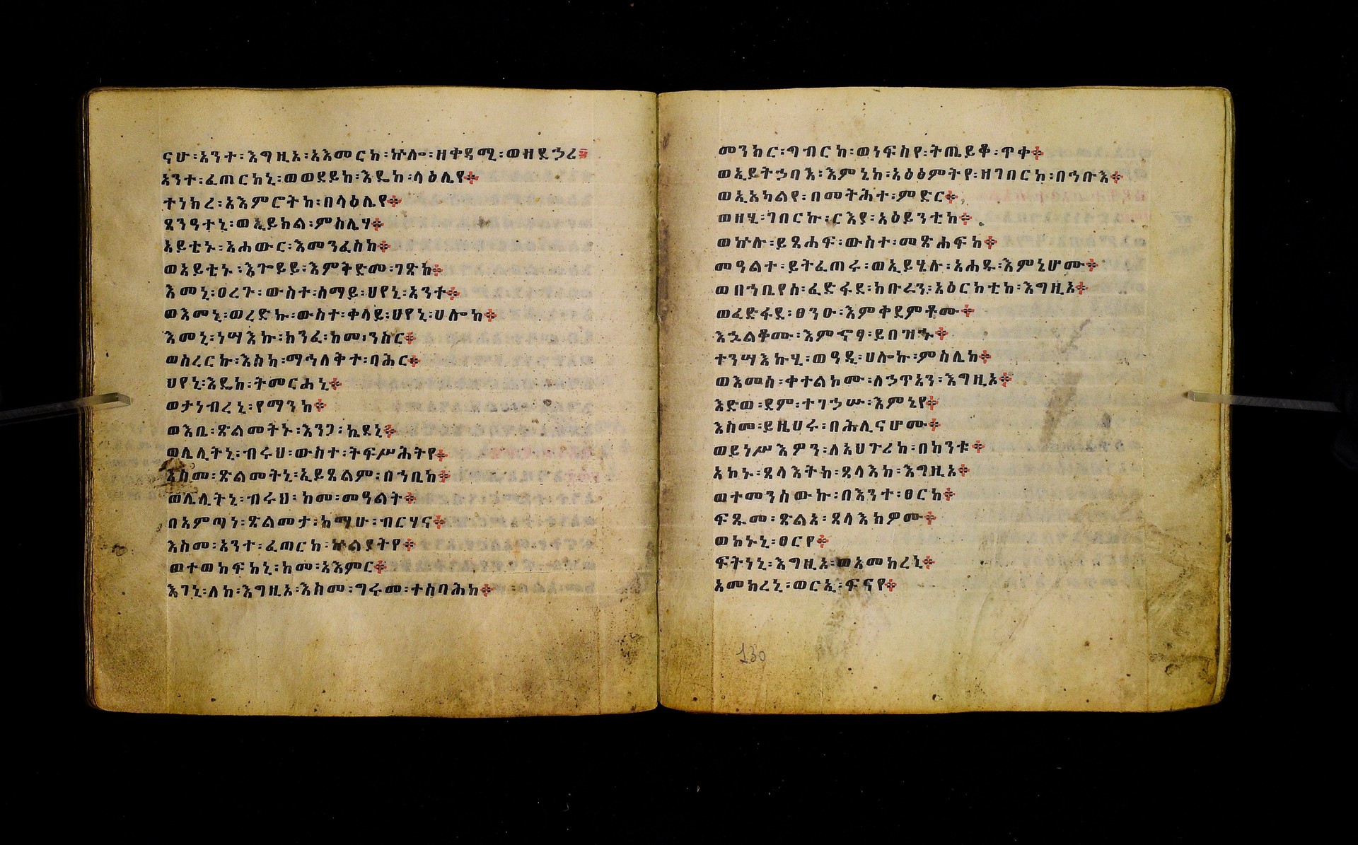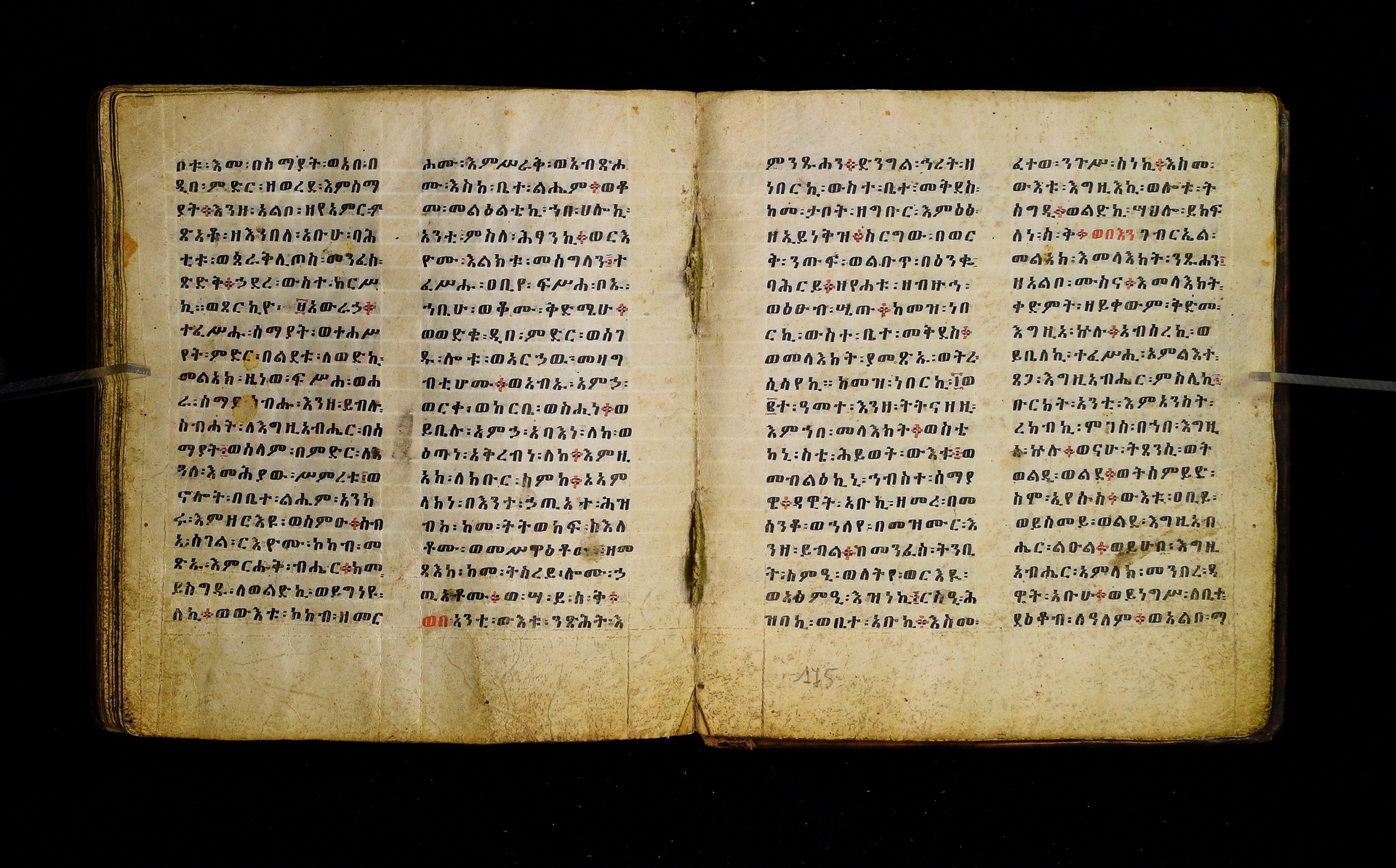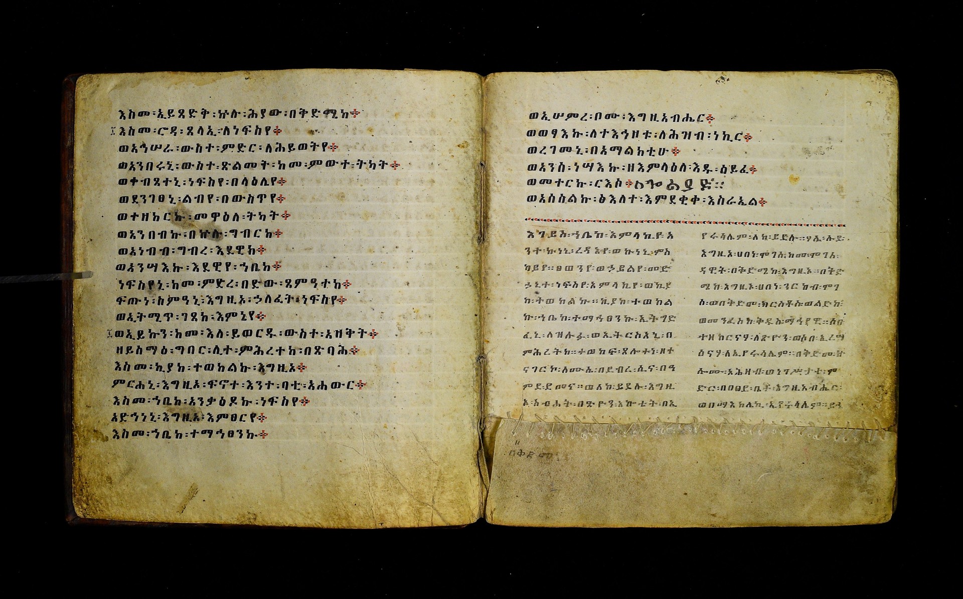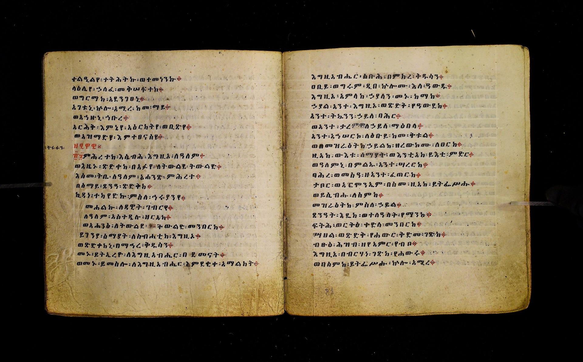 1. F. 2ra–vb: prayer to God, written on two columns in a fine handwriting. Incipit: እገይስ፡ ኀቤከ፡ አምላኪየ፡ አንተ፡ ኩነኒ፡ ረዳእየ፡ ወኩነኒ፡ ምስካይየ። ፀወንየ፡ ወኃይልየ፡ መድኃኒተ፡ ነፍስየ፡ አምላኪየ፡ ወኪያከ፡ ተወከልኩ። ኪያከ፡ ተወከልኩ፡ ኀቤከ፡ ተማኅፀንኩ፡ ኢትግድፈኒ፡ ለዝሉፉ፡ ወኢትርስአኒ፡ በምሕረትከ።. The names of Wäldä Iyäsus e Kidanä Mar[yam] are mentioned on f. 2vb. 2. F. 11r: short mäwaśǝʾt-hymn: ተፈሣሕኩ፡እስመ፡ ይቤሉኒ፡ ቤተ፡ ቤተ፡ እግዚአብሔር፡ ነሐውር። ሶበ፡ ይነቅህ፡ ካህን፡ ተከሥተ፡ ብርሃን፡ ለዓለም፡ ወተቀደሰት፡ ቤተ፡ ክርስቲያን፡ በክ፡ ወበስብሐት፡. The hymn is separated from the main text by a black vertical line and is provided with interlineal musical notation. 3. F. 163va–b: hymn entitled Mäḥaränä ab, “The Father had mercy on us”. The hymn is written in a small script and is provided with interlineal musical notation. Incipit: መሐረነ፡ አብ፡ ሃሌ፡ ሉያ፡ ተሣሃለነ፡ ወልድ፡ ሃሌ፡ ሉያ፡ መንፈስ፡ ቅዱስ፡ መሐሪ፡ ተዘከረነ፡ በሣህልከ። ለከ፡ ንፌኑ፡ ስብሐተ፡ ወለከ፡ ነዓርግ፡ አኰቴተ። መሐረነ፡ መሐሪ፡ ኃጢአተነ፡ አስተስሪ። 4. Ff. 178va–179ra: Ethiopian syllabary, written in a recent and untrained hand and followed by a short text in Amharic and Gǝʿǝz, written in the same hand. Incipit: አሊ፡ ጀረ፡ አመተ፡ ጀርጀረ፡ ነጋሢ፡ ምኒልክ፡ ቍርቍራ፡ ስመ፡ ጥርስ፡ አጥርሲ፡ አንበሳ፡ ጋማማ፡ ነምር፡ ጥፍራማ፡ ጅብ፡ ደደሳማ. |