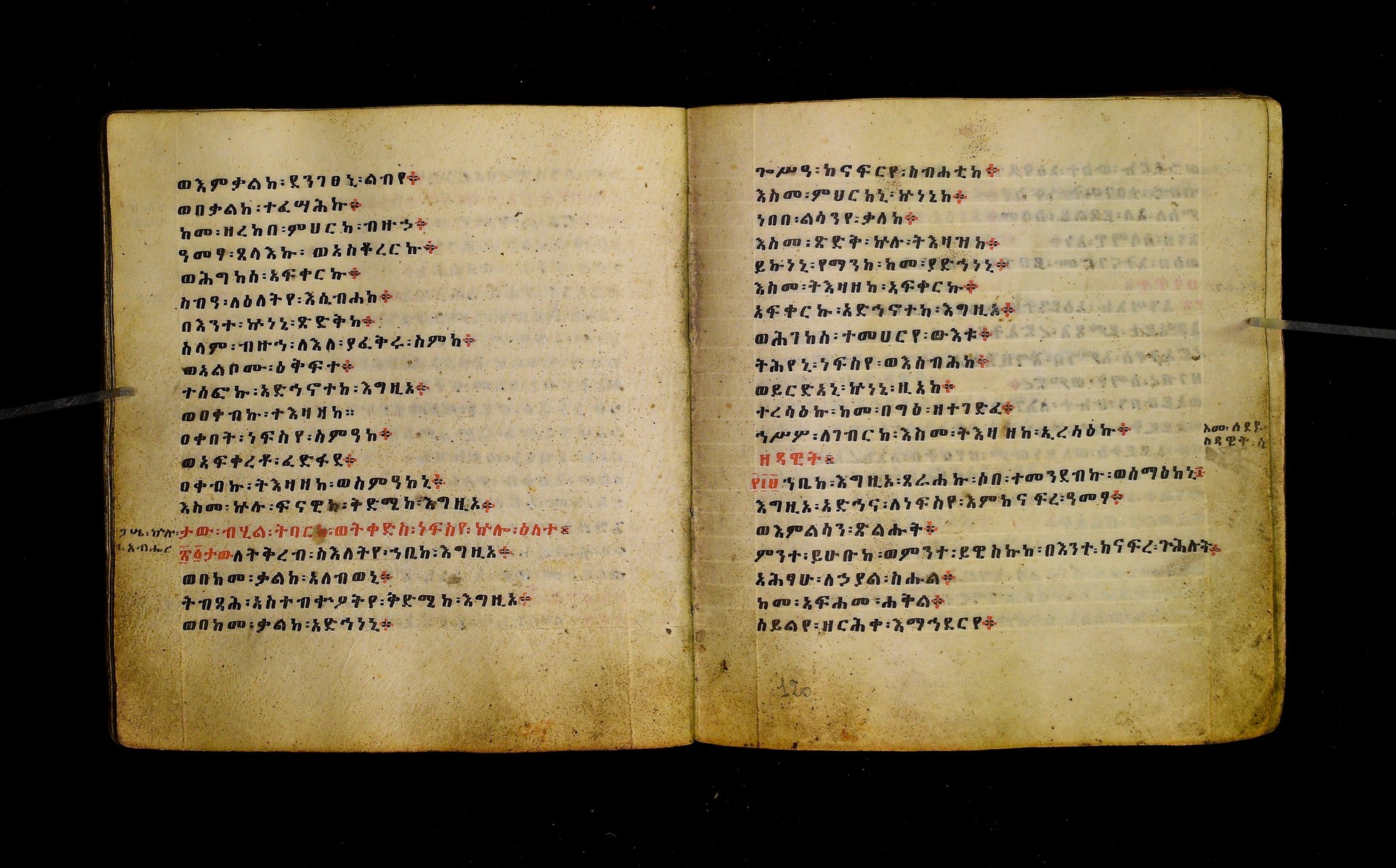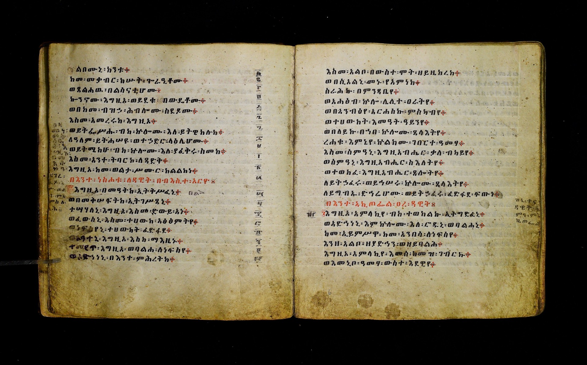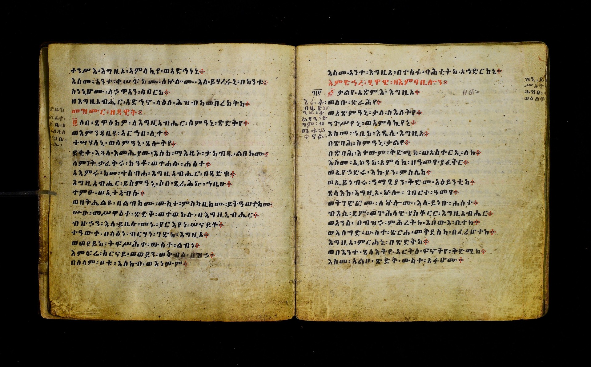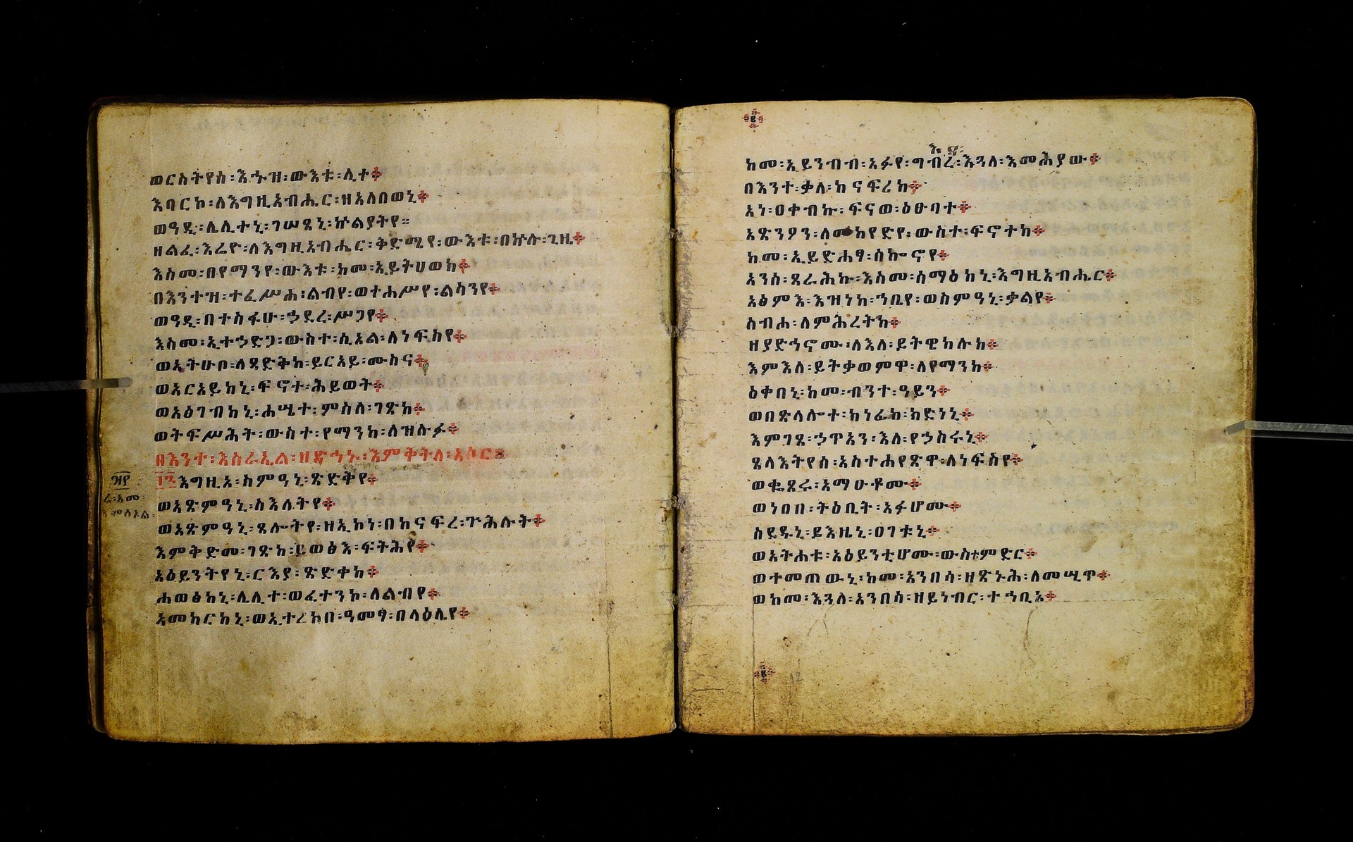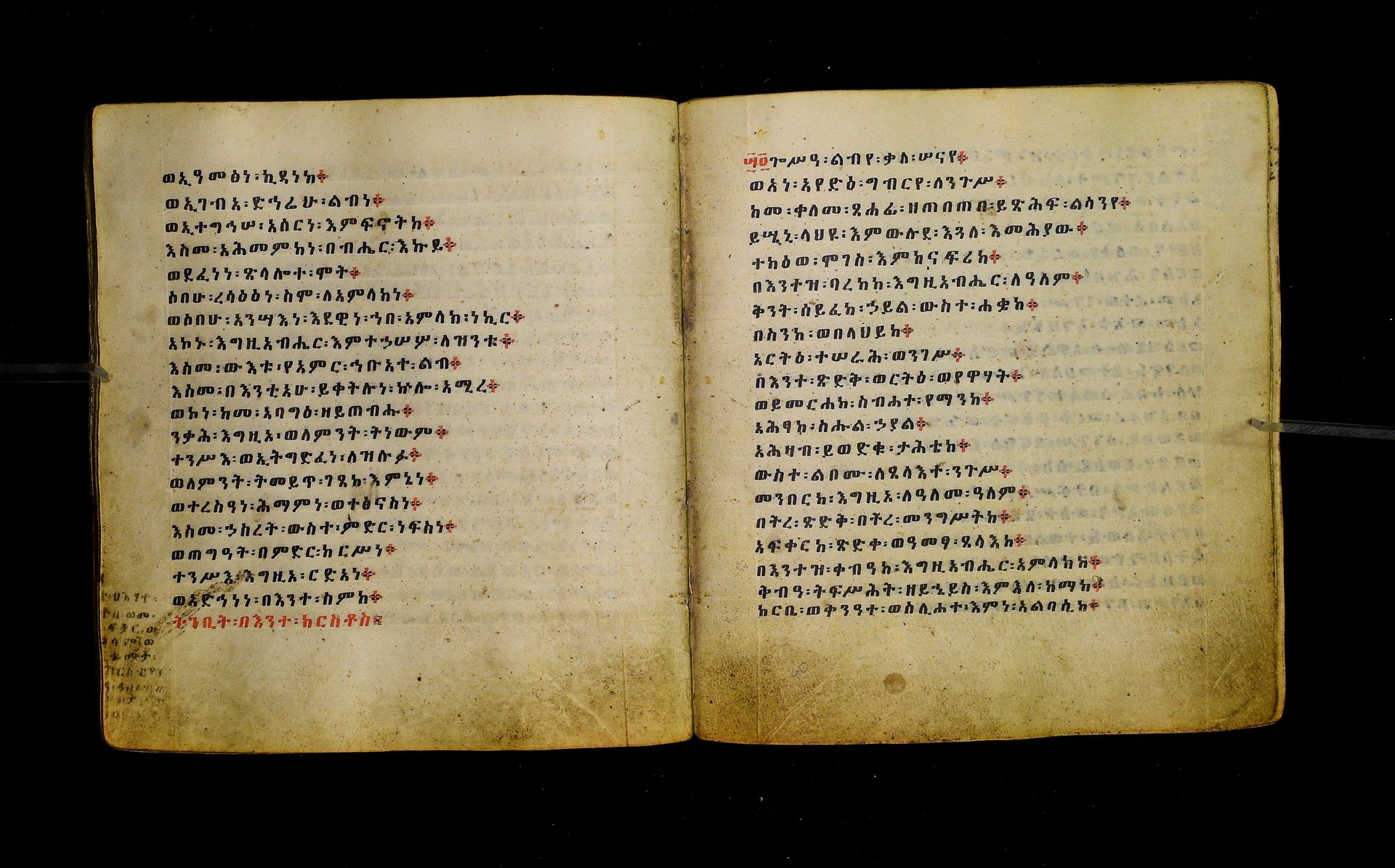 1. F. 2ra–vb: prayer to God, written on two columns in a fine handwriting. Incipit: እገይስ፡ ኀቤከ፡ አምላኪየ፡ አንተ፡ ኩነኒ፡ ረዳእየ፡ ወኩነኒ፡ ምስካይየ። ፀወንየ፡ ወኃይልየ፡ መድኃኒተ፡ ነፍስየ፡ አምላኪየ፡ ወኪያከ፡ ተወከልኩ። ኪያከ፡ ተወከልኩ፡ ኀቤከ፡ ተማኅፀንኩ፡ ኢትግድፈኒ፡ ለዝሉፉ፡ ወኢትርስአኒ፡ በምሕረትከ።. The names of Wäldä Iyäsus e Kidanä Mar[yam] are mentioned on f. 2vb. 2. F. 11r: short mäwaśǝʾt-hymn: ተፈሣሕኩ፡እስመ፡ ይቤሉኒ፡ ቤተ፡ ቤተ፡ እግዚአብሔር፡ ነሐውር። ሶበ፡ ይነቅህ፡ ካህን፡ ተከሥተ፡ ብርሃን፡ ለዓለም፡ ወተቀደሰት፡ ቤተ፡ ክርስቲያን፡ በክ፡ ወበስብሐት፡. The hymn is separated from the main text by a black vertical line and is provided with interlineal musical notation. 3. F. 163va–b: hymn entitled Mäḥaränä ab, “The Father had mercy on us”. The hymn is written in a small script and is provided with interlineal musical notation. Incipit: መሐረነ፡ አብ፡ ሃሌ፡ ሉያ፡ ተሣሃለነ፡ ወልድ፡ ሃሌ፡ ሉያ፡ መንፈስ፡ ቅዱስ፡ መሐሪ፡ ተዘከረነ፡ በሣህልከ። ለከ፡ ንፌኑ፡ ስብሐተ፡ ወለከ፡ ነዓርግ፡ አኰቴተ። መሐረነ፡ መሐሪ፡ ኃጢአተነ፡ አስተስሪ። 4. Ff. 178va–179ra: Ethiopian syllabary, written in a recent and untrained hand and followed by a short text in Amharic and Gǝʿǝz, written in the same hand. Incipit: አሊ፡ ጀረ፡ አመተ፡ ጀርጀረ፡ ነጋሢ፡ ምኒልክ፡ ቍርቍራ፡ ስመ፡ ጥርስ፡ አጥርሲ፡ አንበሳ፡ ጋማማ፡ ነምር፡ ጥፍራማ፡ ጅብ፡ ደደሳማ. |