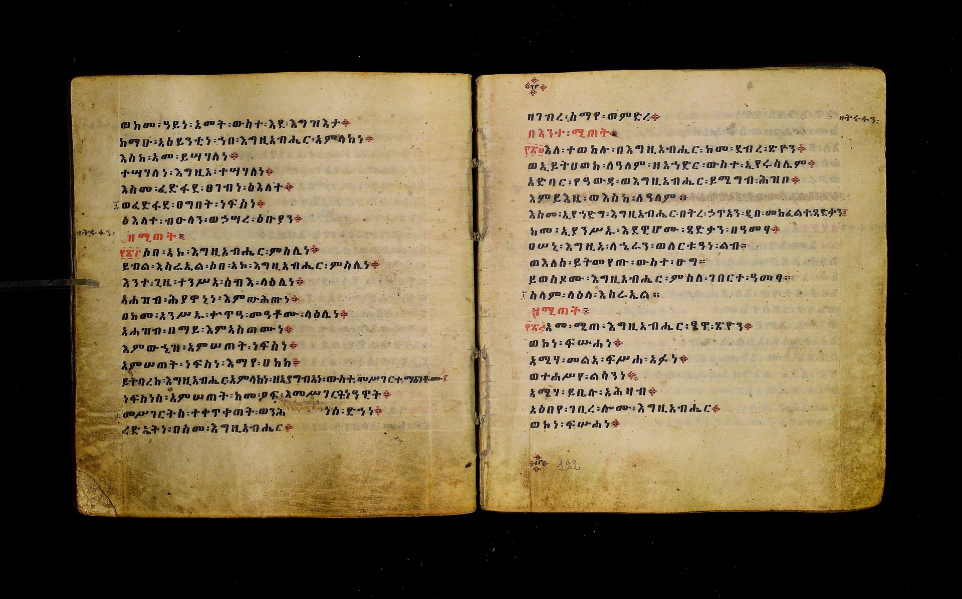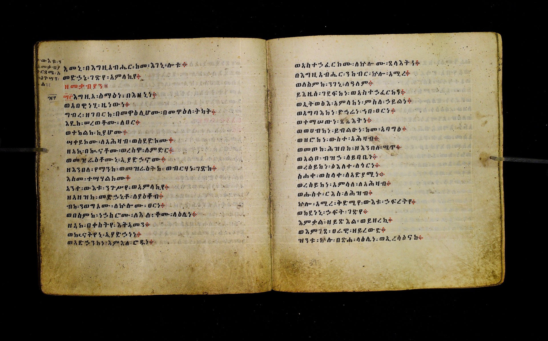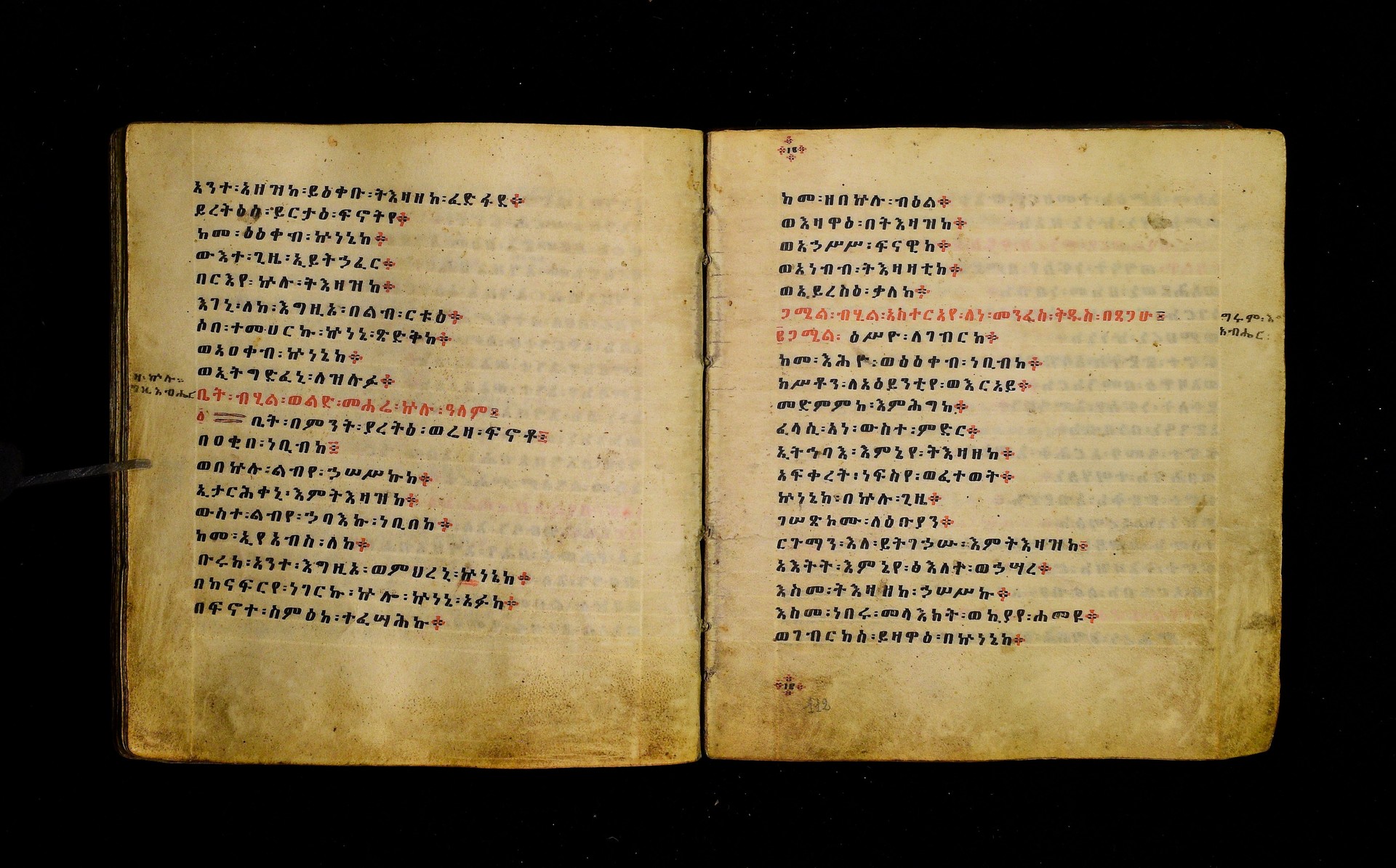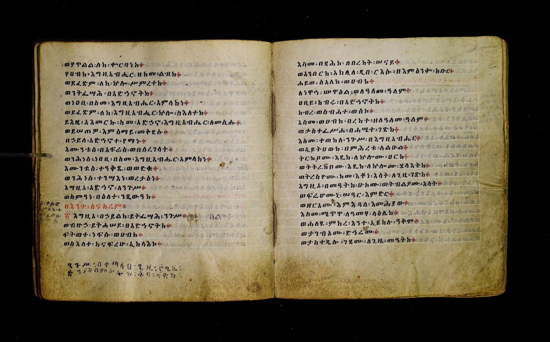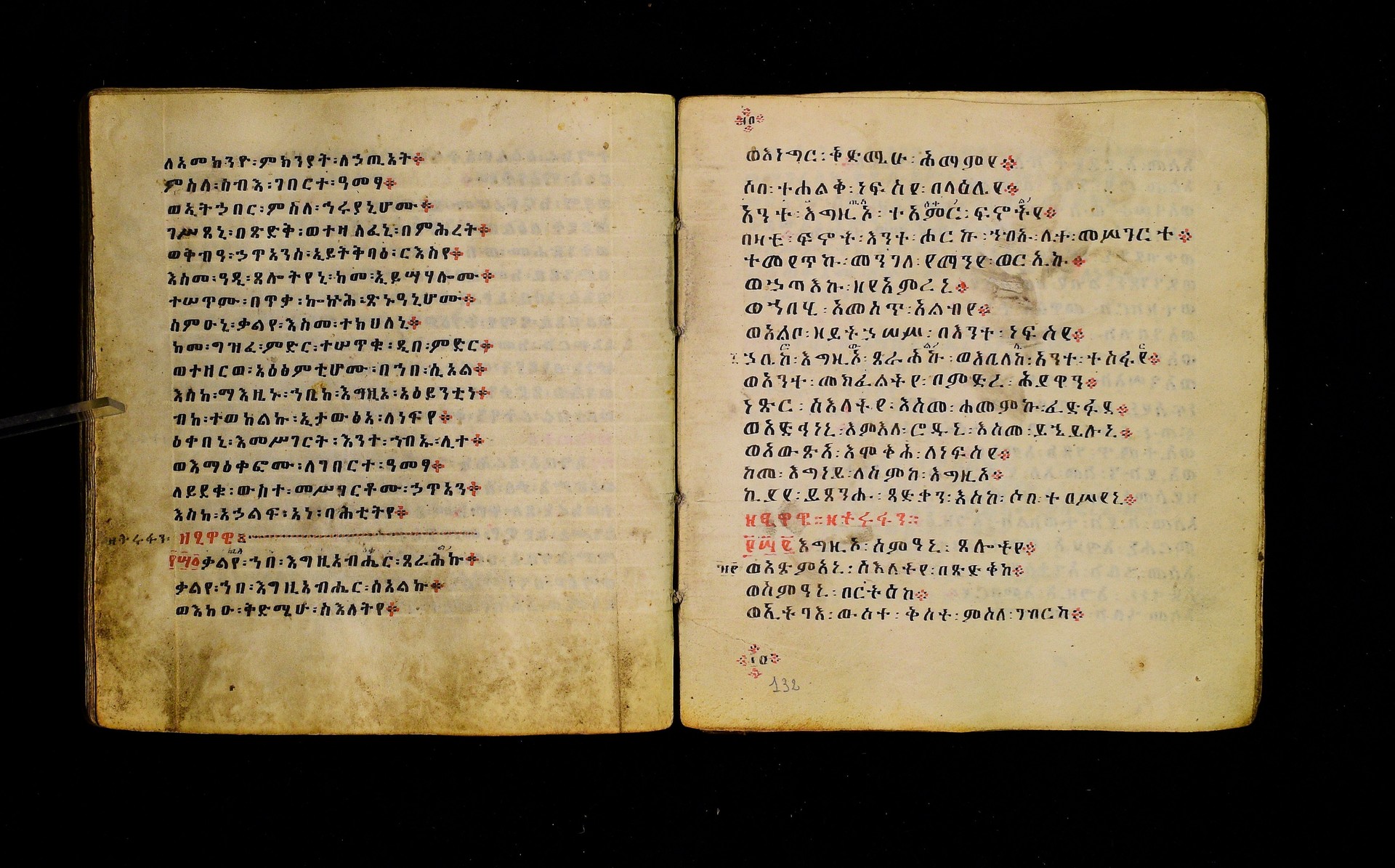 1. F. 2ra–vb: prayer to God, written on two columns in a fine handwriting. Incipit: እገይስ፡ ኀቤከ፡ አምላኪየ፡ አንተ፡ ኩነኒ፡ ረዳእየ፡ ወኩነኒ፡ ምስካይየ። ፀወንየ፡ ወኃይልየ፡ መድኃኒተ፡ ነፍስየ፡ አምላኪየ፡ ወኪያከ፡ ተወከልኩ። ኪያከ፡ ተወከልኩ፡ ኀቤከ፡ ተማኅፀንኩ፡ ኢትግድፈኒ፡ ለዝሉፉ፡ ወኢትርስአኒ፡ በምሕረትከ።. The names of Wäldä Iyäsus e Kidanä Mar[yam] are mentioned on f. 2vb. 2. F. 11r: short mäwaśǝʾt-hymn: ተፈሣሕኩ፡እስመ፡ ይቤሉኒ፡ ቤተ፡ ቤተ፡ እግዚአብሔር፡ ነሐውር። ሶበ፡ ይነቅህ፡ ካህን፡ ተከሥተ፡ ብርሃን፡ ለዓለም፡ ወተቀደሰት፡ ቤተ፡ ክርስቲያን፡ በክ፡ ወበስብሐት፡. The hymn is separated from the main text by a black vertical line and is provided with interlineal musical notation. 3. F. 163va–b: hymn entitled Mäḥaränä ab, “The Father had mercy on us”. The hymn is written in a small script and is provided with interlineal musical notation. Incipit: መሐረነ፡ አብ፡ ሃሌ፡ ሉያ፡ ተሣሃለነ፡ ወልድ፡ ሃሌ፡ ሉያ፡ መንፈስ፡ ቅዱስ፡ መሐሪ፡ ተዘከረነ፡ በሣህልከ። ለከ፡ ንፌኑ፡ ስብሐተ፡ ወለከ፡ ነዓርግ፡ አኰቴተ። መሐረነ፡ መሐሪ፡ ኃጢአተነ፡ አስተስሪ። 4. Ff. 178va–179ra: Ethiopian syllabary, written in a recent and untrained hand and followed by a short text in Amharic and Gǝʿǝz, written in the same hand. Incipit: አሊ፡ ጀረ፡ አመተ፡ ጀርጀረ፡ ነጋሢ፡ ምኒልክ፡ ቍርቍራ፡ ስመ፡ ጥርስ፡ አጥርሲ፡ አንበሳ፡ ጋማማ፡ ነምር፡ ጥፍራማ፡ ጅብ፡ ደደሳማ. |