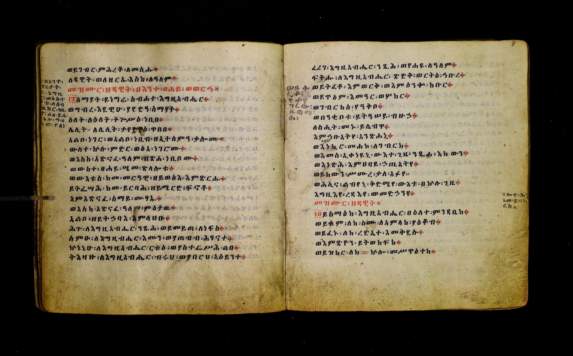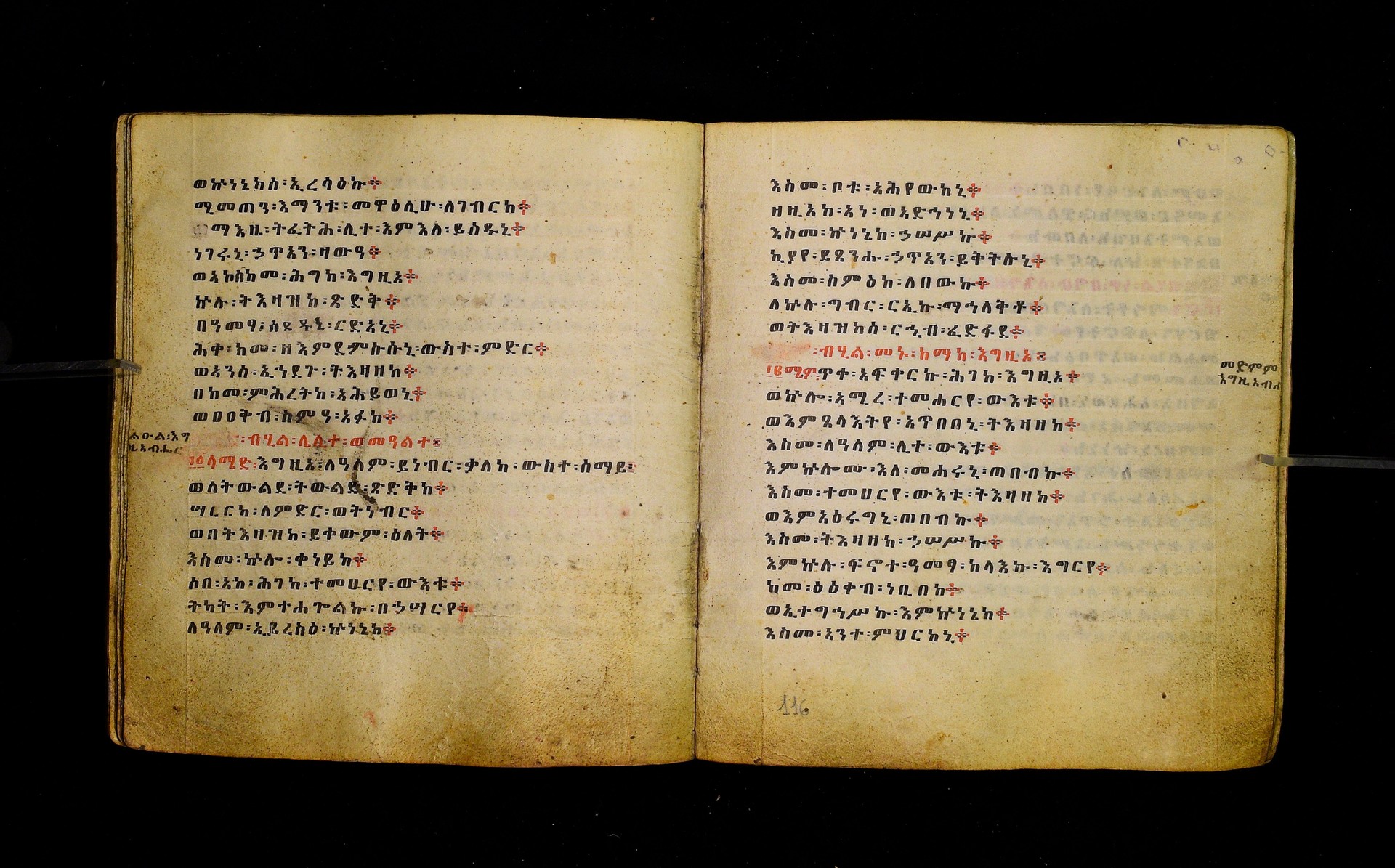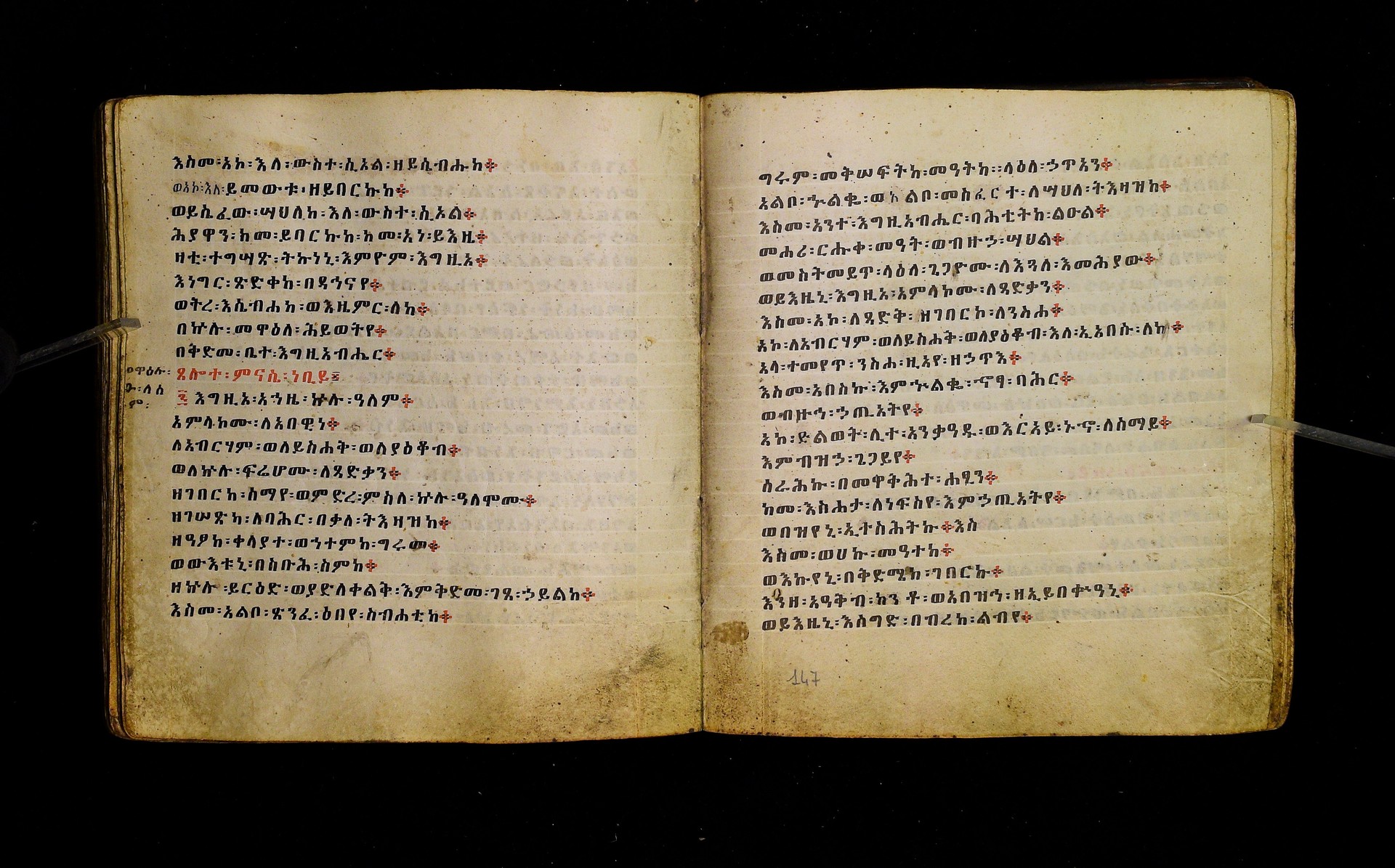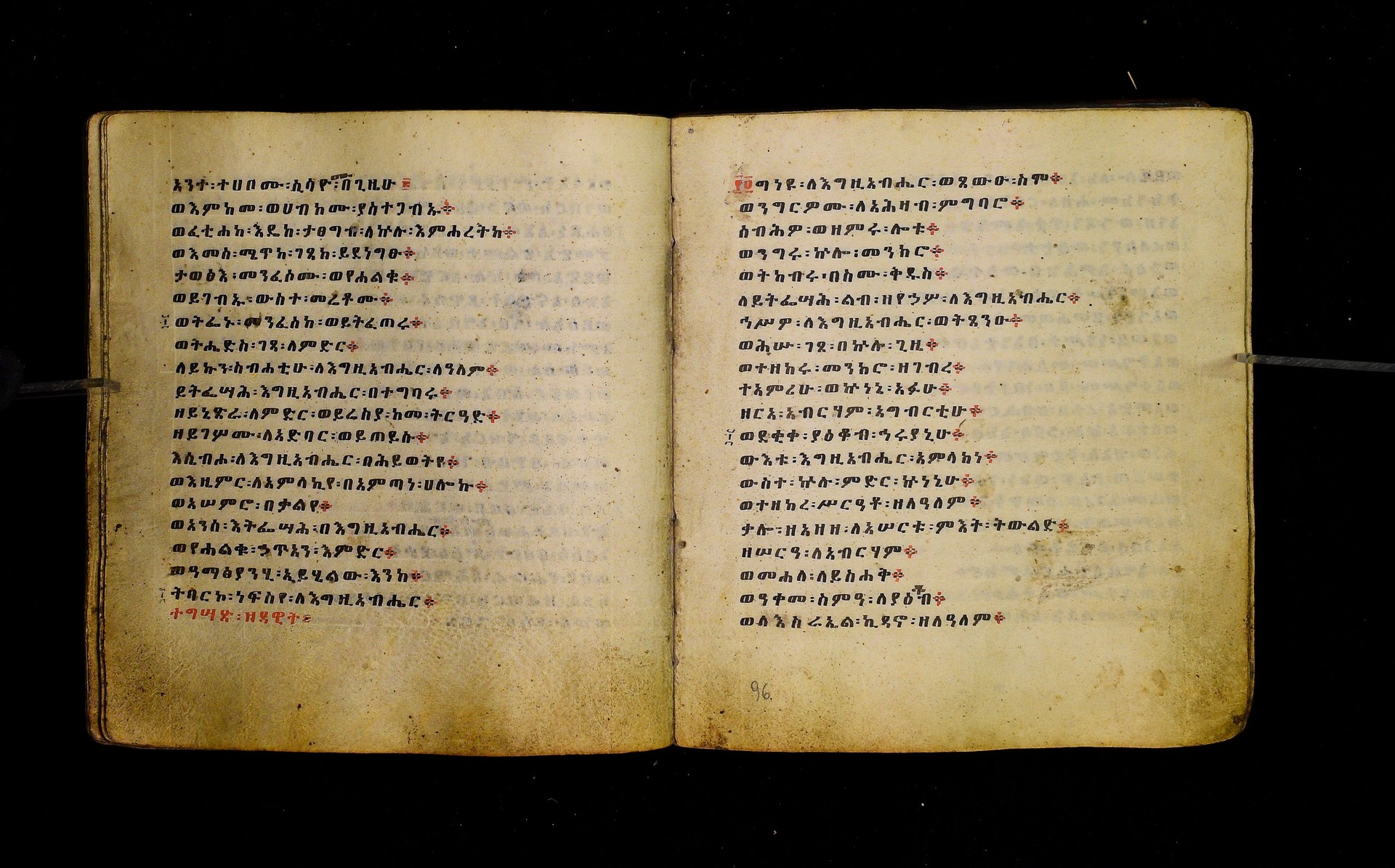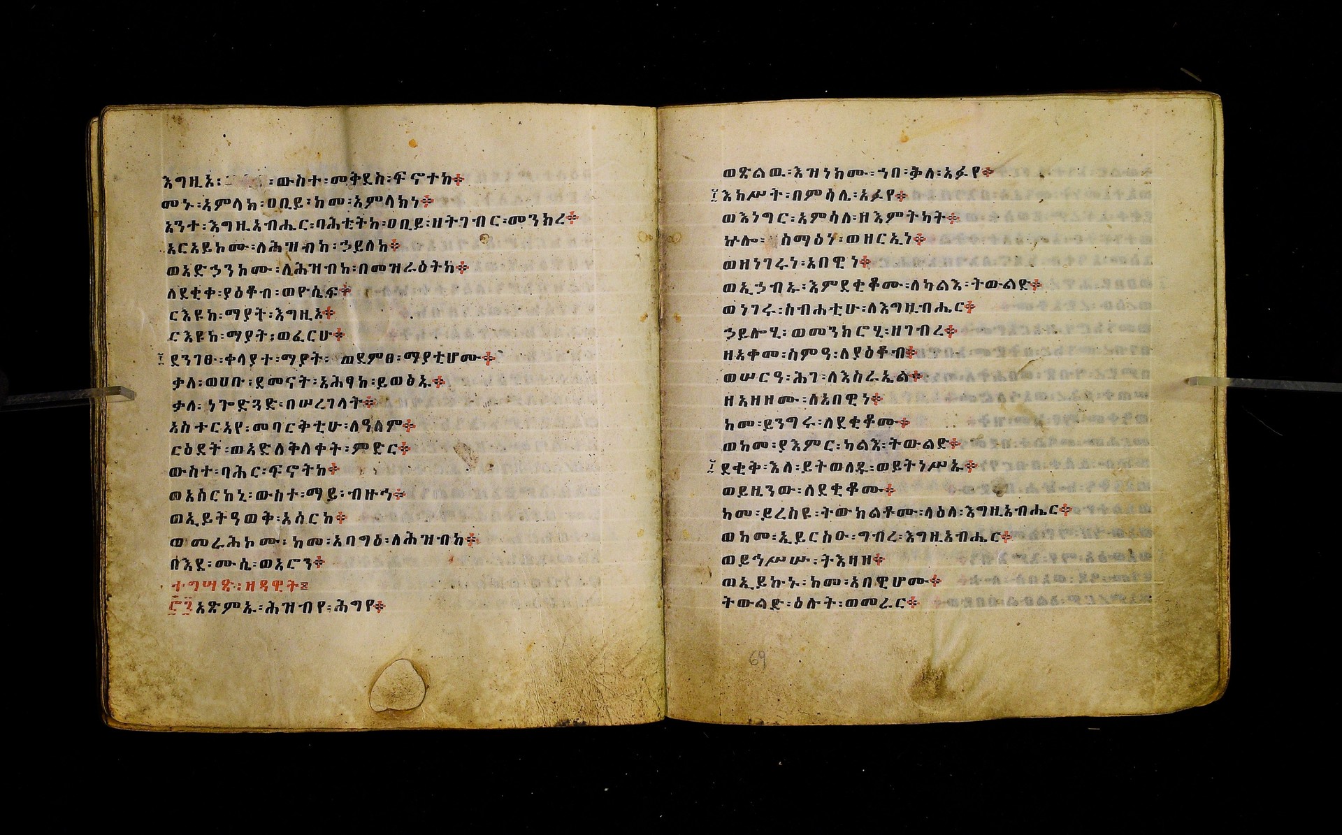 1. F. 2ra–vb: prayer to God, written on two columns in a fine handwriting. Incipit: እገይስ፡ ኀቤከ፡ አምላኪየ፡ አንተ፡ ኩነኒ፡ ረዳእየ፡ ወኩነኒ፡ ምስካይየ። ፀወንየ፡ ወኃይልየ፡ መድኃኒተ፡ ነፍስየ፡ አምላኪየ፡ ወኪያከ፡ ተወከልኩ። ኪያከ፡ ተወከልኩ፡ ኀቤከ፡ ተማኅፀንኩ፡ ኢትግድፈኒ፡ ለዝሉፉ፡ ወኢትርስአኒ፡ በምሕረትከ።. The names of Wäldä Iyäsus e Kidanä Mar[yam] are mentioned on f. 2vb. 2. F. 11r: short mäwaśǝʾt-hymn: ተፈሣሕኩ፡እስመ፡ ይቤሉኒ፡ ቤተ፡ ቤተ፡ እግዚአብሔር፡ ነሐውር። ሶበ፡ ይነቅህ፡ ካህን፡ ተከሥተ፡ ብርሃን፡ ለዓለም፡ ወተቀደሰት፡ ቤተ፡ ክርስቲያን፡ በክ፡ ወበስብሐት፡. The hymn is separated from the main text by a black vertical line and is provided with interlineal musical notation. 3. F. 163va–b: hymn entitled Mäḥaränä ab, “The Father had mercy on us”. The hymn is written in a small script and is provided with interlineal musical notation. Incipit: መሐረነ፡ አብ፡ ሃሌ፡ ሉያ፡ ተሣሃለነ፡ ወልድ፡ ሃሌ፡ ሉያ፡ መንፈስ፡ ቅዱስ፡ መሐሪ፡ ተዘከረነ፡ በሣህልከ። ለከ፡ ንፌኑ፡ ስብሐተ፡ ወለከ፡ ነዓርግ፡ አኰቴተ። መሐረነ፡ መሐሪ፡ ኃጢአተነ፡ አስተስሪ። 4. Ff. 178va–179ra: Ethiopian syllabary, written in a recent and untrained hand and followed by a short text in Amharic and Gǝʿǝz, written in the same hand. Incipit: አሊ፡ ጀረ፡ አመተ፡ ጀርጀረ፡ ነጋሢ፡ ምኒልክ፡ ቍርቍራ፡ ስመ፡ ጥርስ፡ አጥርሲ፡ አንበሳ፡ ጋማማ፡ ነምር፡ ጥፍራማ፡ ጅብ፡ ደደሳማ. |