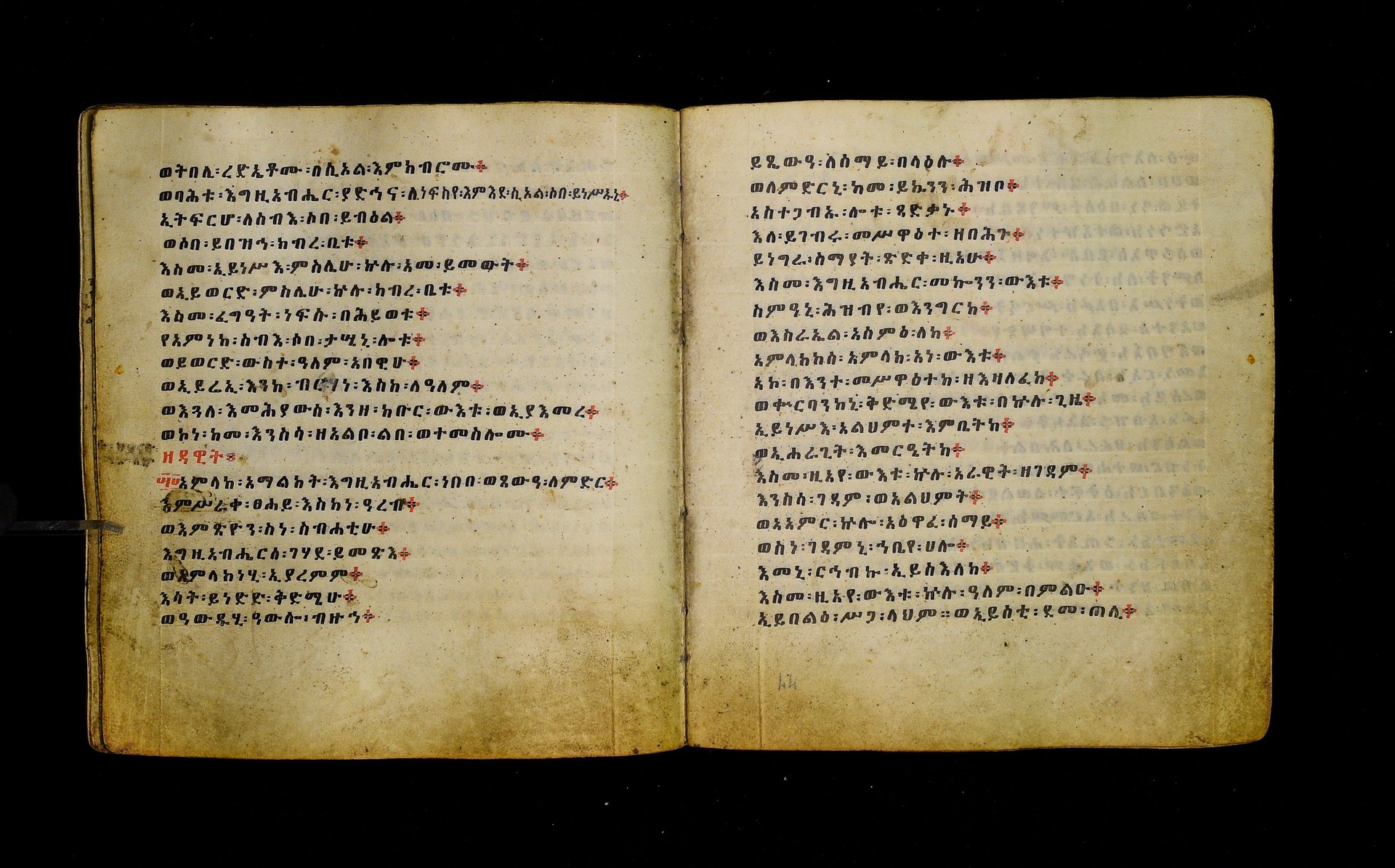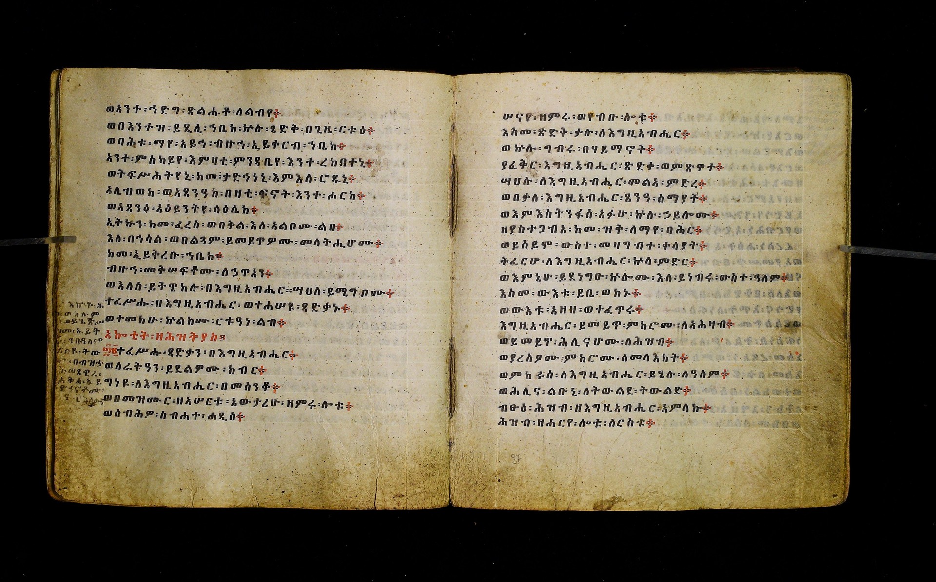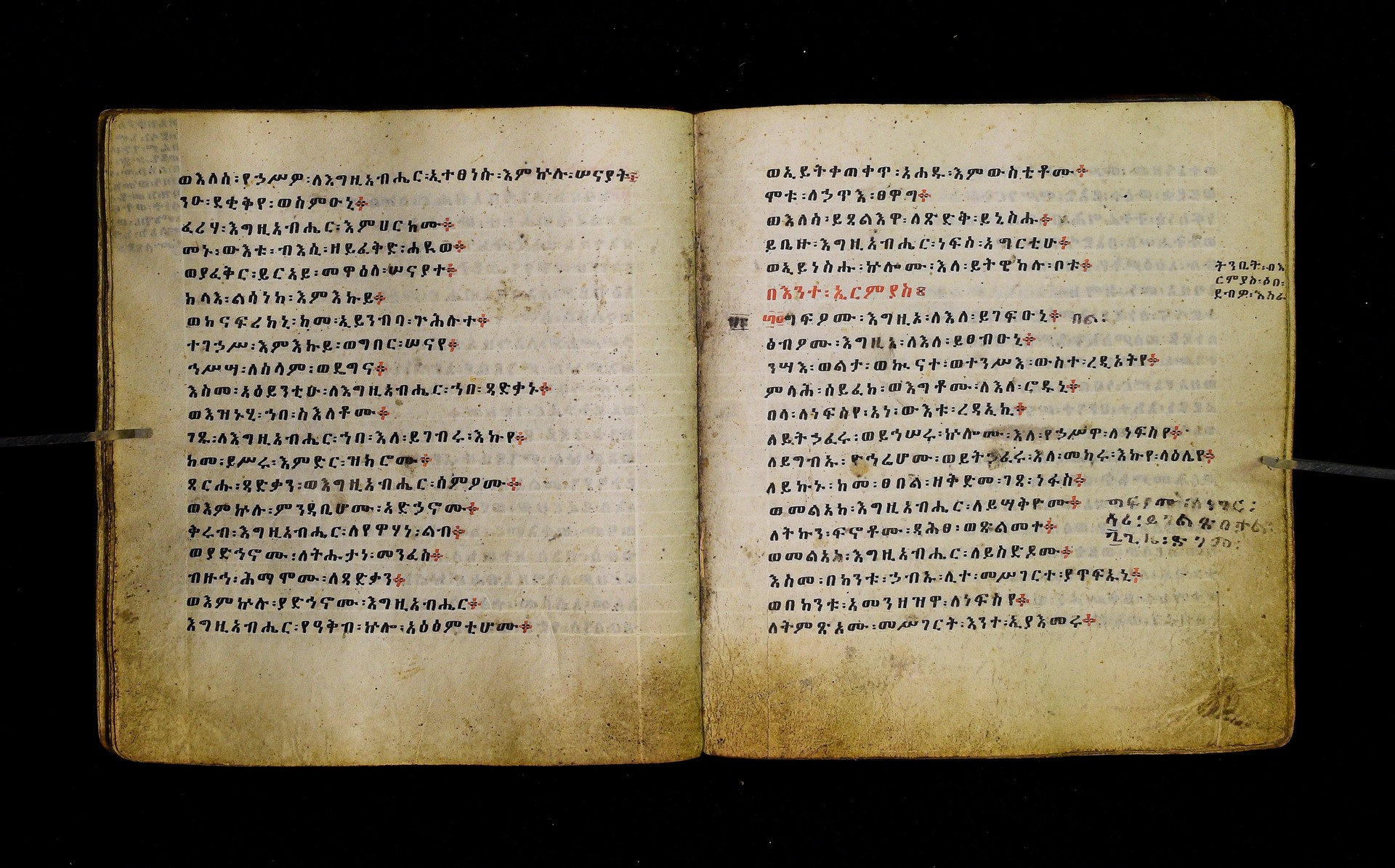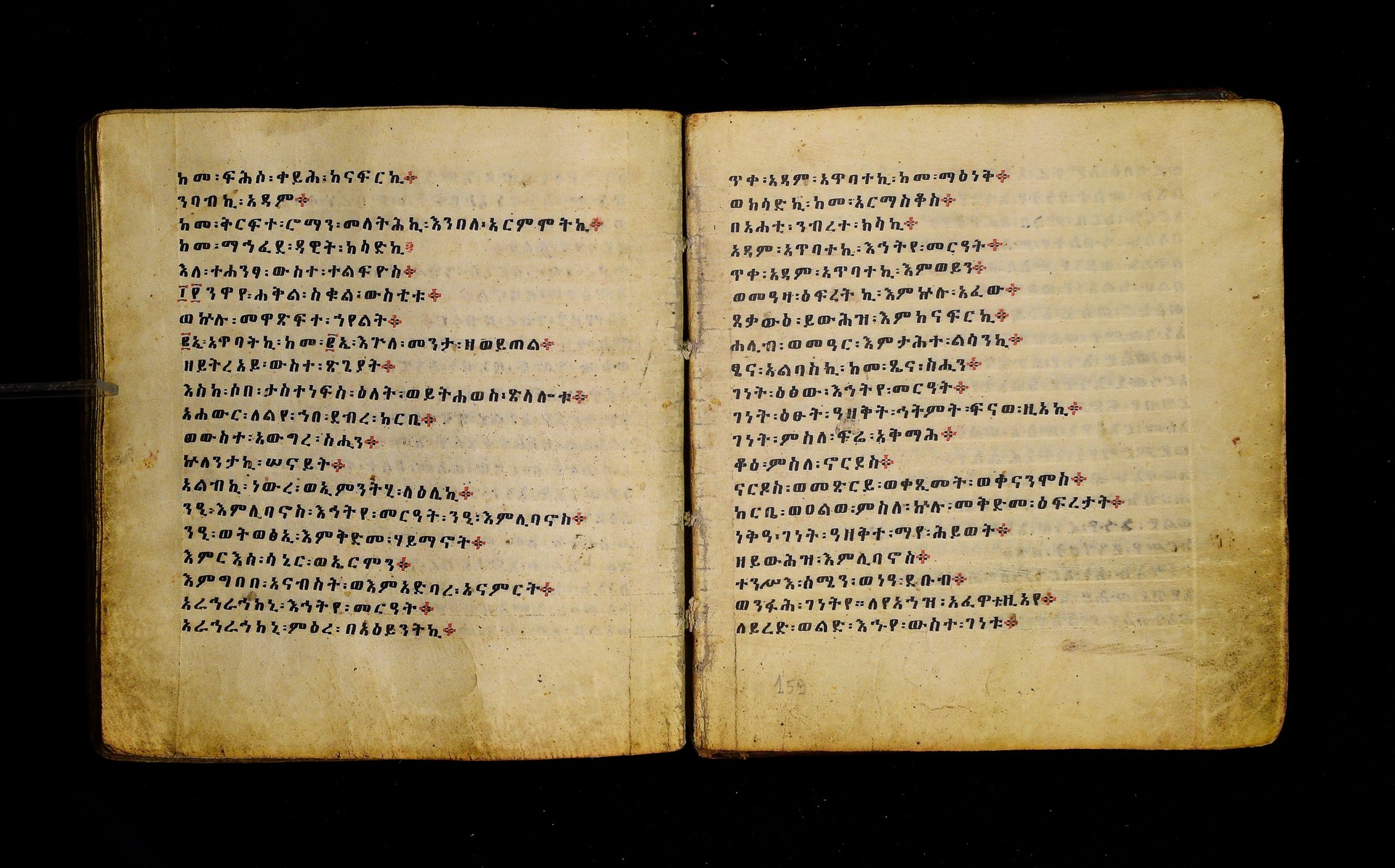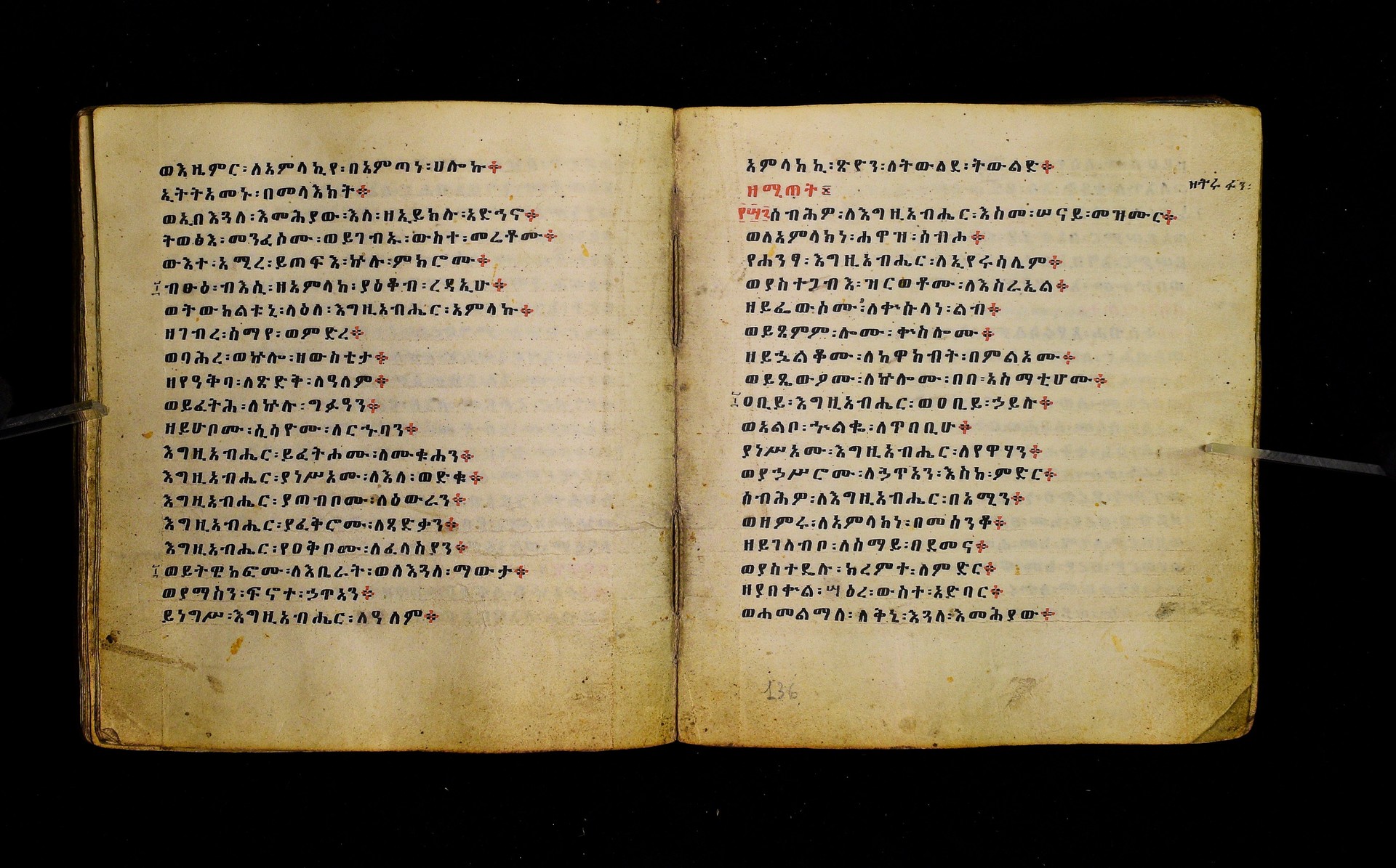 1. F. 2ra–vb: prayer to God, written on two columns in a fine handwriting. Incipit: እገይስ፡ ኀቤከ፡ አምላኪየ፡ አንተ፡ ኩነኒ፡ ረዳእየ፡ ወኩነኒ፡ ምስካይየ። ፀወንየ፡ ወኃይልየ፡ መድኃኒተ፡ ነፍስየ፡ አምላኪየ፡ ወኪያከ፡ ተወከልኩ። ኪያከ፡ ተወከልኩ፡ ኀቤከ፡ ተማኅፀንኩ፡ ኢትግድፈኒ፡ ለዝሉፉ፡ ወኢትርስአኒ፡ በምሕረትከ።. The names of Wäldä Iyäsus e Kidanä Mar[yam] are mentioned on f. 2vb. 2. F. 11r: short mäwaśǝʾt-hymn: ተፈሣሕኩ፡እስመ፡ ይቤሉኒ፡ ቤተ፡ ቤተ፡ እግዚአብሔር፡ ነሐውር። ሶበ፡ ይነቅህ፡ ካህን፡ ተከሥተ፡ ብርሃን፡ ለዓለም፡ ወተቀደሰት፡ ቤተ፡ ክርስቲያን፡ በክ፡ ወበስብሐት፡. The hymn is separated from the main text by a black vertical line and is provided with interlineal musical notation. 3. F. 163va–b: hymn entitled Mäḥaränä ab, “The Father had mercy on us”. The hymn is written in a small script and is provided with interlineal musical notation. Incipit: መሐረነ፡ አብ፡ ሃሌ፡ ሉያ፡ ተሣሃለነ፡ ወልድ፡ ሃሌ፡ ሉያ፡ መንፈስ፡ ቅዱስ፡ መሐሪ፡ ተዘከረነ፡ በሣህልከ። ለከ፡ ንፌኑ፡ ስብሐተ፡ ወለከ፡ ነዓርግ፡ አኰቴተ። መሐረነ፡ መሐሪ፡ ኃጢአተነ፡ አስተስሪ። 4. Ff. 178va–179ra: Ethiopian syllabary, written in a recent and untrained hand and followed by a short text in Amharic and Gǝʿǝz, written in the same hand. Incipit: አሊ፡ ጀረ፡ አመተ፡ ጀርጀረ፡ ነጋሢ፡ ምኒልክ፡ ቍርቍራ፡ ስመ፡ ጥርስ፡ አጥርሲ፡ አንበሳ፡ ጋማማ፡ ነምር፡ ጥፍራማ፡ ጅብ፡ ደደሳማ. |