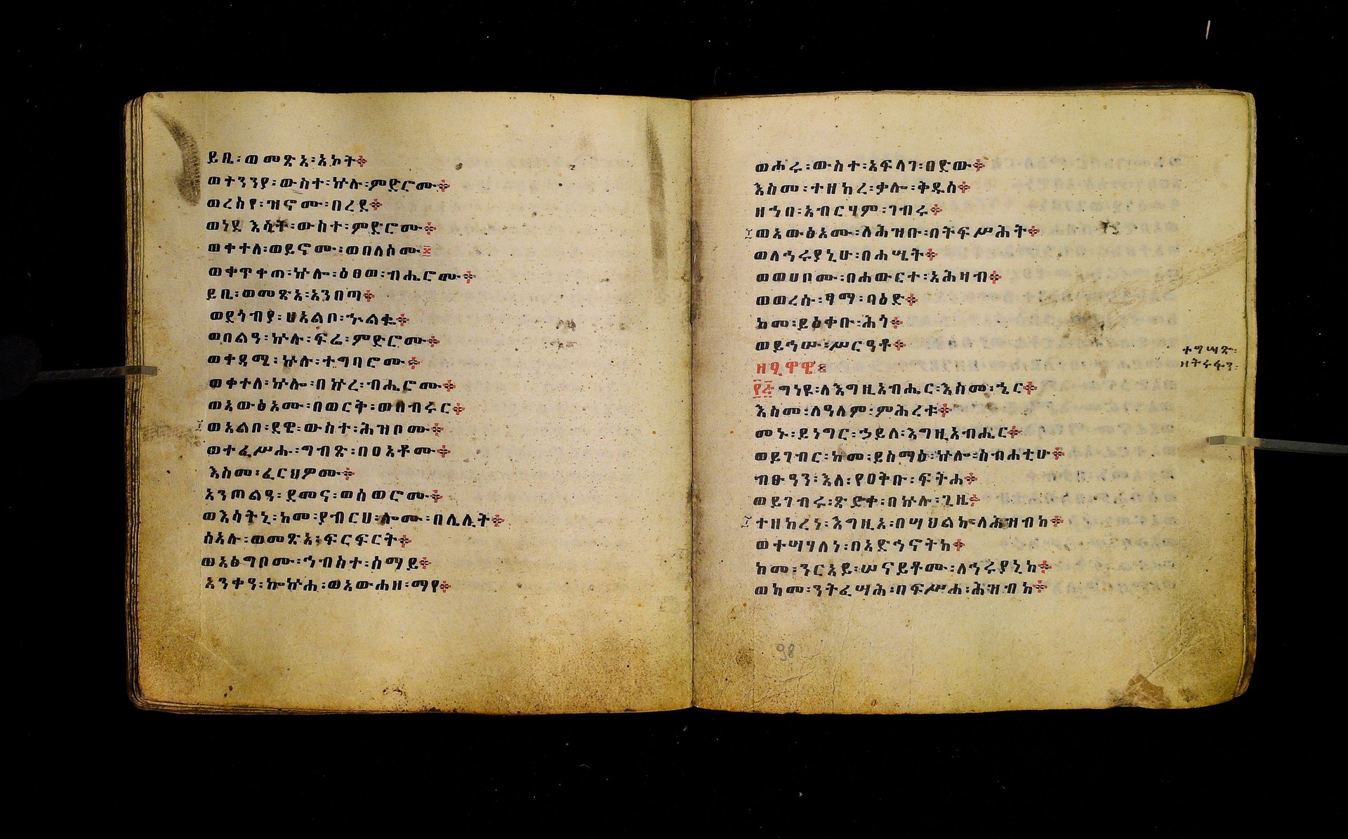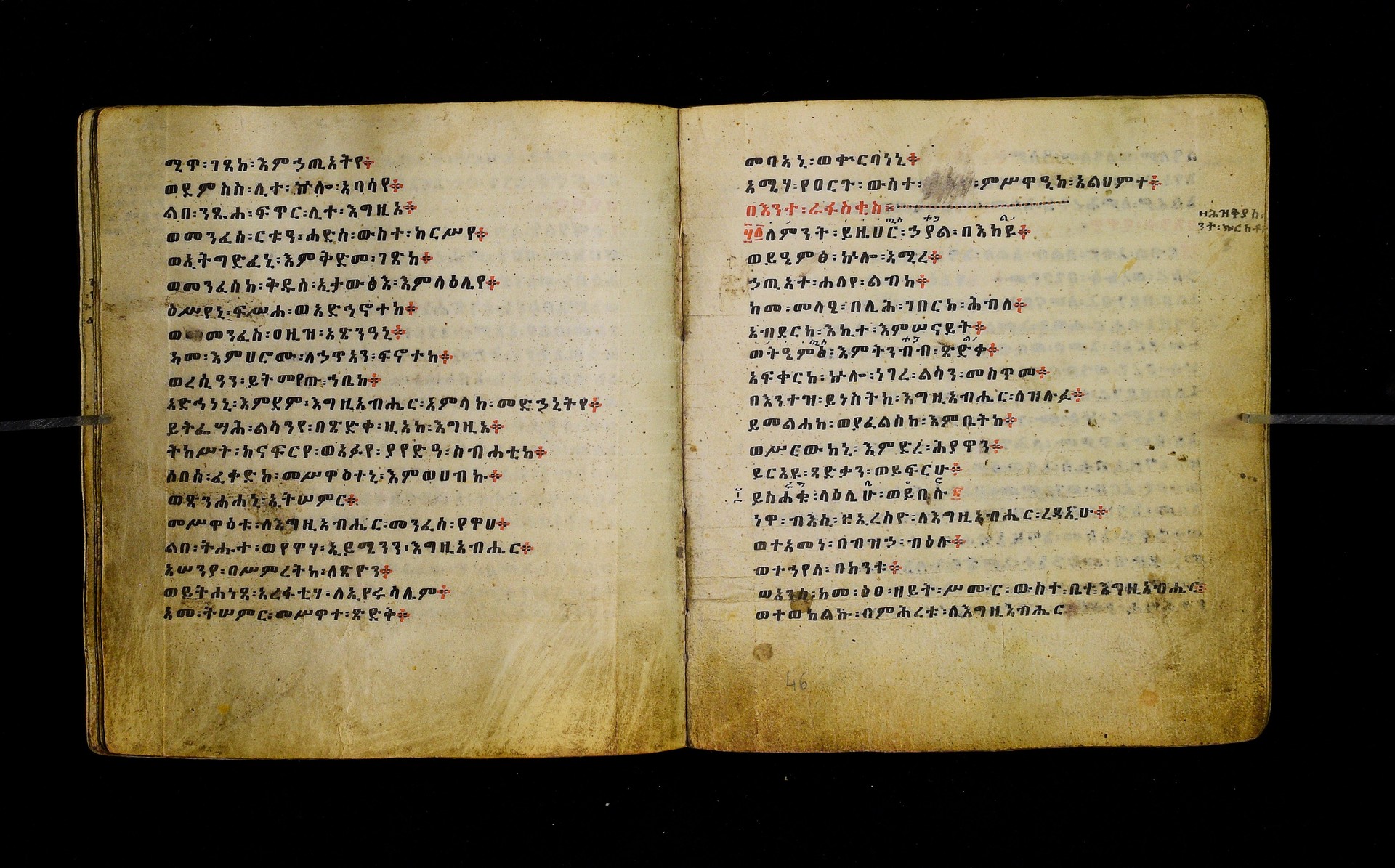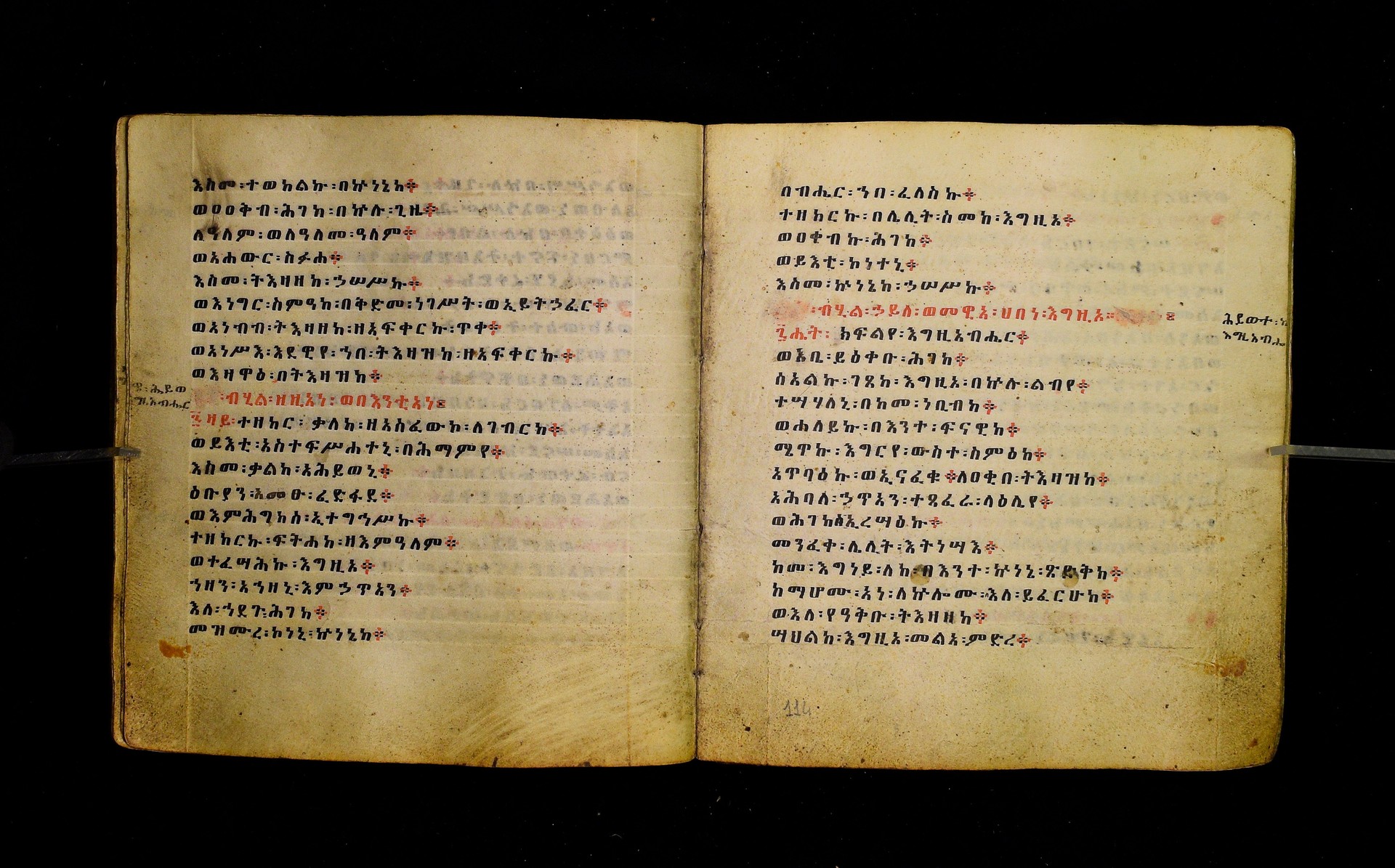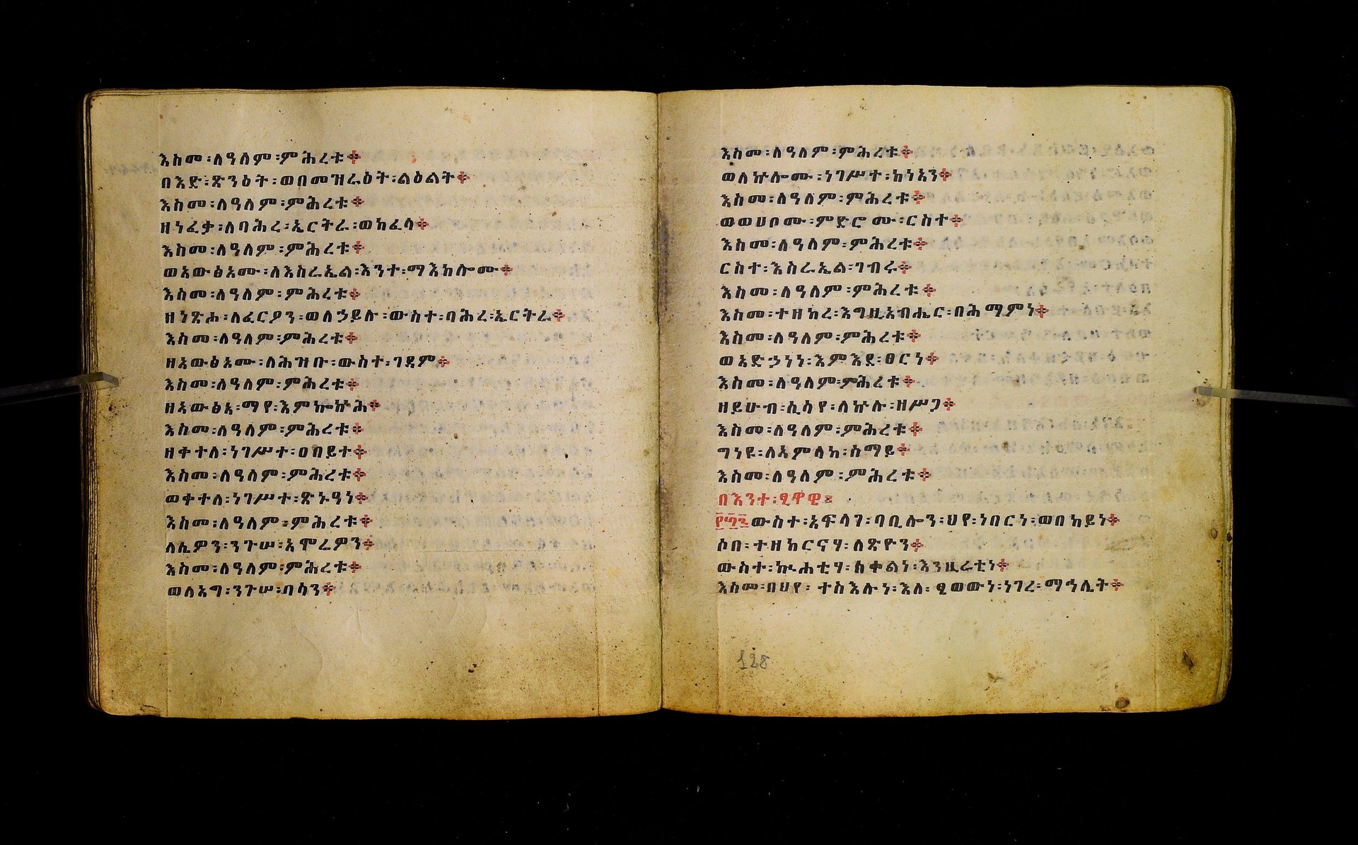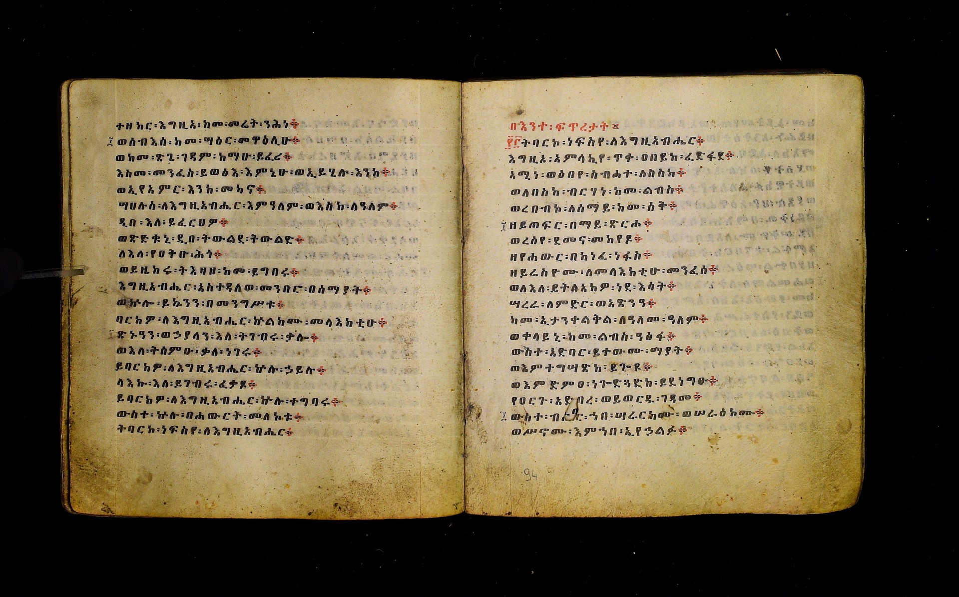 1. F. 2ra–vb: prayer to God, written on two columns in a fine handwriting. Incipit: እገይስ፡ ኀቤከ፡ አምላኪየ፡ አንተ፡ ኩነኒ፡ ረዳእየ፡ ወኩነኒ፡ ምስካይየ። ፀወንየ፡ ወኃይልየ፡ መድኃኒተ፡ ነፍስየ፡ አምላኪየ፡ ወኪያከ፡ ተወከልኩ። ኪያከ፡ ተወከልኩ፡ ኀቤከ፡ ተማኅፀንኩ፡ ኢትግድፈኒ፡ ለዝሉፉ፡ ወኢትርስአኒ፡ በምሕረትከ።. The names of Wäldä Iyäsus e Kidanä Mar[yam] are mentioned on f. 2vb. 2. F. 11r: short mäwaśǝʾt-hymn: ተፈሣሕኩ፡እስመ፡ ይቤሉኒ፡ ቤተ፡ ቤተ፡ እግዚአብሔር፡ ነሐውር። ሶበ፡ ይነቅህ፡ ካህን፡ ተከሥተ፡ ብርሃን፡ ለዓለም፡ ወተቀደሰት፡ ቤተ፡ ክርስቲያን፡ በክ፡ ወበስብሐት፡. The hymn is separated from the main text by a black vertical line and is provided with interlineal musical notation. 3. F. 163va–b: hymn entitled Mäḥaränä ab, “The Father had mercy on us”. The hymn is written in a small script and is provided with interlineal musical notation. Incipit: መሐረነ፡ አብ፡ ሃሌ፡ ሉያ፡ ተሣሃለነ፡ ወልድ፡ ሃሌ፡ ሉያ፡ መንፈስ፡ ቅዱስ፡ መሐሪ፡ ተዘከረነ፡ በሣህልከ። ለከ፡ ንፌኑ፡ ስብሐተ፡ ወለከ፡ ነዓርግ፡ አኰቴተ። መሐረነ፡ መሐሪ፡ ኃጢአተነ፡ አስተስሪ። 4. Ff. 178va–179ra: Ethiopian syllabary, written in a recent and untrained hand and followed by a short text in Amharic and Gǝʿǝz, written in the same hand. Incipit: አሊ፡ ጀረ፡ አመተ፡ ጀርጀረ፡ ነጋሢ፡ ምኒልክ፡ ቍርቍራ፡ ስመ፡ ጥርስ፡ አጥርሲ፡ አንበሳ፡ ጋማማ፡ ነምር፡ ጥፍራማ፡ ጅብ፡ ደደሳማ. |