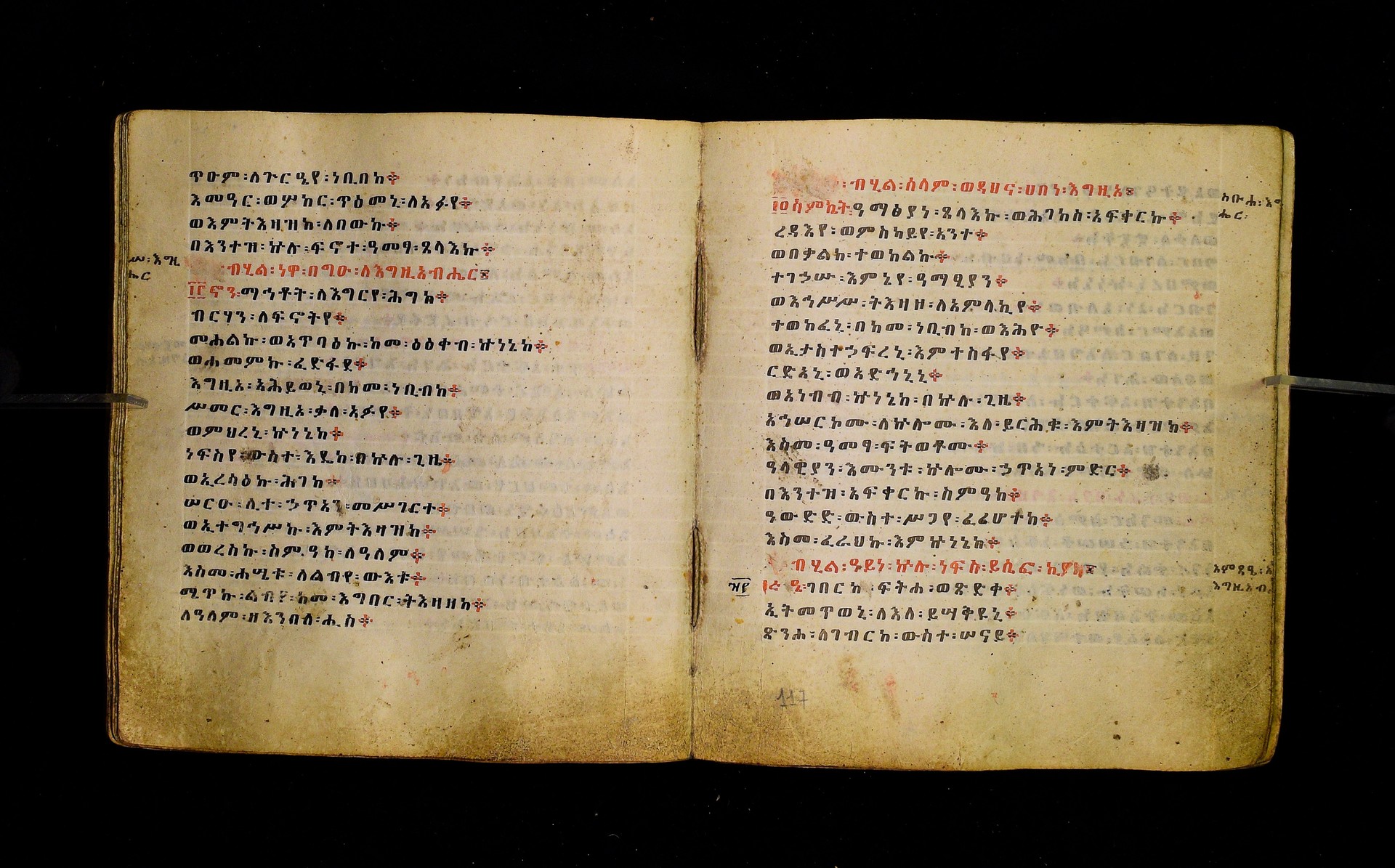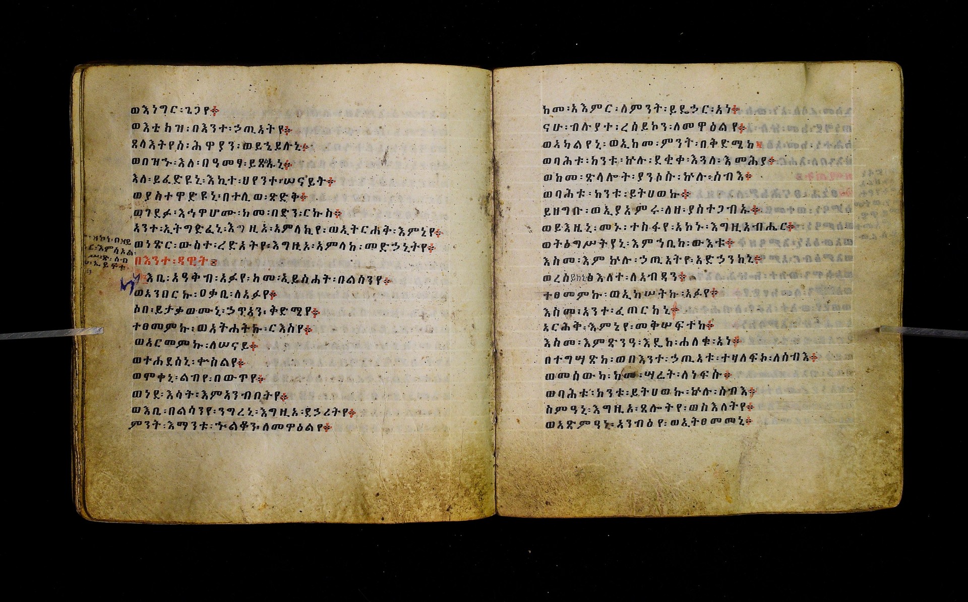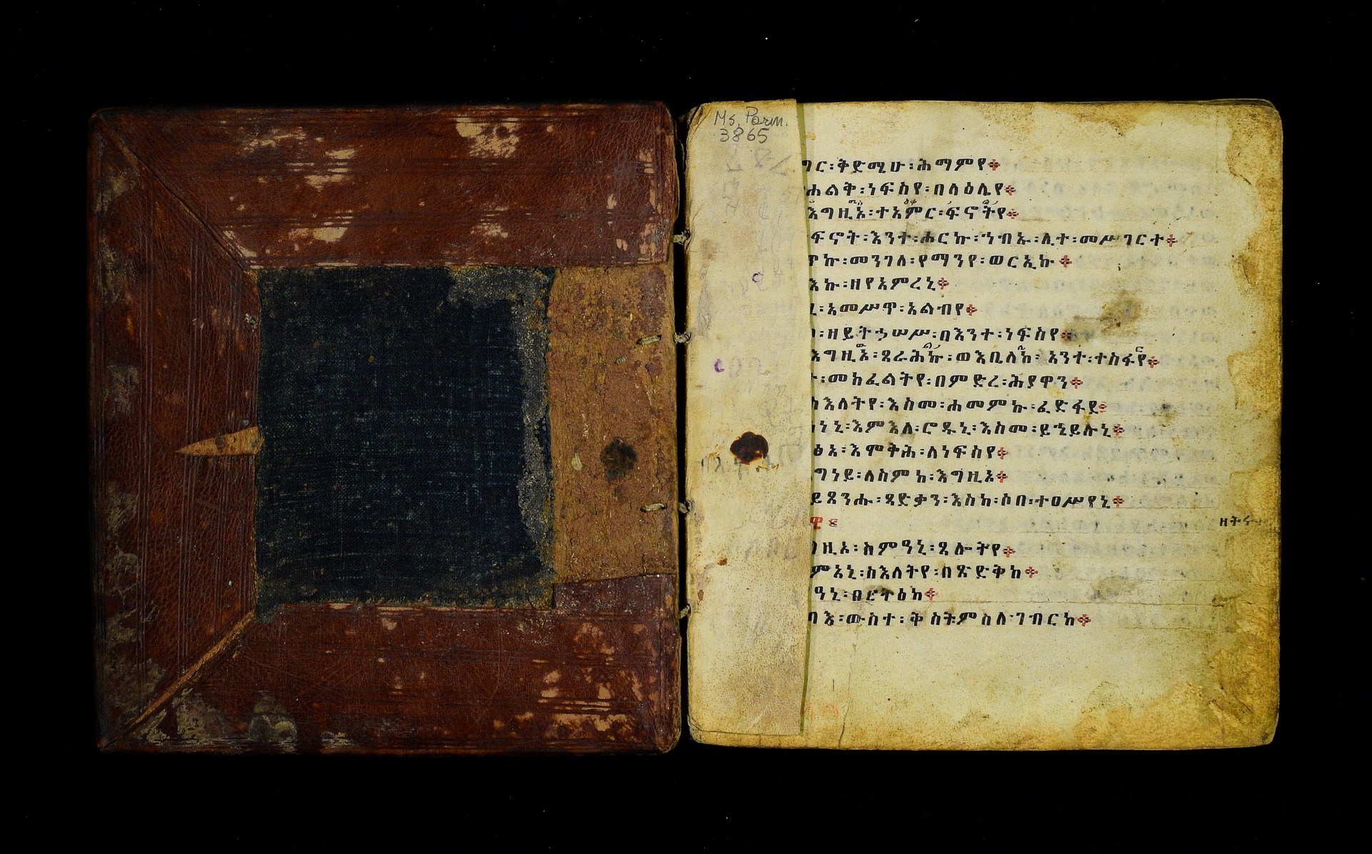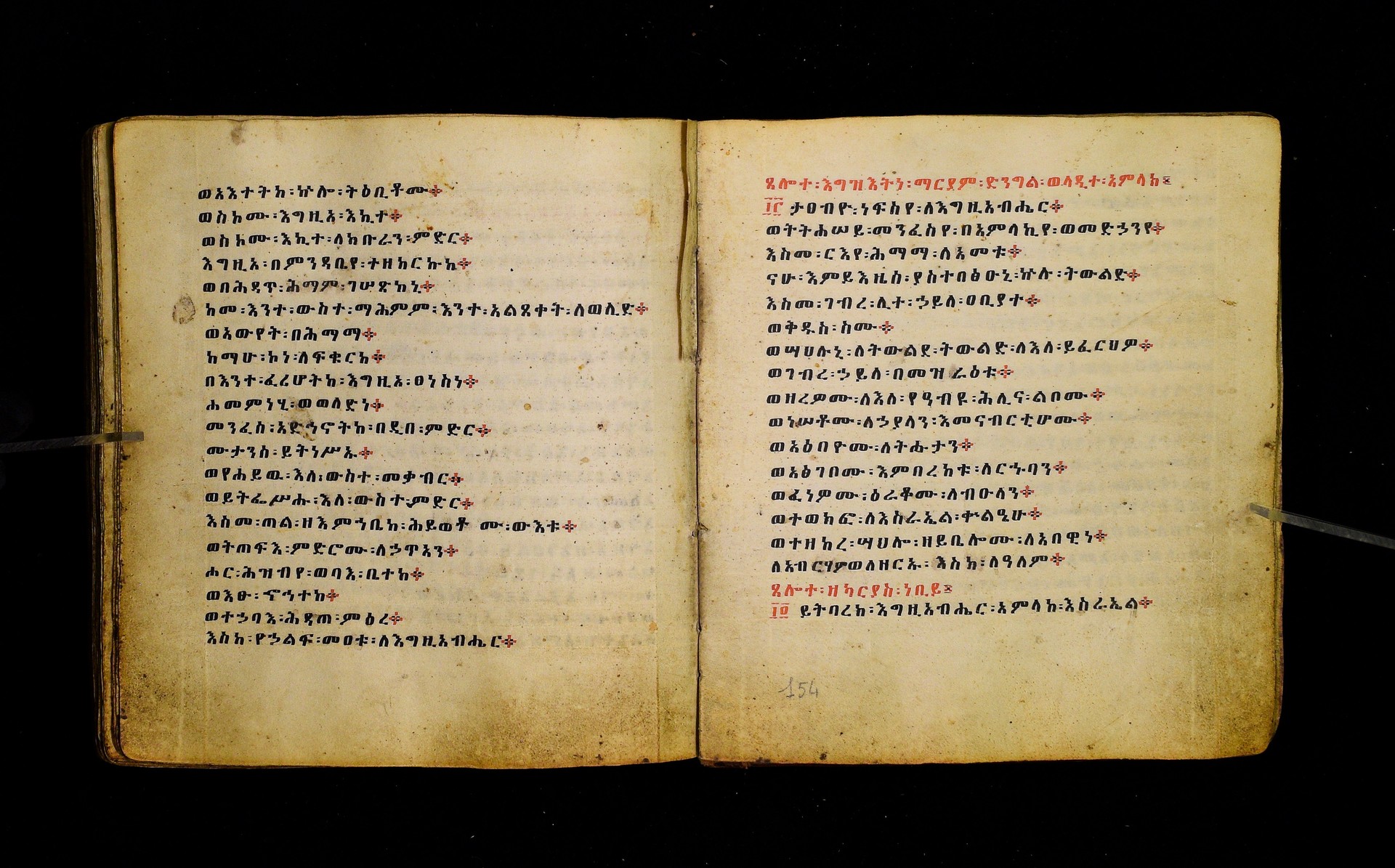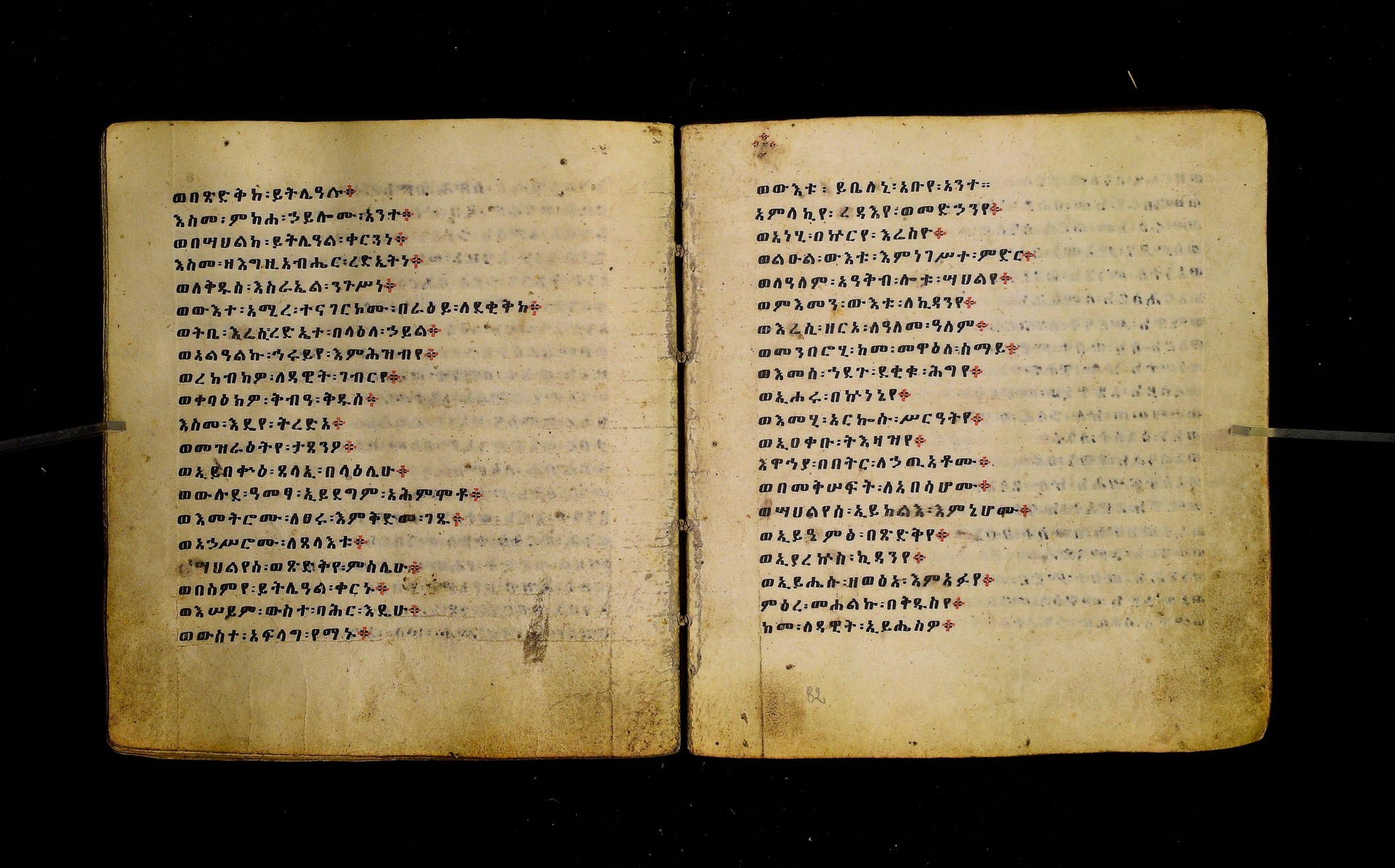 1. F. 2ra–vb: prayer to God, written on two columns in a fine handwriting. Incipit: እገይስ፡ ኀቤከ፡ አምላኪየ፡ አንተ፡ ኩነኒ፡ ረዳእየ፡ ወኩነኒ፡ ምስካይየ። ፀወንየ፡ ወኃይልየ፡ መድኃኒተ፡ ነፍስየ፡ አምላኪየ፡ ወኪያከ፡ ተወከልኩ። ኪያከ፡ ተወከልኩ፡ ኀቤከ፡ ተማኅፀንኩ፡ ኢትግድፈኒ፡ ለዝሉፉ፡ ወኢትርስአኒ፡ በምሕረትከ።. The names of Wäldä Iyäsus e Kidanä Mar[yam] are mentioned on f. 2vb. 2. F. 11r: short mäwaśǝʾt-hymn: ተፈሣሕኩ፡እስመ፡ ይቤሉኒ፡ ቤተ፡ ቤተ፡ እግዚአብሔር፡ ነሐውር። ሶበ፡ ይነቅህ፡ ካህን፡ ተከሥተ፡ ብርሃን፡ ለዓለም፡ ወተቀደሰት፡ ቤተ፡ ክርስቲያን፡ በክ፡ ወበስብሐት፡. The hymn is separated from the main text by a black vertical line and is provided with interlineal musical notation. 3. F. 163va–b: hymn entitled Mäḥaränä ab, “The Father had mercy on us”. The hymn is written in a small script and is provided with interlineal musical notation. Incipit: መሐረነ፡ አብ፡ ሃሌ፡ ሉያ፡ ተሣሃለነ፡ ወልድ፡ ሃሌ፡ ሉያ፡ መንፈስ፡ ቅዱስ፡ መሐሪ፡ ተዘከረነ፡ በሣህልከ። ለከ፡ ንፌኑ፡ ስብሐተ፡ ወለከ፡ ነዓርግ፡ አኰቴተ። መሐረነ፡ መሐሪ፡ ኃጢአተነ፡ አስተስሪ። 4. Ff. 178va–179ra: Ethiopian syllabary, written in a recent and untrained hand and followed by a short text in Amharic and Gǝʿǝz, written in the same hand. Incipit: አሊ፡ ጀረ፡ አመተ፡ ጀርጀረ፡ ነጋሢ፡ ምኒልክ፡ ቍርቍራ፡ ስመ፡ ጥርስ፡ አጥርሲ፡ አንበሳ፡ ጋማማ፡ ነምር፡ ጥፍራማ፡ ጅብ፡ ደደሳማ. |