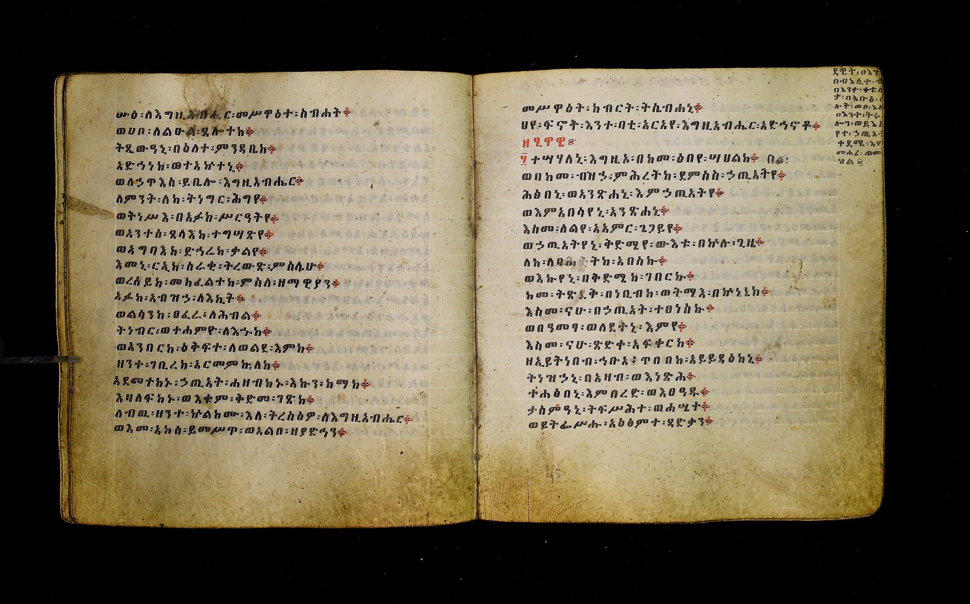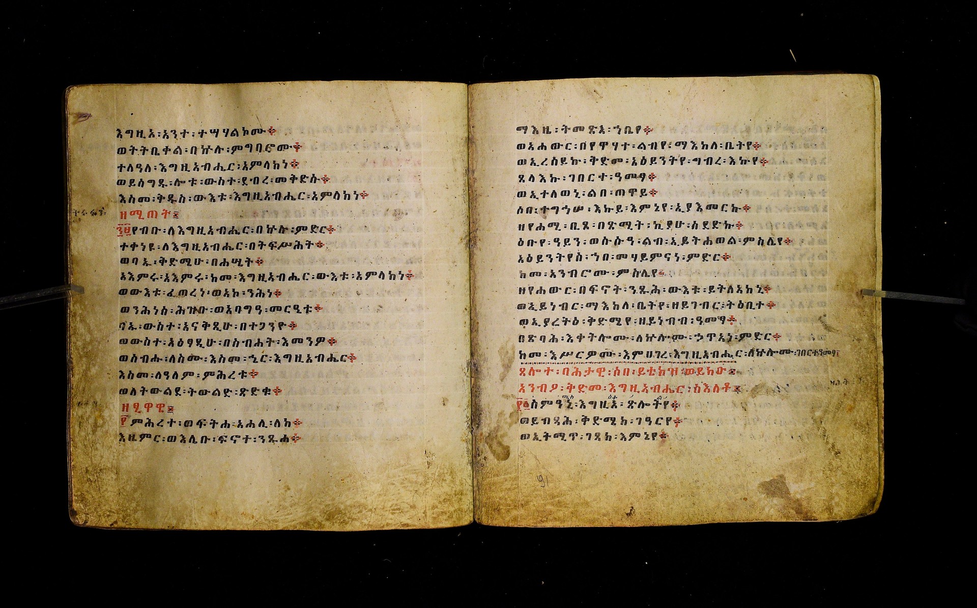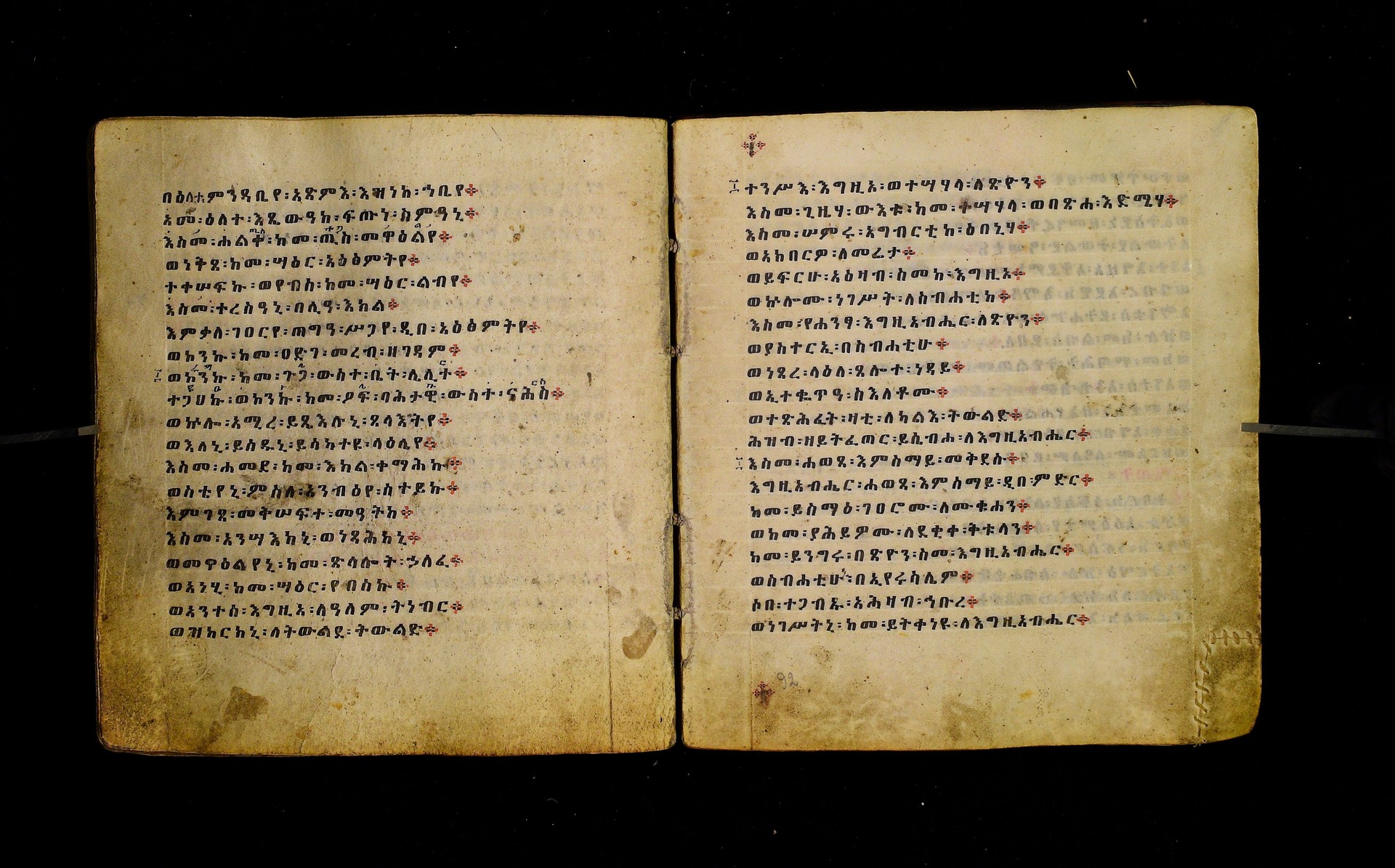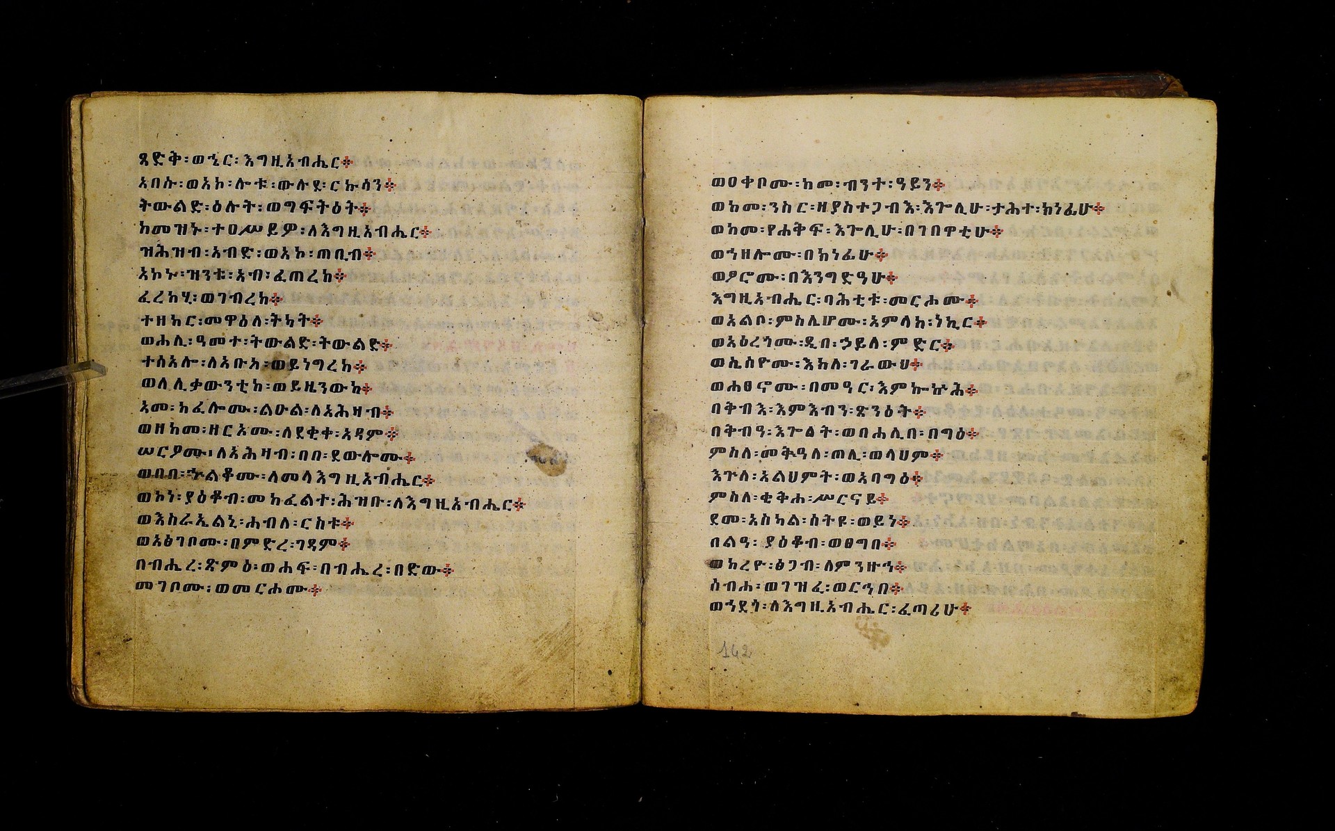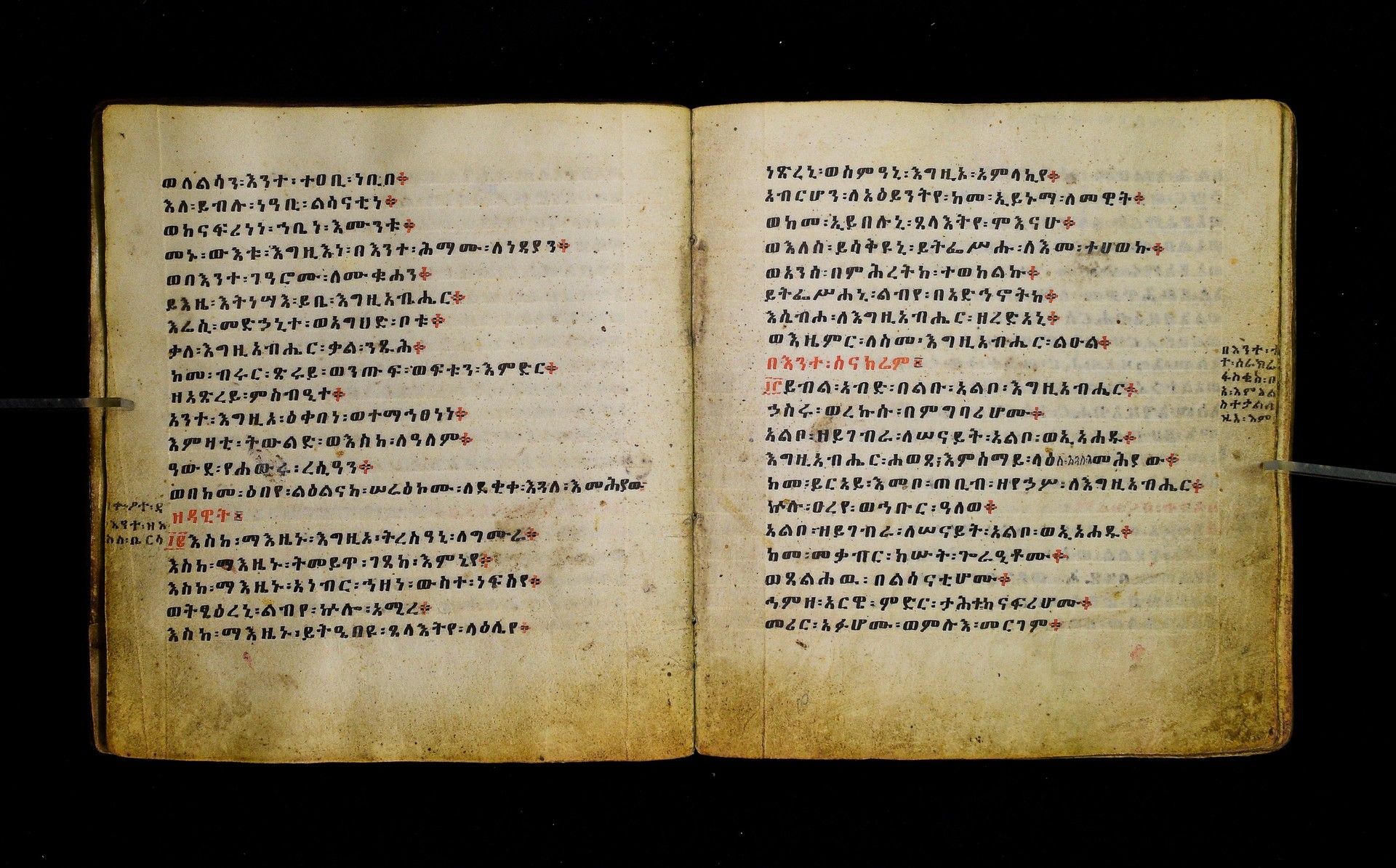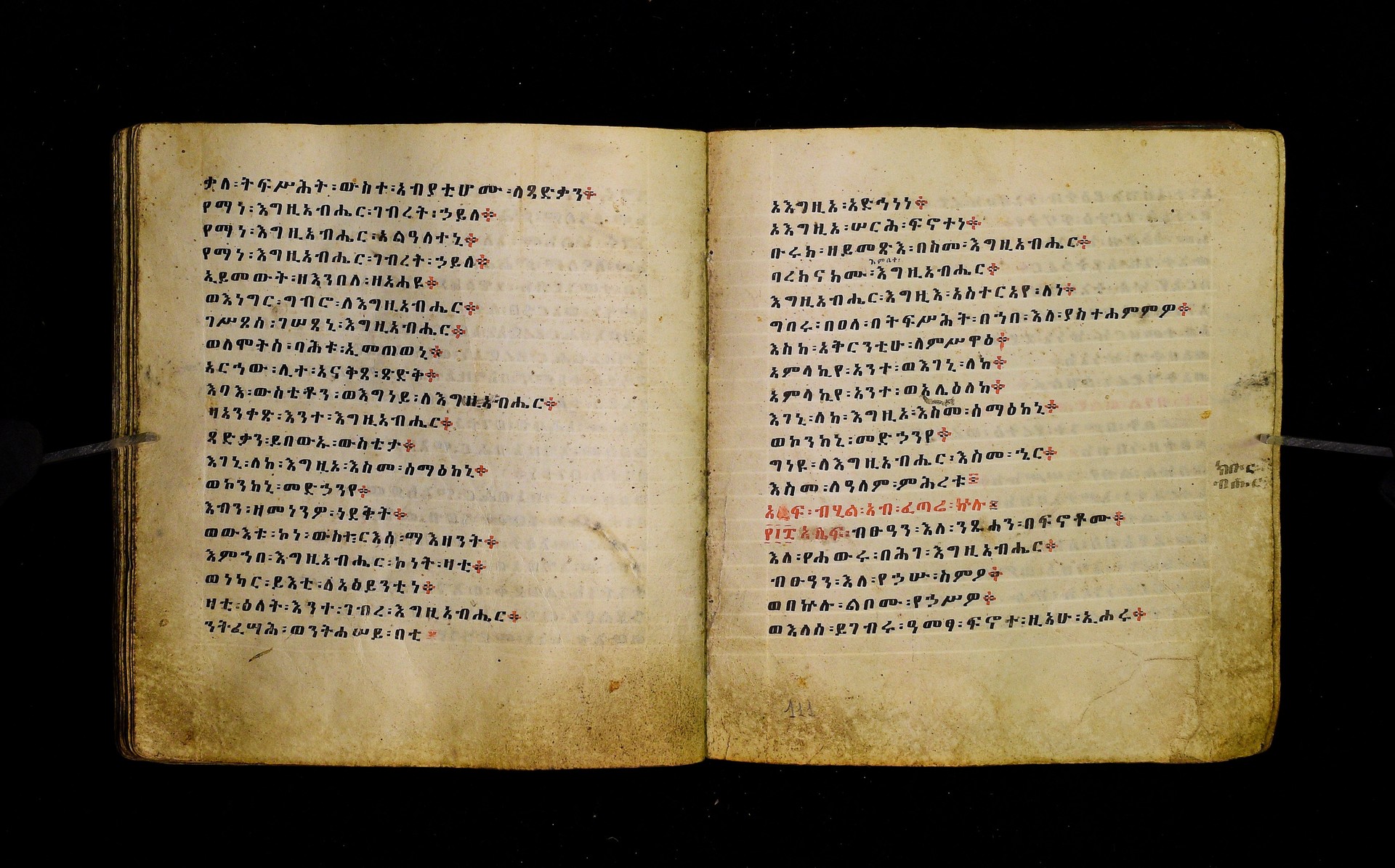 1. F. 2ra–vb: prayer to God, written on two columns in a fine handwriting. Incipit: እገይስ፡ ኀቤከ፡ አምላኪየ፡ አንተ፡ ኩነኒ፡ ረዳእየ፡ ወኩነኒ፡ ምስካይየ። ፀወንየ፡ ወኃይልየ፡ መድኃኒተ፡ ነፍስየ፡ አምላኪየ፡ ወኪያከ፡ ተወከልኩ። ኪያከ፡ ተወከልኩ፡ ኀቤከ፡ ተማኅፀንኩ፡ ኢትግድፈኒ፡ ለዝሉፉ፡ ወኢትርስአኒ፡ በምሕረትከ።. The names of Wäldä Iyäsus e Kidanä Mar[yam] are mentioned on f. 2vb. 2. F. 11r: short mäwaśǝʾt-hymn: ተፈሣሕኩ፡እስመ፡ ይቤሉኒ፡ ቤተ፡ ቤተ፡ እግዚአብሔር፡ ነሐውር። ሶበ፡ ይነቅህ፡ ካህን፡ ተከሥተ፡ ብርሃን፡ ለዓለም፡ ወተቀደሰት፡ ቤተ፡ ክርስቲያን፡ በክ፡ ወበስብሐት፡. The hymn is separated from the main text by a black vertical line and is provided with interlineal musical notation. 3. F. 163va–b: hymn entitled Mäḥaränä ab, “The Father had mercy on us”. The hymn is written in a small script and is provided with interlineal musical notation. Incipit: መሐረነ፡ አብ፡ ሃሌ፡ ሉያ፡ ተሣሃለነ፡ ወልድ፡ ሃሌ፡ ሉያ፡ መንፈስ፡ ቅዱስ፡ መሐሪ፡ ተዘከረነ፡ በሣህልከ። ለከ፡ ንፌኑ፡ ስብሐተ፡ ወለከ፡ ነዓርግ፡ አኰቴተ። መሐረነ፡ መሐሪ፡ ኃጢአተነ፡ አስተስሪ። 4. Ff. 178va–179ra: Ethiopian syllabary, written in a recent and untrained hand and followed by a short text in Amharic and Gǝʿǝz, written in the same hand. Incipit: አሊ፡ ጀረ፡ አመተ፡ ጀርጀረ፡ ነጋሢ፡ ምኒልክ፡ ቍርቍራ፡ ስመ፡ ጥርስ፡ አጥርሲ፡ አንበሳ፡ ጋማማ፡ ነምር፡ ጥፍራማ፡ ጅብ፡ ደደሳማ. |
