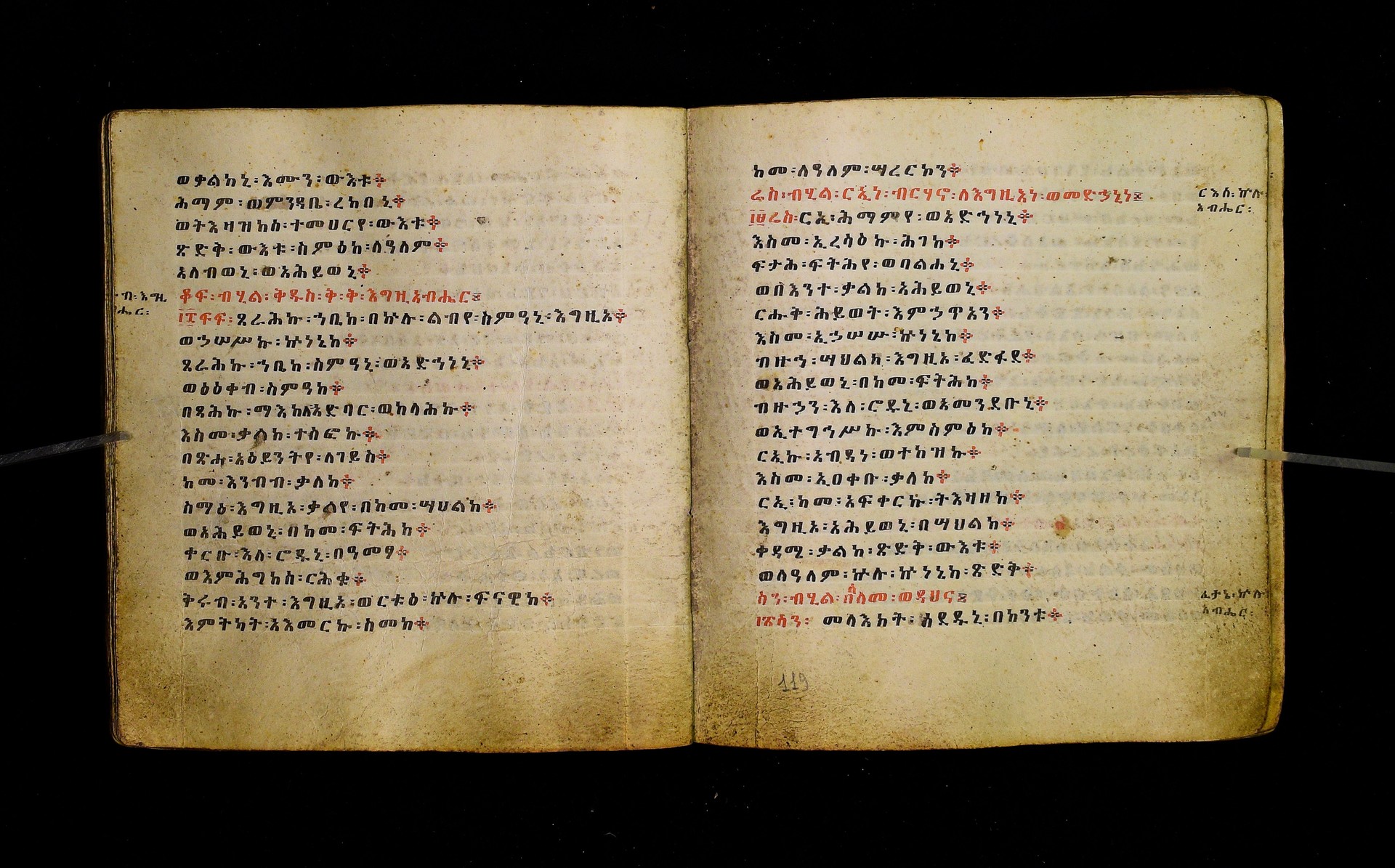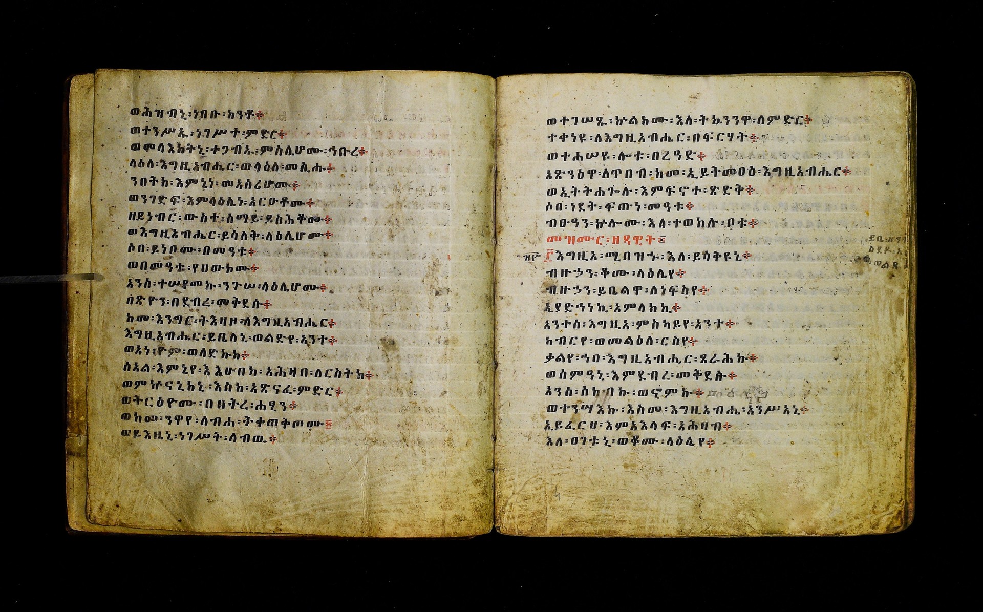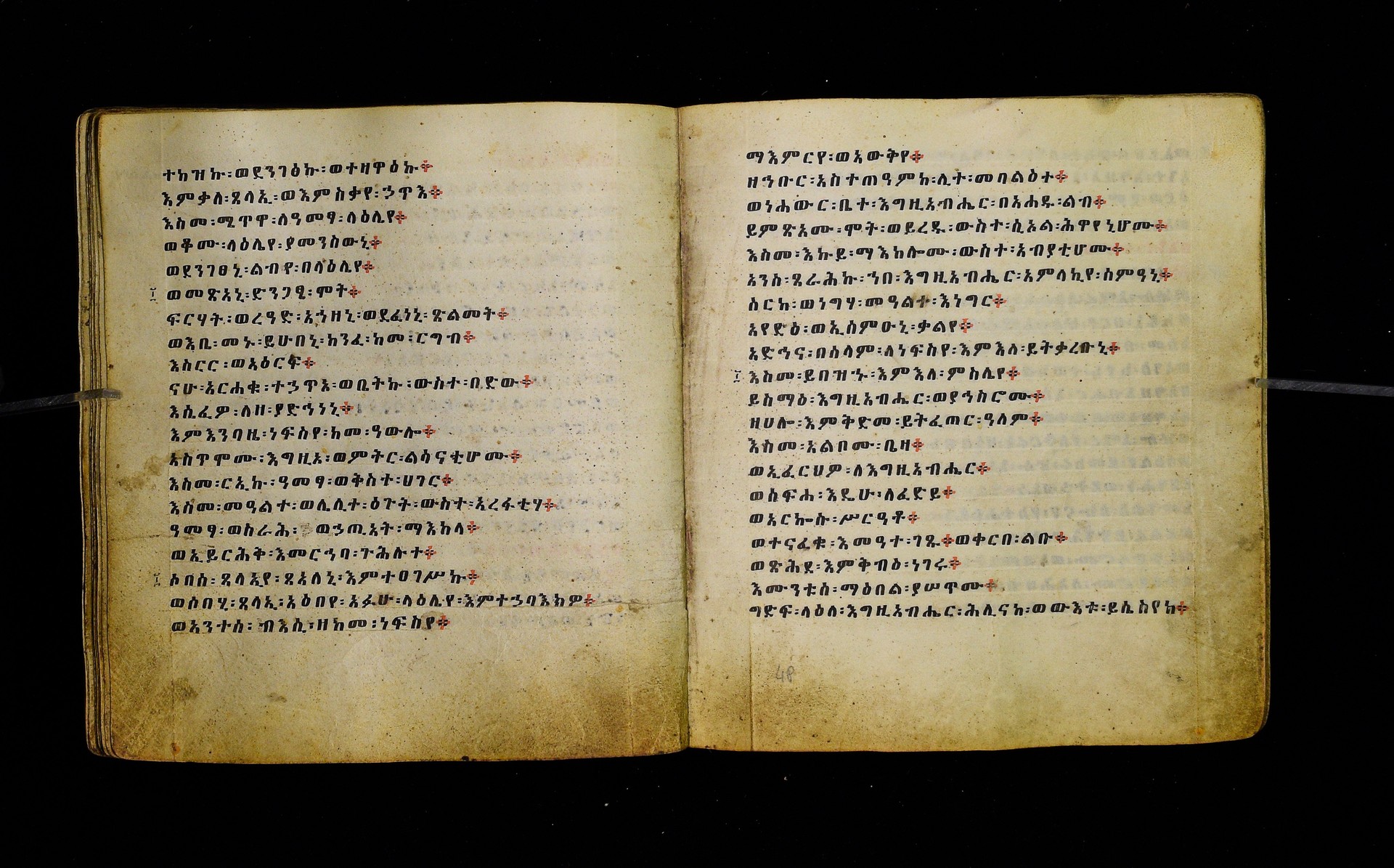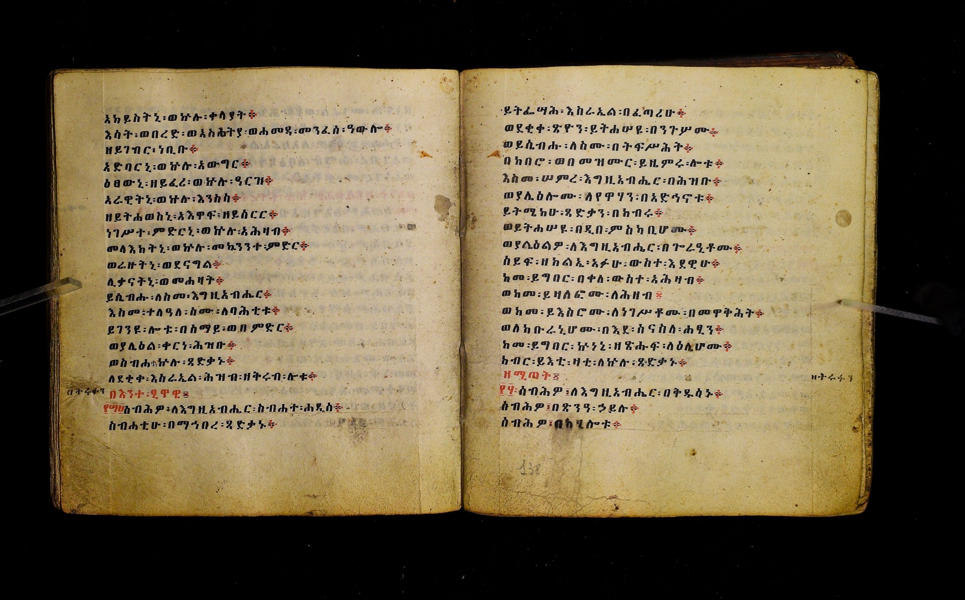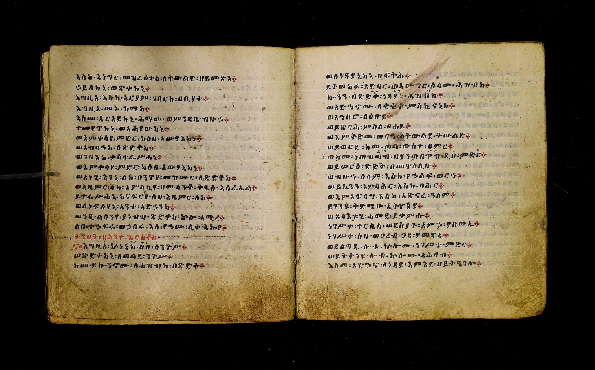 1. F. 2ra–vb: prayer to God, written on two columns in a fine handwriting. Incipit: እገይስ፡ ኀቤከ፡ አምላኪየ፡ አንተ፡ ኩነኒ፡ ረዳእየ፡ ወኩነኒ፡ ምስካይየ። ፀወንየ፡ ወኃይልየ፡ መድኃኒተ፡ ነፍስየ፡ አምላኪየ፡ ወኪያከ፡ ተወከልኩ። ኪያከ፡ ተወከልኩ፡ ኀቤከ፡ ተማኅፀንኩ፡ ኢትግድፈኒ፡ ለዝሉፉ፡ ወኢትርስአኒ፡ በምሕረትከ።. The names of Wäldä Iyäsus e Kidanä Mar[yam] are mentioned on f. 2vb. 2. F. 11r: short mäwaśǝʾt-hymn: ተፈሣሕኩ፡እስመ፡ ይቤሉኒ፡ ቤተ፡ ቤተ፡ እግዚአብሔር፡ ነሐውር። ሶበ፡ ይነቅህ፡ ካህን፡ ተከሥተ፡ ብርሃን፡ ለዓለም፡ ወተቀደሰት፡ ቤተ፡ ክርስቲያን፡ በክ፡ ወበስብሐት፡. The hymn is separated from the main text by a black vertical line and is provided with interlineal musical notation. 3. F. 163va–b: hymn entitled Mäḥaränä ab, “The Father had mercy on us”. The hymn is written in a small script and is provided with interlineal musical notation. Incipit: መሐረነ፡ አብ፡ ሃሌ፡ ሉያ፡ ተሣሃለነ፡ ወልድ፡ ሃሌ፡ ሉያ፡ መንፈስ፡ ቅዱስ፡ መሐሪ፡ ተዘከረነ፡ በሣህልከ። ለከ፡ ንፌኑ፡ ስብሐተ፡ ወለከ፡ ነዓርግ፡ አኰቴተ። መሐረነ፡ መሐሪ፡ ኃጢአተነ፡ አስተስሪ። 4. Ff. 178va–179ra: Ethiopian syllabary, written in a recent and untrained hand and followed by a short text in Amharic and Gǝʿǝz, written in the same hand. Incipit: አሊ፡ ጀረ፡ አመተ፡ ጀርጀረ፡ ነጋሢ፡ ምኒልክ፡ ቍርቍራ፡ ስመ፡ ጥርስ፡ አጥርሲ፡ አንበሳ፡ ጋማማ፡ ነምር፡ ጥፍራማ፡ ጅብ፡ ደደሳማ. |