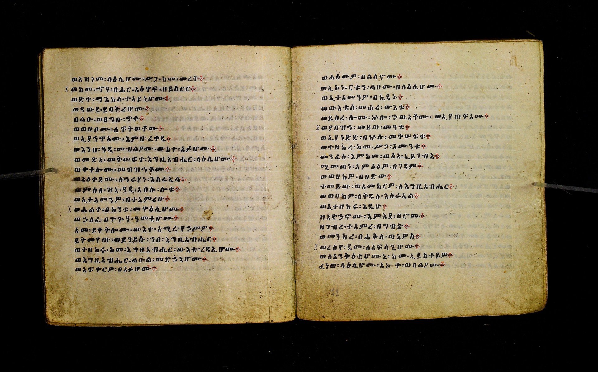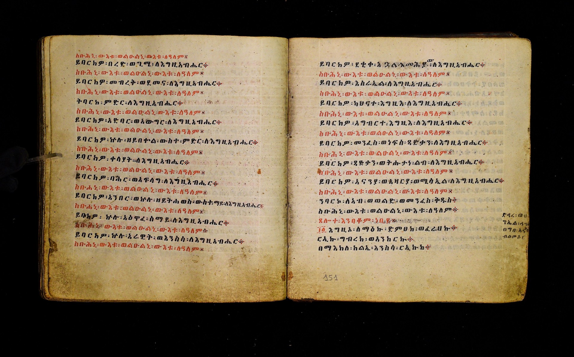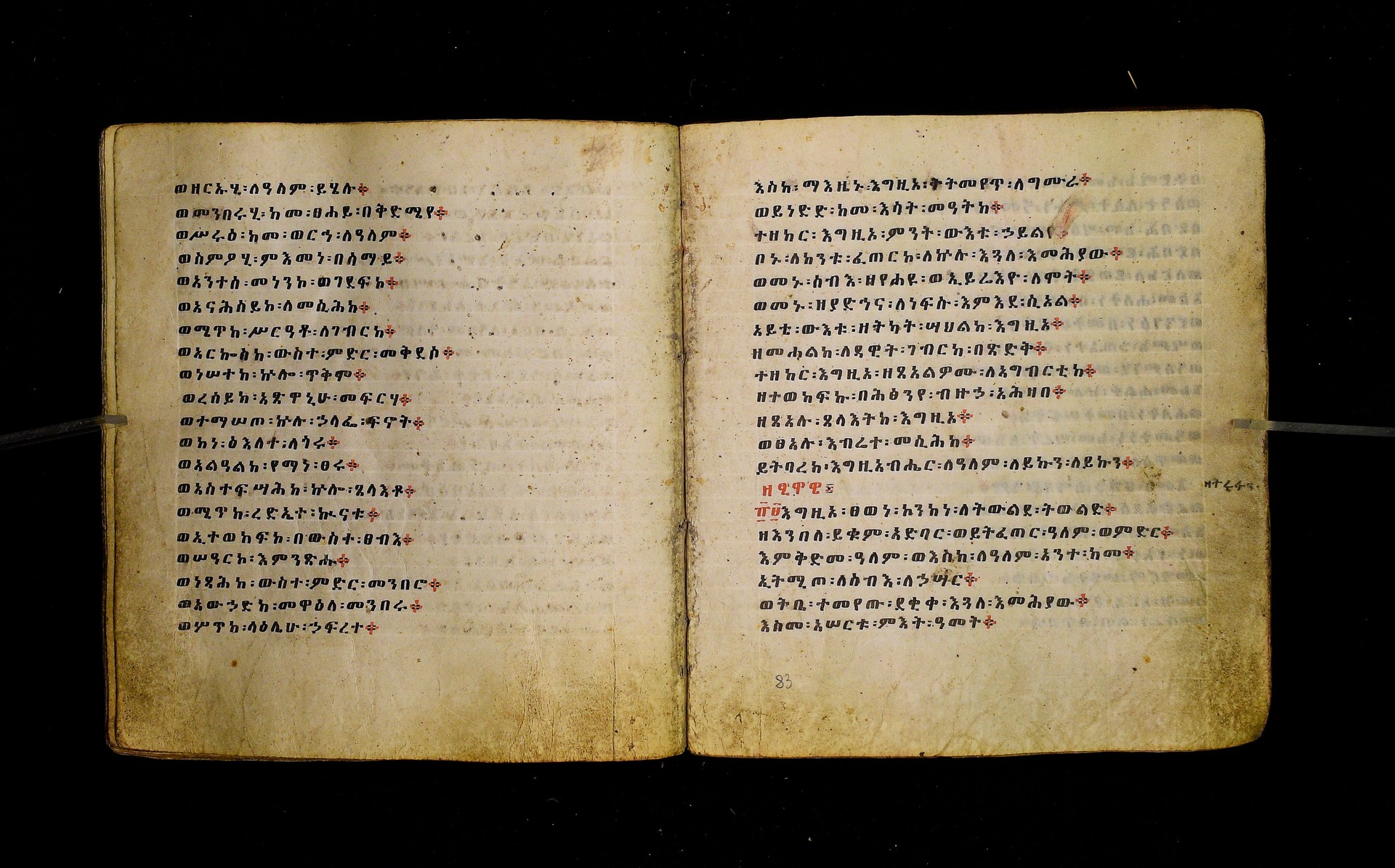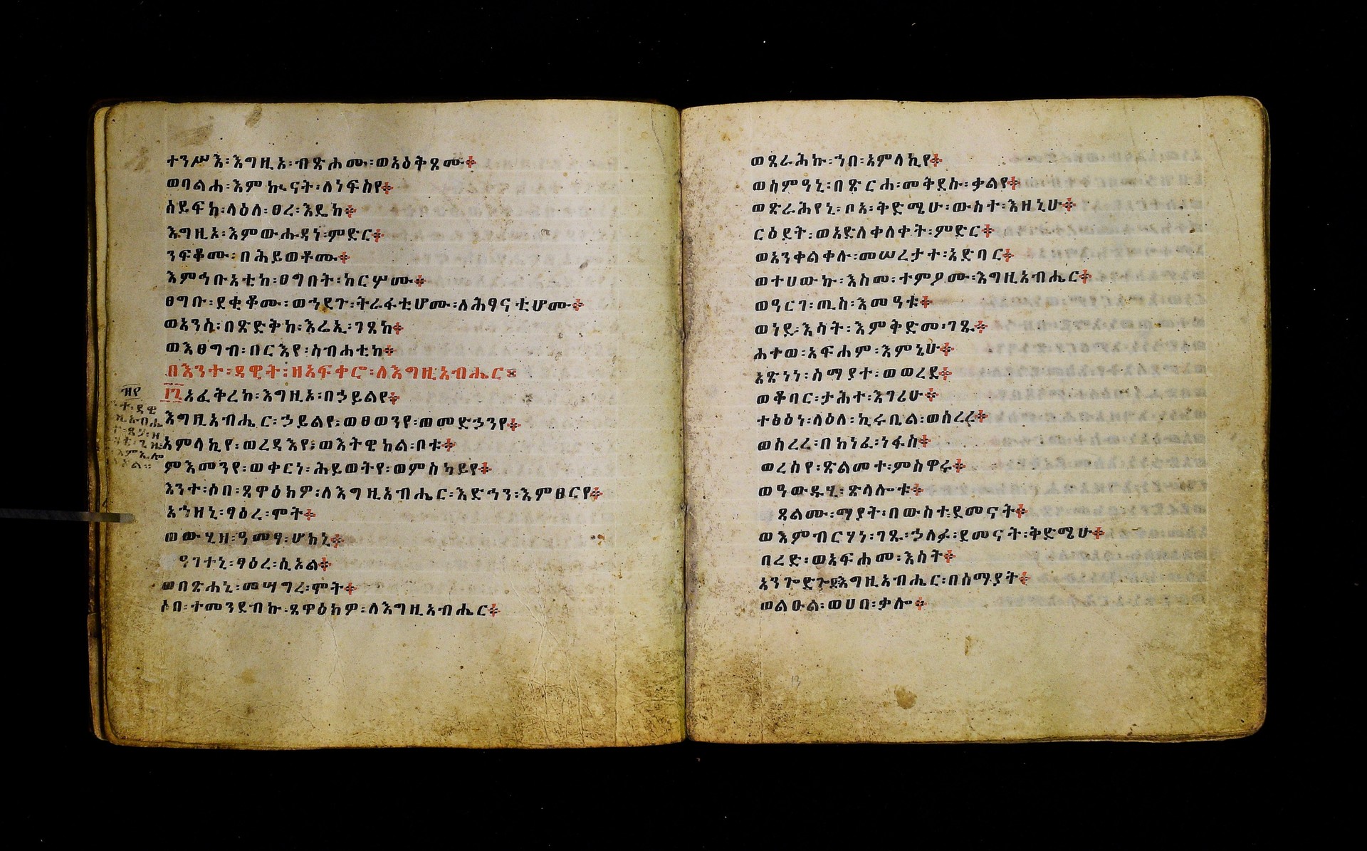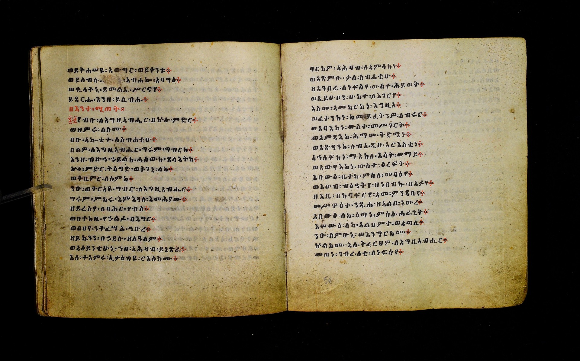 1. F. 2ra–vb: prayer to God, written on two columns in a fine handwriting. Incipit: እገይስ፡ ኀቤከ፡ አምላኪየ፡ አንተ፡ ኩነኒ፡ ረዳእየ፡ ወኩነኒ፡ ምስካይየ። ፀወንየ፡ ወኃይልየ፡ መድኃኒተ፡ ነፍስየ፡ አምላኪየ፡ ወኪያከ፡ ተወከልኩ። ኪያከ፡ ተወከልኩ፡ ኀቤከ፡ ተማኅፀንኩ፡ ኢትግድፈኒ፡ ለዝሉፉ፡ ወኢትርስአኒ፡ በምሕረትከ።. The names of Wäldä Iyäsus e Kidanä Mar[yam] are mentioned on f. 2vb. 2. F. 11r: short mäwaśǝʾt-hymn: ተፈሣሕኩ፡እስመ፡ ይቤሉኒ፡ ቤተ፡ ቤተ፡ እግዚአብሔር፡ ነሐውር። ሶበ፡ ይነቅህ፡ ካህን፡ ተከሥተ፡ ብርሃን፡ ለዓለም፡ ወተቀደሰት፡ ቤተ፡ ክርስቲያን፡ በክ፡ ወበስብሐት፡. The hymn is separated from the main text by a black vertical line and is provided with interlineal musical notation. 3. F. 163va–b: hymn entitled Mäḥaränä ab, “The Father had mercy on us”. The hymn is written in a small script and is provided with interlineal musical notation. Incipit: መሐረነ፡ አብ፡ ሃሌ፡ ሉያ፡ ተሣሃለነ፡ ወልድ፡ ሃሌ፡ ሉያ፡ መንፈስ፡ ቅዱስ፡ መሐሪ፡ ተዘከረነ፡ በሣህልከ። ለከ፡ ንፌኑ፡ ስብሐተ፡ ወለከ፡ ነዓርግ፡ አኰቴተ። መሐረነ፡ መሐሪ፡ ኃጢአተነ፡ አስተስሪ። 4. Ff. 178va–179ra: Ethiopian syllabary, written in a recent and untrained hand and followed by a short text in Amharic and Gǝʿǝz, written in the same hand. Incipit: አሊ፡ ጀረ፡ አመተ፡ ጀርጀረ፡ ነጋሢ፡ ምኒልክ፡ ቍርቍራ፡ ስመ፡ ጥርስ፡ አጥርሲ፡ አንበሳ፡ ጋማማ፡ ነምር፡ ጥፍራማ፡ ጅብ፡ ደደሳማ. |