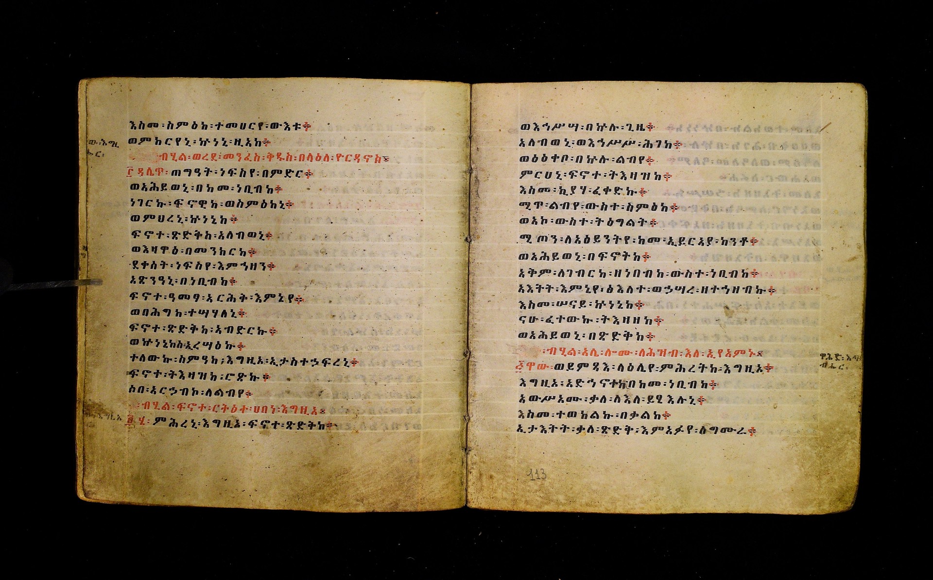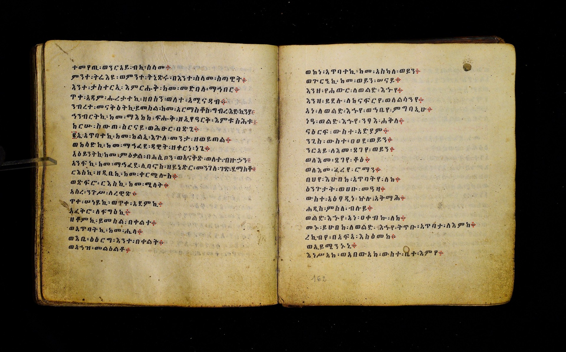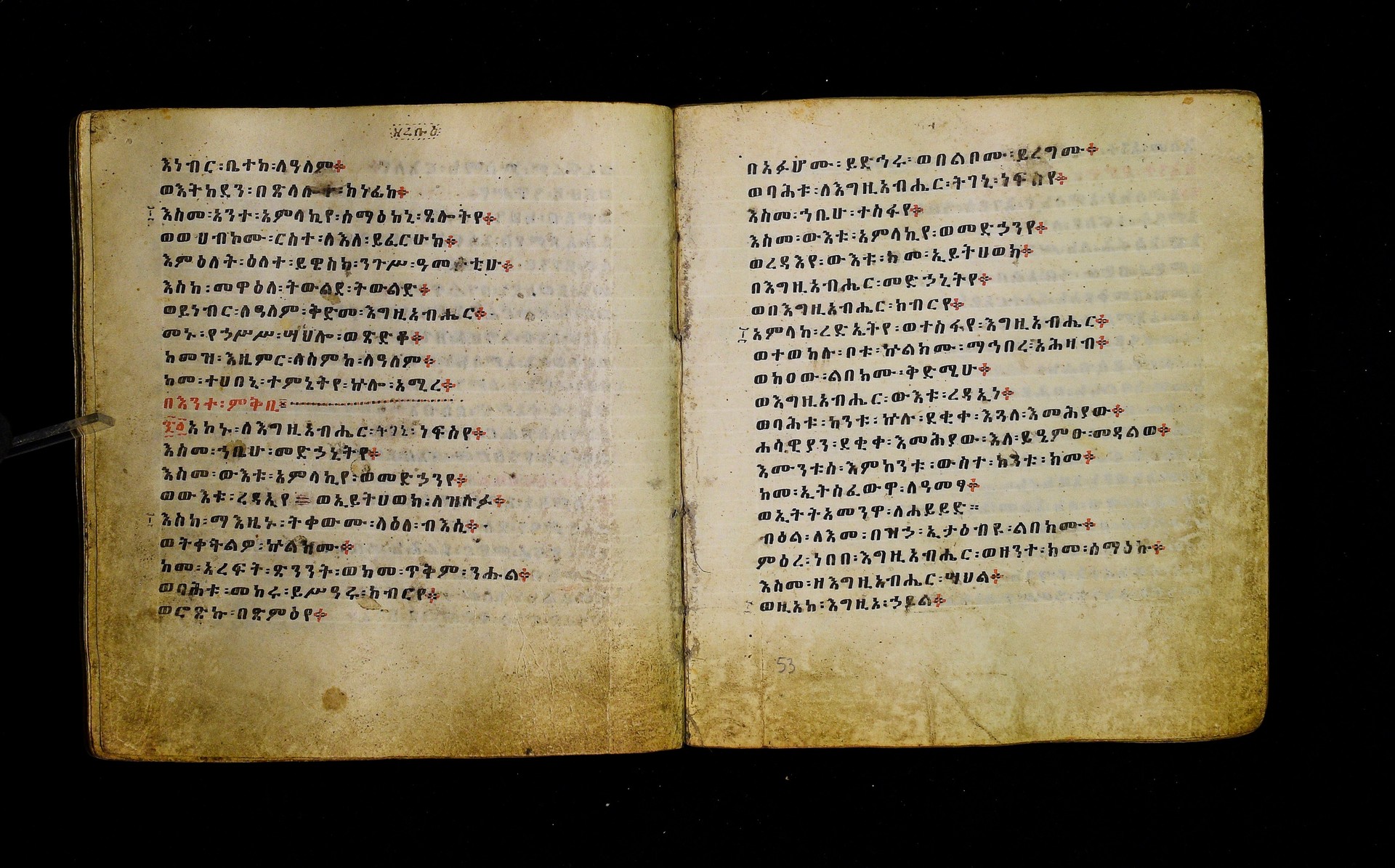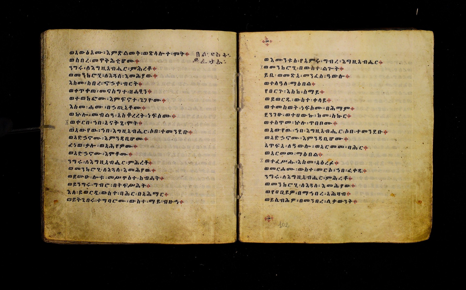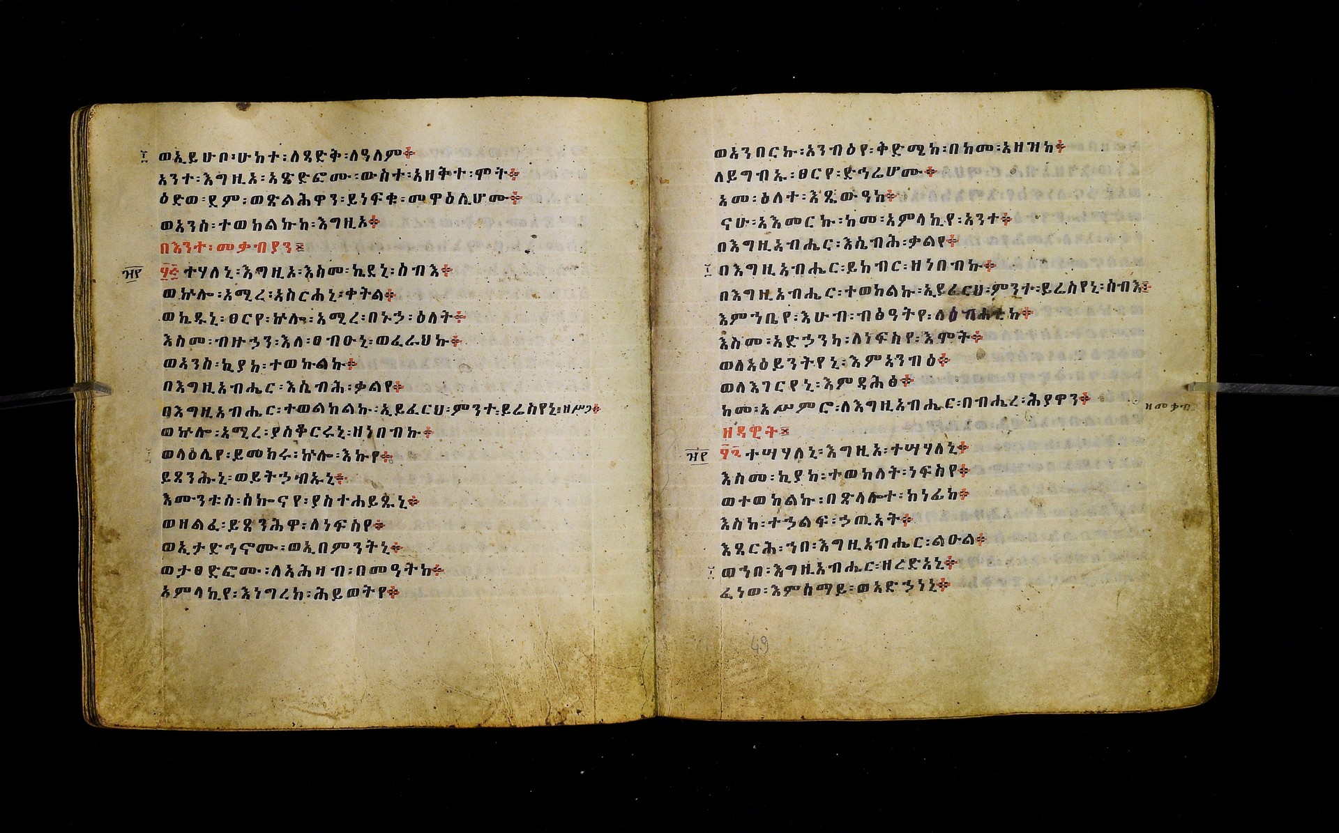 1. F. 2ra–vb: prayer to God, written on two columns in a fine handwriting. Incipit: እገይስ፡ ኀቤከ፡ አምላኪየ፡ አንተ፡ ኩነኒ፡ ረዳእየ፡ ወኩነኒ፡ ምስካይየ። ፀወንየ፡ ወኃይልየ፡ መድኃኒተ፡ ነፍስየ፡ አምላኪየ፡ ወኪያከ፡ ተወከልኩ። ኪያከ፡ ተወከልኩ፡ ኀቤከ፡ ተማኅፀንኩ፡ ኢትግድፈኒ፡ ለዝሉፉ፡ ወኢትርስአኒ፡ በምሕረትከ።. The names of Wäldä Iyäsus e Kidanä Mar[yam] are mentioned on f. 2vb. 2. F. 11r: short mäwaśǝʾt-hymn: ተፈሣሕኩ፡እስመ፡ ይቤሉኒ፡ ቤተ፡ ቤተ፡ እግዚአብሔር፡ ነሐውር። ሶበ፡ ይነቅህ፡ ካህን፡ ተከሥተ፡ ብርሃን፡ ለዓለም፡ ወተቀደሰት፡ ቤተ፡ ክርስቲያን፡ በክ፡ ወበስብሐት፡. The hymn is separated from the main text by a black vertical line and is provided with interlineal musical notation. 3. F. 163va–b: hymn entitled Mäḥaränä ab, “The Father had mercy on us”. The hymn is written in a small script and is provided with interlineal musical notation. Incipit: መሐረነ፡ አብ፡ ሃሌ፡ ሉያ፡ ተሣሃለነ፡ ወልድ፡ ሃሌ፡ ሉያ፡ መንፈስ፡ ቅዱስ፡ መሐሪ፡ ተዘከረነ፡ በሣህልከ። ለከ፡ ንፌኑ፡ ስብሐተ፡ ወለከ፡ ነዓርግ፡ አኰቴተ። መሐረነ፡ መሐሪ፡ ኃጢአተነ፡ አስተስሪ። 4. Ff. 178va–179ra: Ethiopian syllabary, written in a recent and untrained hand and followed by a short text in Amharic and Gǝʿǝz, written in the same hand. Incipit: አሊ፡ ጀረ፡ አመተ፡ ጀርጀረ፡ ነጋሢ፡ ምኒልክ፡ ቍርቍራ፡ ስመ፡ ጥርስ፡ አጥርሲ፡ አንበሳ፡ ጋማማ፡ ነምር፡ ጥፍራማ፡ ጅብ፡ ደደሳማ. |