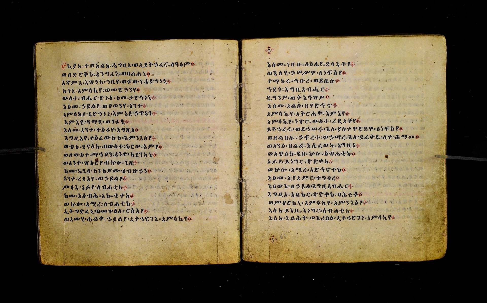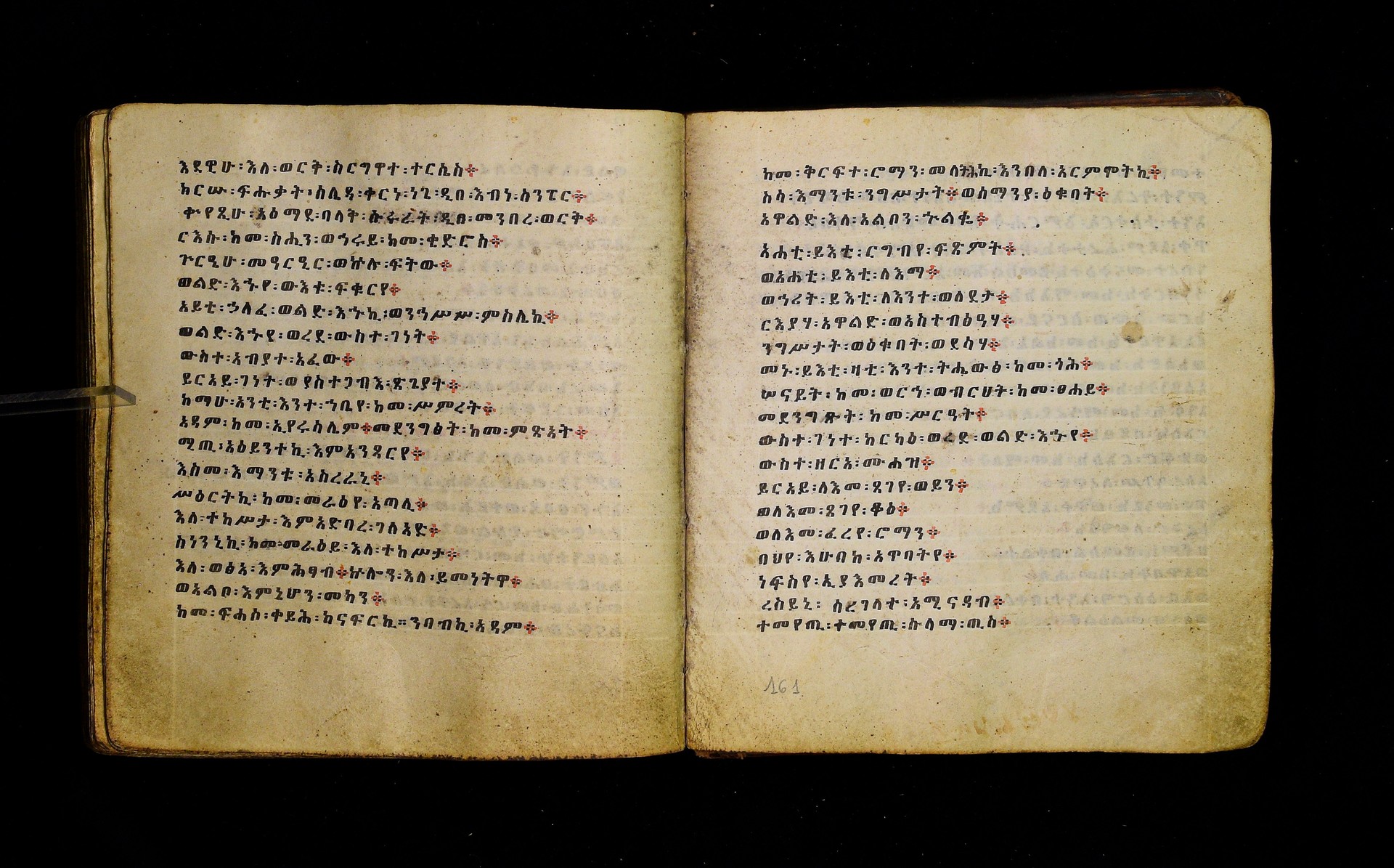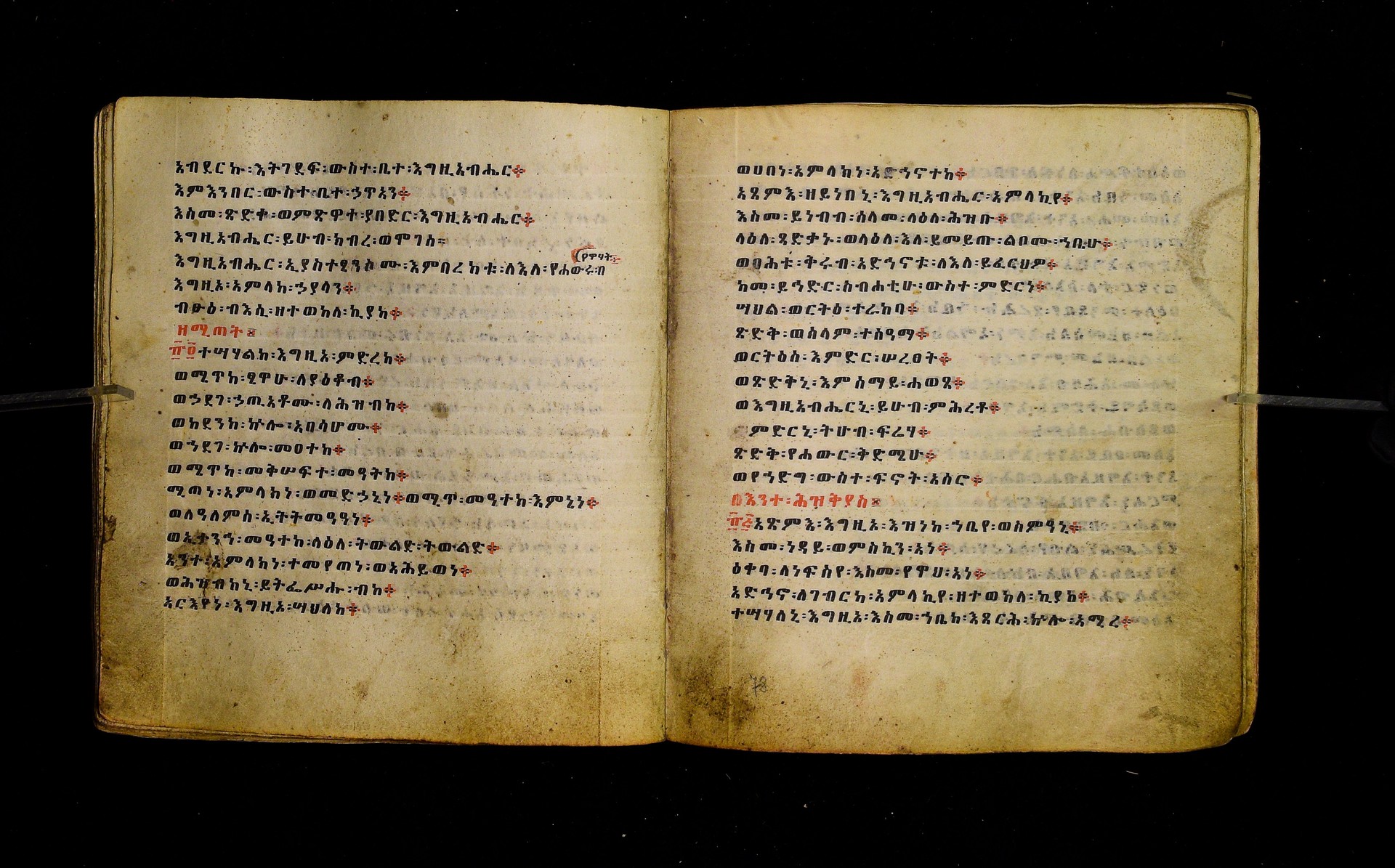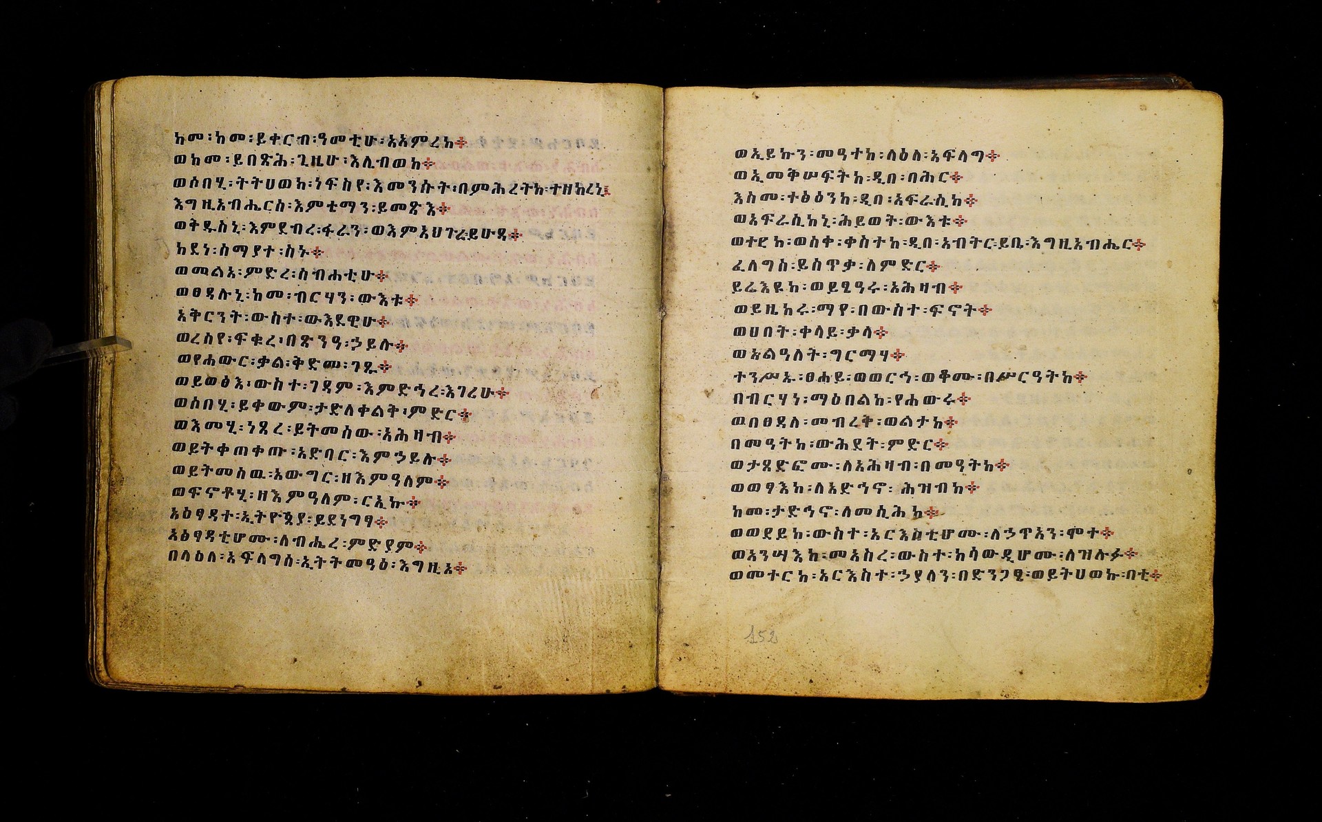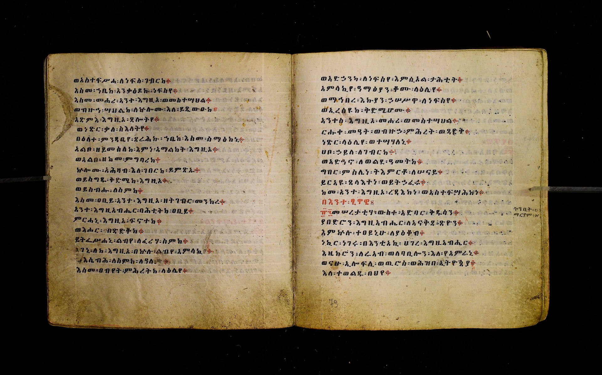 1. F. 2ra–vb: prayer to God, written on two columns in a fine handwriting. Incipit: እገይስ፡ ኀቤከ፡ አምላኪየ፡ አንተ፡ ኩነኒ፡ ረዳእየ፡ ወኩነኒ፡ ምስካይየ። ፀወንየ፡ ወኃይልየ፡ መድኃኒተ፡ ነፍስየ፡ አምላኪየ፡ ወኪያከ፡ ተወከልኩ። ኪያከ፡ ተወከልኩ፡ ኀቤከ፡ ተማኅፀንኩ፡ ኢትግድፈኒ፡ ለዝሉፉ፡ ወኢትርስአኒ፡ በምሕረትከ።. The names of Wäldä Iyäsus e Kidanä Mar[yam] are mentioned on f. 2vb. 2. F. 11r: short mäwaśǝʾt-hymn: ተፈሣሕኩ፡እስመ፡ ይቤሉኒ፡ ቤተ፡ ቤተ፡ እግዚአብሔር፡ ነሐውር። ሶበ፡ ይነቅህ፡ ካህን፡ ተከሥተ፡ ብርሃን፡ ለዓለም፡ ወተቀደሰት፡ ቤተ፡ ክርስቲያን፡ በክ፡ ወበስብሐት፡. The hymn is separated from the main text by a black vertical line and is provided with interlineal musical notation. 3. F. 163va–b: hymn entitled Mäḥaränä ab, “The Father had mercy on us”. The hymn is written in a small script and is provided with interlineal musical notation. Incipit: መሐረነ፡ አብ፡ ሃሌ፡ ሉያ፡ ተሣሃለነ፡ ወልድ፡ ሃሌ፡ ሉያ፡ መንፈስ፡ ቅዱስ፡ መሐሪ፡ ተዘከረነ፡ በሣህልከ። ለከ፡ ንፌኑ፡ ስብሐተ፡ ወለከ፡ ነዓርግ፡ አኰቴተ። መሐረነ፡ መሐሪ፡ ኃጢአተነ፡ አስተስሪ። 4. Ff. 178va–179ra: Ethiopian syllabary, written in a recent and untrained hand and followed by a short text in Amharic and Gǝʿǝz, written in the same hand. Incipit: አሊ፡ ጀረ፡ አመተ፡ ጀርጀረ፡ ነጋሢ፡ ምኒልክ፡ ቍርቍራ፡ ስመ፡ ጥርስ፡ አጥርሲ፡ አንበሳ፡ ጋማማ፡ ነምር፡ ጥፍራማ፡ ጅብ፡ ደደሳማ. |