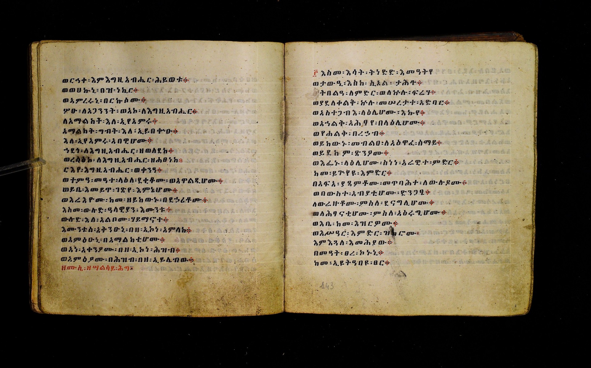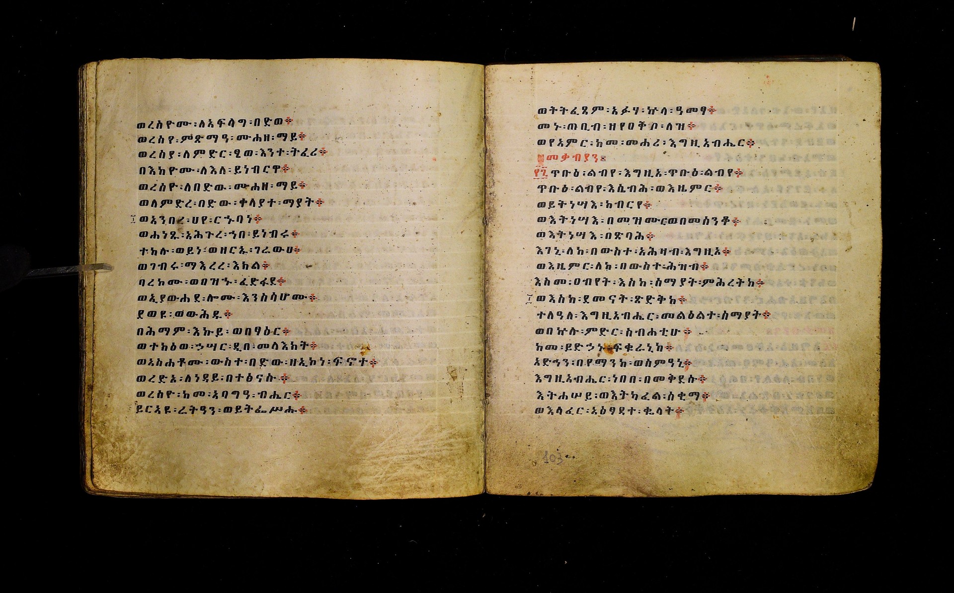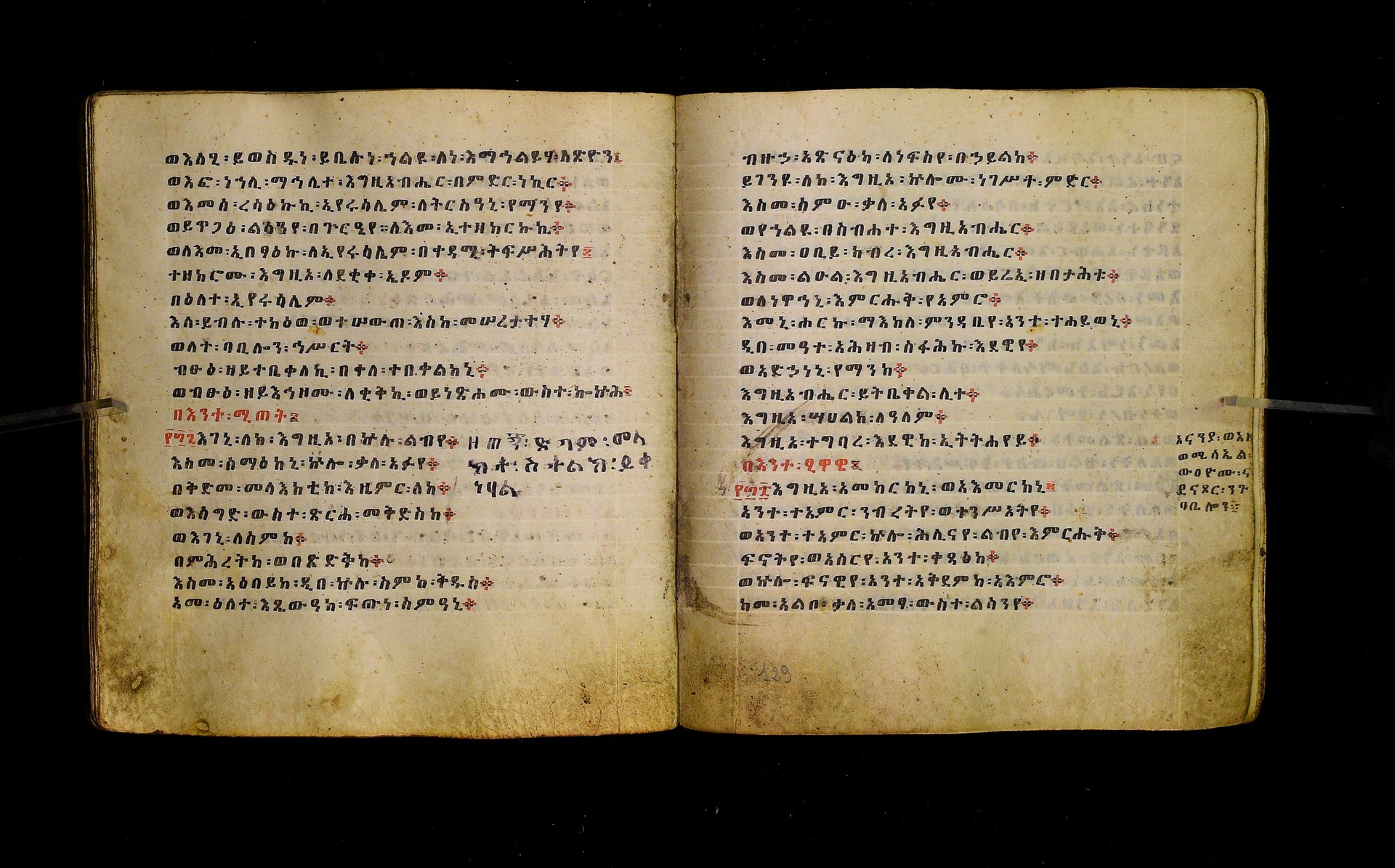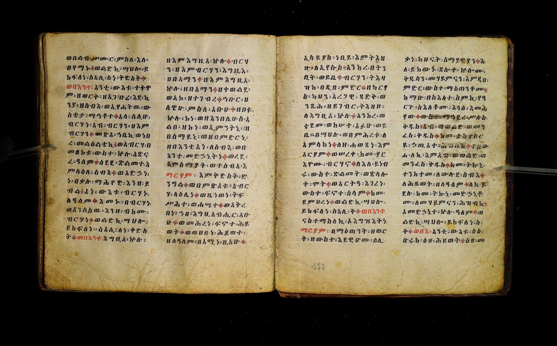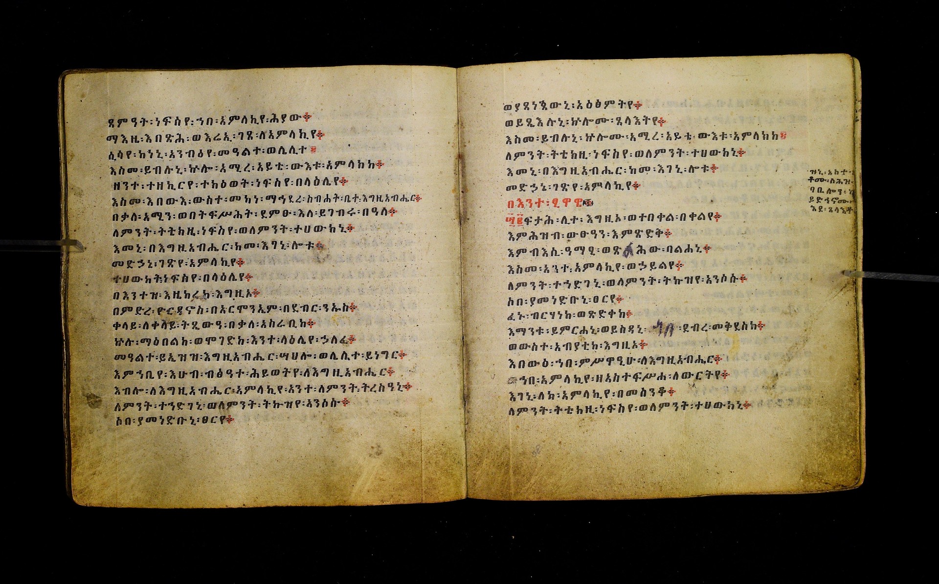 1. F. 2ra–vb: prayer to God, written on two columns in a fine handwriting. Incipit: እገይስ፡ ኀቤከ፡ አምላኪየ፡ አንተ፡ ኩነኒ፡ ረዳእየ፡ ወኩነኒ፡ ምስካይየ። ፀወንየ፡ ወኃይልየ፡ መድኃኒተ፡ ነፍስየ፡ አምላኪየ፡ ወኪያከ፡ ተወከልኩ። ኪያከ፡ ተወከልኩ፡ ኀቤከ፡ ተማኅፀንኩ፡ ኢትግድፈኒ፡ ለዝሉፉ፡ ወኢትርስአኒ፡ በምሕረትከ።. The names of Wäldä Iyäsus e Kidanä Mar[yam] are mentioned on f. 2vb. 2. F. 11r: short mäwaśǝʾt-hymn: ተፈሣሕኩ፡እስመ፡ ይቤሉኒ፡ ቤተ፡ ቤተ፡ እግዚአብሔር፡ ነሐውር። ሶበ፡ ይነቅህ፡ ካህን፡ ተከሥተ፡ ብርሃን፡ ለዓለም፡ ወተቀደሰት፡ ቤተ፡ ክርስቲያን፡ በክ፡ ወበስብሐት፡. The hymn is separated from the main text by a black vertical line and is provided with interlineal musical notation. 3. F. 163va–b: hymn entitled Mäḥaränä ab, “The Father had mercy on us”. The hymn is written in a small script and is provided with interlineal musical notation. Incipit: መሐረነ፡ አብ፡ ሃሌ፡ ሉያ፡ ተሣሃለነ፡ ወልድ፡ ሃሌ፡ ሉያ፡ መንፈስ፡ ቅዱስ፡ መሐሪ፡ ተዘከረነ፡ በሣህልከ። ለከ፡ ንፌኑ፡ ስብሐተ፡ ወለከ፡ ነዓርግ፡ አኰቴተ። መሐረነ፡ መሐሪ፡ ኃጢአተነ፡ አስተስሪ። 4. Ff. 178va–179ra: Ethiopian syllabary, written in a recent and untrained hand and followed by a short text in Amharic and Gǝʿǝz, written in the same hand. Incipit: አሊ፡ ጀረ፡ አመተ፡ ጀርጀረ፡ ነጋሢ፡ ምኒልክ፡ ቍርቍራ፡ ስመ፡ ጥርስ፡ አጥርሲ፡ አንበሳ፡ ጋማማ፡ ነምር፡ ጥፍራማ፡ ጅብ፡ ደደሳማ. |