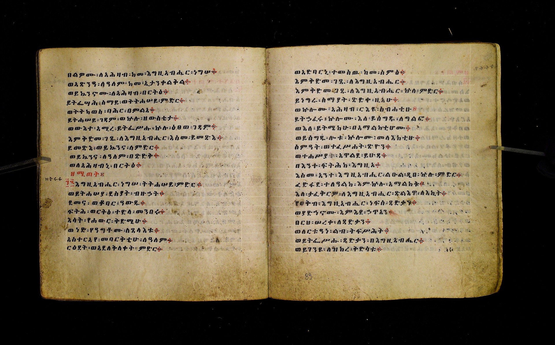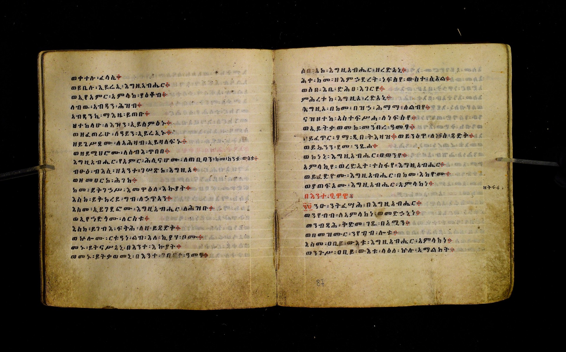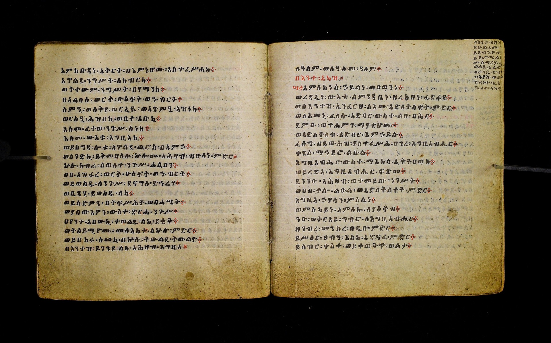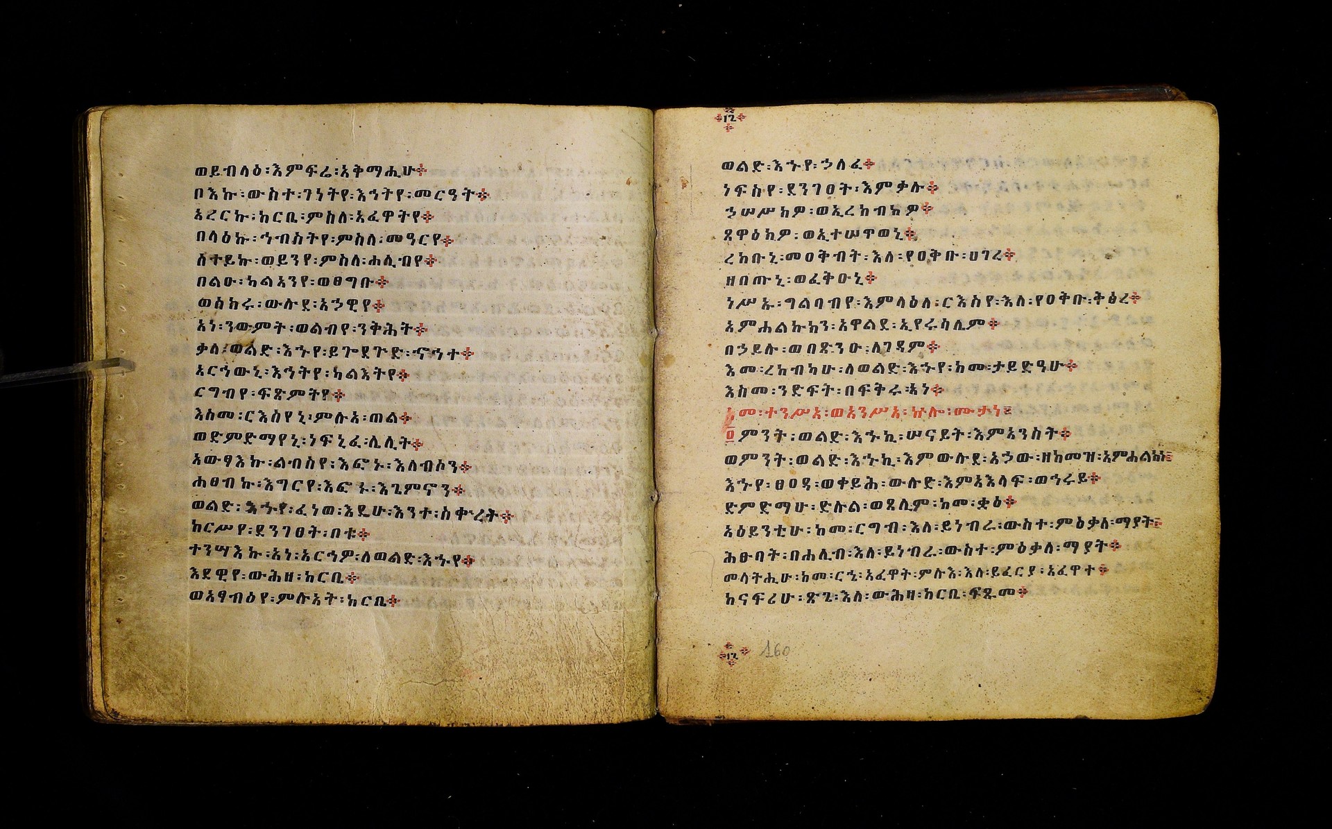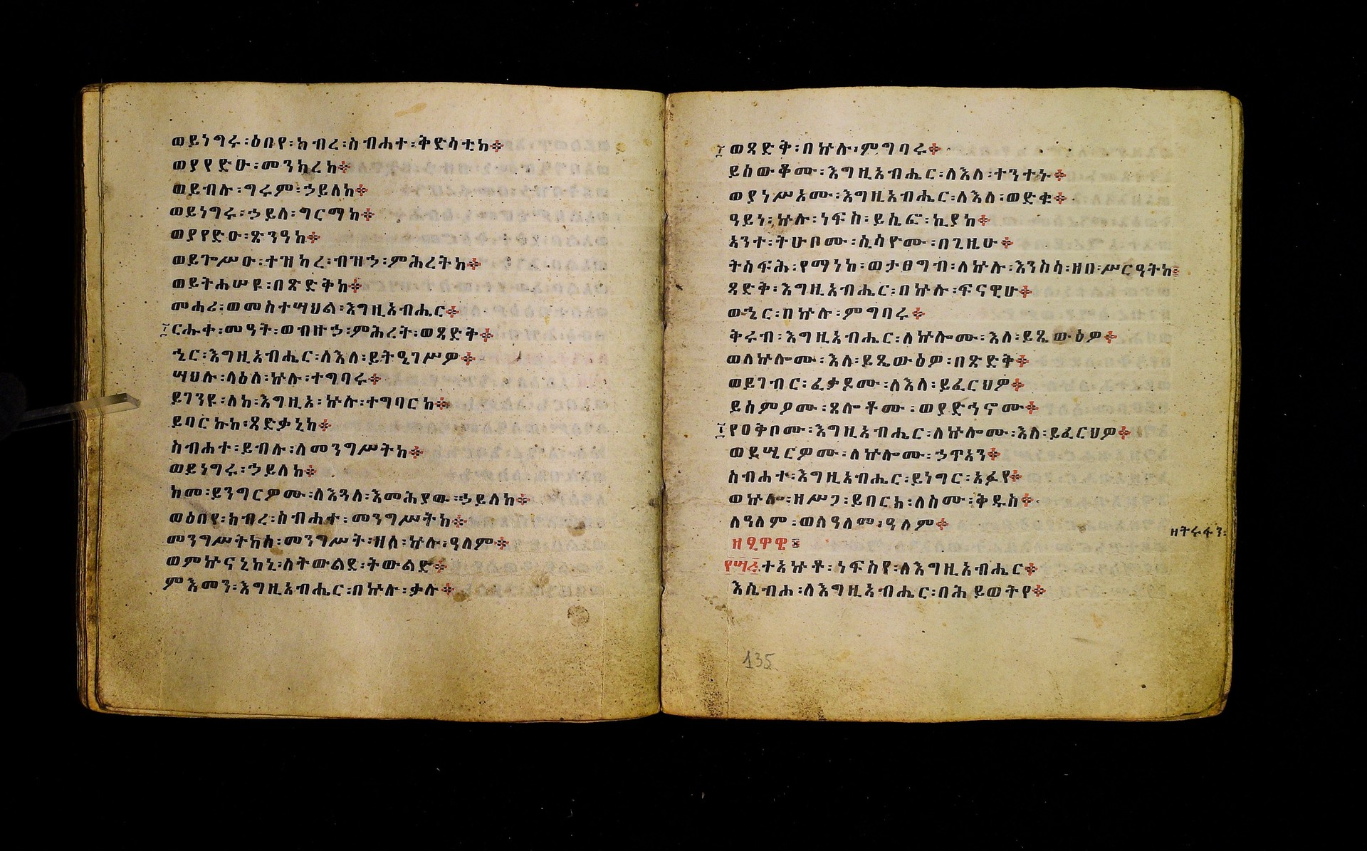 1. F. 2ra–vb: prayer to God, written on two columns in a fine handwriting. Incipit: እገይስ፡ ኀቤከ፡ አምላኪየ፡ አንተ፡ ኩነኒ፡ ረዳእየ፡ ወኩነኒ፡ ምስካይየ። ፀወንየ፡ ወኃይልየ፡ መድኃኒተ፡ ነፍስየ፡ አምላኪየ፡ ወኪያከ፡ ተወከልኩ። ኪያከ፡ ተወከልኩ፡ ኀቤከ፡ ተማኅፀንኩ፡ ኢትግድፈኒ፡ ለዝሉፉ፡ ወኢትርስአኒ፡ በምሕረትከ።. The names of Wäldä Iyäsus e Kidanä Mar[yam] are mentioned on f. 2vb. 2. F. 11r: short mäwaśǝʾt-hymn: ተፈሣሕኩ፡እስመ፡ ይቤሉኒ፡ ቤተ፡ ቤተ፡ እግዚአብሔር፡ ነሐውር። ሶበ፡ ይነቅህ፡ ካህን፡ ተከሥተ፡ ብርሃን፡ ለዓለም፡ ወተቀደሰት፡ ቤተ፡ ክርስቲያን፡ በክ፡ ወበስብሐት፡. The hymn is separated from the main text by a black vertical line and is provided with interlineal musical notation. 3. F. 163va–b: hymn entitled Mäḥaränä ab, “The Father had mercy on us”. The hymn is written in a small script and is provided with interlineal musical notation. Incipit: መሐረነ፡ አብ፡ ሃሌ፡ ሉያ፡ ተሣሃለነ፡ ወልድ፡ ሃሌ፡ ሉያ፡ መንፈስ፡ ቅዱስ፡ መሐሪ፡ ተዘከረነ፡ በሣህልከ። ለከ፡ ንፌኑ፡ ስብሐተ፡ ወለከ፡ ነዓርግ፡ አኰቴተ። መሐረነ፡ መሐሪ፡ ኃጢአተነ፡ አስተስሪ። 4. Ff. 178va–179ra: Ethiopian syllabary, written in a recent and untrained hand and followed by a short text in Amharic and Gǝʿǝz, written in the same hand. Incipit: አሊ፡ ጀረ፡ አመተ፡ ጀርጀረ፡ ነጋሢ፡ ምኒልክ፡ ቍርቍራ፡ ስመ፡ ጥርስ፡ አጥርሲ፡ አንበሳ፡ ጋማማ፡ ነምር፡ ጥፍራማ፡ ጅብ፡ ደደሳማ. |