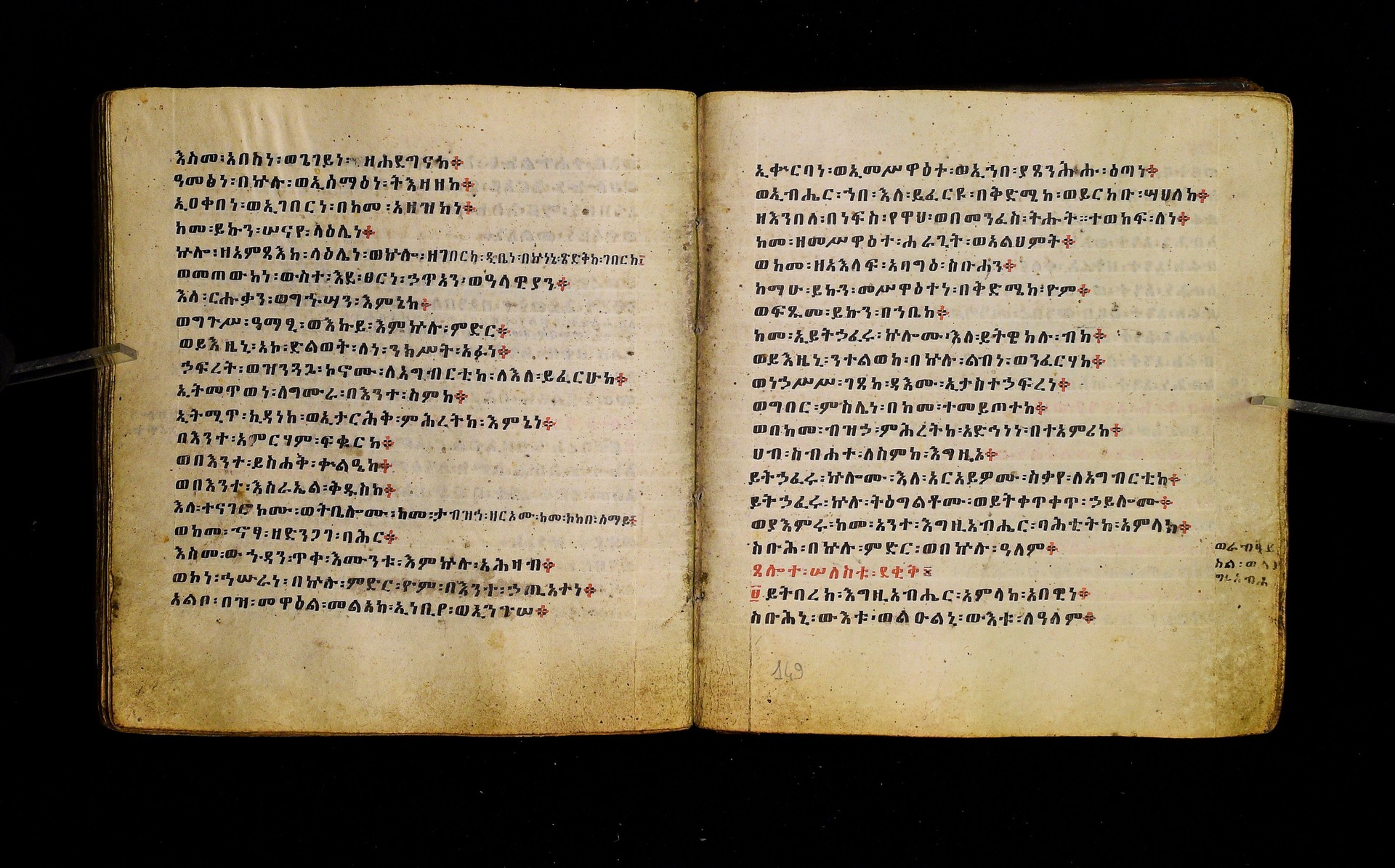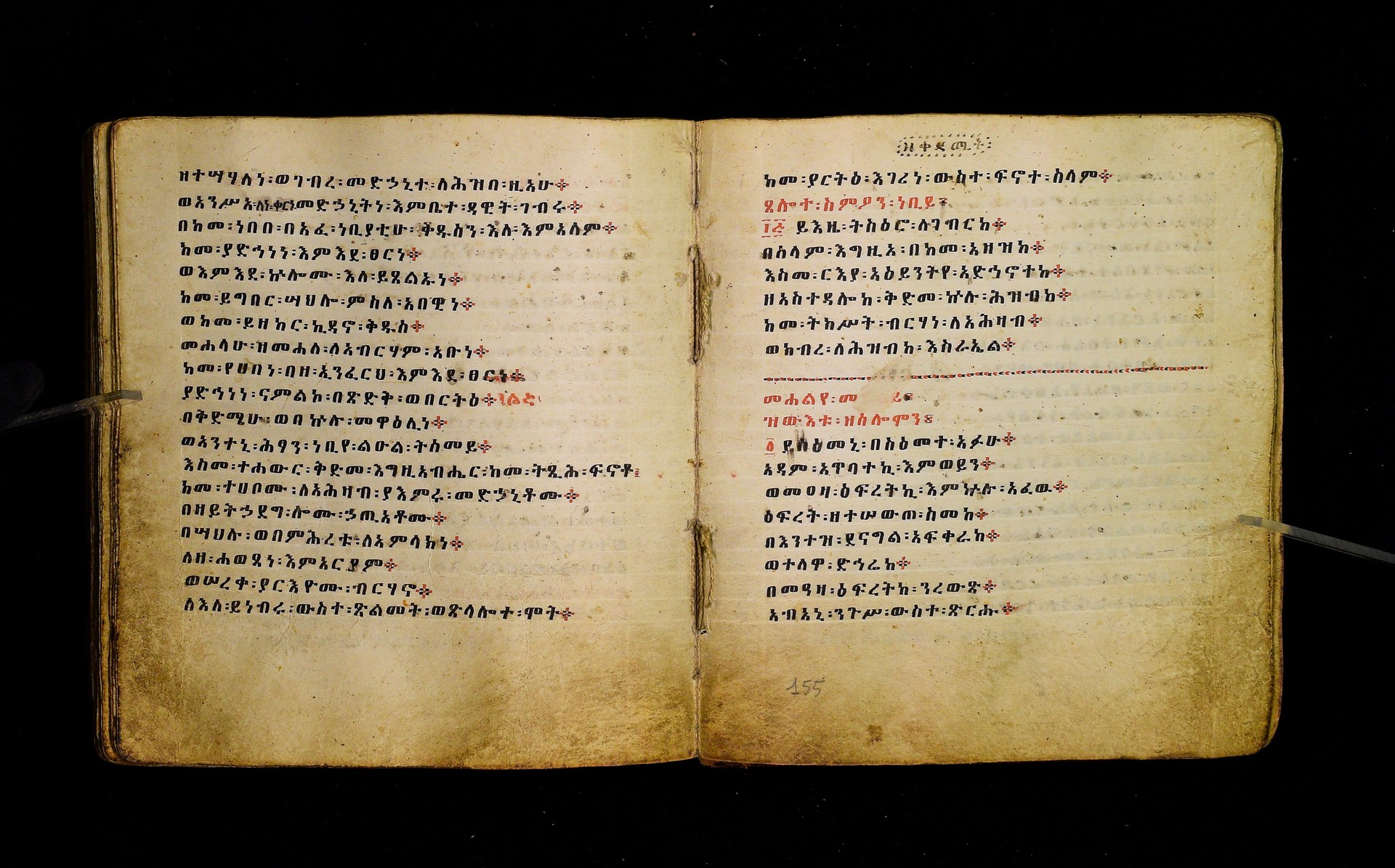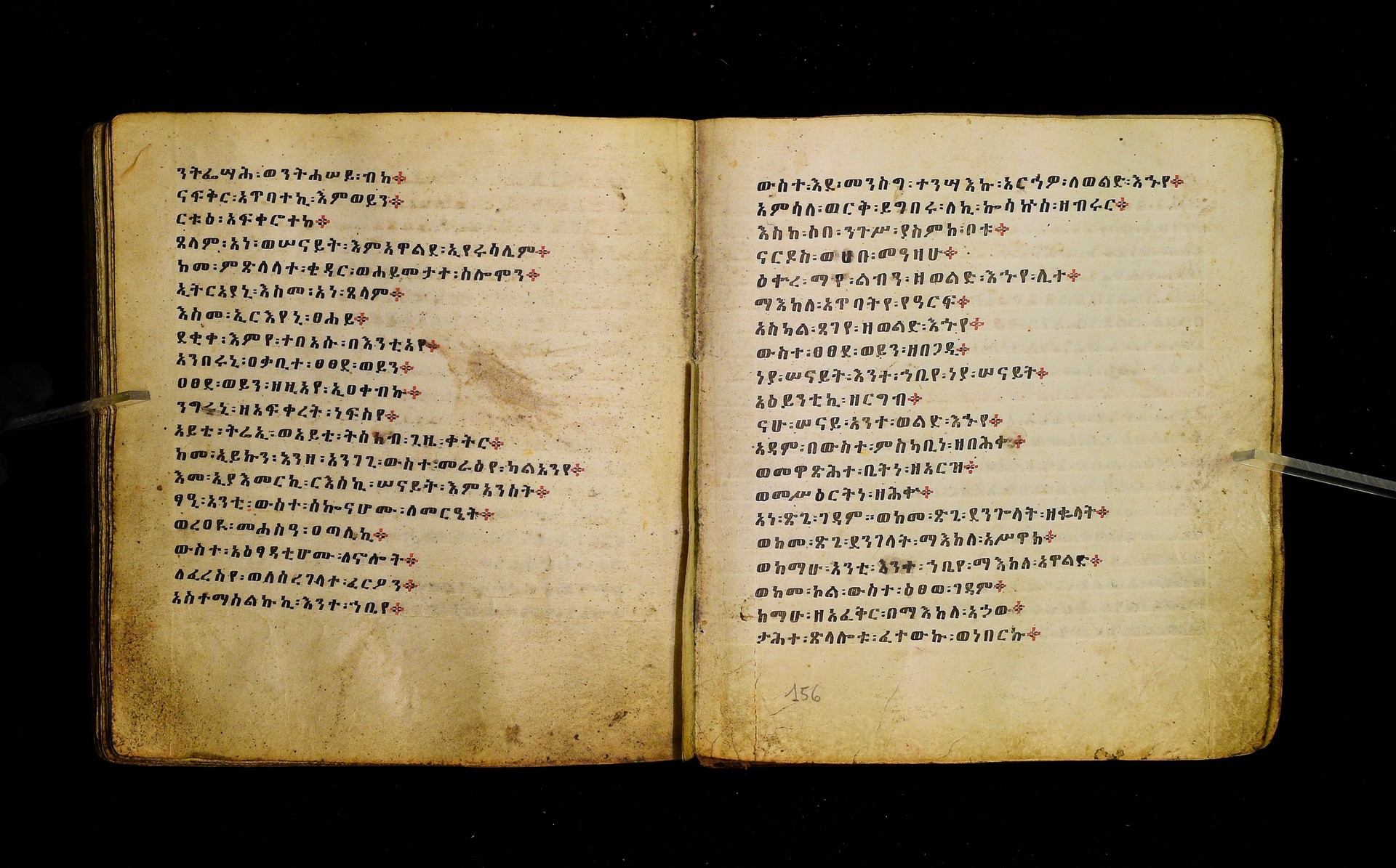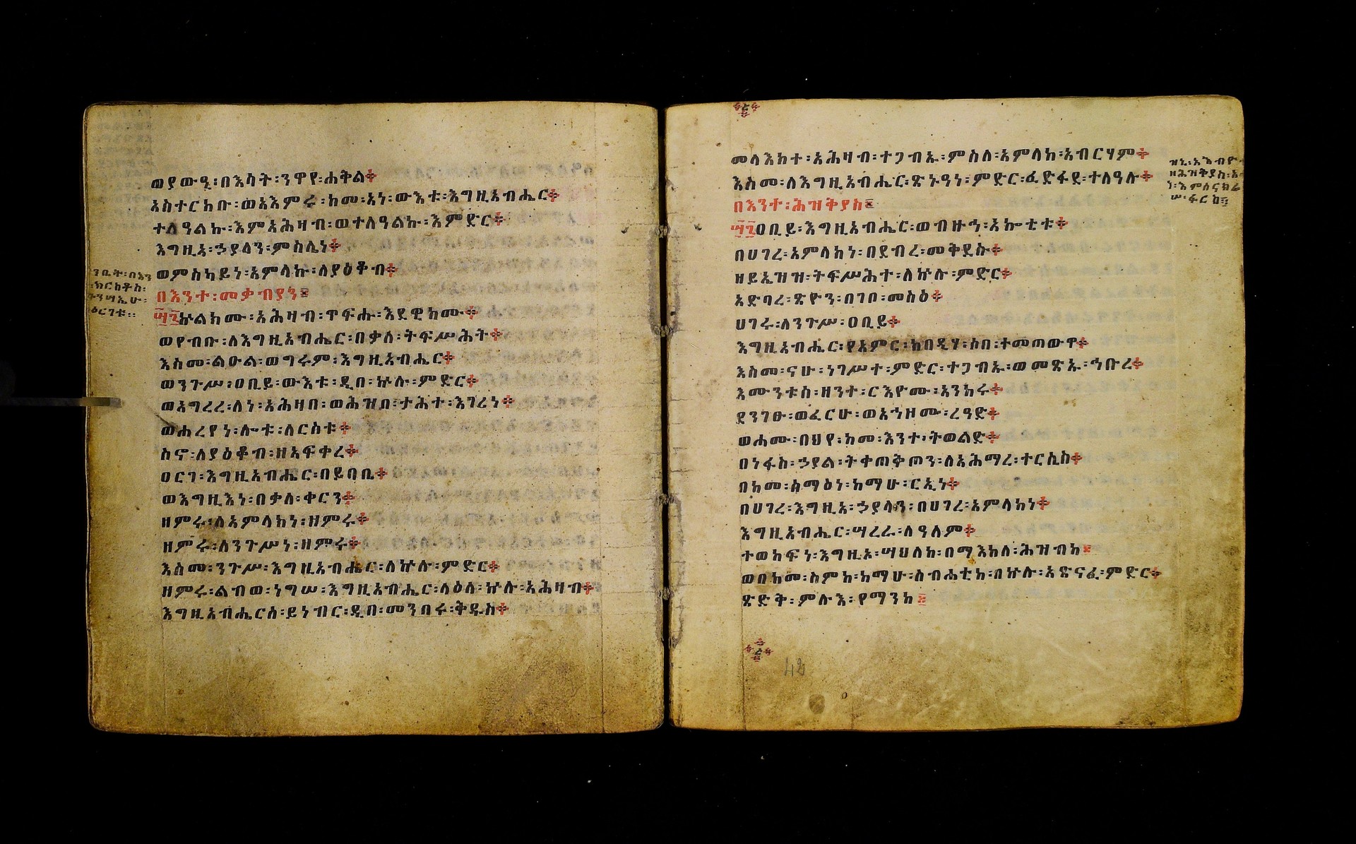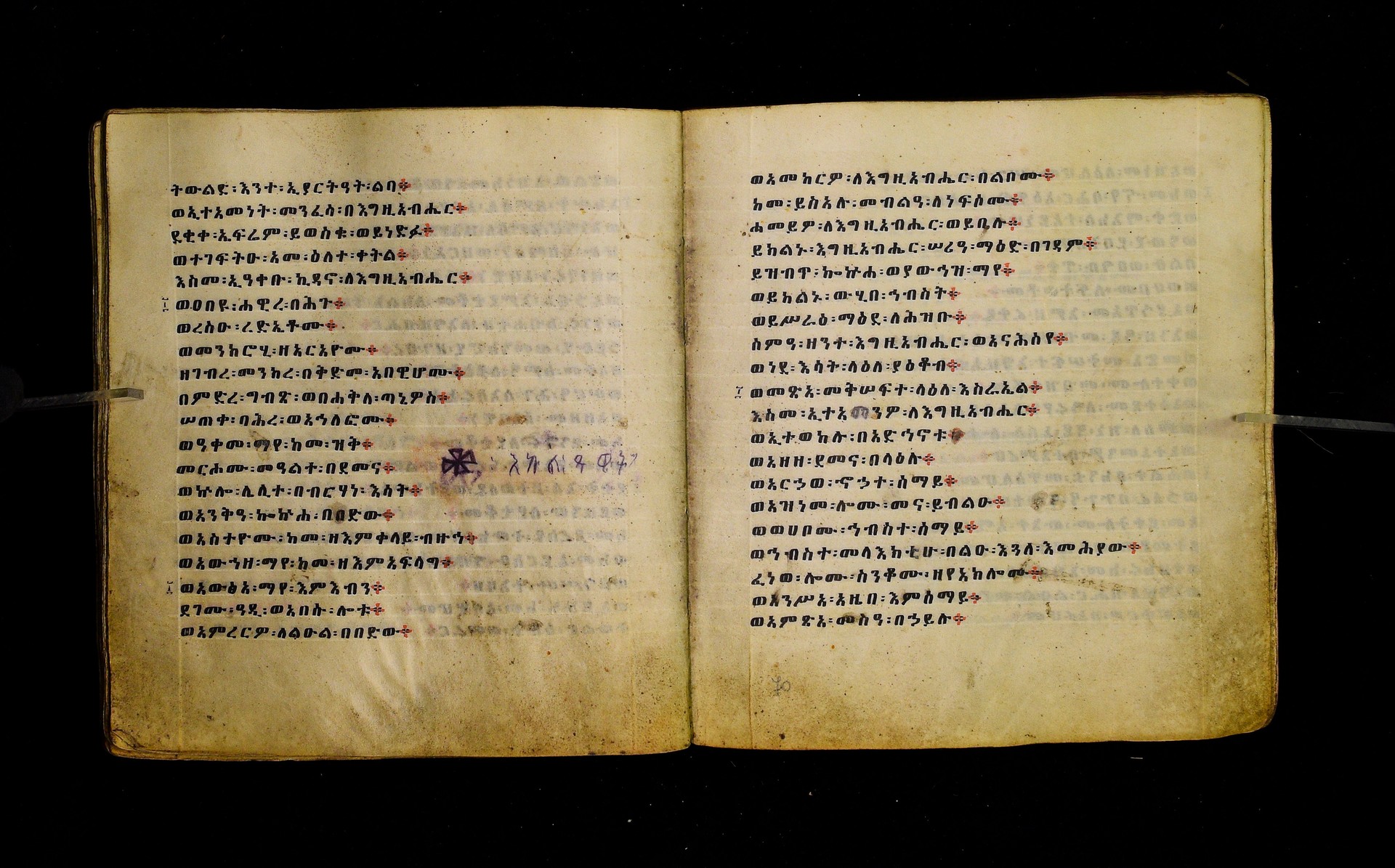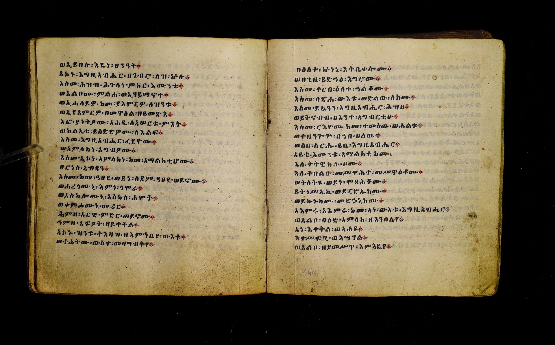 1. F. 2ra–vb: prayer to God, written on two columns in a fine handwriting. Incipit: እገይስ፡ ኀቤከ፡ አምላኪየ፡ አንተ፡ ኩነኒ፡ ረዳእየ፡ ወኩነኒ፡ ምስካይየ። ፀወንየ፡ ወኃይልየ፡ መድኃኒተ፡ ነፍስየ፡ አምላኪየ፡ ወኪያከ፡ ተወከልኩ። ኪያከ፡ ተወከልኩ፡ ኀቤከ፡ ተማኅፀንኩ፡ ኢትግድፈኒ፡ ለዝሉፉ፡ ወኢትርስአኒ፡ በምሕረትከ።. The names of Wäldä Iyäsus e Kidanä Mar[yam] are mentioned on f. 2vb. 2. F. 11r: short mäwaśǝʾt-hymn: ተፈሣሕኩ፡እስመ፡ ይቤሉኒ፡ ቤተ፡ ቤተ፡ እግዚአብሔር፡ ነሐውር። ሶበ፡ ይነቅህ፡ ካህን፡ ተከሥተ፡ ብርሃን፡ ለዓለም፡ ወተቀደሰት፡ ቤተ፡ ክርስቲያን፡ በክ፡ ወበስብሐት፡. The hymn is separated from the main text by a black vertical line and is provided with interlineal musical notation. 3. F. 163va–b: hymn entitled Mäḥaränä ab, “The Father had mercy on us”. The hymn is written in a small script and is provided with interlineal musical notation. Incipit: መሐረነ፡ አብ፡ ሃሌ፡ ሉያ፡ ተሣሃለነ፡ ወልድ፡ ሃሌ፡ ሉያ፡ መንፈስ፡ ቅዱስ፡ መሐሪ፡ ተዘከረነ፡ በሣህልከ። ለከ፡ ንፌኑ፡ ስብሐተ፡ ወለከ፡ ነዓርግ፡ አኰቴተ። መሐረነ፡ መሐሪ፡ ኃጢአተነ፡ አስተስሪ። 4. Ff. 178va–179ra: Ethiopian syllabary, written in a recent and untrained hand and followed by a short text in Amharic and Gǝʿǝz, written in the same hand. Incipit: አሊ፡ ጀረ፡ አመተ፡ ጀርጀረ፡ ነጋሢ፡ ምኒልክ፡ ቍርቍራ፡ ስመ፡ ጥርስ፡ አጥርሲ፡ አንበሳ፡ ጋማማ፡ ነምር፡ ጥፍራማ፡ ጅብ፡ ደደሳማ. |