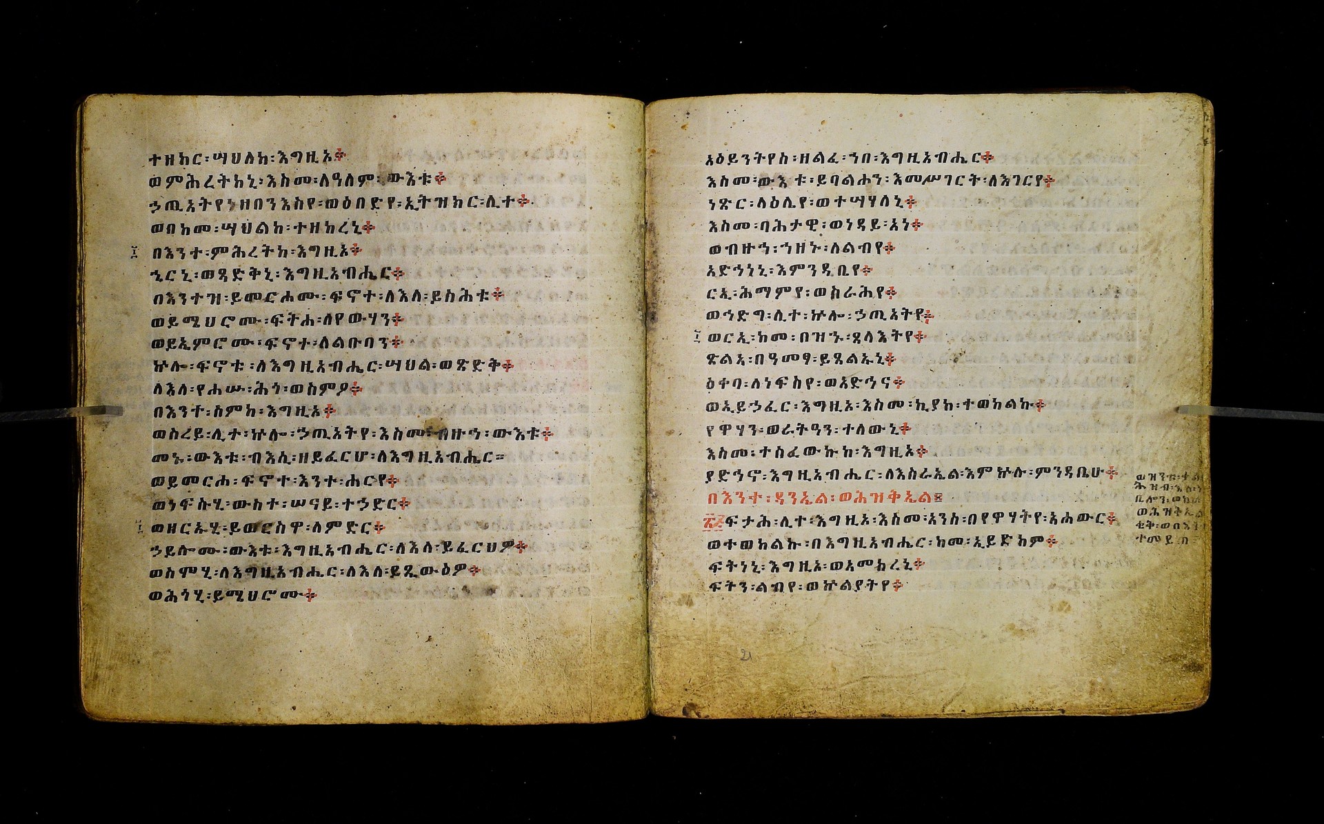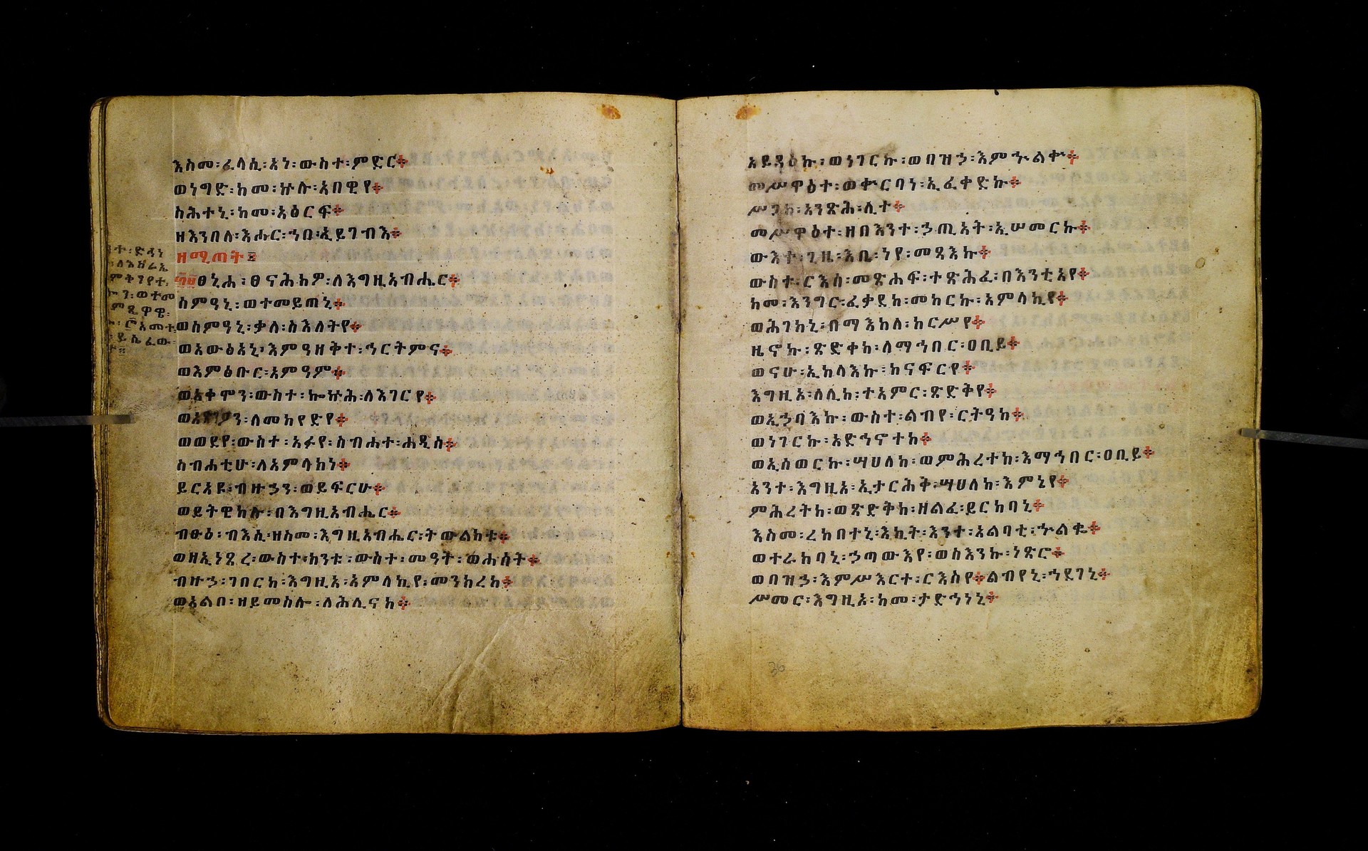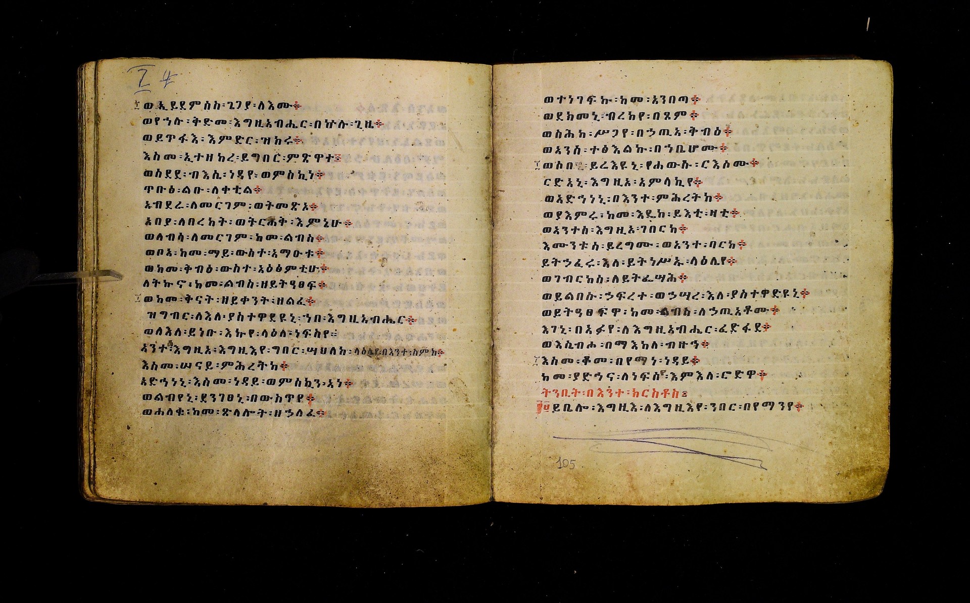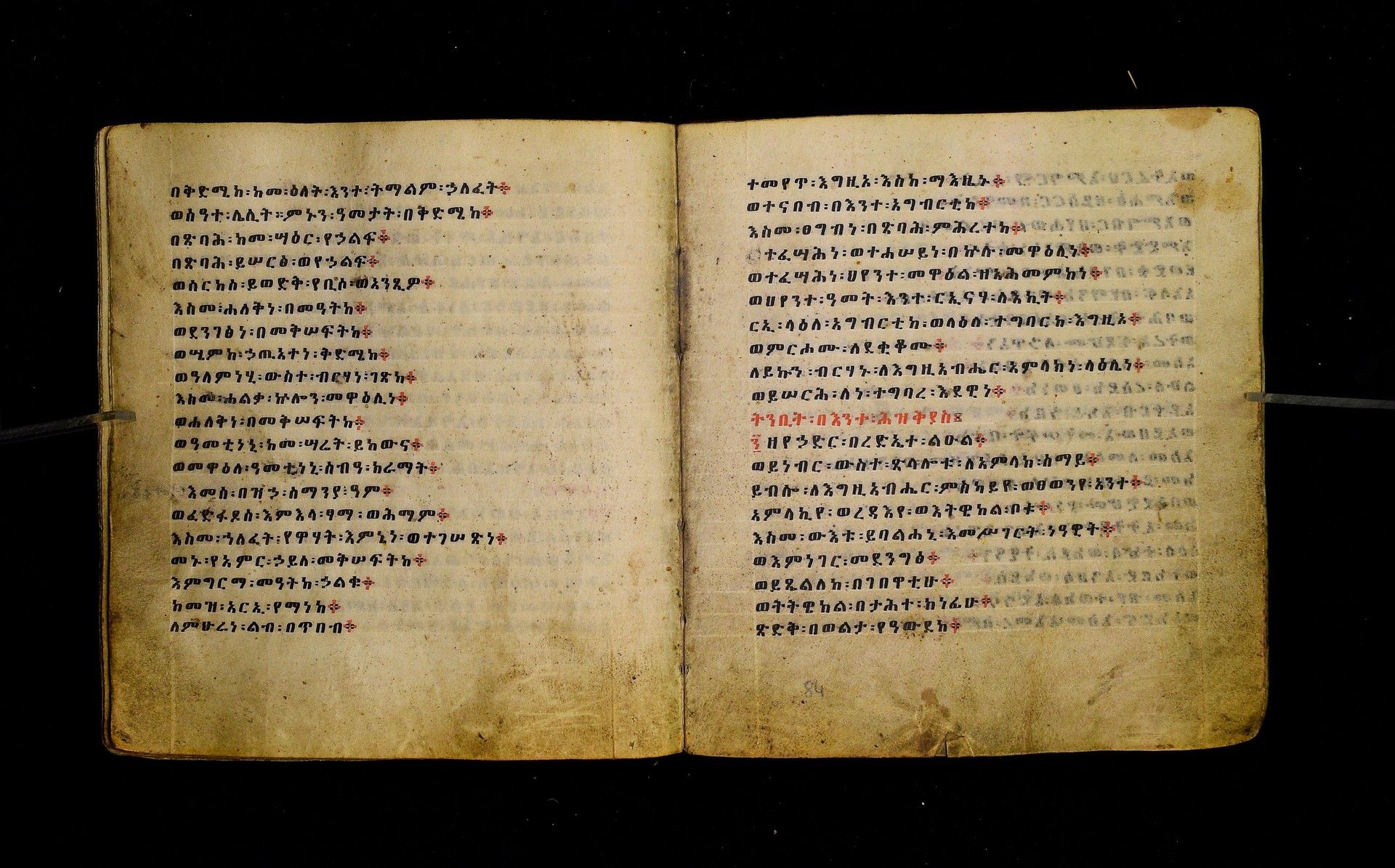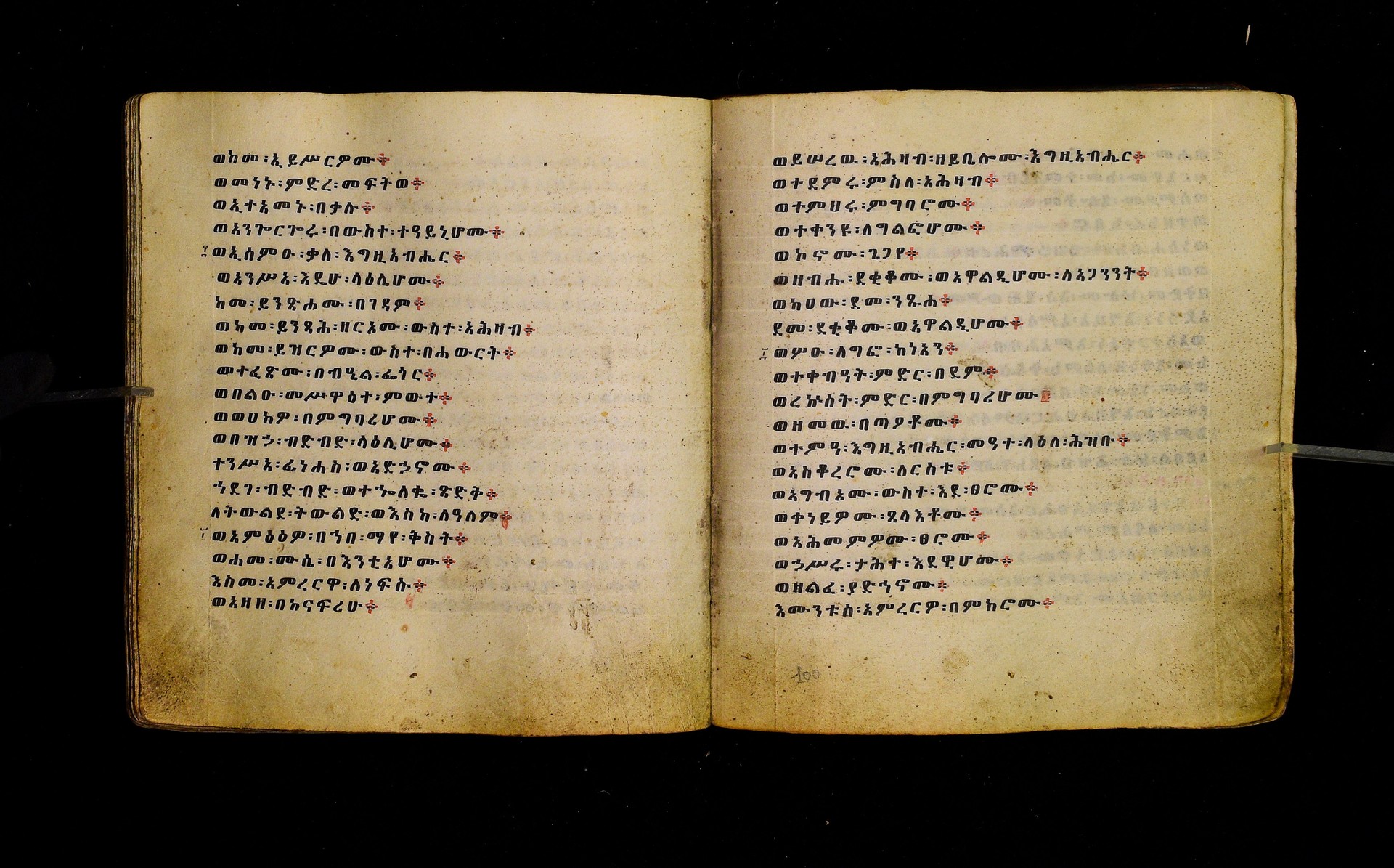 1. F. 2ra–vb: prayer to God, written on two columns in a fine handwriting. Incipit: እገይስ፡ ኀቤከ፡ አምላኪየ፡ አንተ፡ ኩነኒ፡ ረዳእየ፡ ወኩነኒ፡ ምስካይየ። ፀወንየ፡ ወኃይልየ፡ መድኃኒተ፡ ነፍስየ፡ አምላኪየ፡ ወኪያከ፡ ተወከልኩ። ኪያከ፡ ተወከልኩ፡ ኀቤከ፡ ተማኅፀንኩ፡ ኢትግድፈኒ፡ ለዝሉፉ፡ ወኢትርስአኒ፡ በምሕረትከ።. The names of Wäldä Iyäsus e Kidanä Mar[yam] are mentioned on f. 2vb. 2. F. 11r: short mäwaśǝʾt-hymn: ተፈሣሕኩ፡እስመ፡ ይቤሉኒ፡ ቤተ፡ ቤተ፡ እግዚአብሔር፡ ነሐውር። ሶበ፡ ይነቅህ፡ ካህን፡ ተከሥተ፡ ብርሃን፡ ለዓለም፡ ወተቀደሰት፡ ቤተ፡ ክርስቲያን፡ በክ፡ ወበስብሐት፡. The hymn is separated from the main text by a black vertical line and is provided with interlineal musical notation. 3. F. 163va–b: hymn entitled Mäḥaränä ab, “The Father had mercy on us”. The hymn is written in a small script and is provided with interlineal musical notation. Incipit: መሐረነ፡ አብ፡ ሃሌ፡ ሉያ፡ ተሣሃለነ፡ ወልድ፡ ሃሌ፡ ሉያ፡ መንፈስ፡ ቅዱስ፡ መሐሪ፡ ተዘከረነ፡ በሣህልከ። ለከ፡ ንፌኑ፡ ስብሐተ፡ ወለከ፡ ነዓርግ፡ አኰቴተ። መሐረነ፡ መሐሪ፡ ኃጢአተነ፡ አስተስሪ። 4. Ff. 178va–179ra: Ethiopian syllabary, written in a recent and untrained hand and followed by a short text in Amharic and Gǝʿǝz, written in the same hand. Incipit: አሊ፡ ጀረ፡ አመተ፡ ጀርጀረ፡ ነጋሢ፡ ምኒልክ፡ ቍርቍራ፡ ስመ፡ ጥርስ፡ አጥርሲ፡ አንበሳ፡ ጋማማ፡ ነምር፡ ጥፍራማ፡ ጅብ፡ ደደሳማ. |