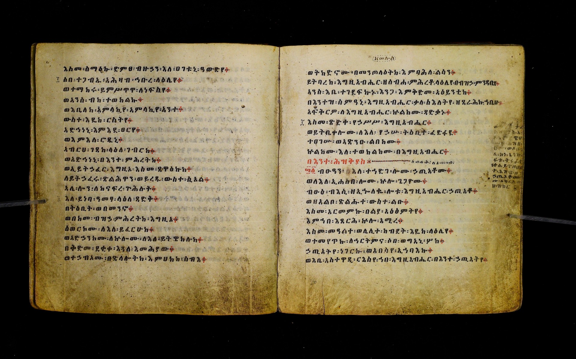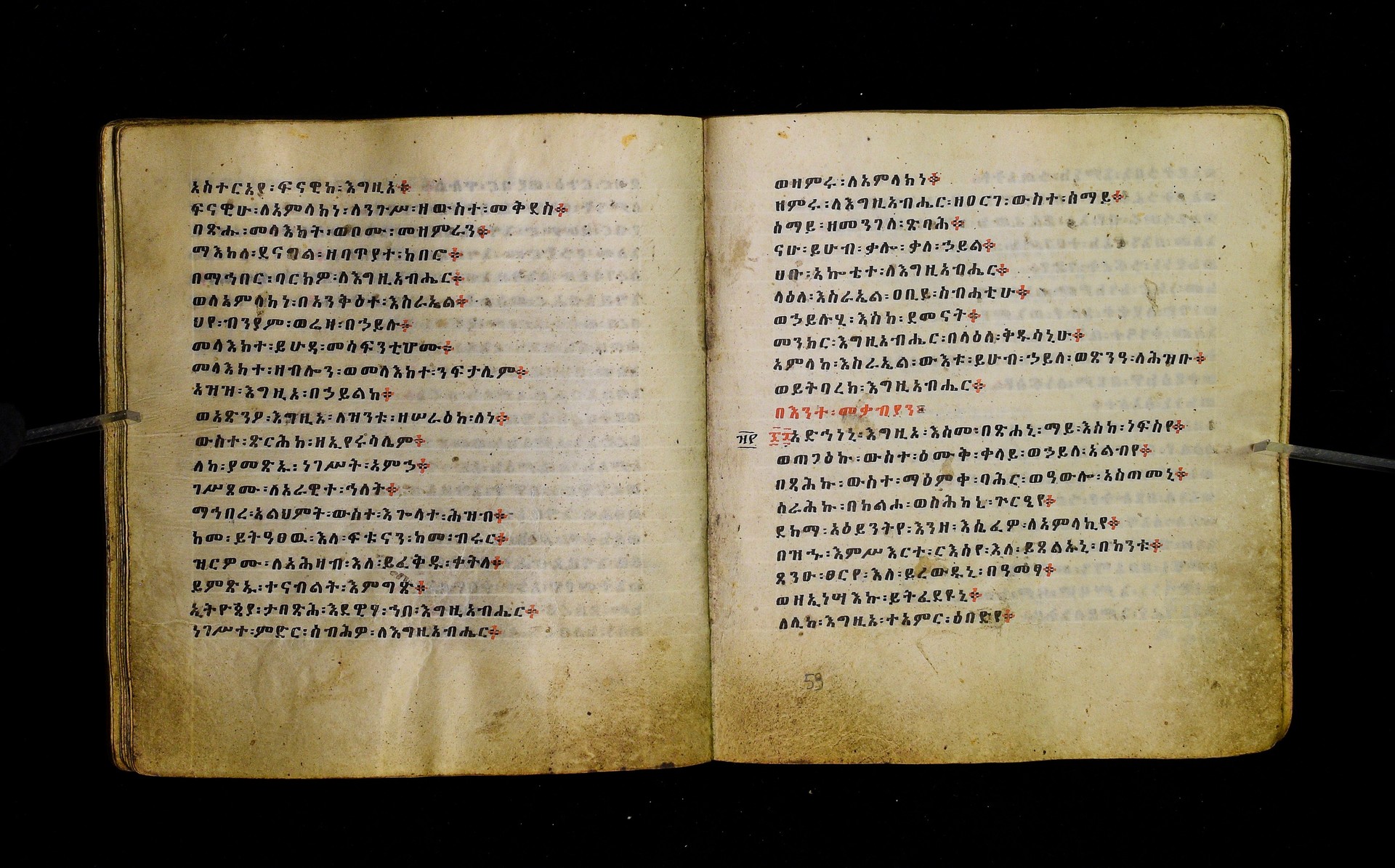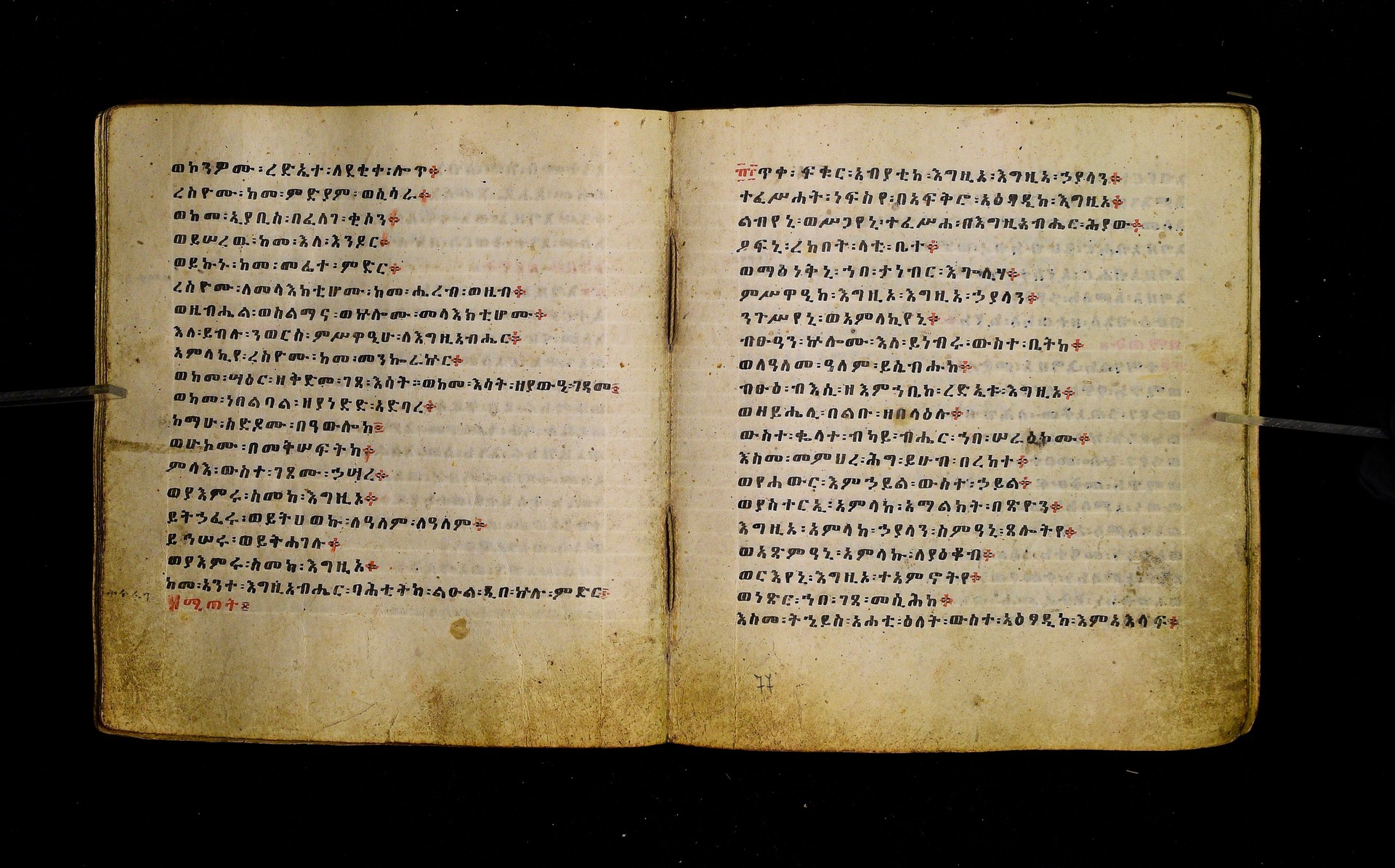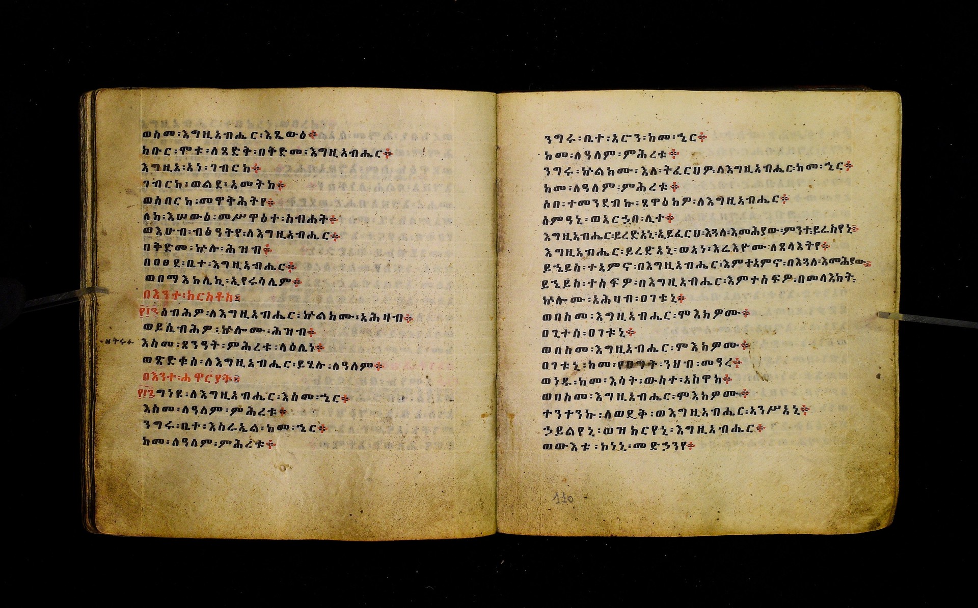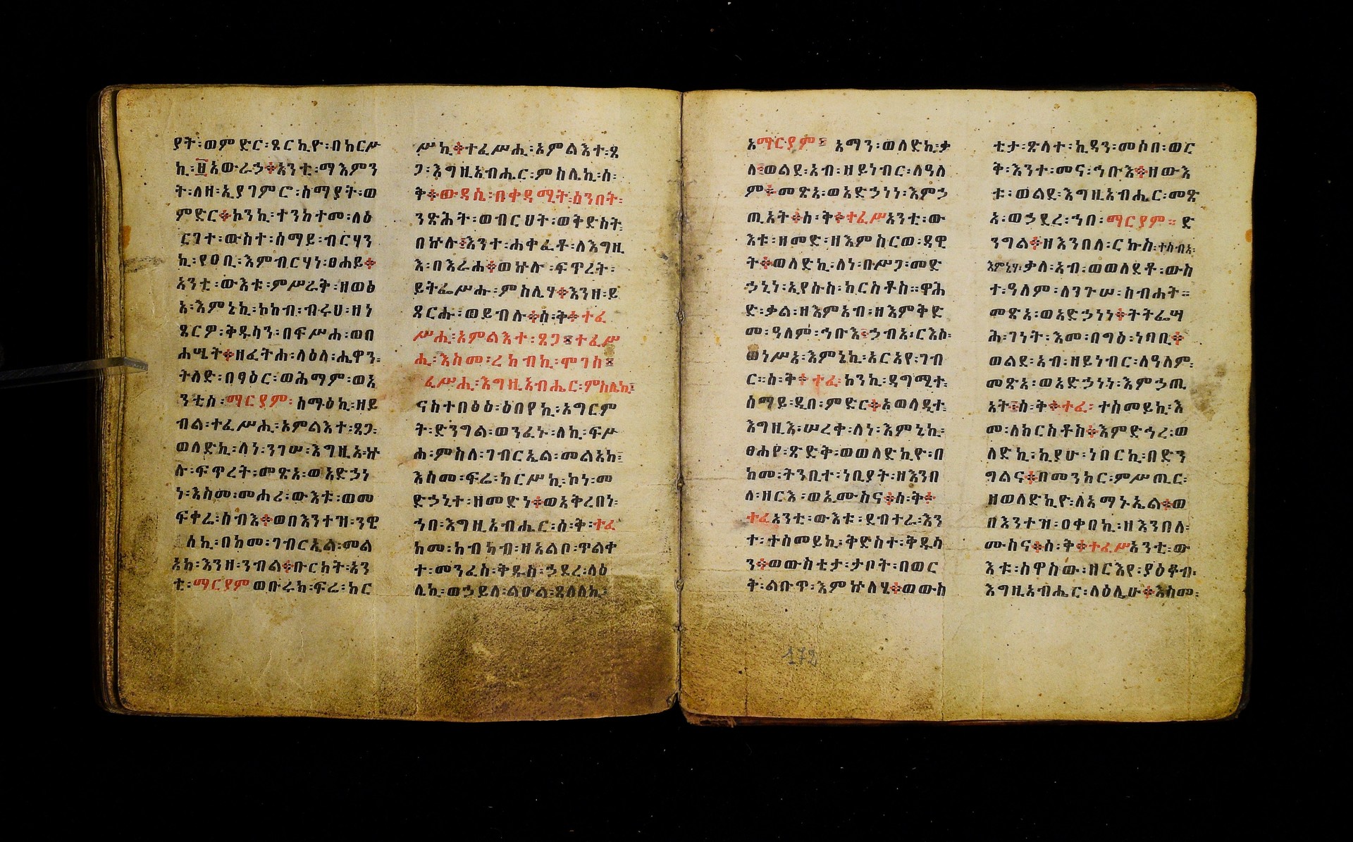1. F. 2ra–vb: prayer to God, written on two columns in a fine handwriting. Incipit: እገይስ፡ ኀቤከ፡ አምላኪየ፡ አንተ፡ ኩነኒ፡ ረዳእየ፡ ወኩነኒ፡ ምስካይየ። ፀወንየ፡ ወኃይልየ፡ መድኃኒተ፡ ነፍስየ፡ አምላኪየ፡ ወኪያከ፡ ተወከልኩ። ኪያከ፡ ተወከልኩ፡ ኀቤከ፡ ተማኅፀንኩ፡ ኢትግድፈኒ፡ ለዝሉፉ፡ ወኢትርስአኒ፡ በምሕረትከ።. The names of Wäldä Iyäsus e Kidanä Mar[yam] are mentioned on f. 2vb. 2. F. 11r: short mäwaśǝʾt-hymn: ተፈሣሕኩ፡እስመ፡ ይቤሉኒ፡ ቤተ፡ ቤተ፡ እግዚአብሔር፡ ነሐውር። ሶበ፡ ይነቅህ፡ ካህን፡ ተከሥተ፡ ብርሃን፡ ለዓለም፡ ወተቀደሰት፡ ቤተ፡ ክርስቲያን፡ በክ፡ ወበስብሐት፡. The hymn is separated from the main text by a black vertical line and is provided with interlineal musical notation. 3. F. 163va–b: hymn entitled Mäḥaränä ab, “The Father had mercy on us”. The hymn is written in a small script and is provided with interlineal musical notation. Incipit: መሐረነ፡ አብ፡ ሃሌ፡ ሉያ፡ ተሣሃለነ፡ ወልድ፡ ሃሌ፡ ሉያ፡ መንፈስ፡ ቅዱስ፡ መሐሪ፡ ተዘከረነ፡ በሣህልከ። ለከ፡ ንፌኑ፡ ስብሐተ፡ ወለከ፡ ነዓርግ፡ አኰቴተ። መሐረነ፡ መሐሪ፡ ኃጢአተነ፡ አስተስሪ። 4. Ff. 178va–179ra: Ethiopian syllabary, written in a recent and untrained hand and followed by a short text in Amharic and Gǝʿǝz, written in the same hand. Incipit: አሊ፡ ጀረ፡ አመተ፡ ጀርጀረ፡ ነጋሢ፡ ምኒልክ፡ ቍርቍራ፡ ስመ፡ ጥርስ፡ አጥርሲ፡ አንበሳ፡ ጋማማ፡ ነምር፡ ጥፍራማ፡ ጅብ፡ ደደሳማ. |