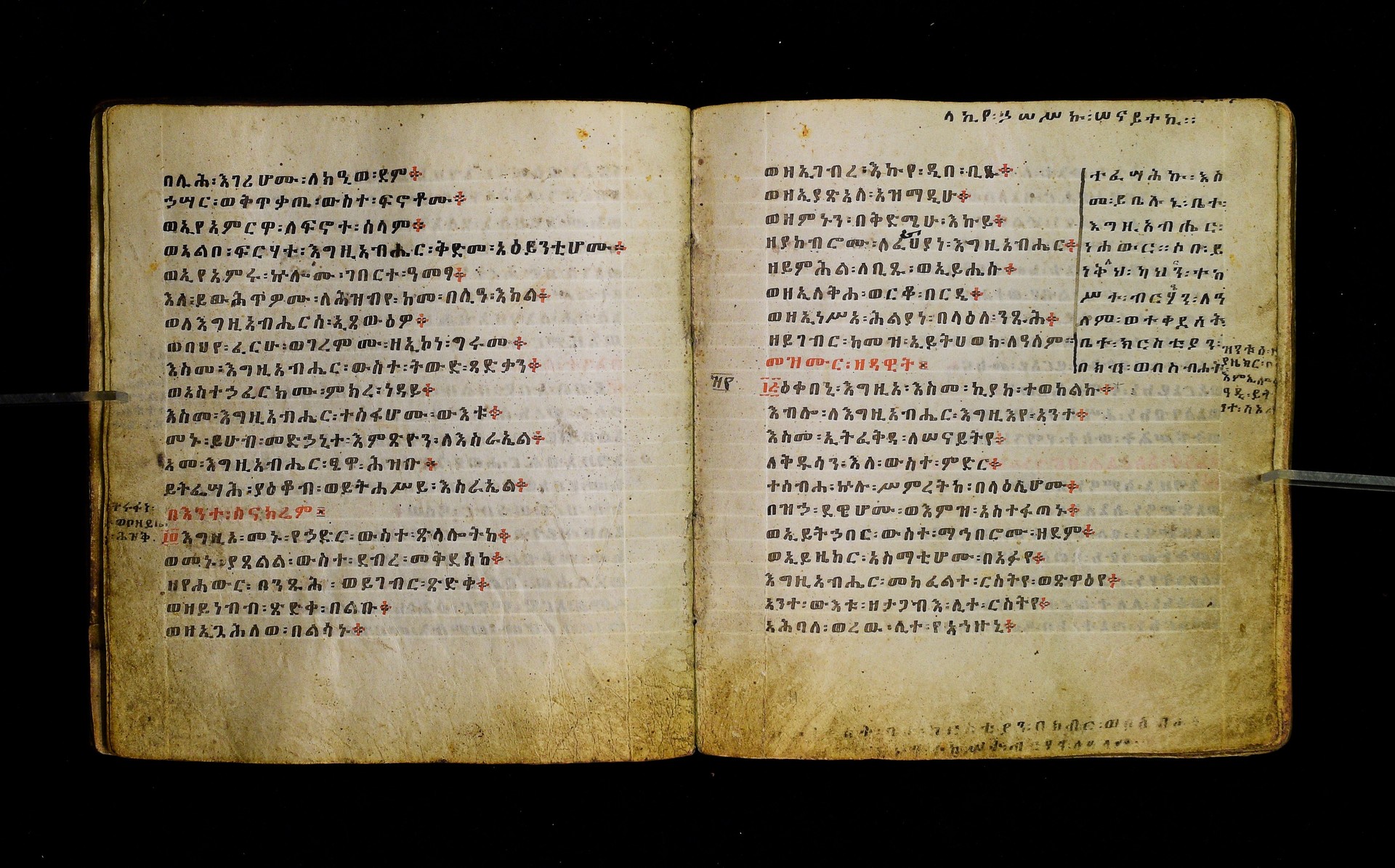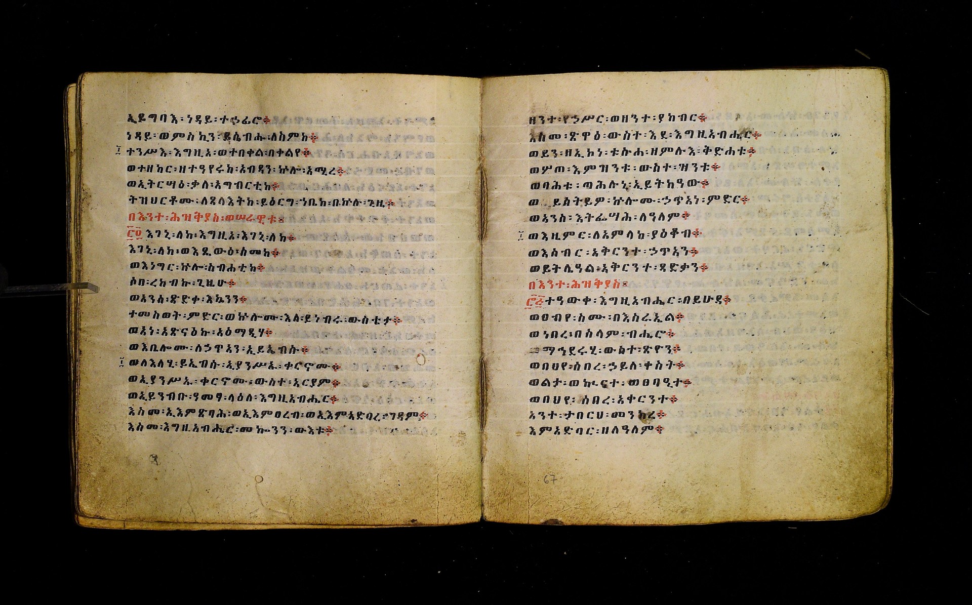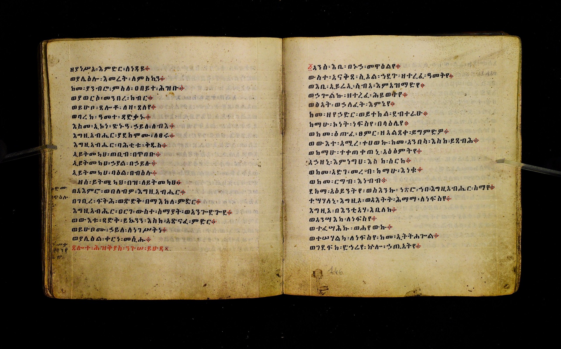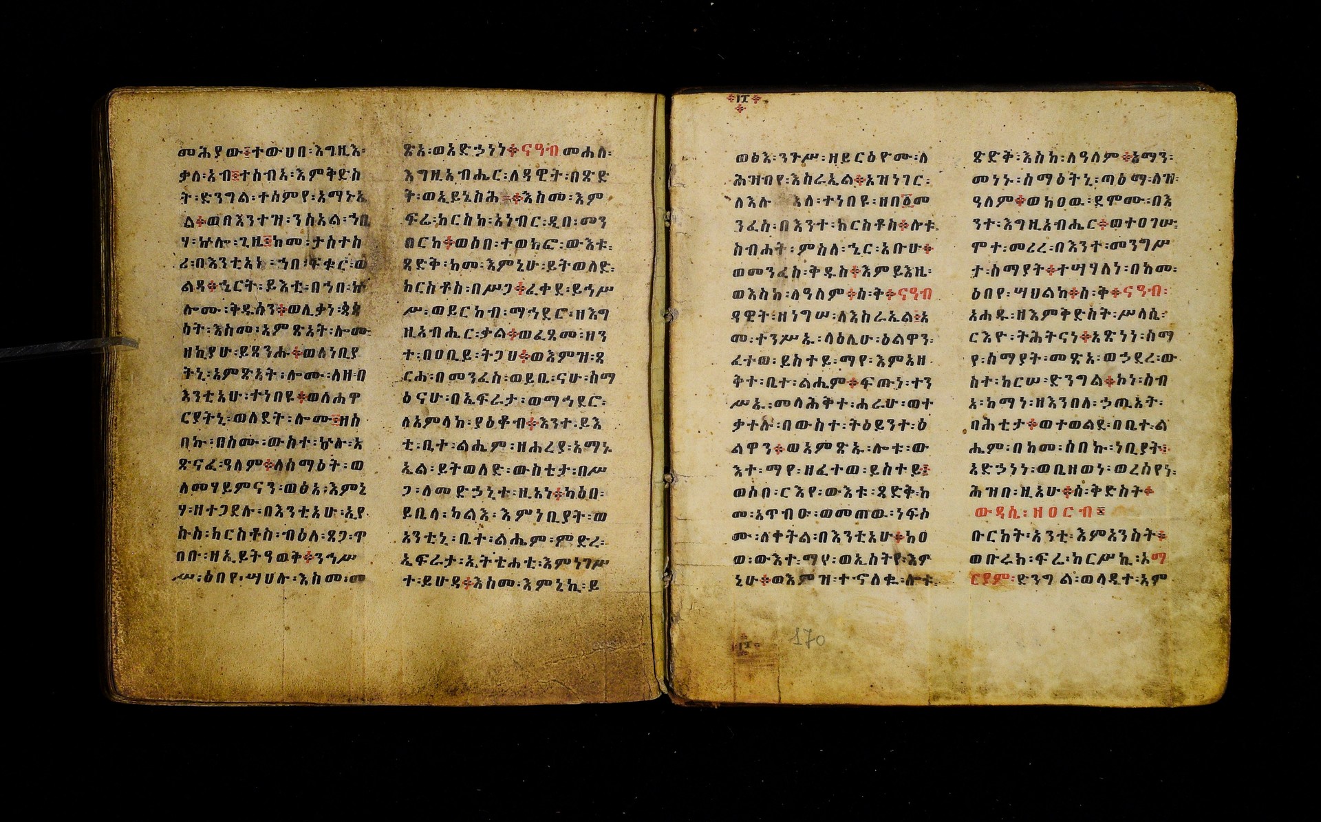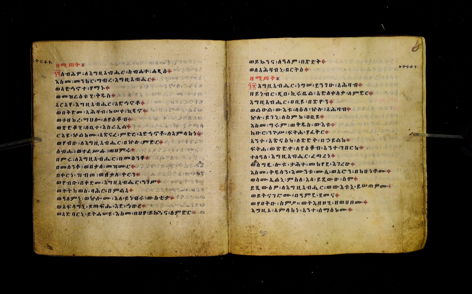 1. F. 2ra–vb: prayer to God, written on two columns in a fine handwriting. Incipit: እገይስ፡ ኀቤከ፡ አምላኪየ፡ አንተ፡ ኩነኒ፡ ረዳእየ፡ ወኩነኒ፡ ምስካይየ። ፀወንየ፡ ወኃይልየ፡ መድኃኒተ፡ ነፍስየ፡ አምላኪየ፡ ወኪያከ፡ ተወከልኩ። ኪያከ፡ ተወከልኩ፡ ኀቤከ፡ ተማኅፀንኩ፡ ኢትግድፈኒ፡ ለዝሉፉ፡ ወኢትርስአኒ፡ በምሕረትከ።. The names of Wäldä Iyäsus e Kidanä Mar[yam] are mentioned on f. 2vb. 2. F. 11r: short mäwaśǝʾt-hymn: ተፈሣሕኩ፡እስመ፡ ይቤሉኒ፡ ቤተ፡ ቤተ፡ እግዚአብሔር፡ ነሐውር። ሶበ፡ ይነቅህ፡ ካህን፡ ተከሥተ፡ ብርሃን፡ ለዓለም፡ ወተቀደሰት፡ ቤተ፡ ክርስቲያን፡ በክ፡ ወበስብሐት፡. The hymn is separated from the main text by a black vertical line and is provided with interlineal musical notation. 3. F. 163va–b: hymn entitled Mäḥaränä ab, “The Father had mercy on us”. The hymn is written in a small script and is provided with interlineal musical notation. Incipit: መሐረነ፡ አብ፡ ሃሌ፡ ሉያ፡ ተሣሃለነ፡ ወልድ፡ ሃሌ፡ ሉያ፡ መንፈስ፡ ቅዱስ፡ መሐሪ፡ ተዘከረነ፡ በሣህልከ። ለከ፡ ንፌኑ፡ ስብሐተ፡ ወለከ፡ ነዓርግ፡ አኰቴተ። መሐረነ፡ መሐሪ፡ ኃጢአተነ፡ አስተስሪ። 4. Ff. 178va–179ra: Ethiopian syllabary, written in a recent and untrained hand and followed by a short text in Amharic and Gǝʿǝz, written in the same hand. Incipit: አሊ፡ ጀረ፡ አመተ፡ ጀርጀረ፡ ነጋሢ፡ ምኒልክ፡ ቍርቍራ፡ ስመ፡ ጥርስ፡ አጥርሲ፡ አንበሳ፡ ጋማማ፡ ነምር፡ ጥፍራማ፡ ጅብ፡ ደደሳማ. |