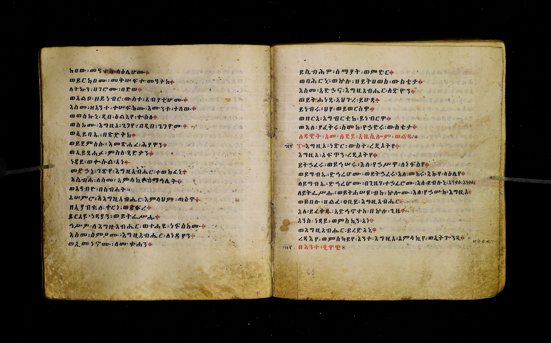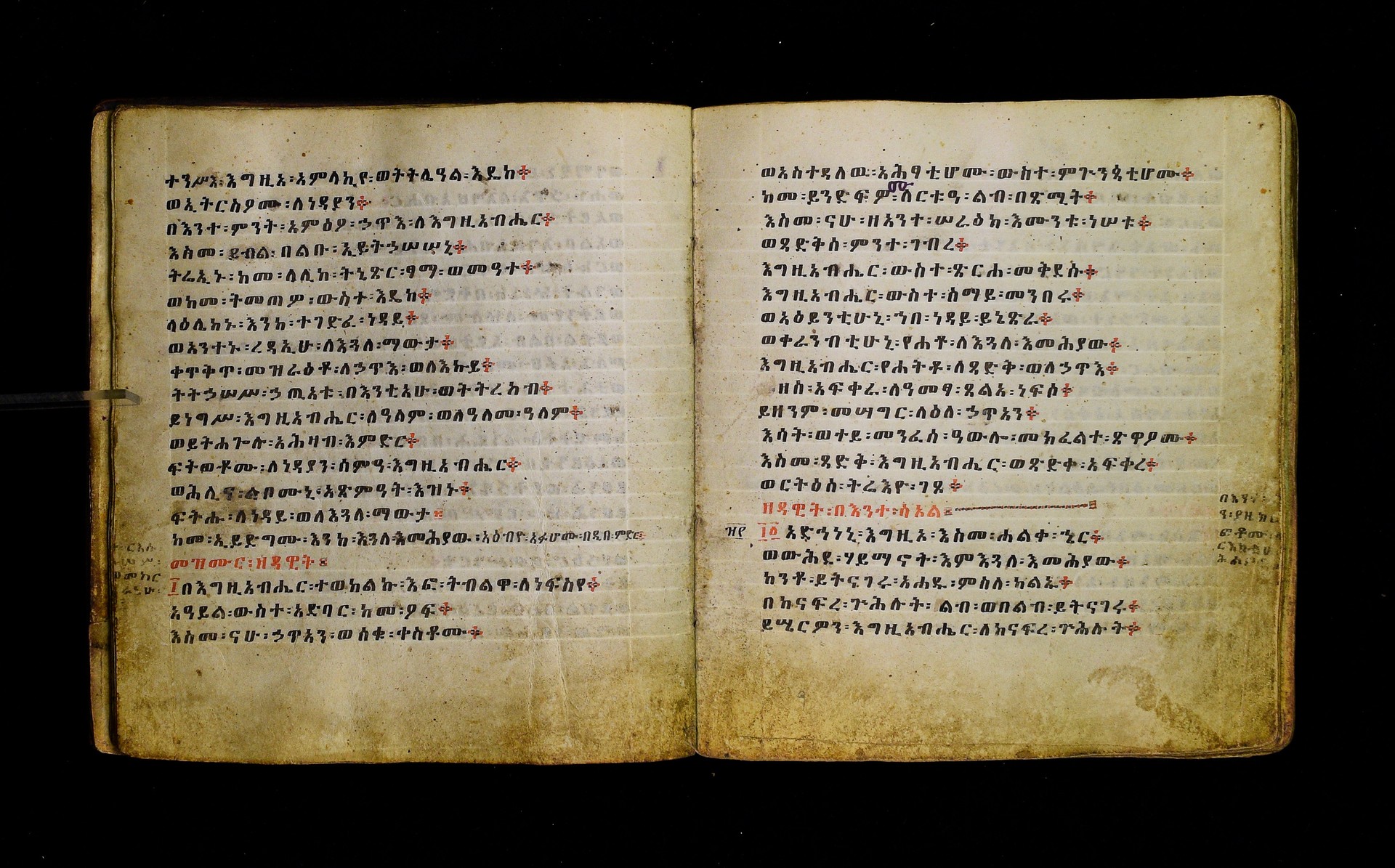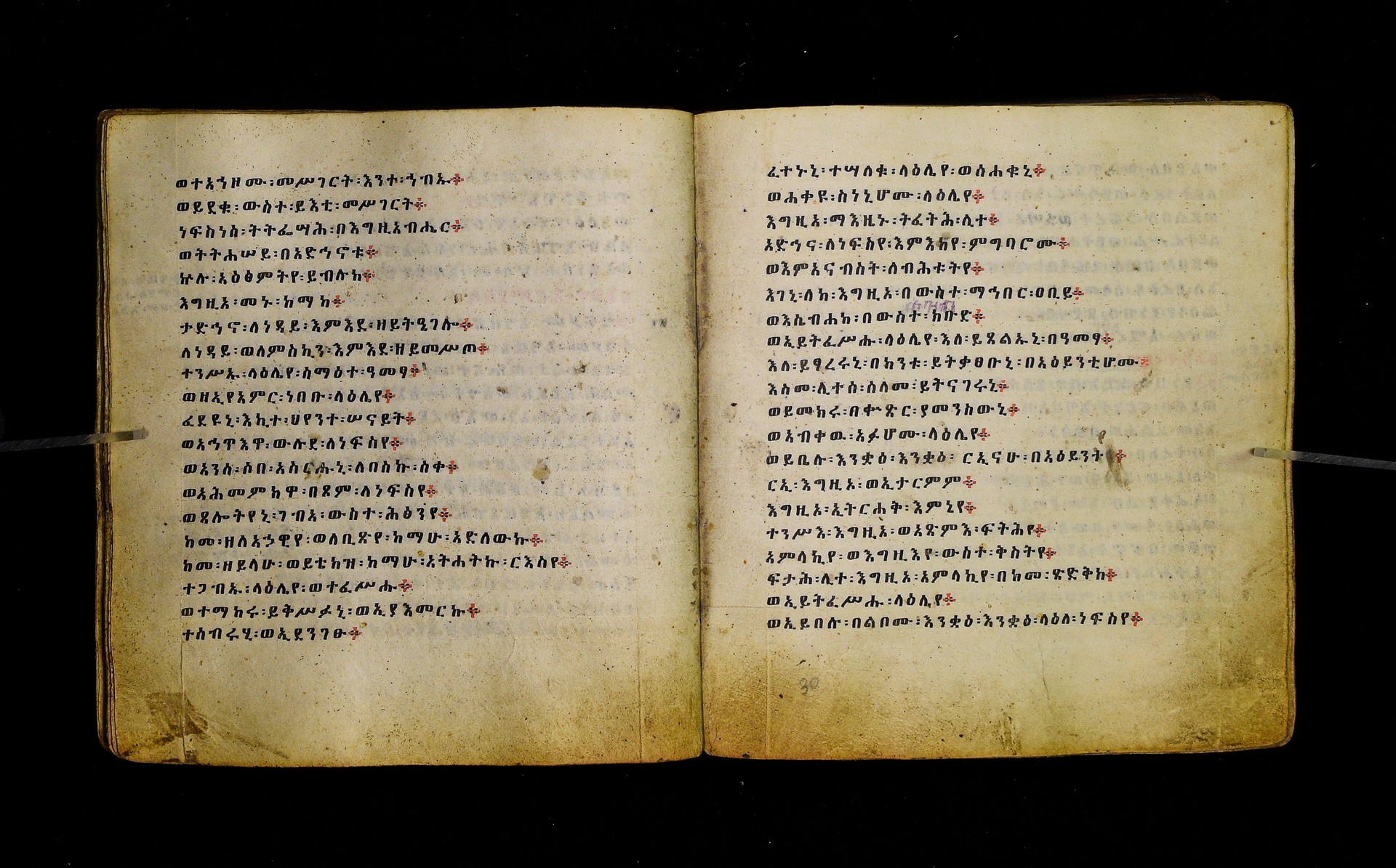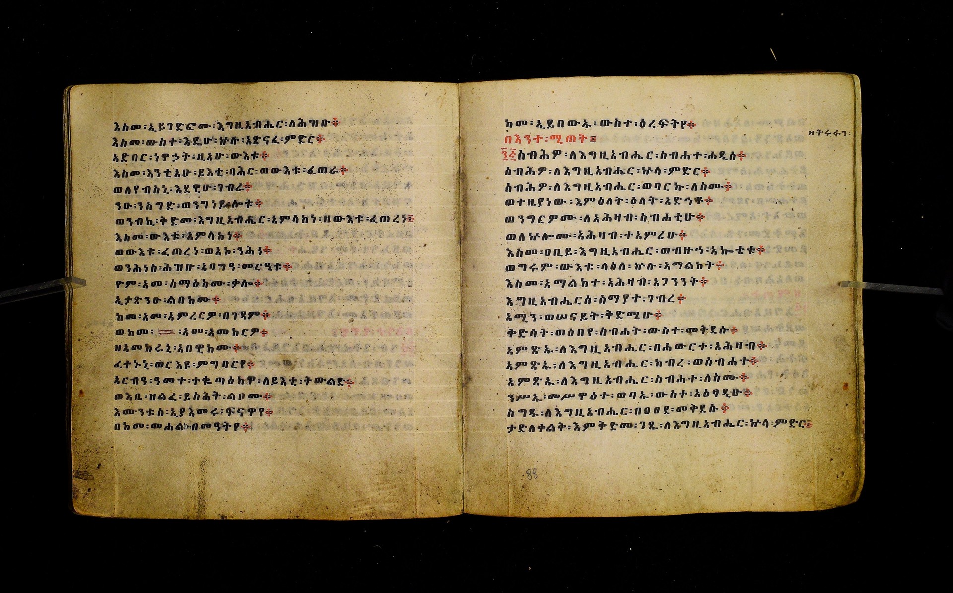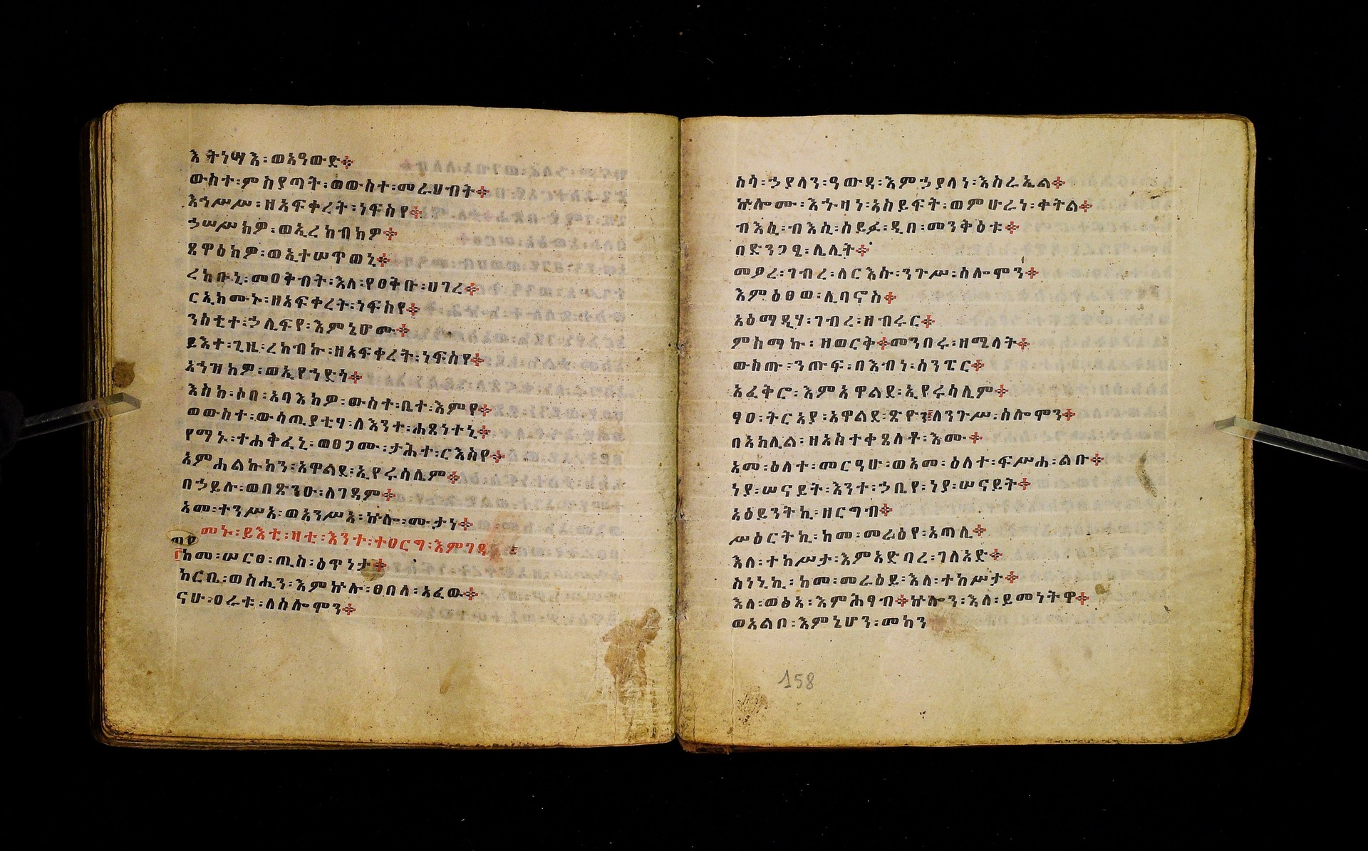 1. F. 2ra–vb: prayer to God, written on two columns in a fine handwriting. Incipit: እገይስ፡ ኀቤከ፡ አምላኪየ፡ አንተ፡ ኩነኒ፡ ረዳእየ፡ ወኩነኒ፡ ምስካይየ። ፀወንየ፡ ወኃይልየ፡ መድኃኒተ፡ ነፍስየ፡ አምላኪየ፡ ወኪያከ፡ ተወከልኩ። ኪያከ፡ ተወከልኩ፡ ኀቤከ፡ ተማኅፀንኩ፡ ኢትግድፈኒ፡ ለዝሉፉ፡ ወኢትርስአኒ፡ በምሕረትከ።. The names of Wäldä Iyäsus e Kidanä Mar[yam] are mentioned on f. 2vb. 2. F. 11r: short mäwaśǝʾt-hymn: ተፈሣሕኩ፡እስመ፡ ይቤሉኒ፡ ቤተ፡ ቤተ፡ እግዚአብሔር፡ ነሐውር። ሶበ፡ ይነቅህ፡ ካህን፡ ተከሥተ፡ ብርሃን፡ ለዓለም፡ ወተቀደሰት፡ ቤተ፡ ክርስቲያን፡ በክ፡ ወበስብሐት፡. The hymn is separated from the main text by a black vertical line and is provided with interlineal musical notation. 3. F. 163va–b: hymn entitled Mäḥaränä ab, “The Father had mercy on us”. The hymn is written in a small script and is provided with interlineal musical notation. Incipit: መሐረነ፡ አብ፡ ሃሌ፡ ሉያ፡ ተሣሃለነ፡ ወልድ፡ ሃሌ፡ ሉያ፡ መንፈስ፡ ቅዱስ፡ መሐሪ፡ ተዘከረነ፡ በሣህልከ። ለከ፡ ንፌኑ፡ ስብሐተ፡ ወለከ፡ ነዓርግ፡ አኰቴተ። መሐረነ፡ መሐሪ፡ ኃጢአተነ፡ አስተስሪ። 4. Ff. 178va–179ra: Ethiopian syllabary, written in a recent and untrained hand and followed by a short text in Amharic and Gǝʿǝz, written in the same hand. Incipit: አሊ፡ ጀረ፡ አመተ፡ ጀርጀረ፡ ነጋሢ፡ ምኒልክ፡ ቍርቍራ፡ ስመ፡ ጥርስ፡ አጥርሲ፡ አንበሳ፡ ጋማማ፡ ነምር፡ ጥፍራማ፡ ጅብ፡ ደደሳማ. |