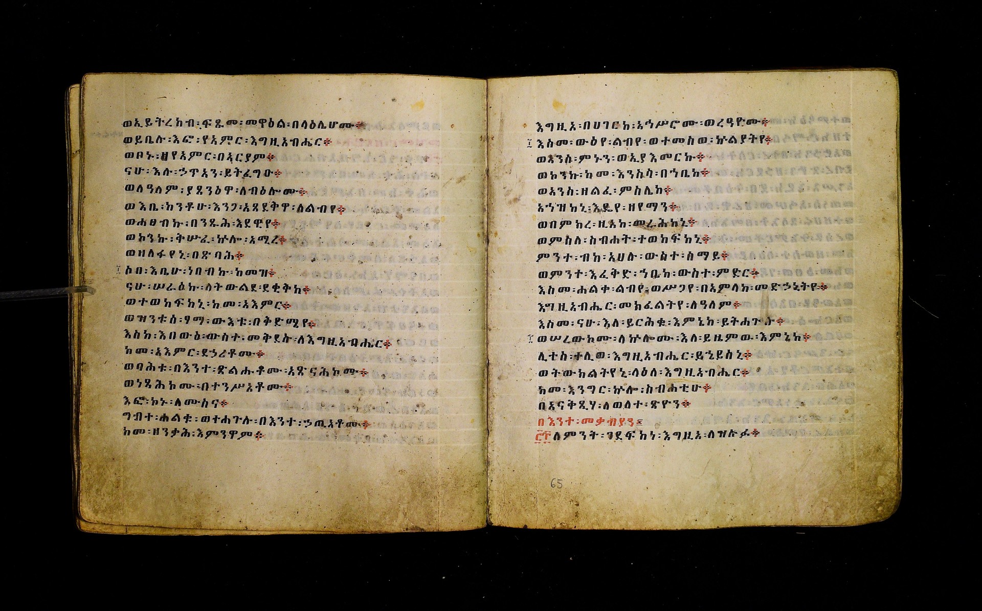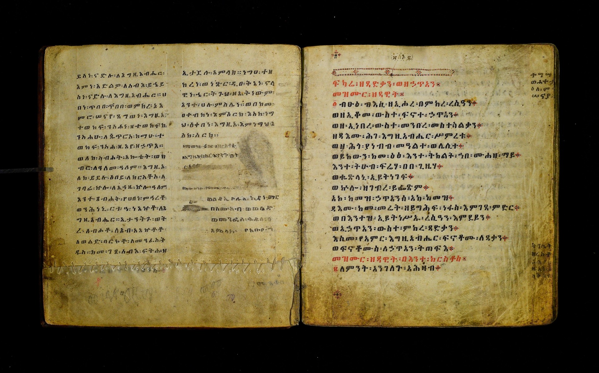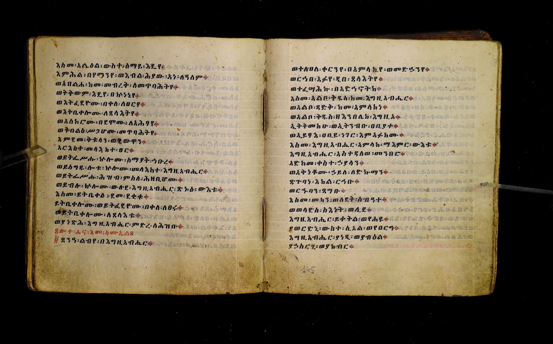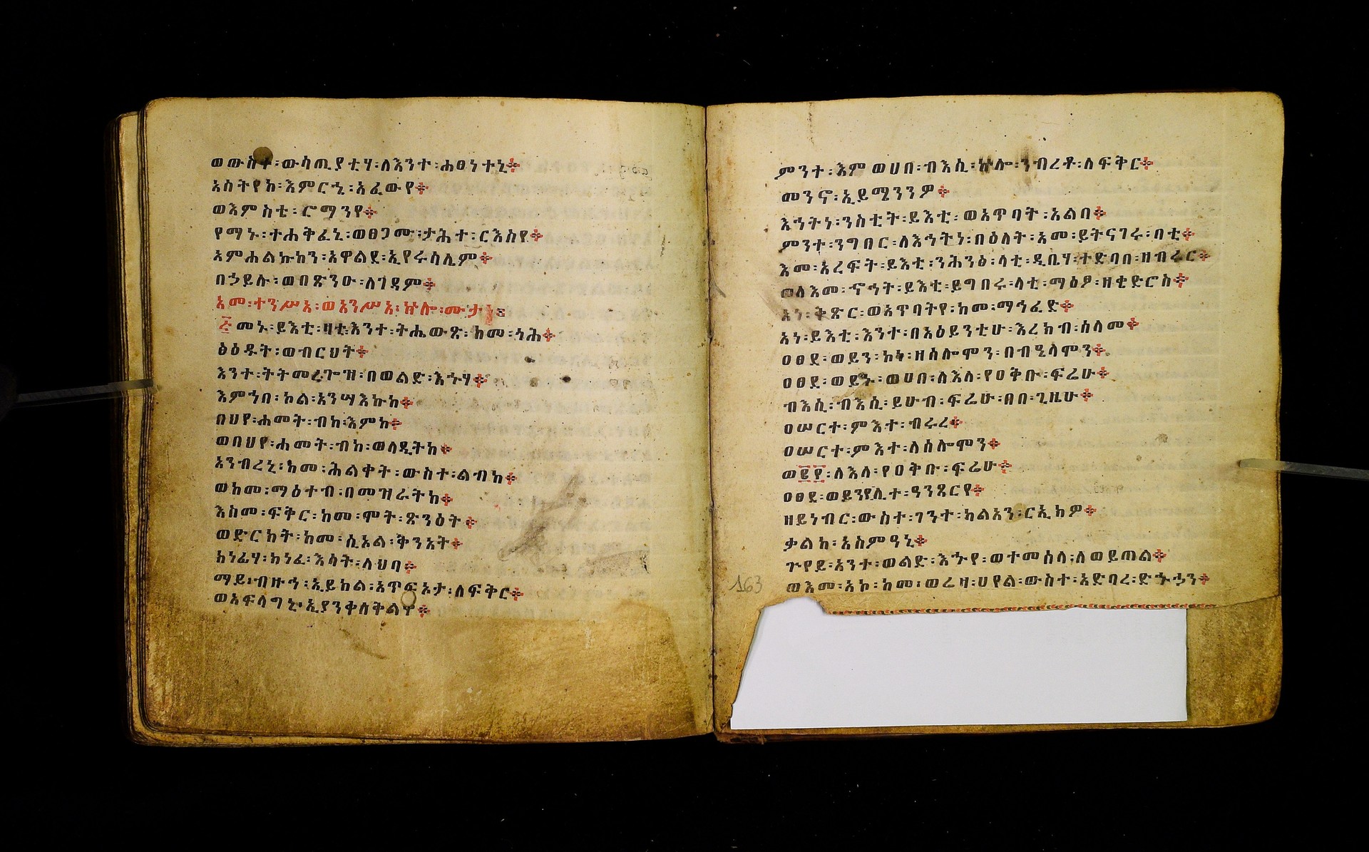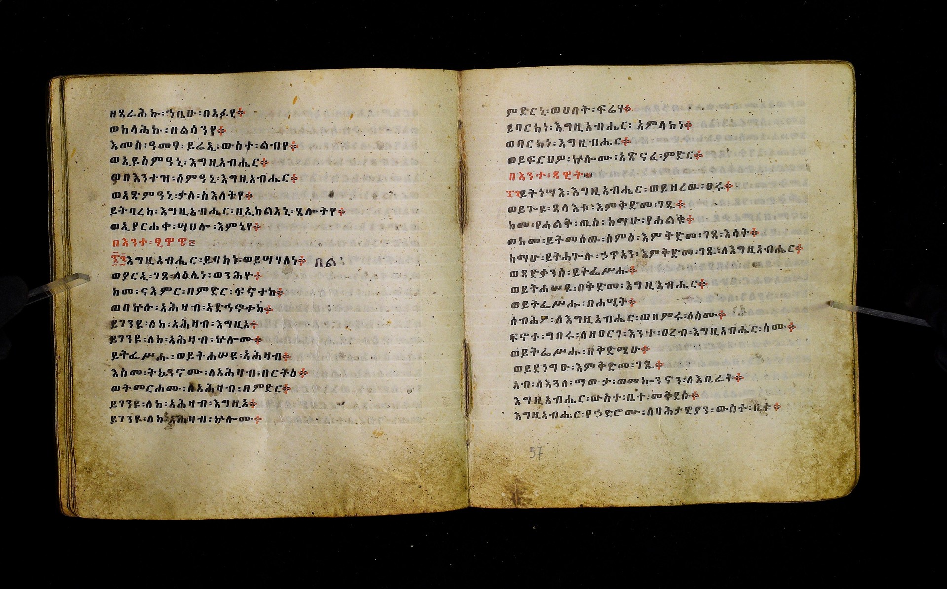 1. F. 2ra–vb: prayer to God, written on two columns in a fine handwriting. Incipit: እገይስ፡ ኀቤከ፡ አምላኪየ፡ አንተ፡ ኩነኒ፡ ረዳእየ፡ ወኩነኒ፡ ምስካይየ። ፀወንየ፡ ወኃይልየ፡ መድኃኒተ፡ ነፍስየ፡ አምላኪየ፡ ወኪያከ፡ ተወከልኩ። ኪያከ፡ ተወከልኩ፡ ኀቤከ፡ ተማኅፀንኩ፡ ኢትግድፈኒ፡ ለዝሉፉ፡ ወኢትርስአኒ፡ በምሕረትከ።. The names of Wäldä Iyäsus e Kidanä Mar[yam] are mentioned on f. 2vb. 2. F. 11r: short mäwaśǝʾt-hymn: ተፈሣሕኩ፡እስመ፡ ይቤሉኒ፡ ቤተ፡ ቤተ፡ እግዚአብሔር፡ ነሐውር። ሶበ፡ ይነቅህ፡ ካህን፡ ተከሥተ፡ ብርሃን፡ ለዓለም፡ ወተቀደሰት፡ ቤተ፡ ክርስቲያን፡ በክ፡ ወበስብሐት፡. The hymn is separated from the main text by a black vertical line and is provided with interlineal musical notation. 3. F. 163va–b: hymn entitled Mäḥaränä ab, “The Father had mercy on us”. The hymn is written in a small script and is provided with interlineal musical notation. Incipit: መሐረነ፡ አብ፡ ሃሌ፡ ሉያ፡ ተሣሃለነ፡ ወልድ፡ ሃሌ፡ ሉያ፡ መንፈስ፡ ቅዱስ፡ መሐሪ፡ ተዘከረነ፡ በሣህልከ። ለከ፡ ንፌኑ፡ ስብሐተ፡ ወለከ፡ ነዓርግ፡ አኰቴተ። መሐረነ፡ መሐሪ፡ ኃጢአተነ፡ አስተስሪ። 4. Ff. 178va–179ra: Ethiopian syllabary, written in a recent and untrained hand and followed by a short text in Amharic and Gǝʿǝz, written in the same hand. Incipit: አሊ፡ ጀረ፡ አመተ፡ ጀርጀረ፡ ነጋሢ፡ ምኒልክ፡ ቍርቍራ፡ ስመ፡ ጥርስ፡ አጥርሲ፡ አንበሳ፡ ጋማማ፡ ነምር፡ ጥፍራማ፡ ጅብ፡ ደደሳማ. |