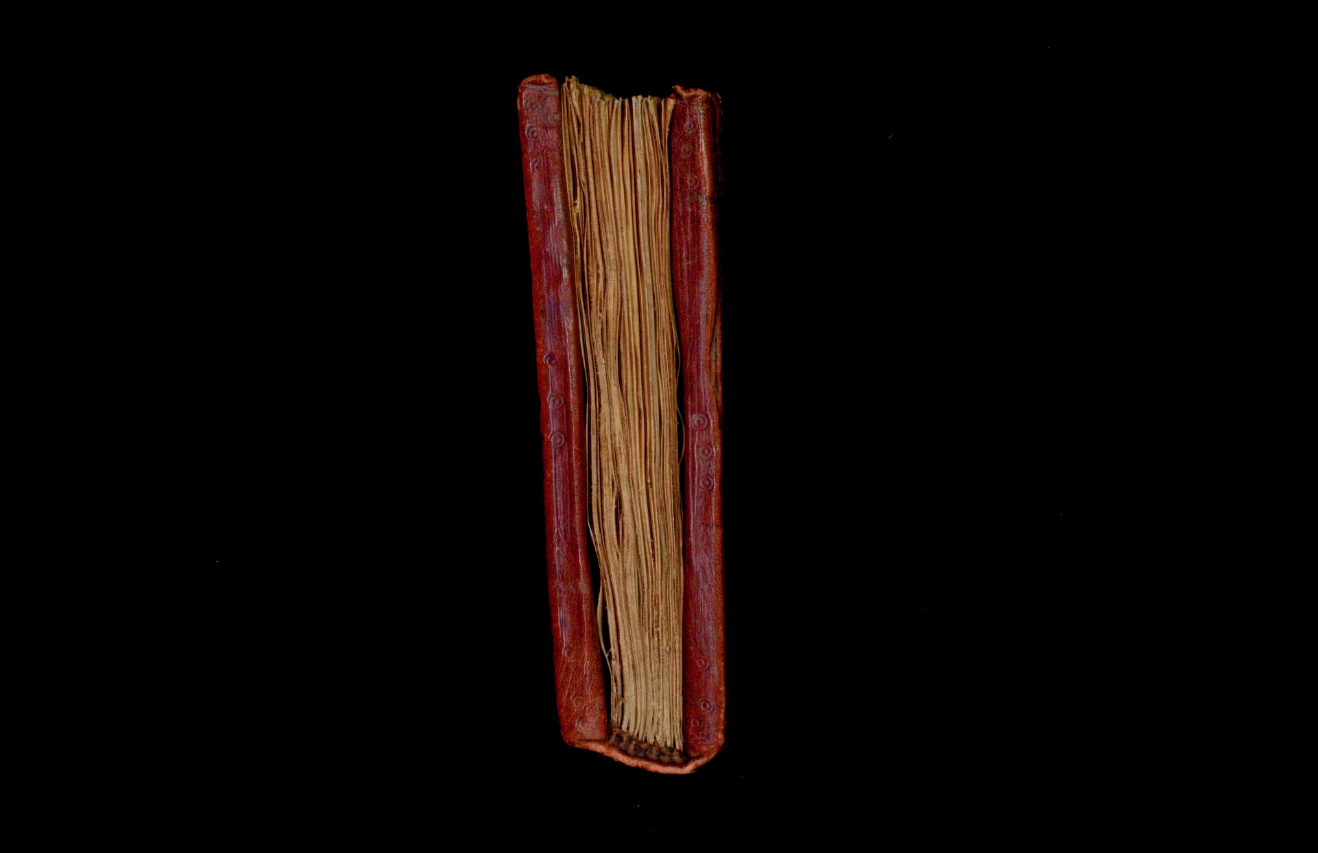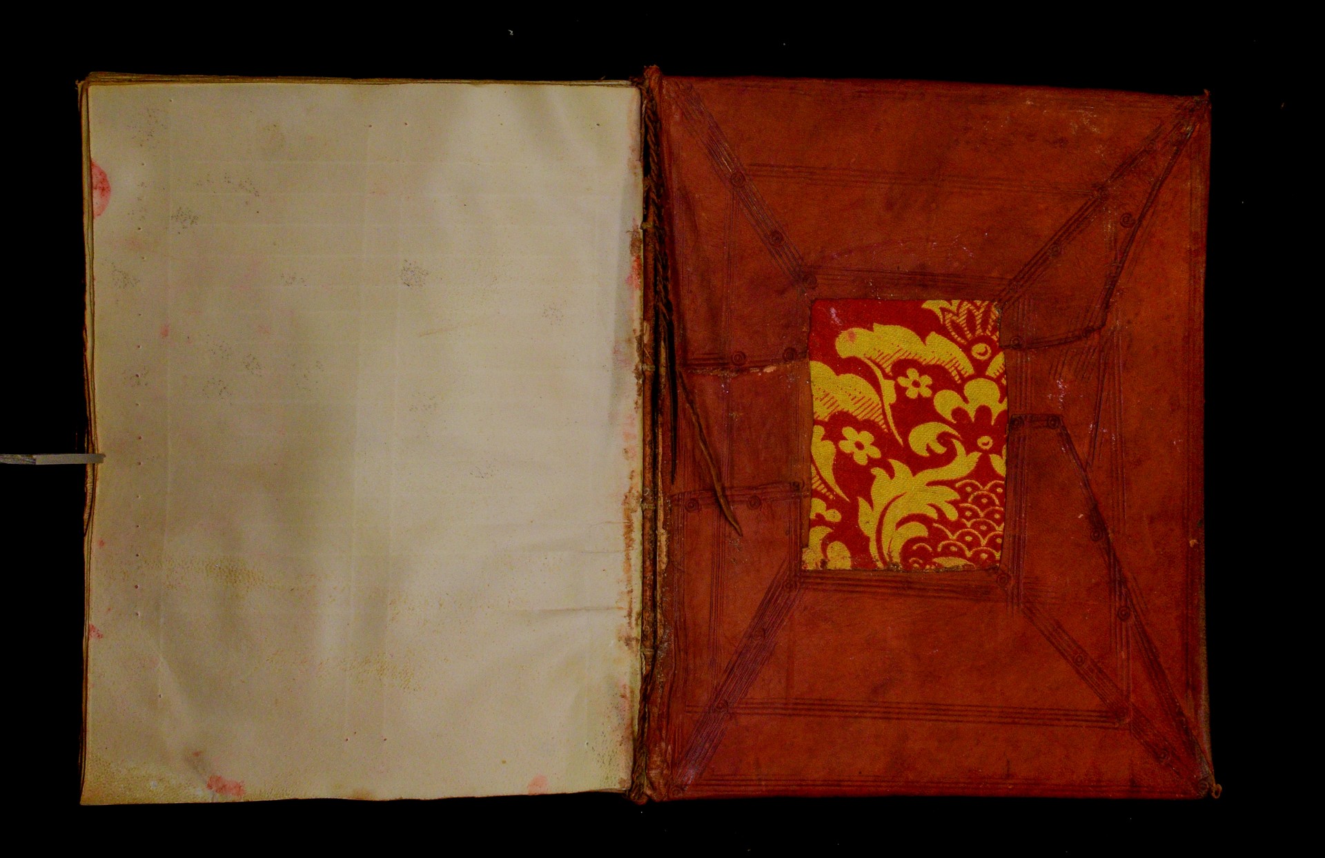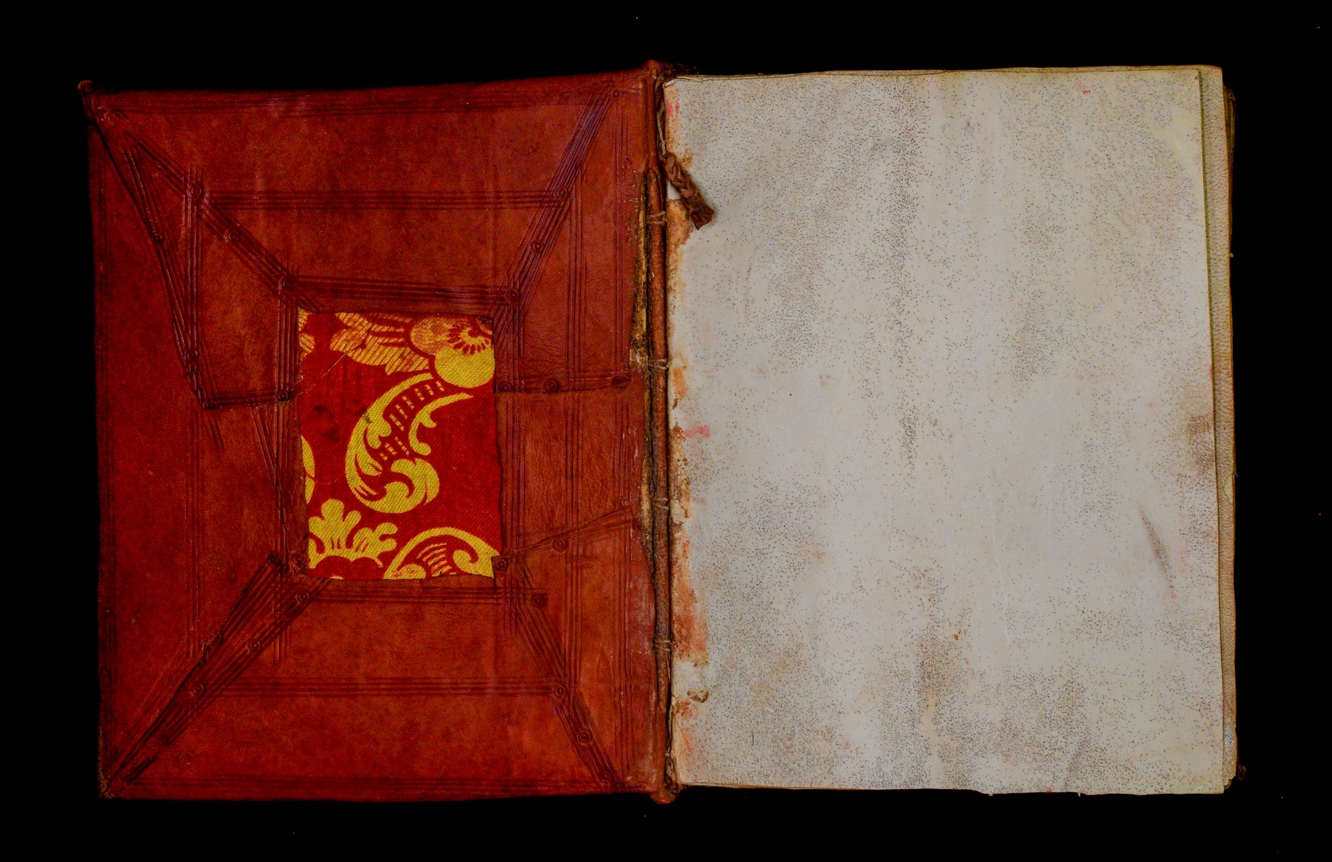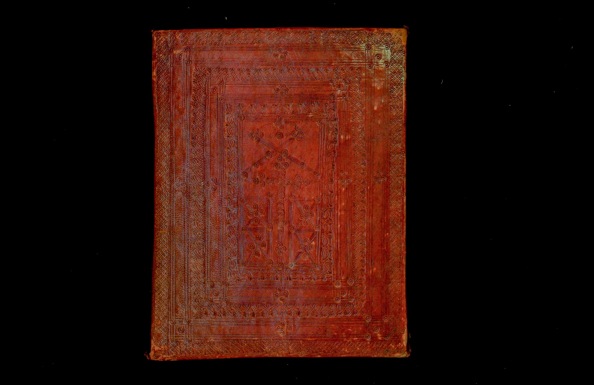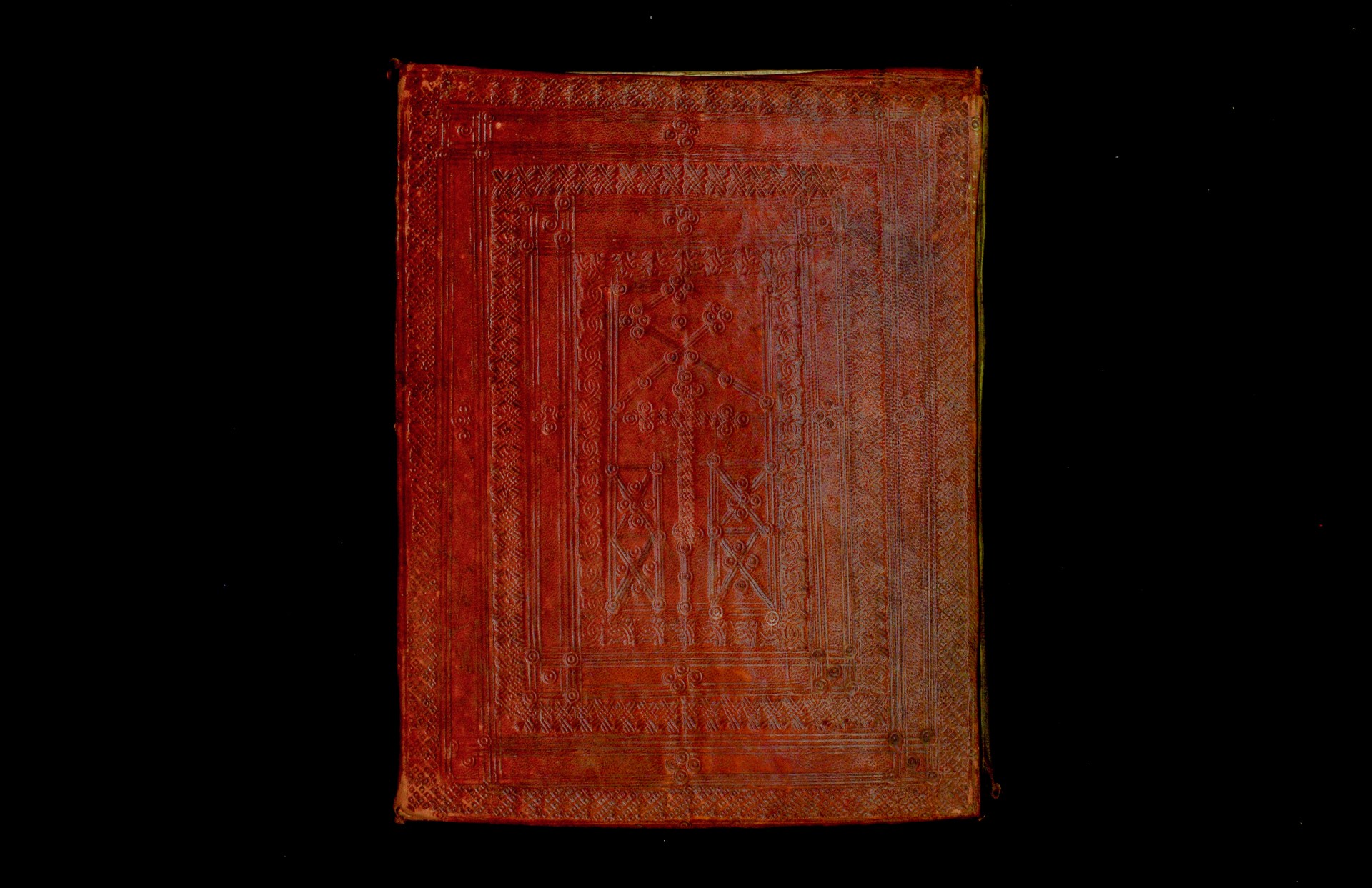 Two wooden boards covered with blind-tooled leather. Four sewing stations. |