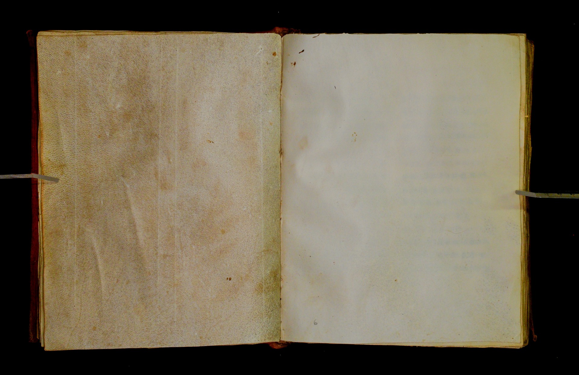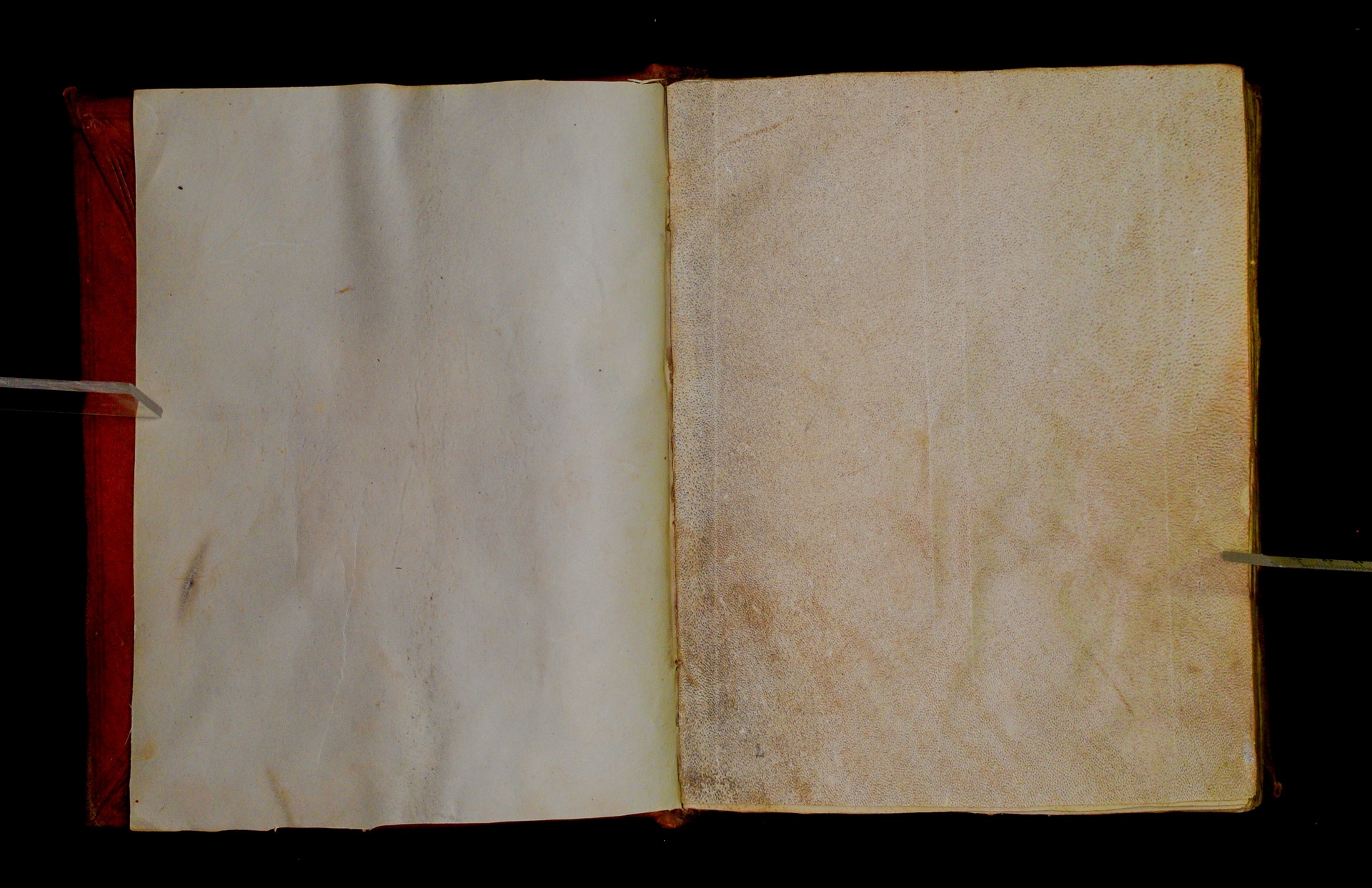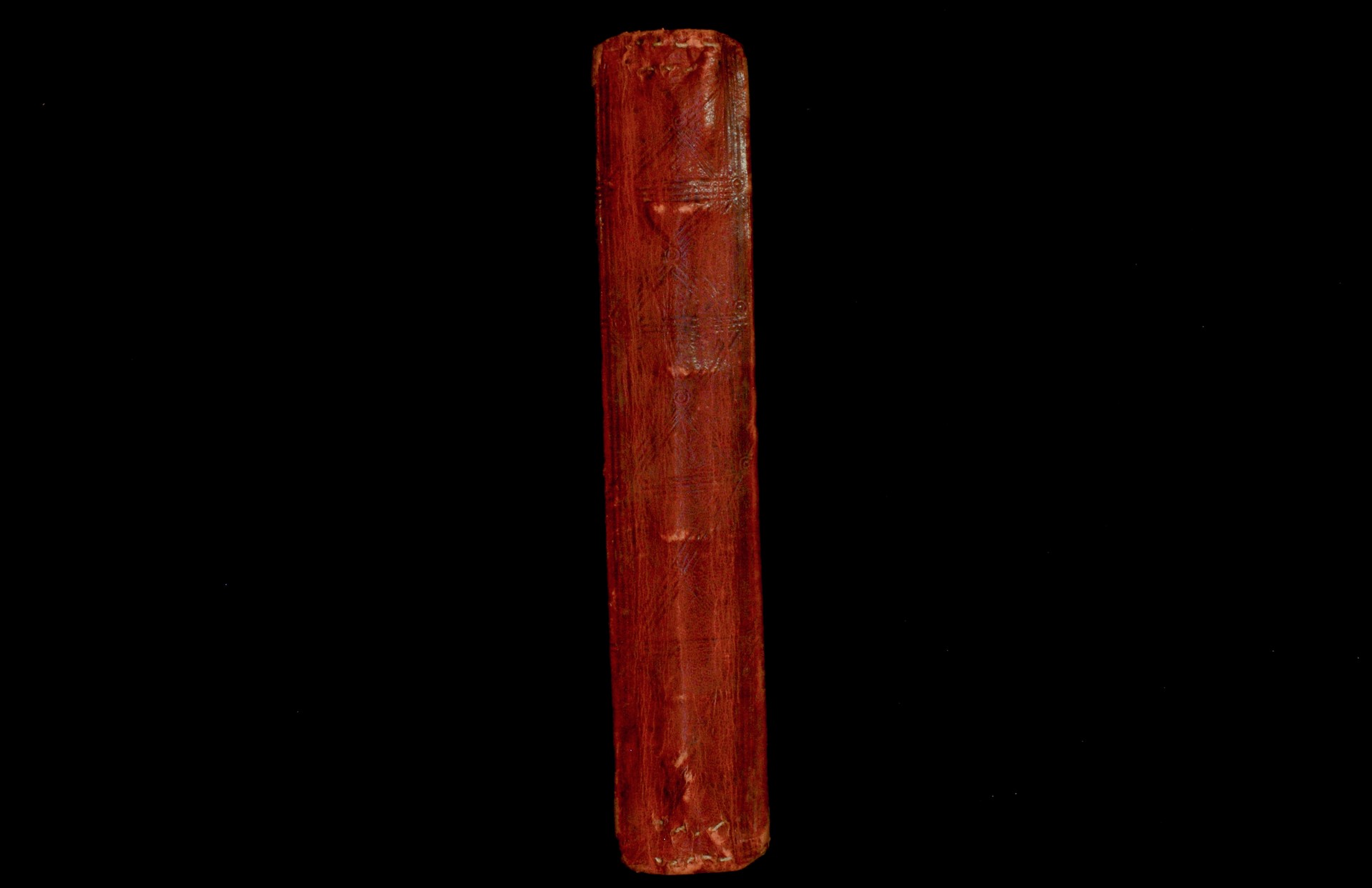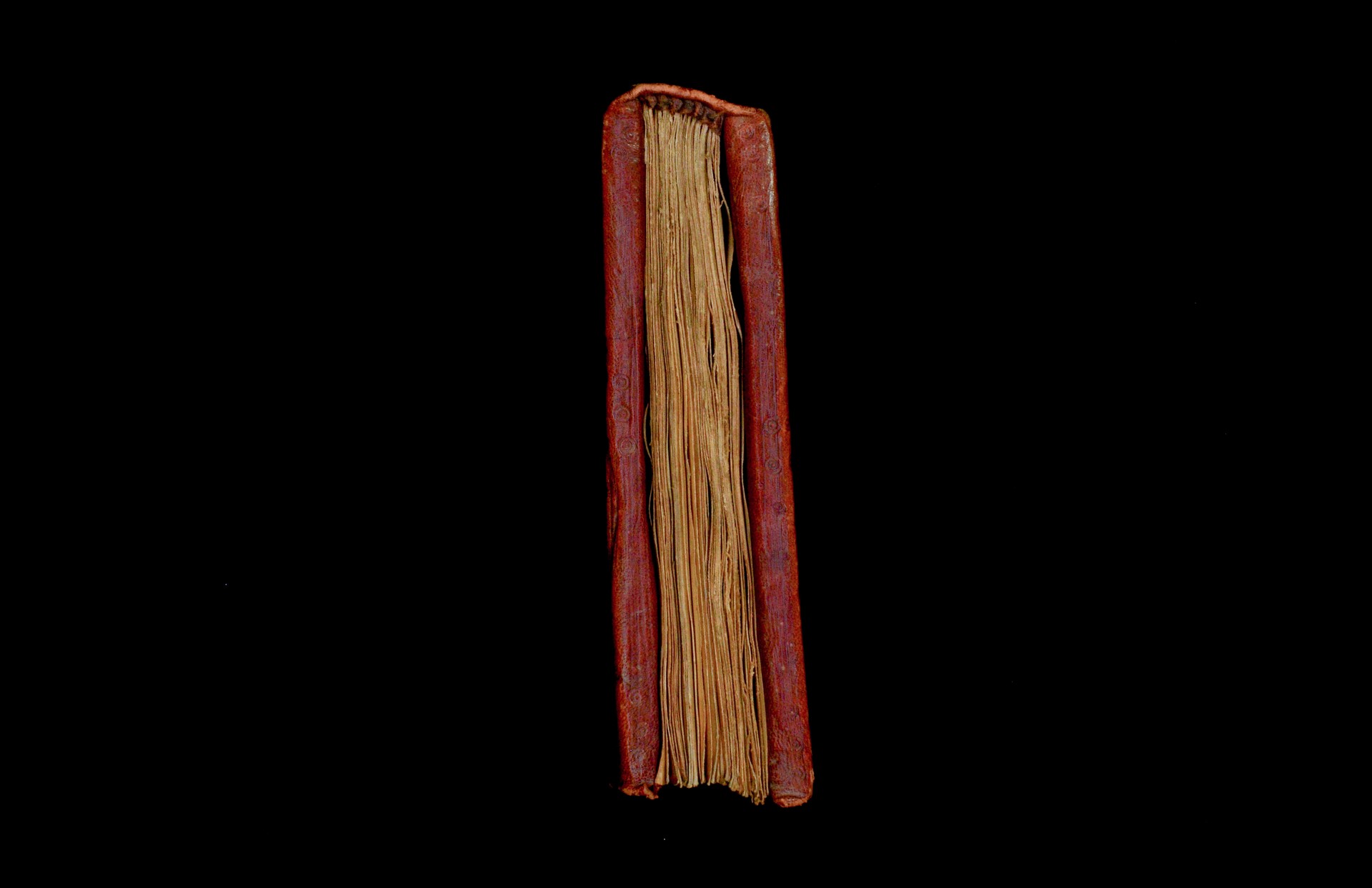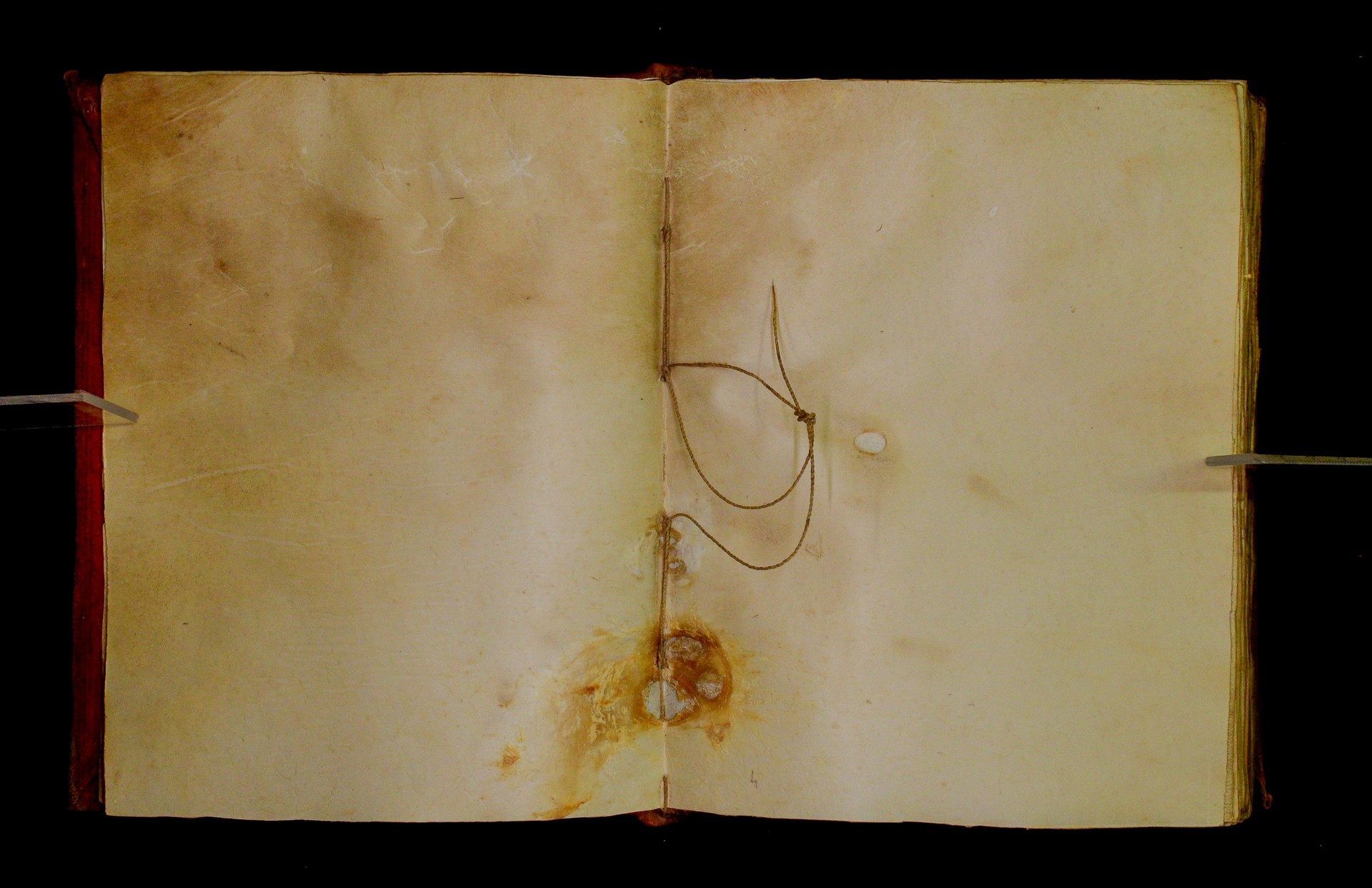 Two wooden boards covered with blind-tooled leather. Four sewing stations. |