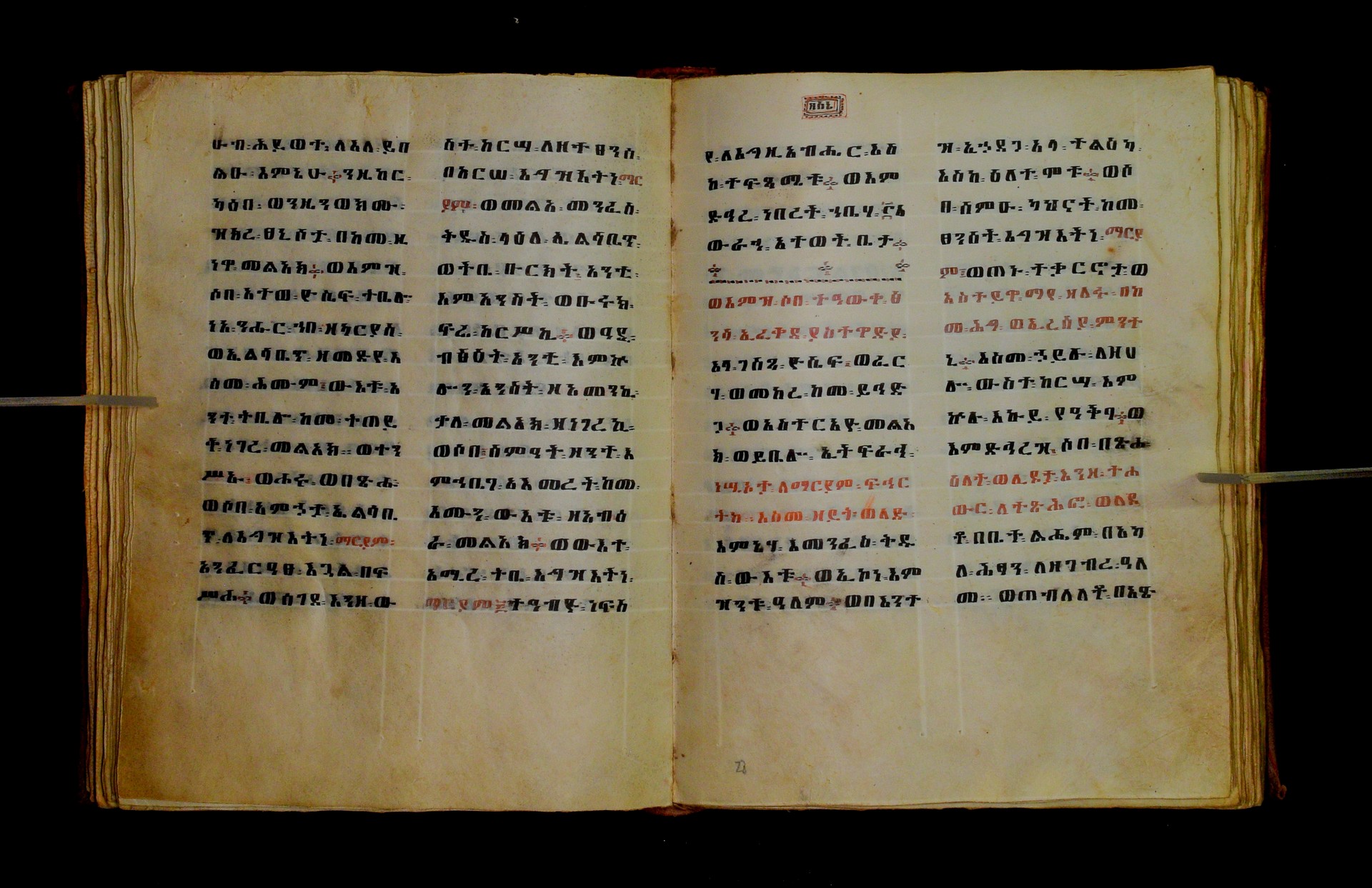 Indicated in black and red ink on the upper inner margin of the first folio of each quire: ff. 7r (፩), 15r (፪), 23r (፫), 31r (፬), 39r (፭), 47r (፮), 55r (፯). |