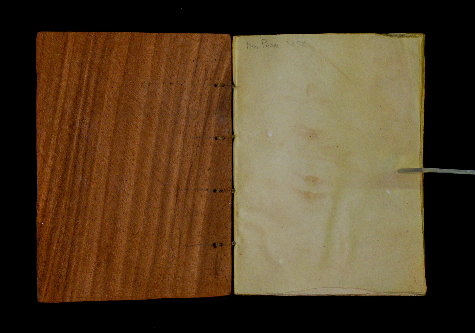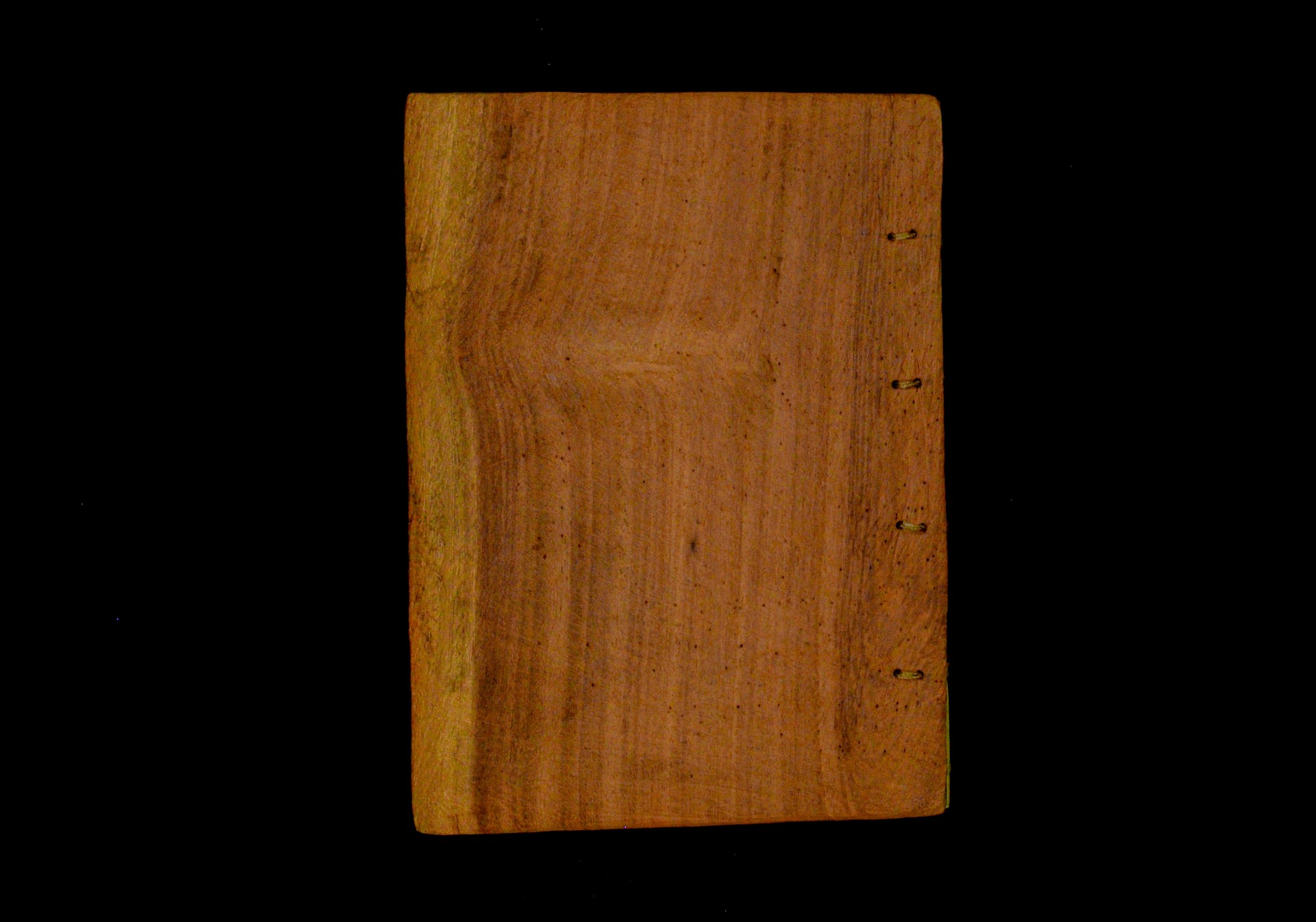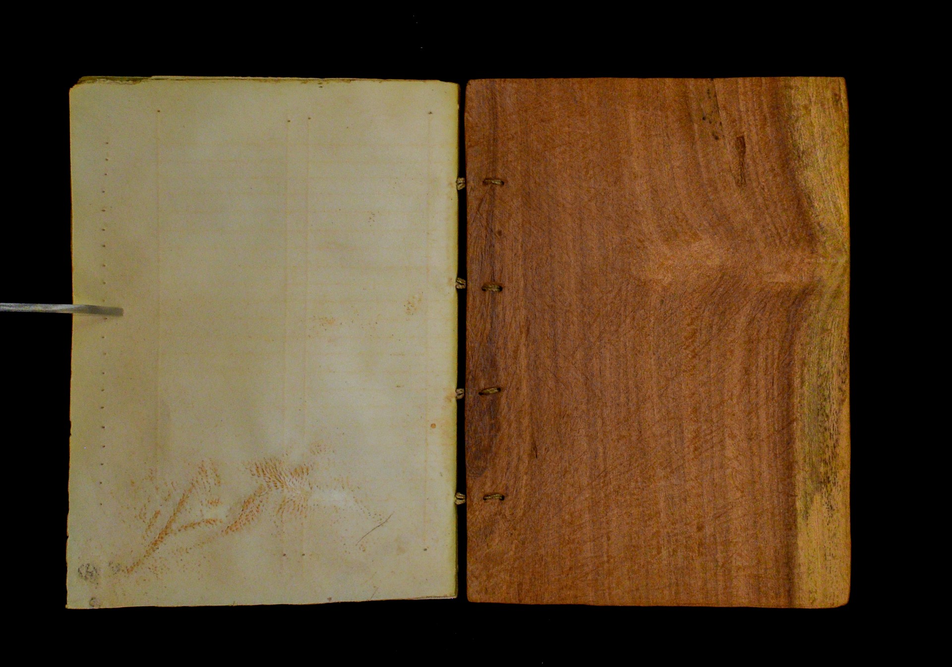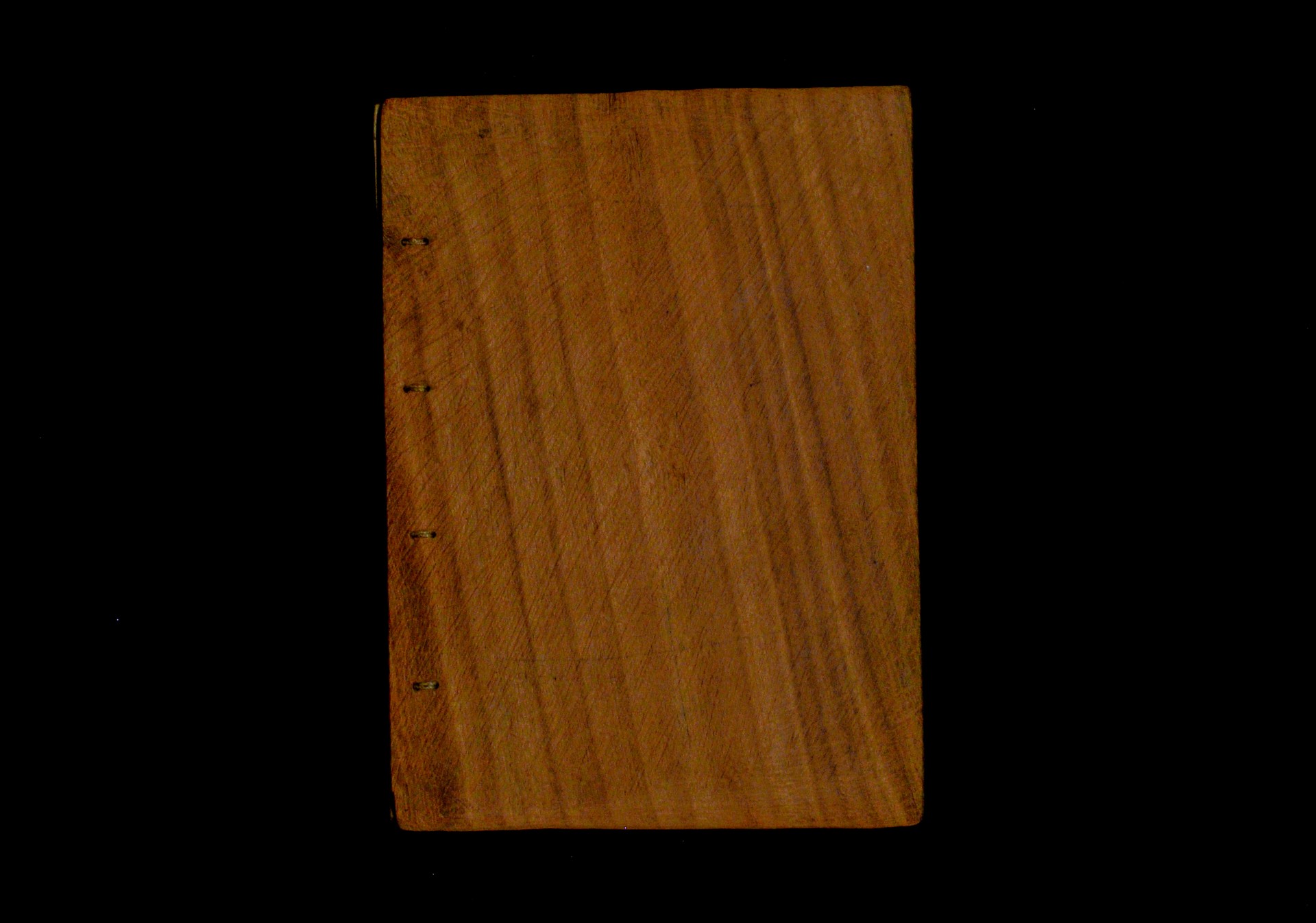 Two wooden boards. The spine is uncovered. Four sewing stations. |