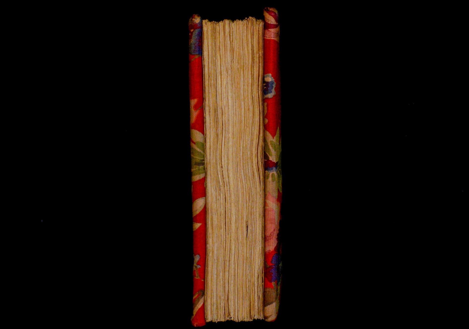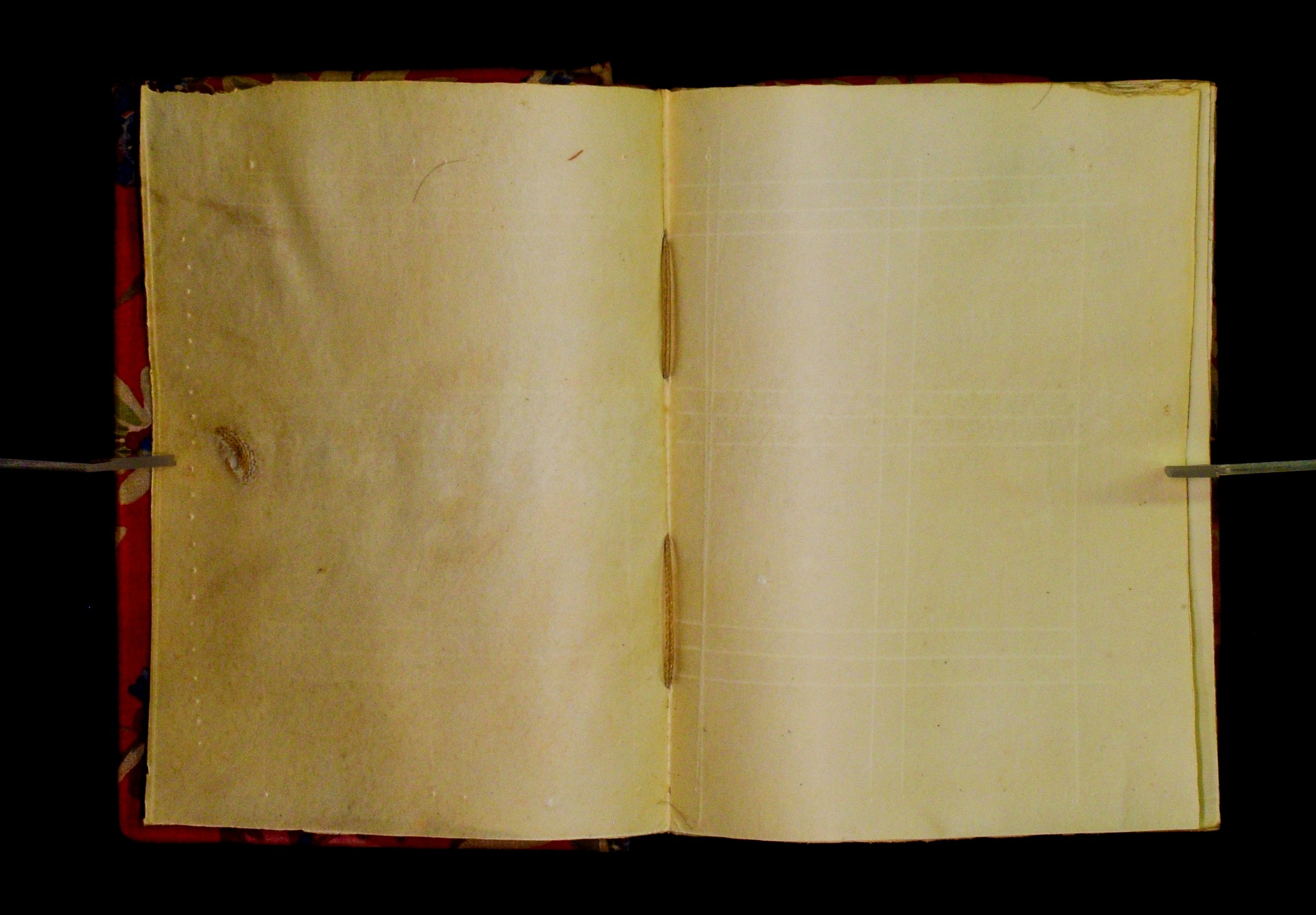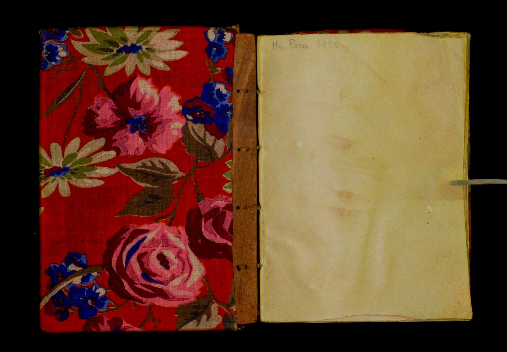 Two wooden boards. The spine is uncovered. Four sewing stations. |